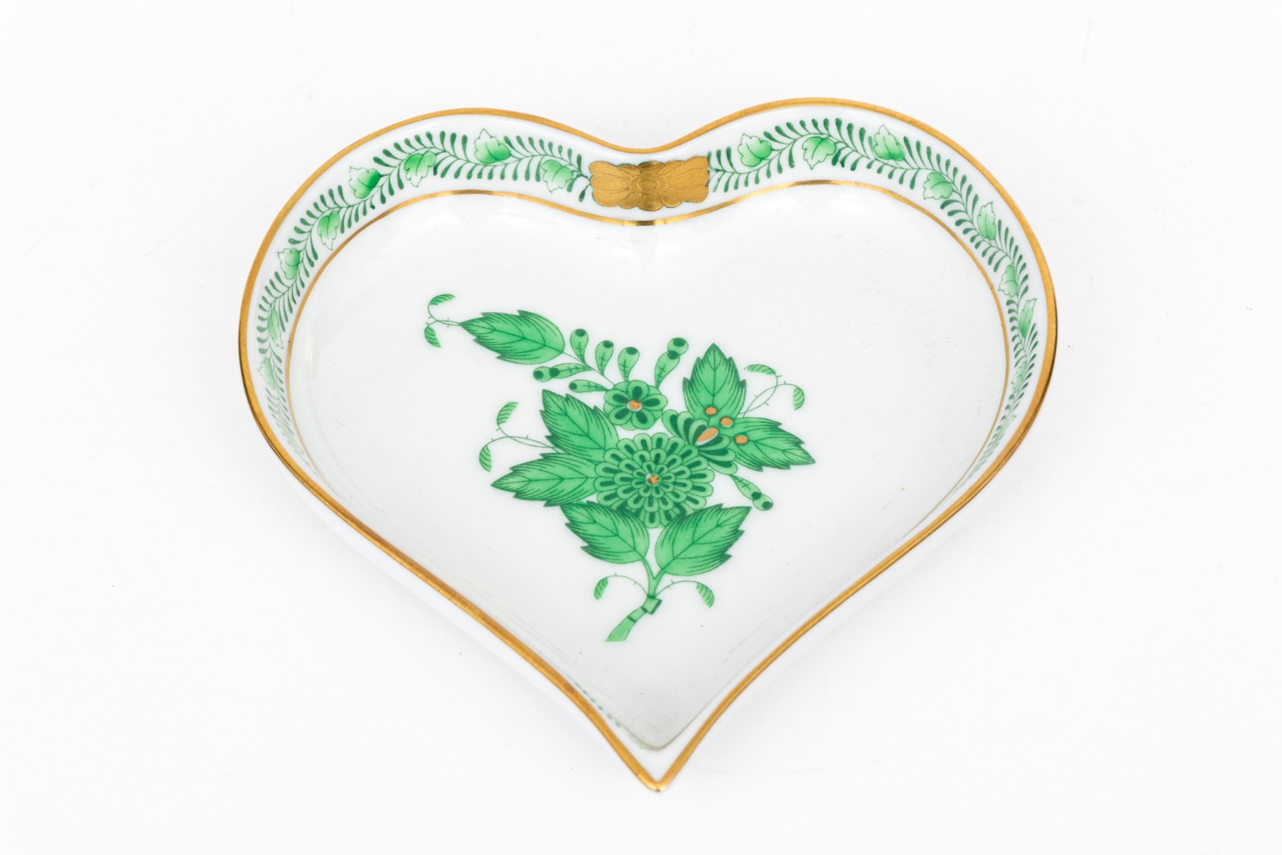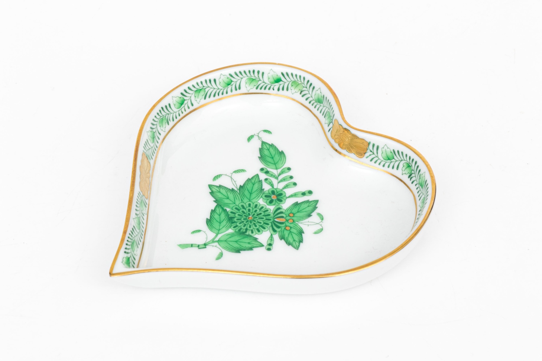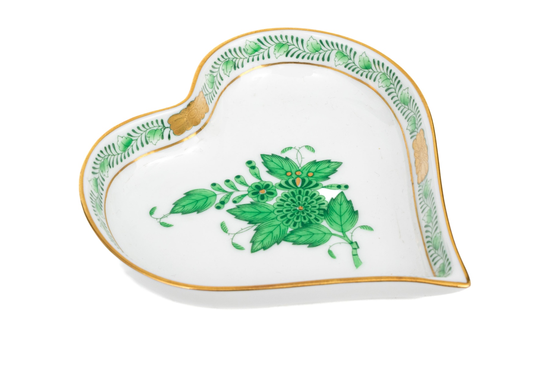 Heredn porcelain heart-shaped dish hand-painted in the Chinese Bouquet Green (Apponyi Green, AV) pattern. The design features a detailed central floral motif in vivid emerald green with 24K gold accents. The border is adorned with Herend's traditional leafy vine garland, accented by a small gilded butterfly motif at the top rim and edged in 24K gold. The underside bears the Herend Hungary blue Shiel and crossed paintbrush mark, inscribed Handpainted and numbered 7703-0-00/AV