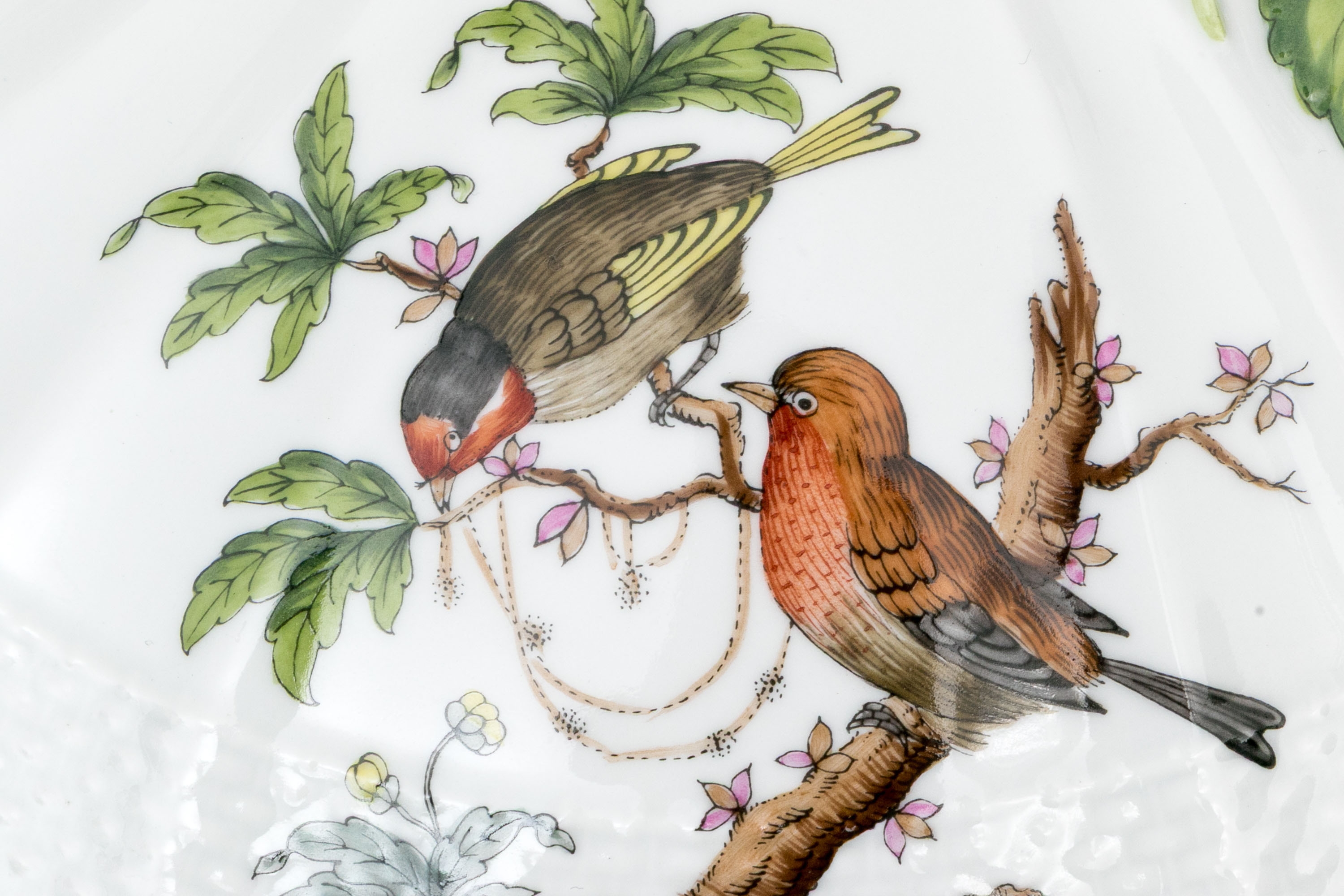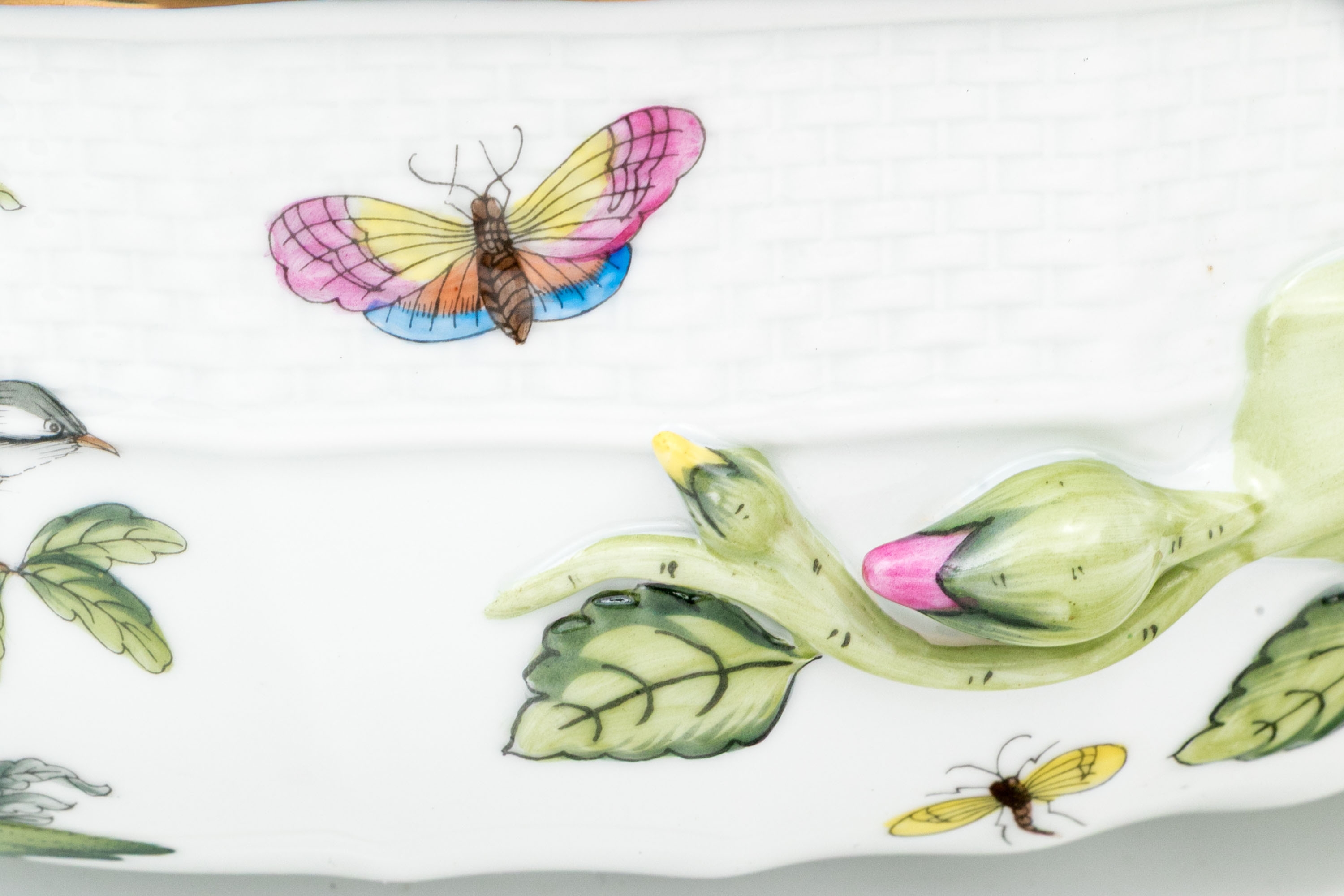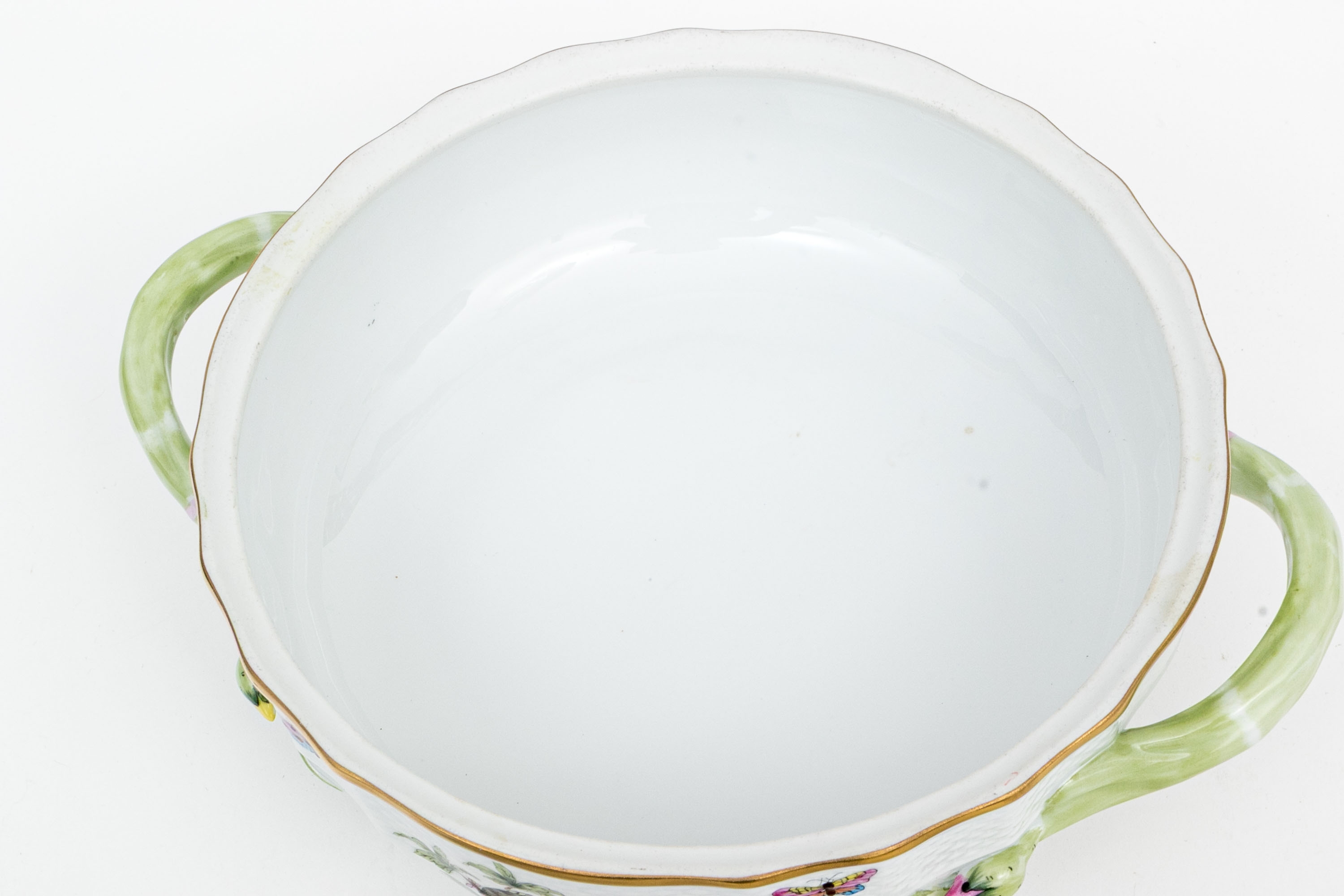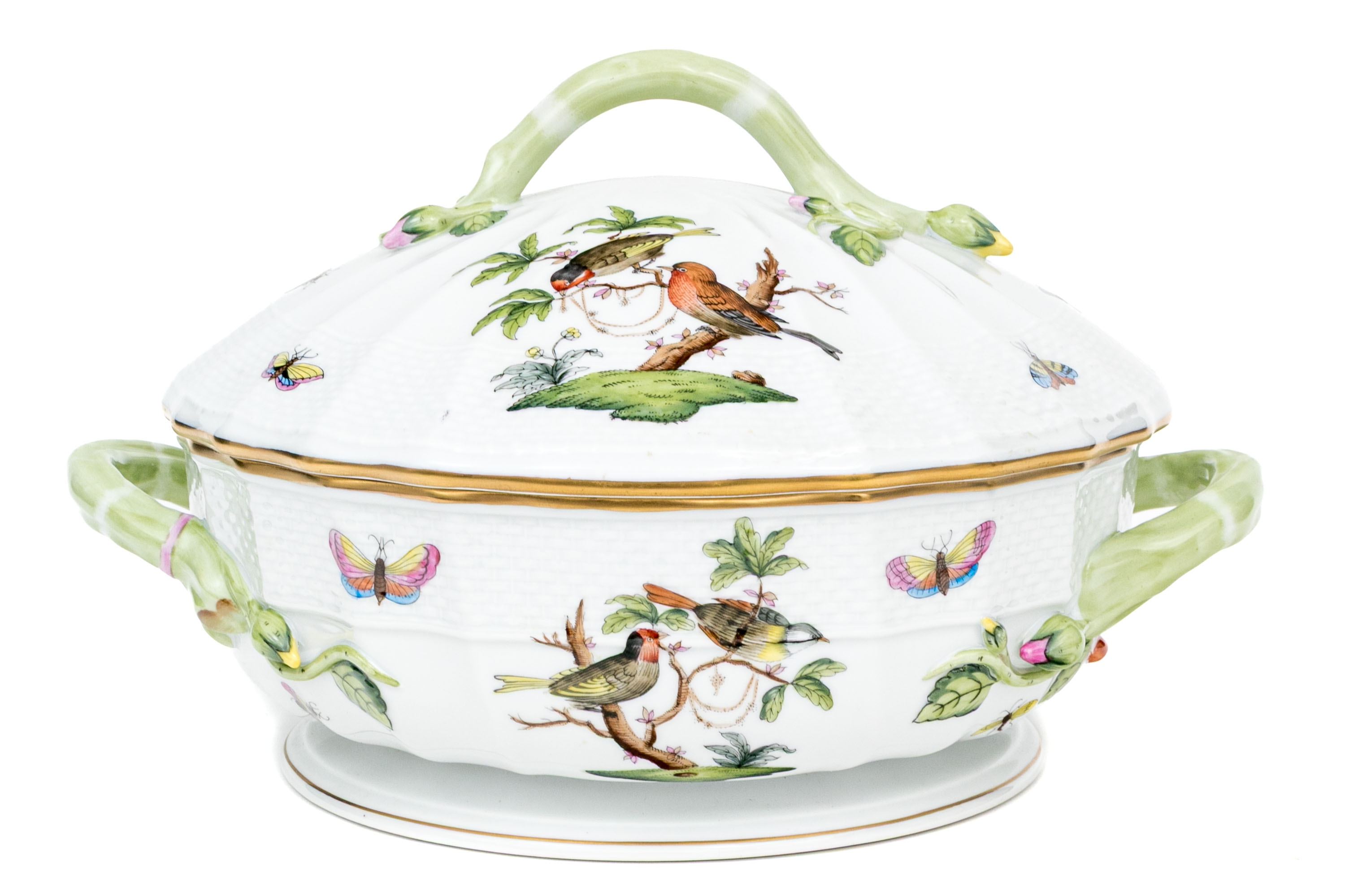 Herend porcelain tureen features the Rothschild Bird (RO) design. The decoration depicts pairs of colorful birds perched on flowering branches with necklace, surrounded by delicate butterflies, dragonflies, and insects — all rendered in exquisite hand-painted detail and vivid enamel colors. The body and lid display Herend’s signature basketweave relief pattern, enhancing the dimensional texture of the porcelain. The applied handles are formed as curling green branches accented with small rosebuds, while the domed lid is crowned with an elegant, naturalistic branch-form finial. The piece rests on a circular footed base with a thin gilt accent line, and the rim and finial edges are also trimmed in hand-applied gold. The underside bears the blue Herend Hungary shield mark, hand-painted and inscribed 1086/RO.
