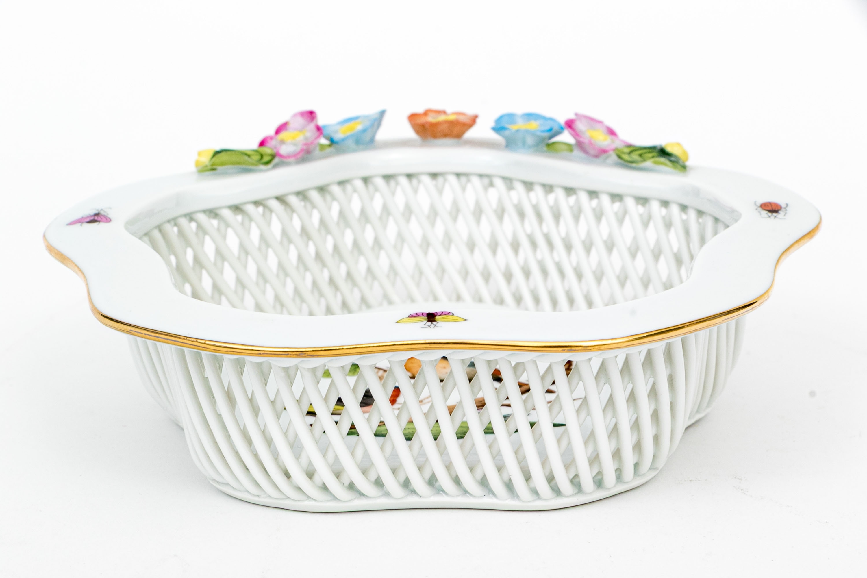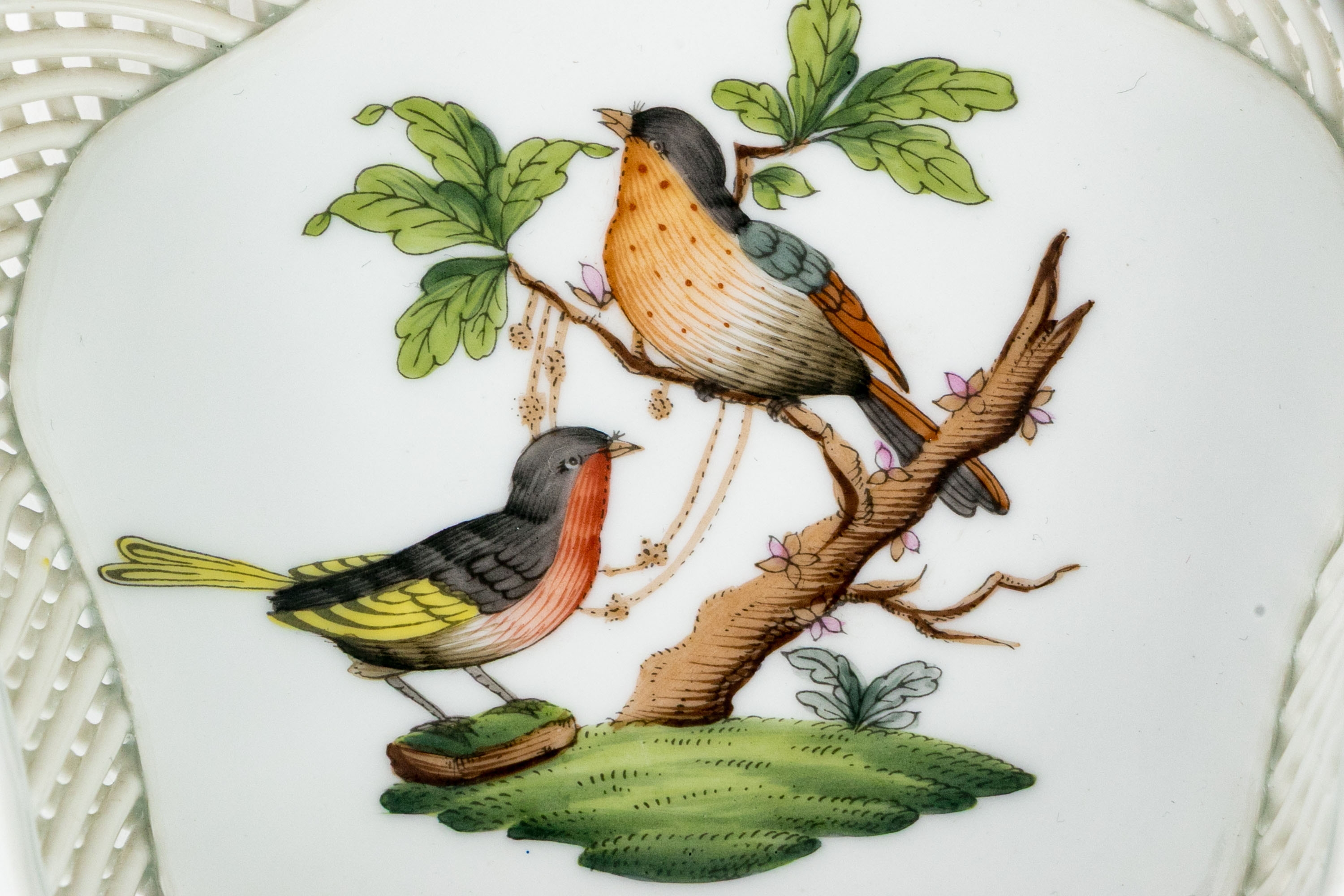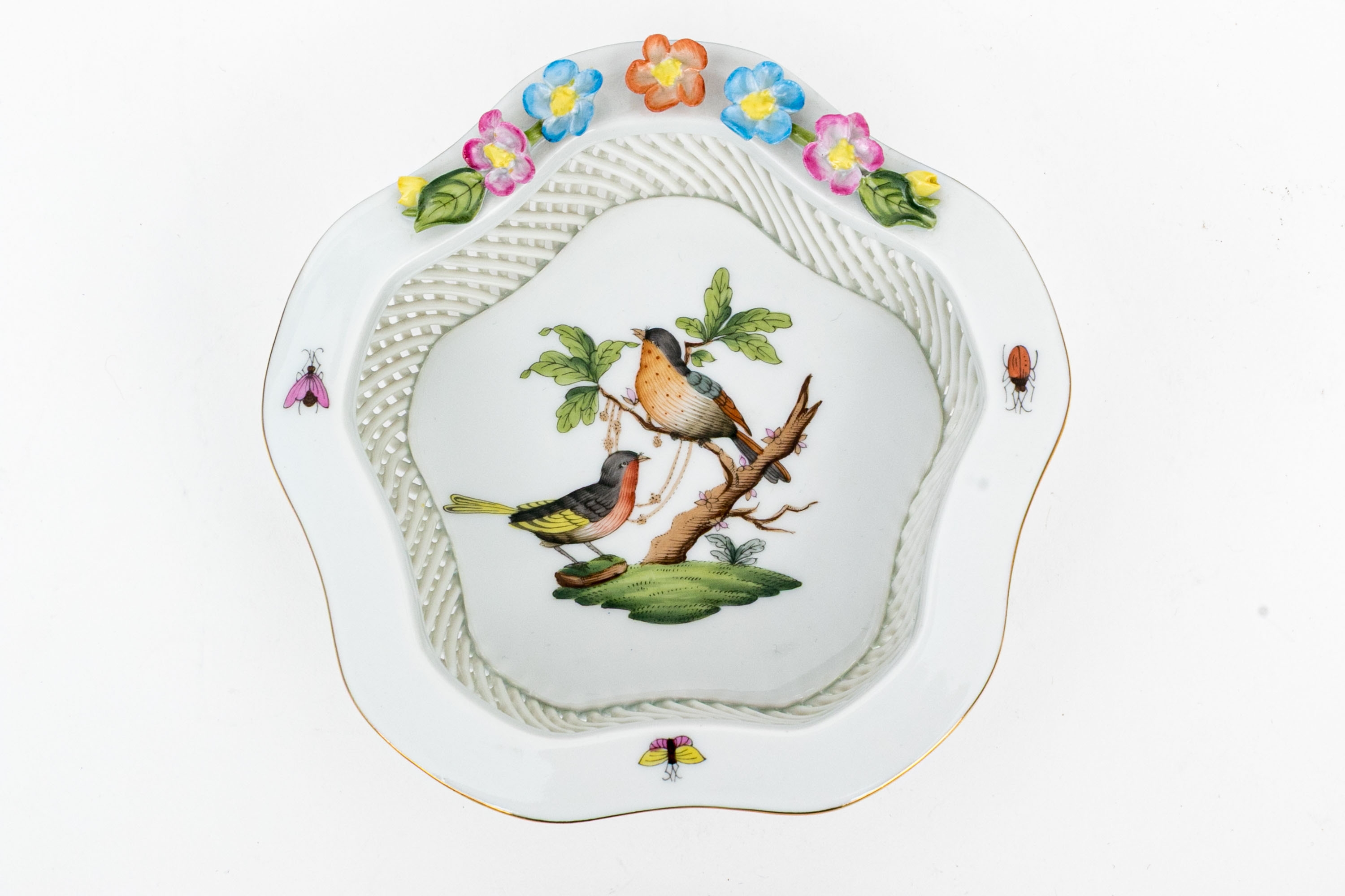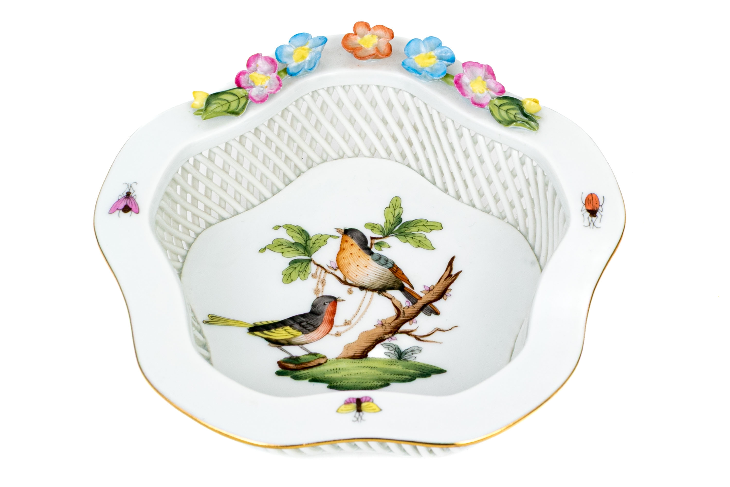 Herend Hungary hand-painted porcelain openwork basket, model 7384/RO, decorated in the Rothschild Bird (RO) pattern. The piece features a finely woven hand-applied lattice design around the body. The scalloped rim is accented with hand-applied gilding and adorned with delicate applied porcelain flowers in soft shades of pink, blue, yellow, and peach, each hand-formed and painted. Inside the basket, the central medallion depicts two songbirds perched on a leafy branch with necklace, rendered in vibrant natural hues with remarkable detail, surrounded by colorful butterflies and insects along the rim. The underside bears the Herend Hungary blue shield hallmark with crossed paintbrushes and HANDPAINTED mark, along with model number 7384/RO and painter’s code.