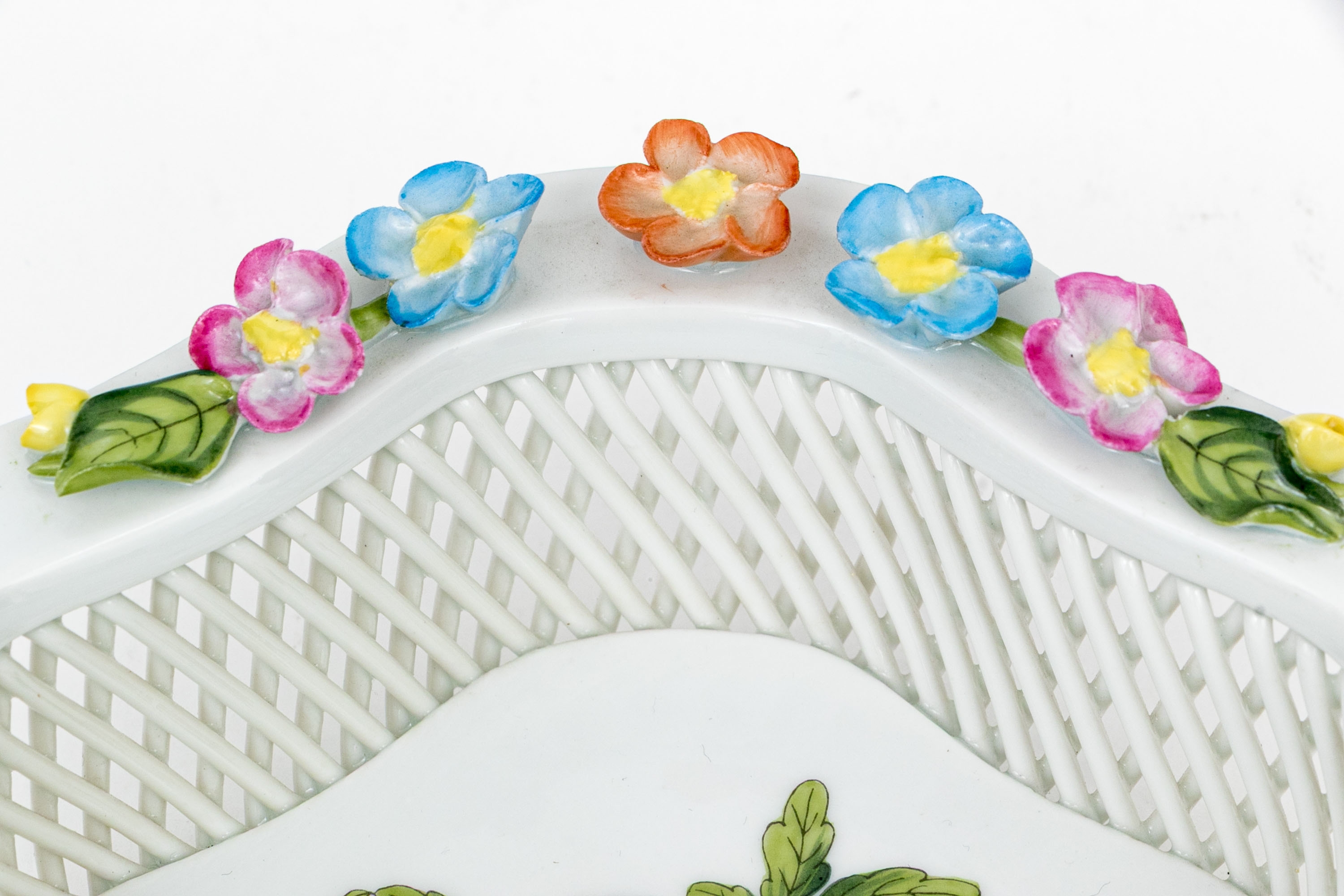 Condition: Excellent overall condition. No chips, cracks, or restorations. All applied flowers and leaves are intact and complete. The gilt trim and painted details are bright, clean, and unworn. Clean underside with clear and sharp factory hallmark and numbering. Slight wear consistent with careful display use only.
