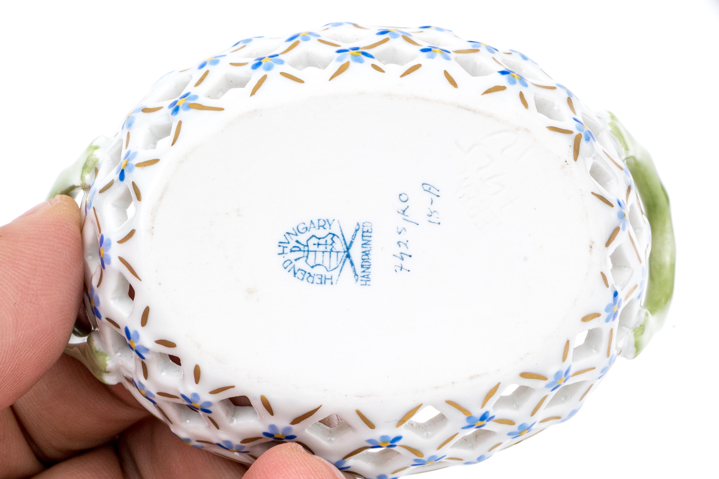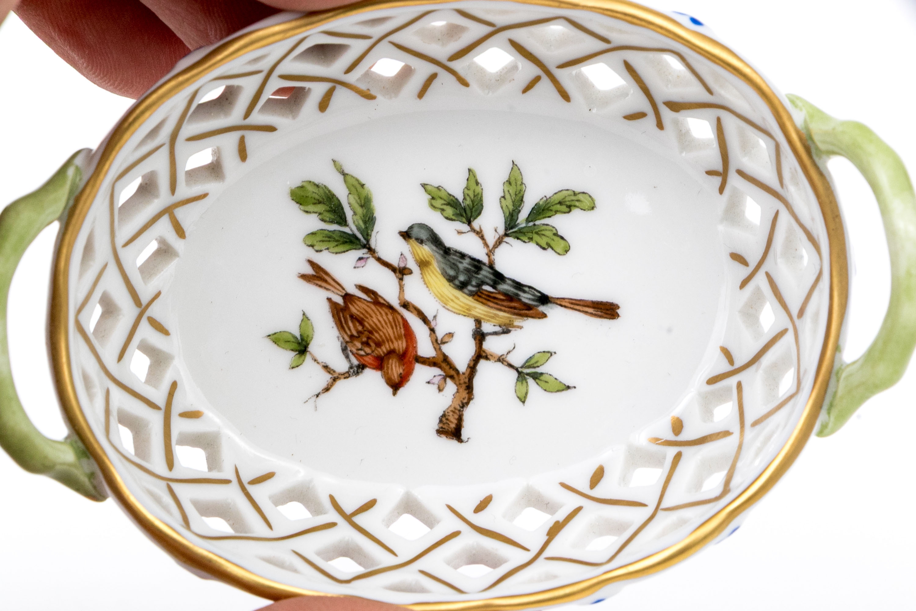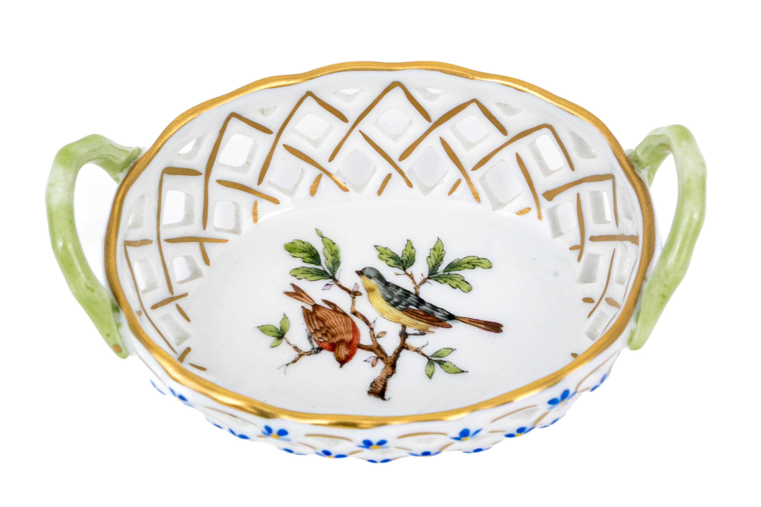 Herend Hungary porcelain openwork basket in the Rothschild Bird (RO) pattern. The interior features two finely hand-painted songbirds perched on a leafy branch, rendered in rich naturalistic tones of yellow, gray, and rust red, symbolizing peace and prosperity. This intricate avian motif is framed by a pierced lattice rim accented in hand-applied 24K gold. The basket’s exterior is adorned with delicate hand-painted blue flowers, while the handles are finished in soft green glaze.cThe underside bears the Herend blue shield hallmark with crossed paintbrushes and HANDPAINTED inscription, along with number 7425/KO 15-A