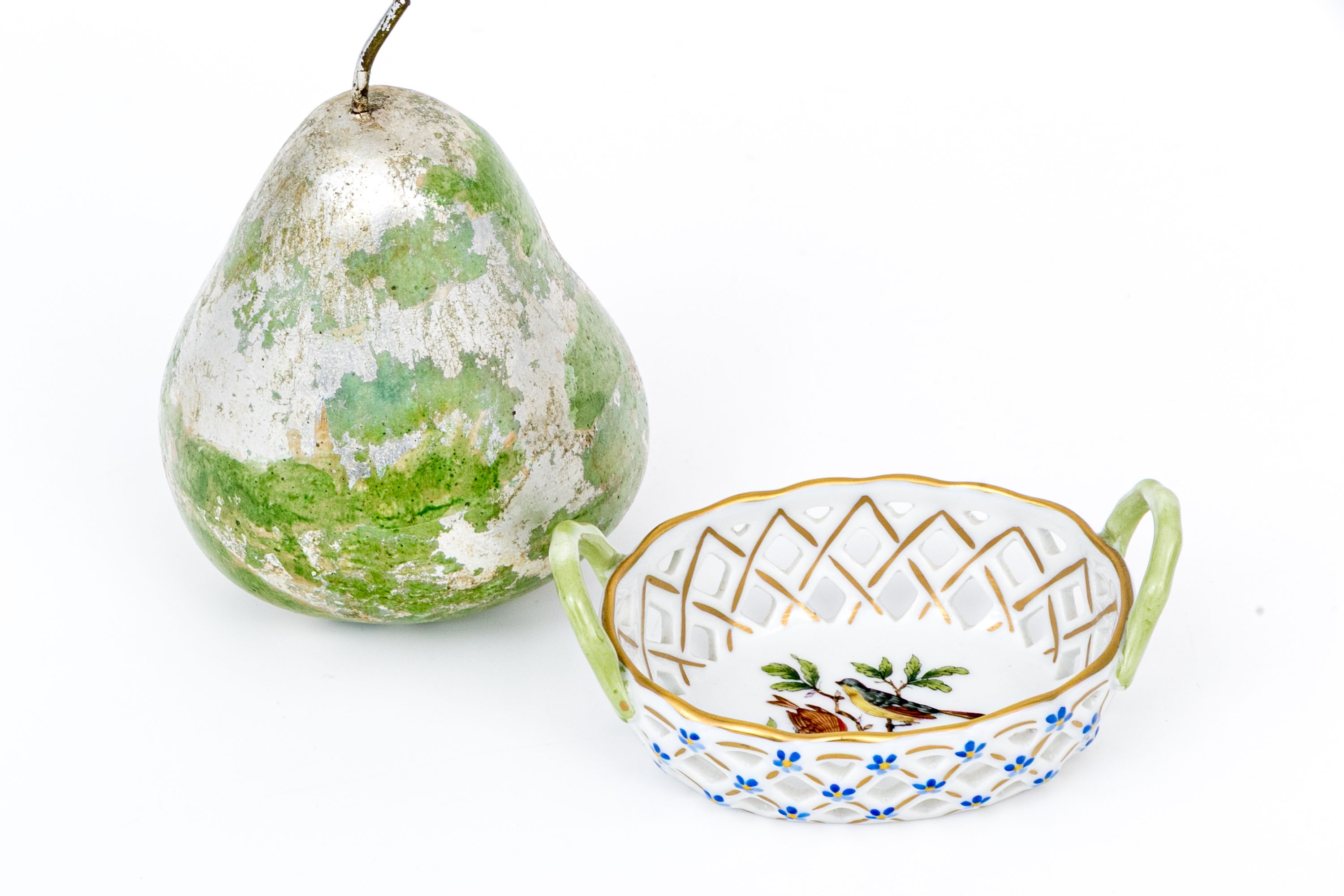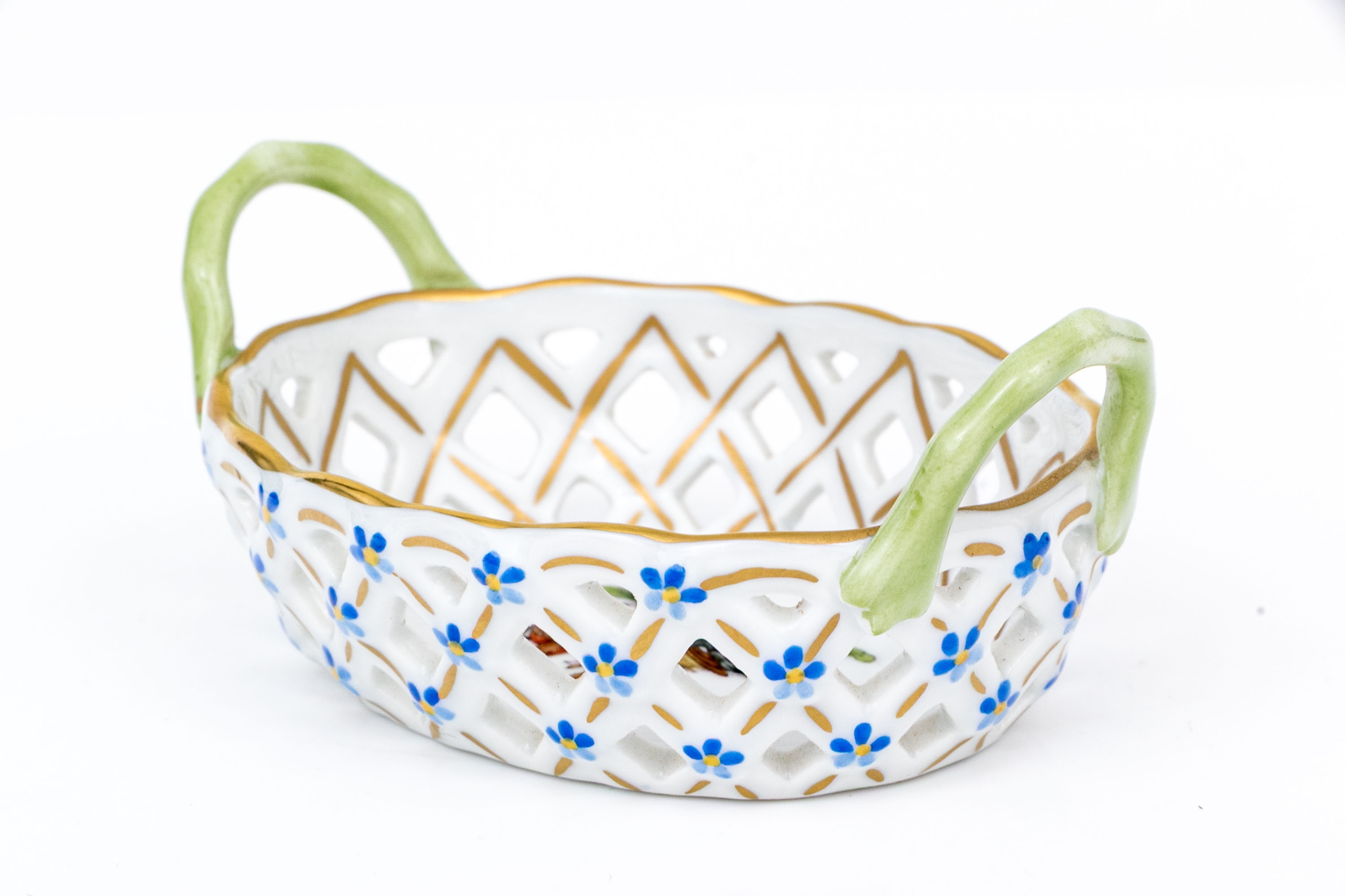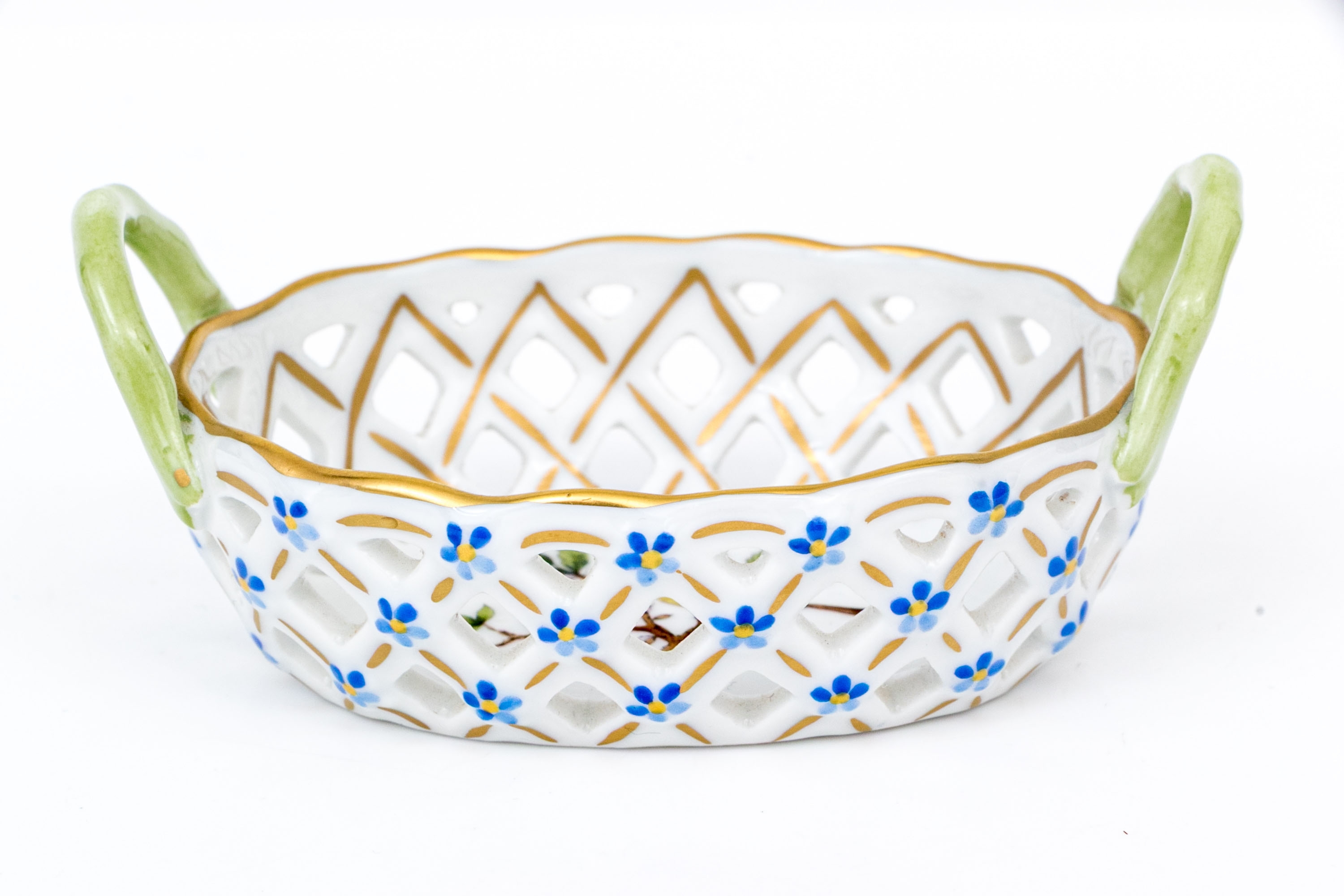 Herend Hungary porcelain openwork basket in the Rothschild Bird (RO) pattern. The interior features two finely hand-painted songbirds perched on a leafy branch, rendered in rich naturalistic tones of yellow, gray, and rust red, symbolizing peace and prosperity. This intricate avian motif is framed by a pierced lattice rim accented in hand-applied 24K gold. The basket’s exterior is adorned with delicate hand-painted blue flowers, while the handles are finished in soft green glaze.cThe underside bears the Herend blue shield hallmark with crossed paintbrushes and HANDPAINTED inscription, along with number 7425/KO 15-A
