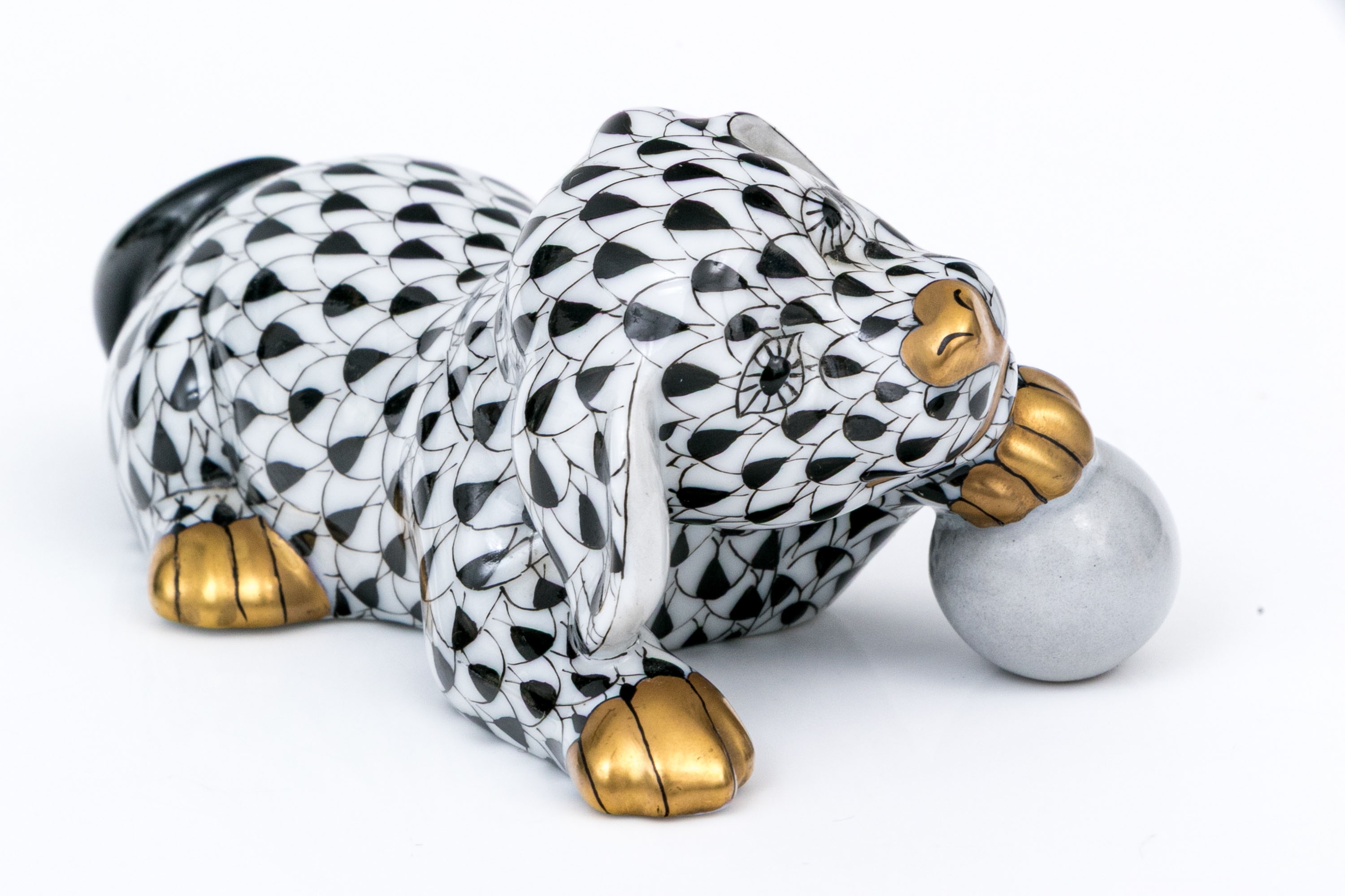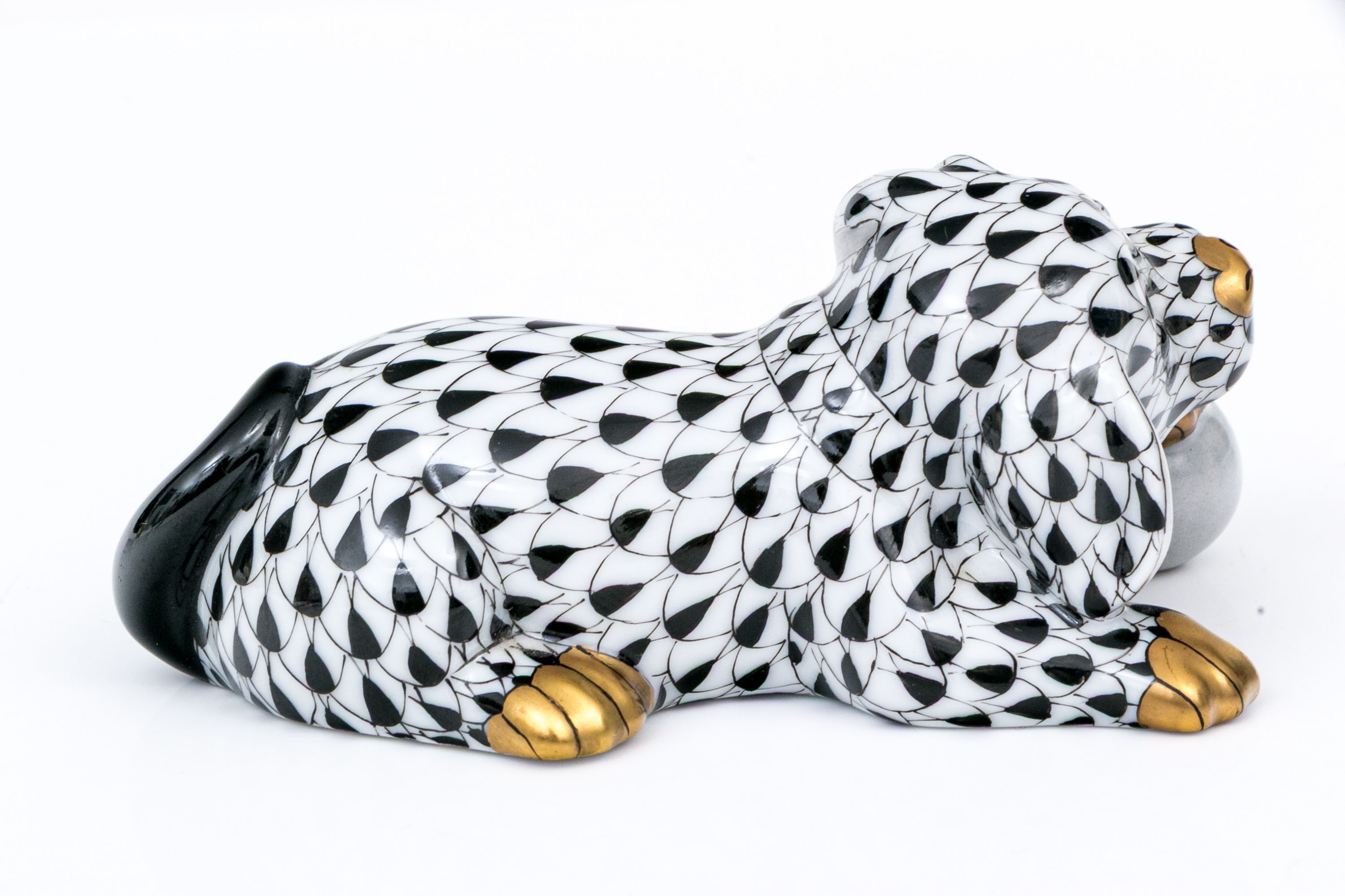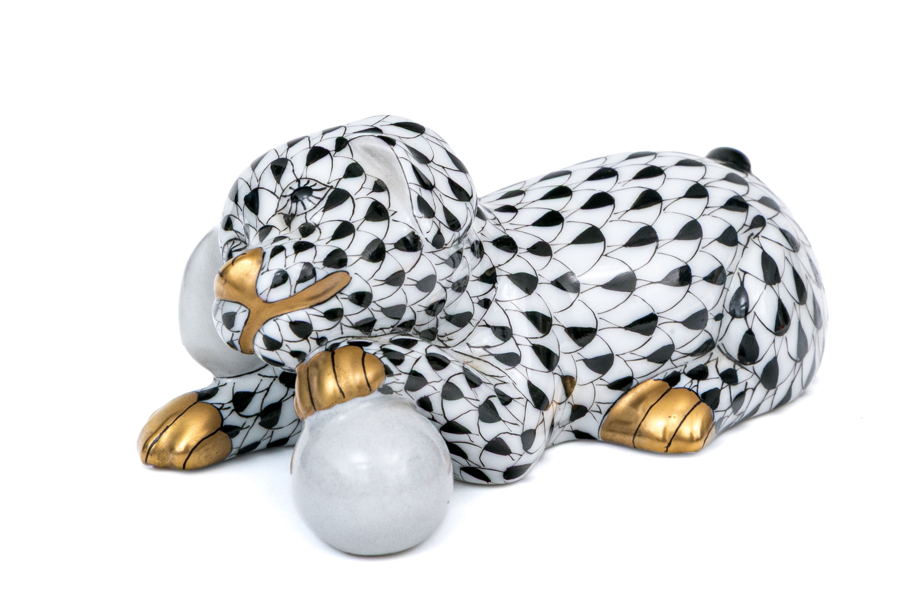 Herend Hungary porcelain puppy figure, hand-painted in the elegant Black Fishnet pattern. This playful puppy reclines with a gentle expression, one paw resting atop a smooth porcelain ball.