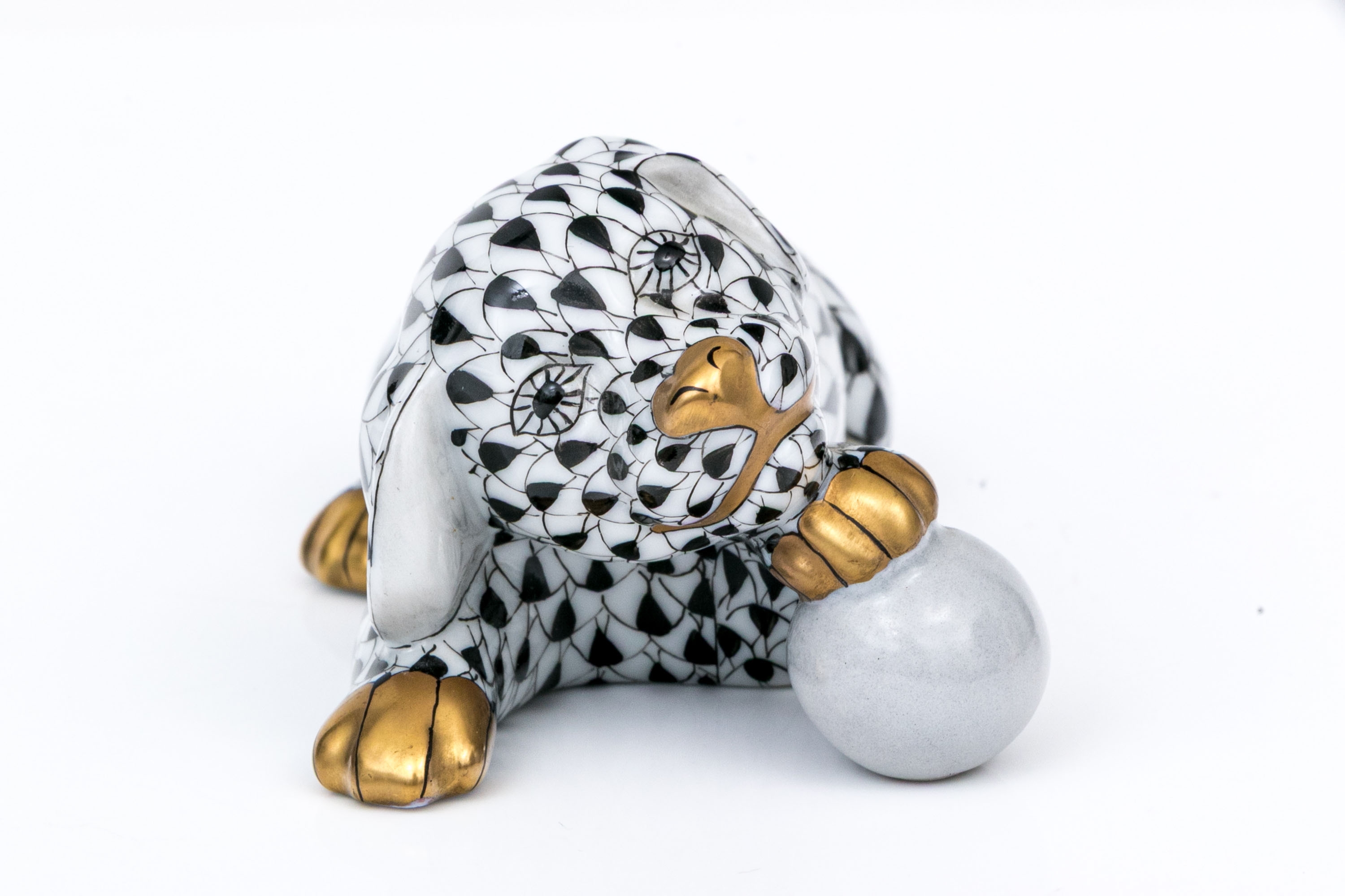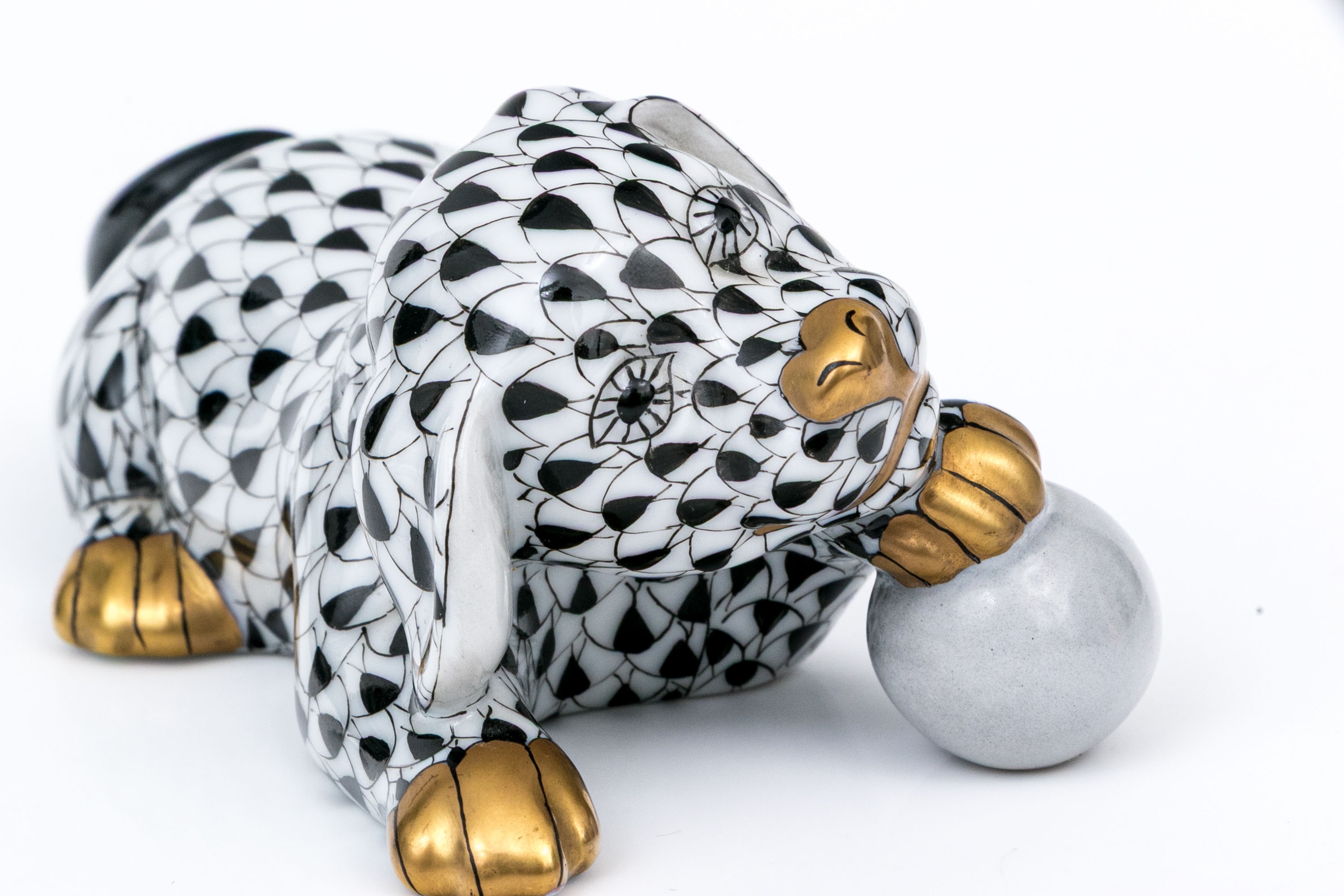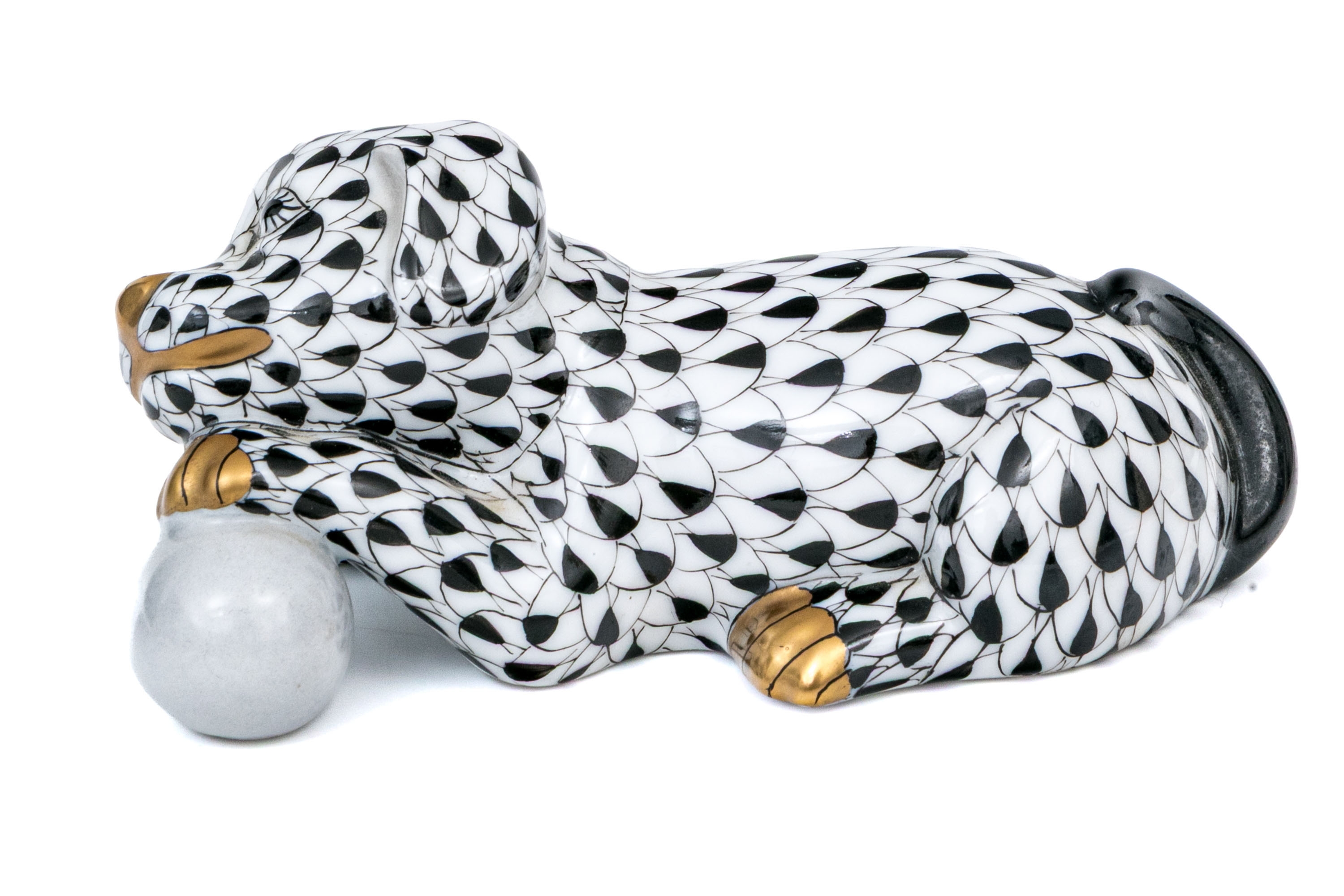 Herend Hungary porcelain puppy figure, hand-painted in the elegant Black Fishnet pattern. This playful puppy reclines with a gentle expression, one paw resting atop a smooth porcelain ball.
