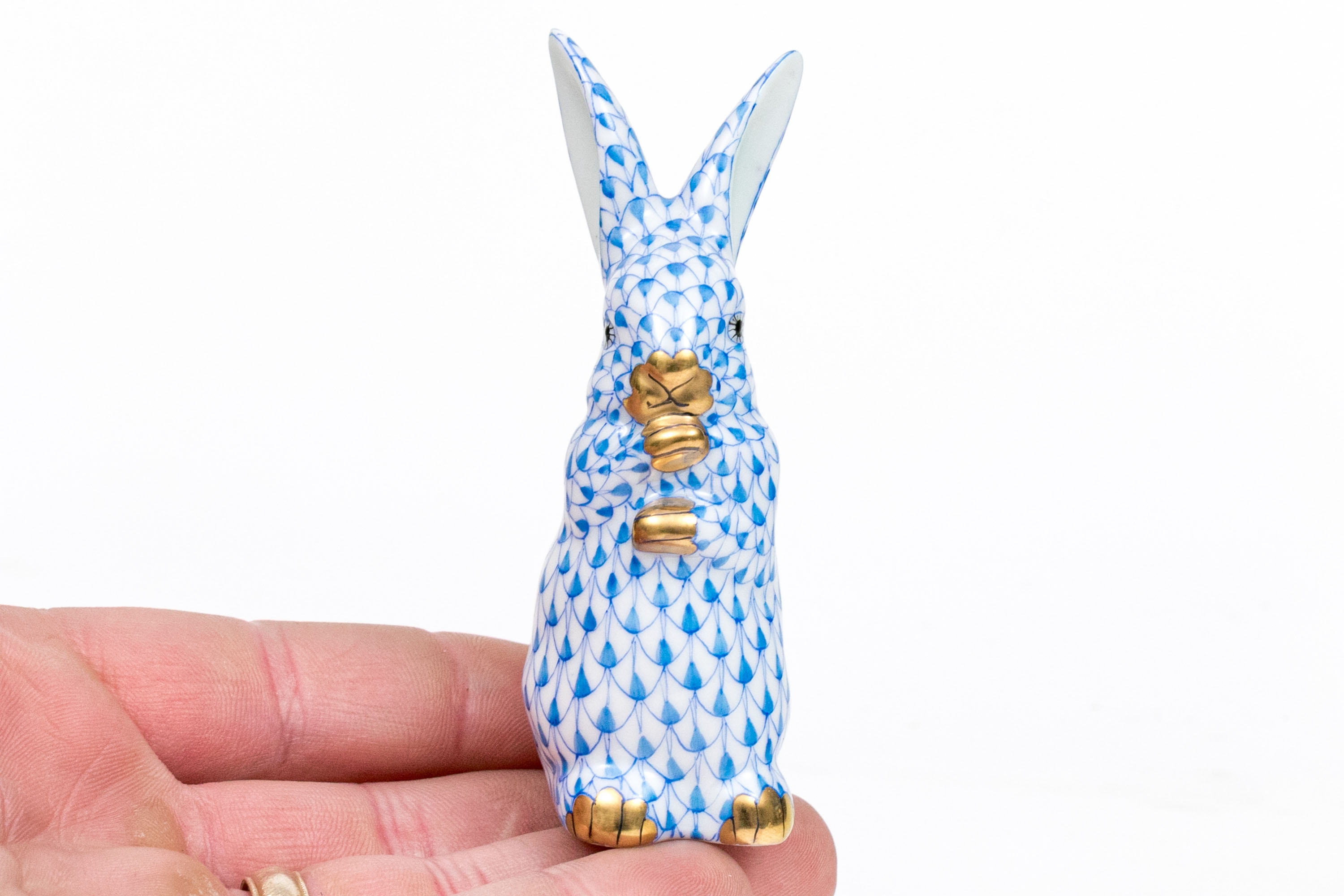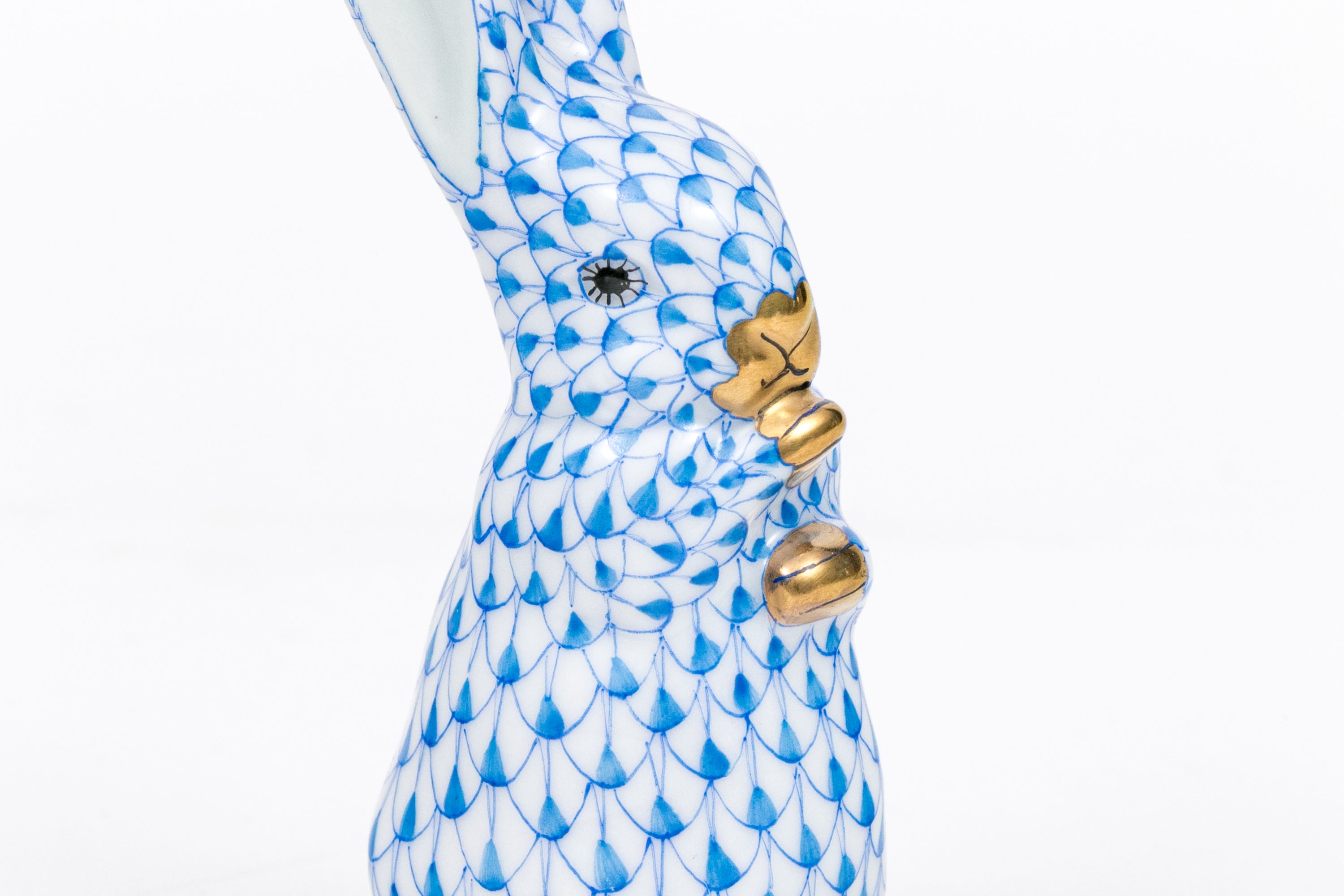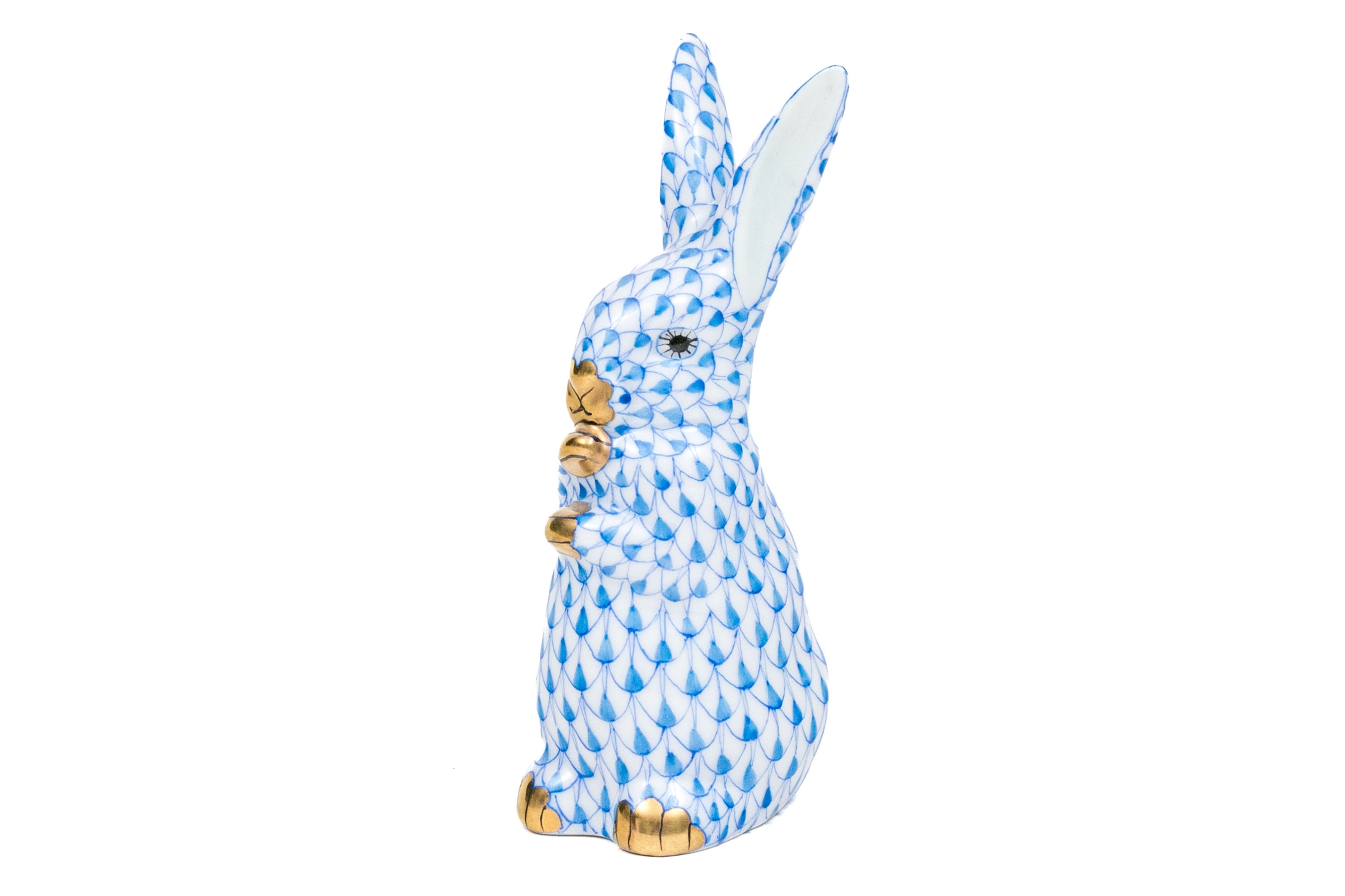 Herend porcelain rabbit figurine, hand-painted in the iconic blue fishnet (VHB) pattern. The rabbit is captured in an upright pose with its paws tucked to its chest. 24K gold accents highlight the paws, nose, and inner eyes,. The interior of the ears is finished in a soft pale blue glaze, adding visual depth and subtle warmth to the figure. The underside bears the Herend Hungary blue shield and crossed paintbrush mark, inscribed Handpainted and numbered 15338-0-00/VHB, with impressed and painter’s marks.