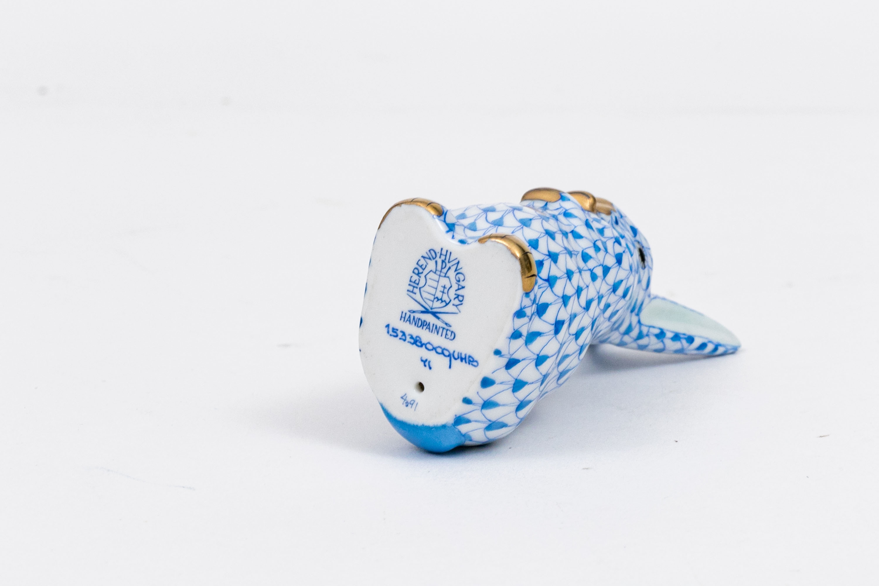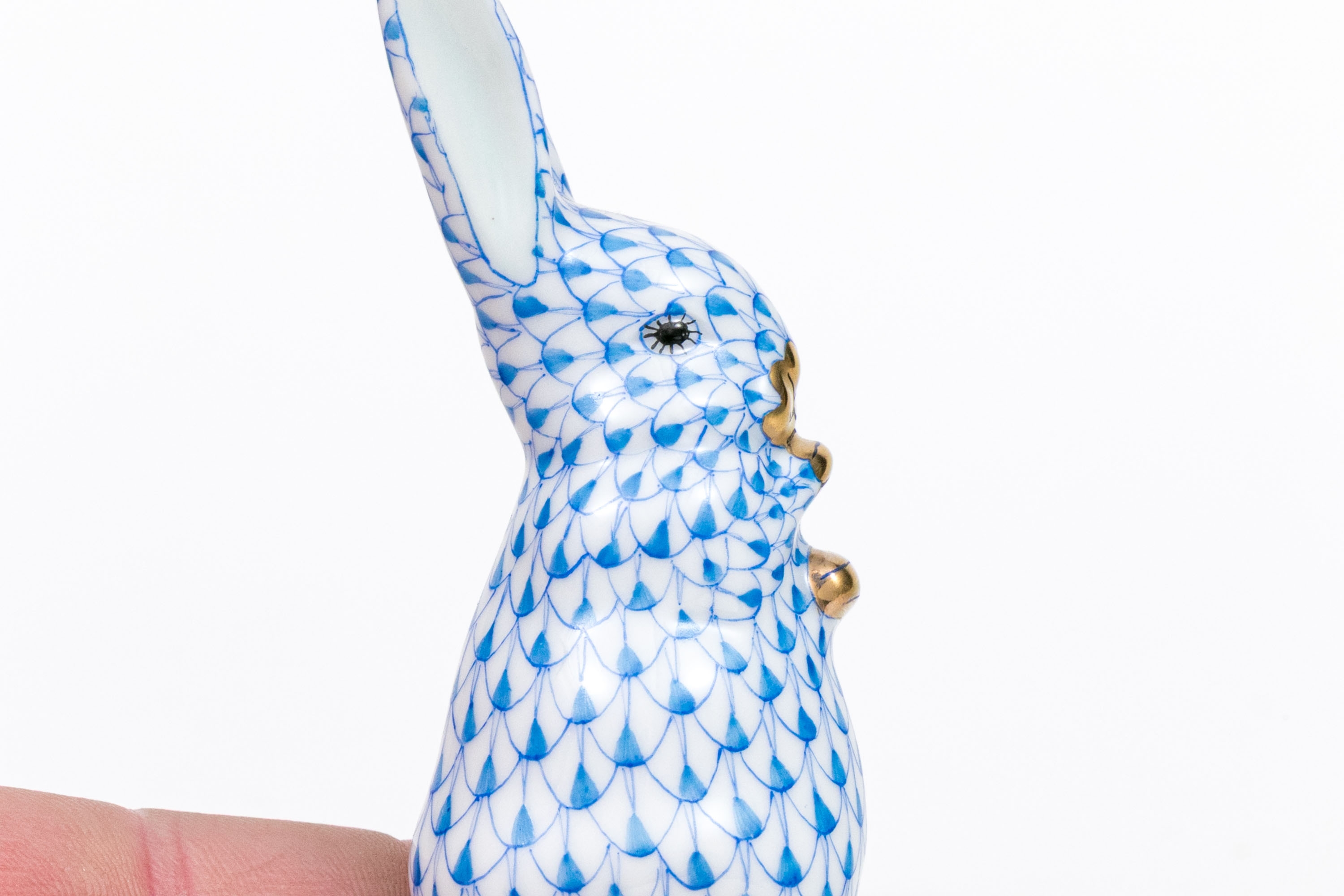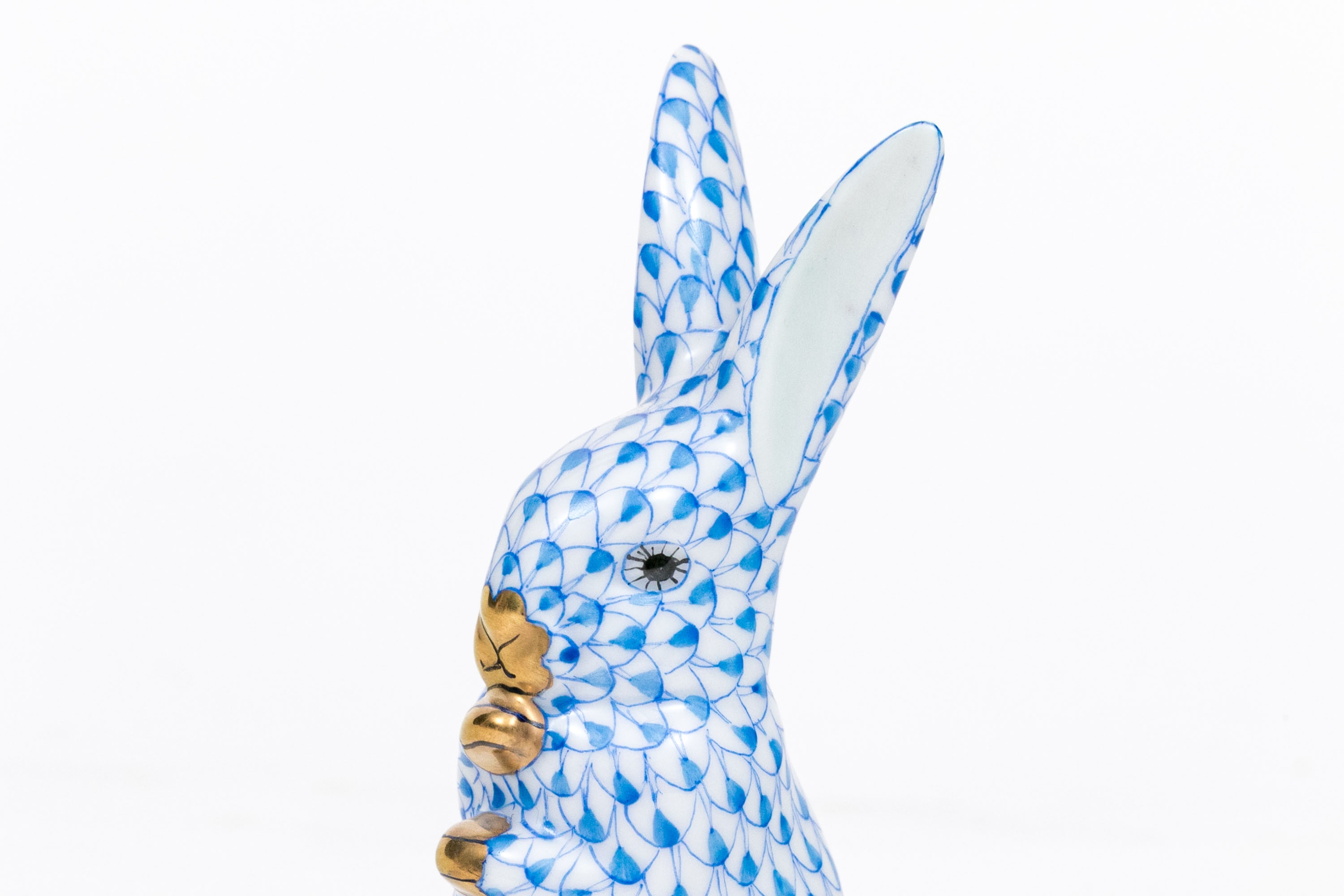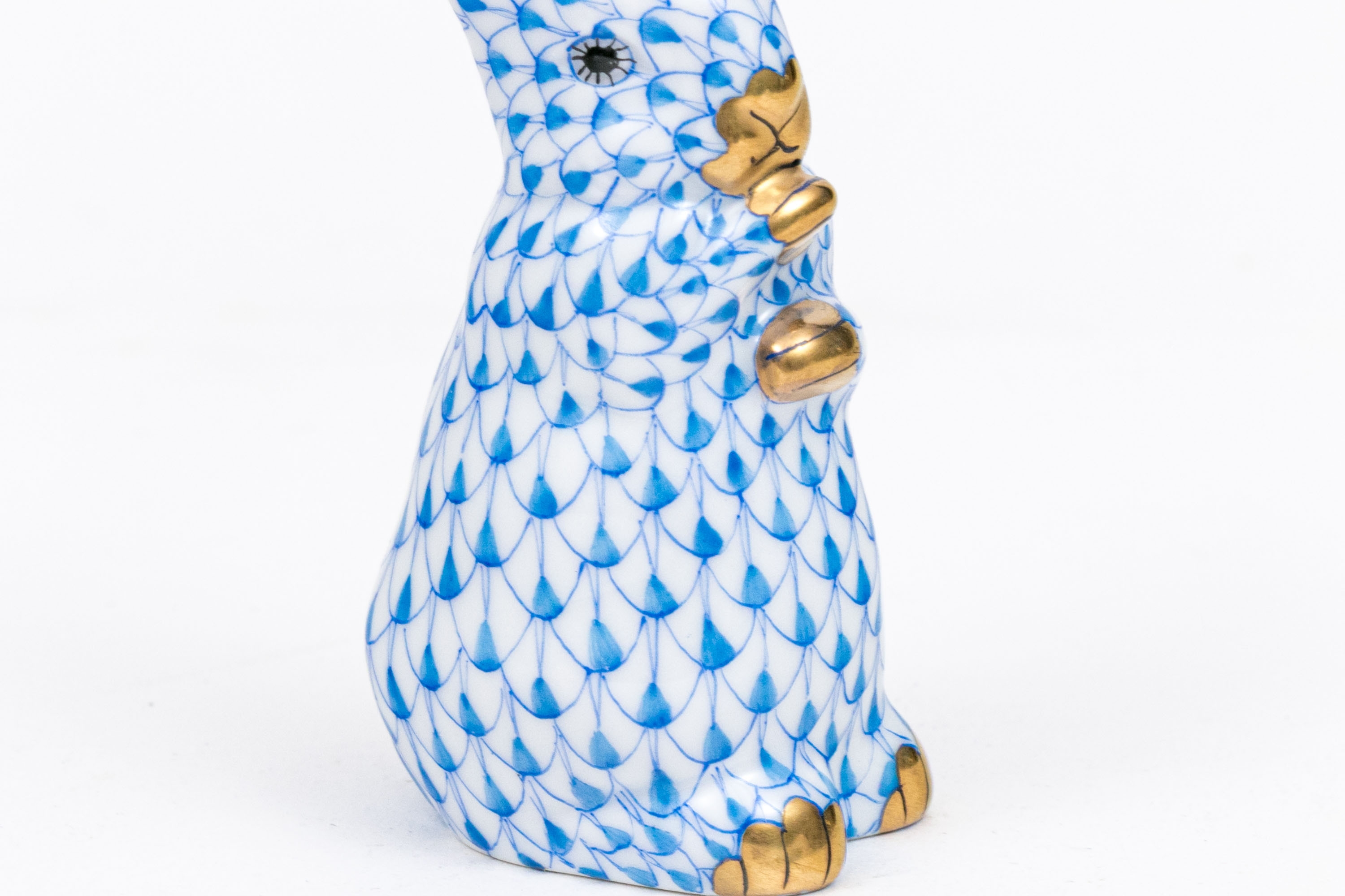 Herend porcelain rabbit figurine, hand-painted in the iconic blue fishnet (VHB) pattern. The rabbit is captured in an upright pose with its paws tucked to its chest. 24K gold accents highlight the paws, nose, and inner eyes,. The interior of the ears is finished in a soft pale blue glaze, adding visual depth and subtle warmth to the figure. The underside bears the Herend Hungary blue shield and crossed paintbrush mark, inscribed Handpainted and numbered 15338-0-00/VHB, with impressed and painter’s marks.