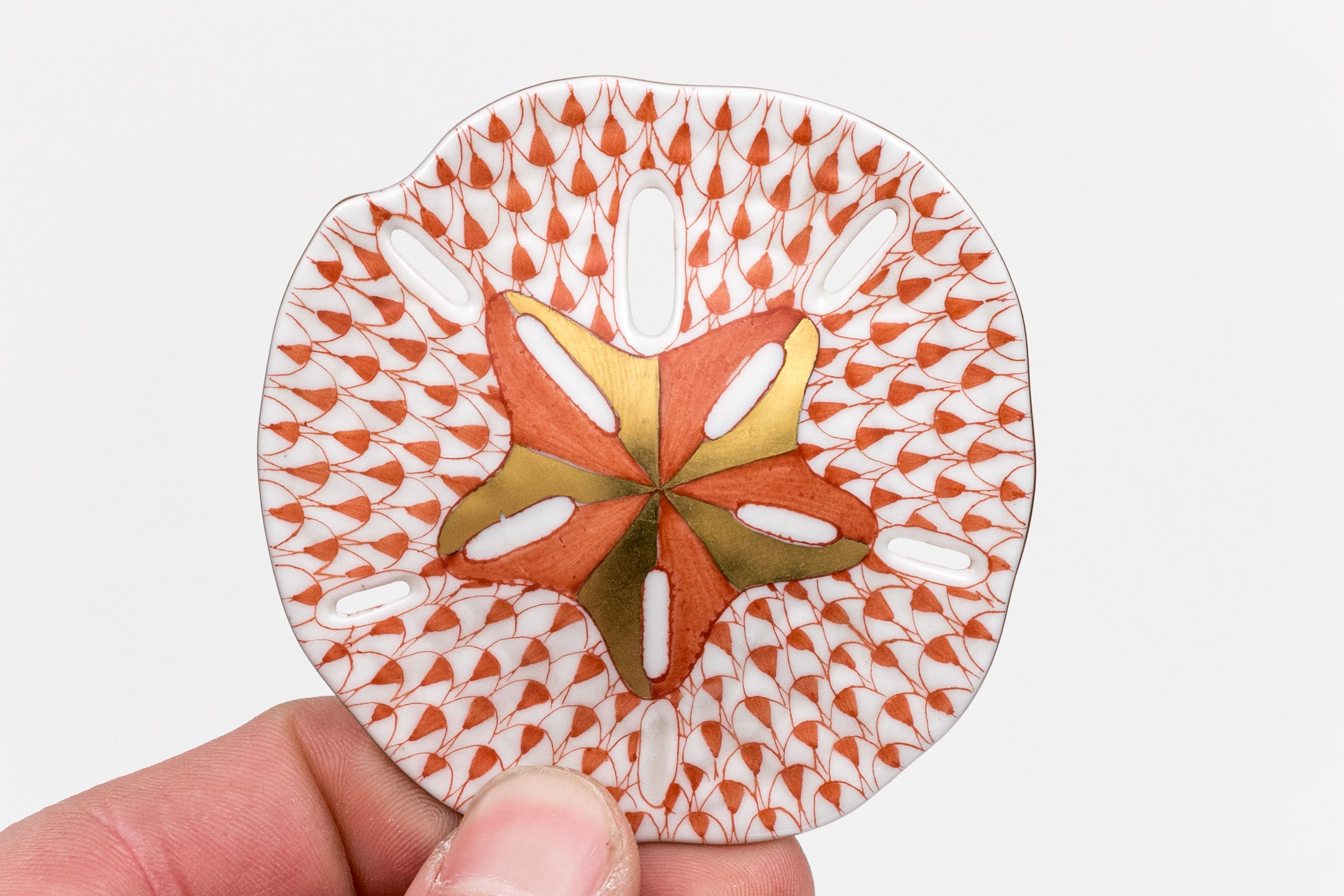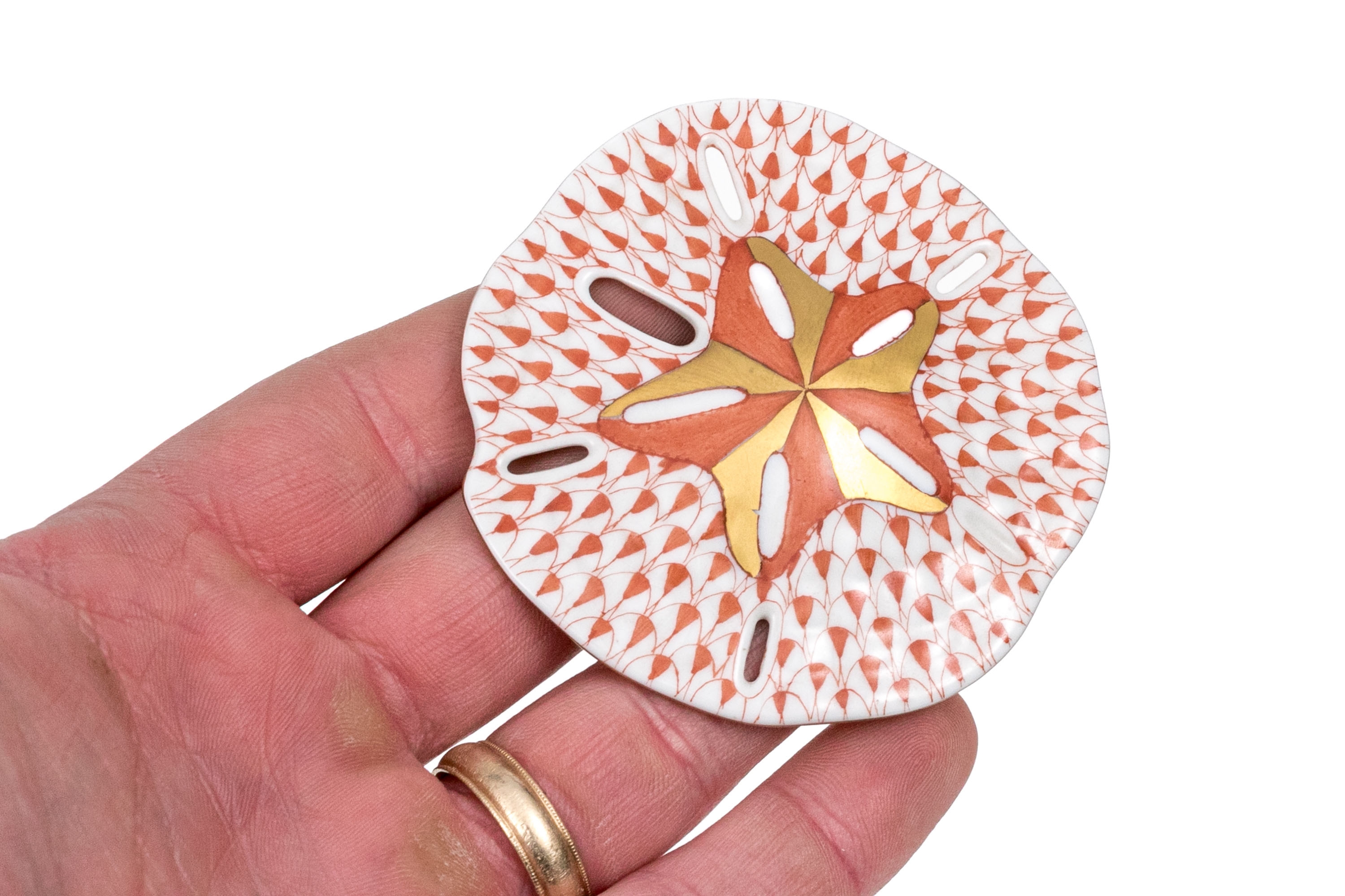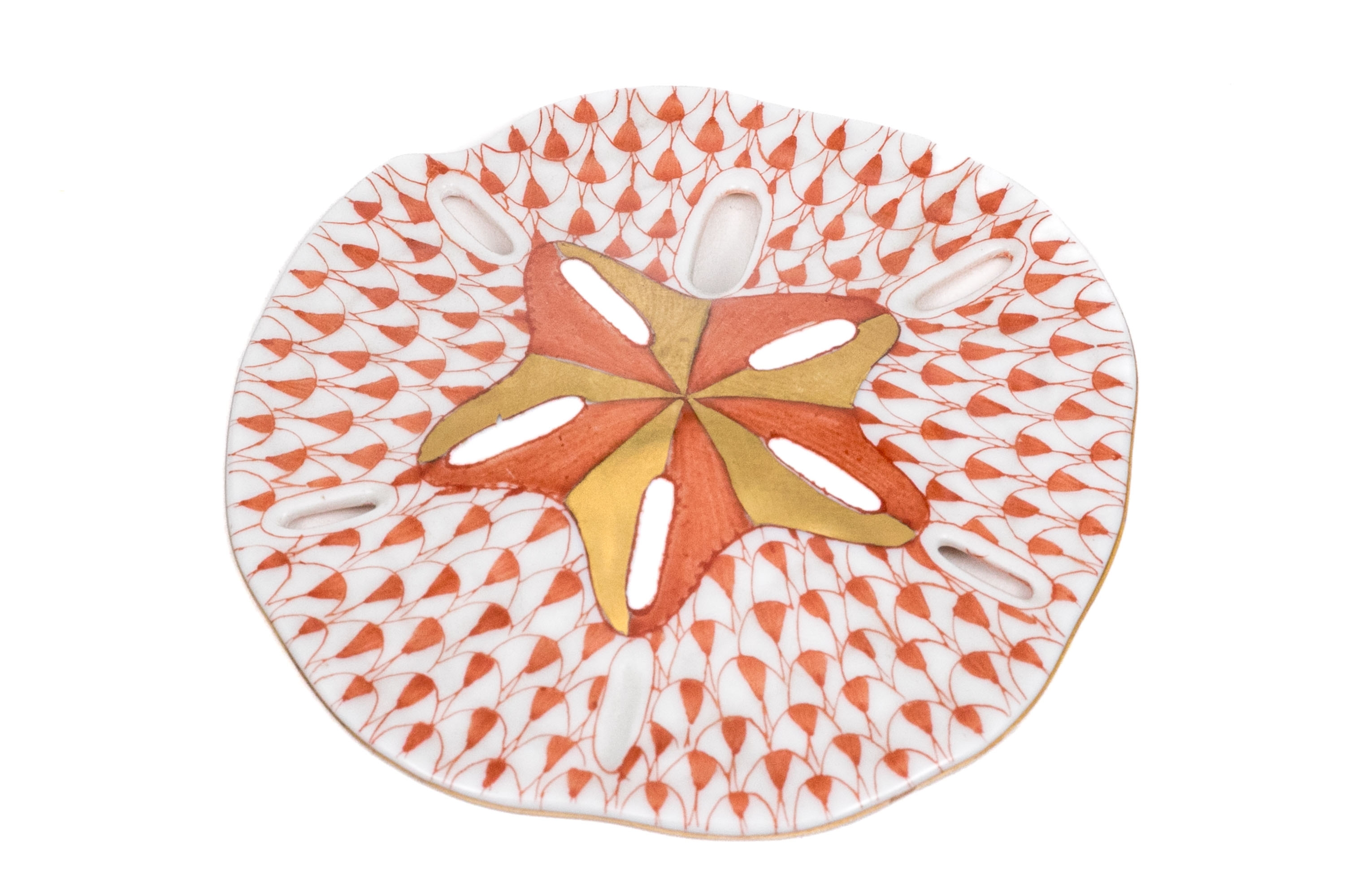 Herend Hungary porcelain sand dollar, beautifully hand-painted in the Rust Fishnet pattern with 24K gold accents. The sand dollar’s surface features Herend’s signature fishnet motif in warm rust orange, radiating from a central star design highlighted with matte gold and ochre detailing. The openwork apertures and subtle scalloping along the edge lend a delicate, lifelike texture.