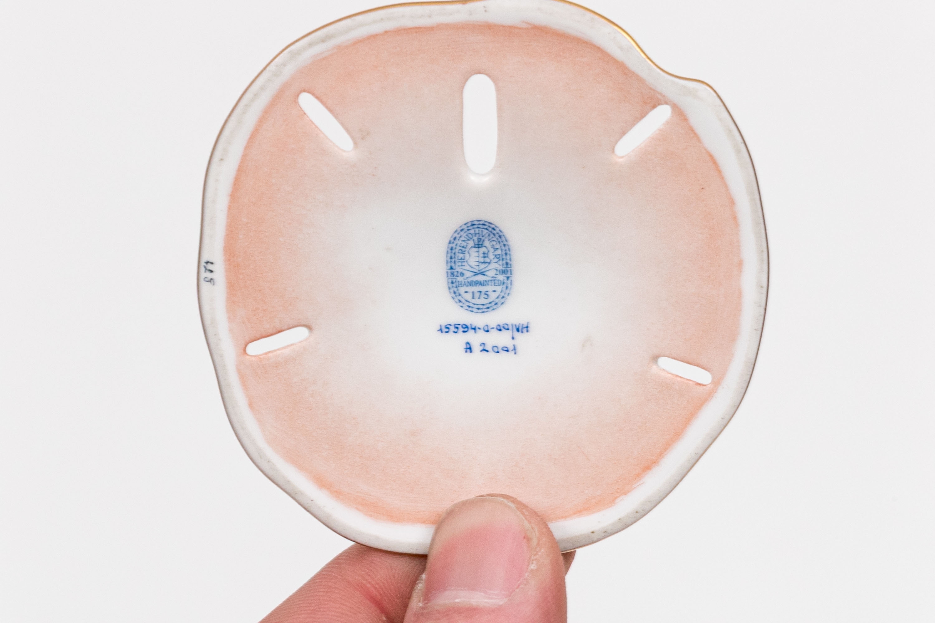 The underside bears the Herend Hungary oval anniversary mark, commemorating the 175th anniversary of the manufactory (1826–2001), stamped Handpainted and numbered 15594-0-00/VH, with the painter’s mark and date code A 2001.