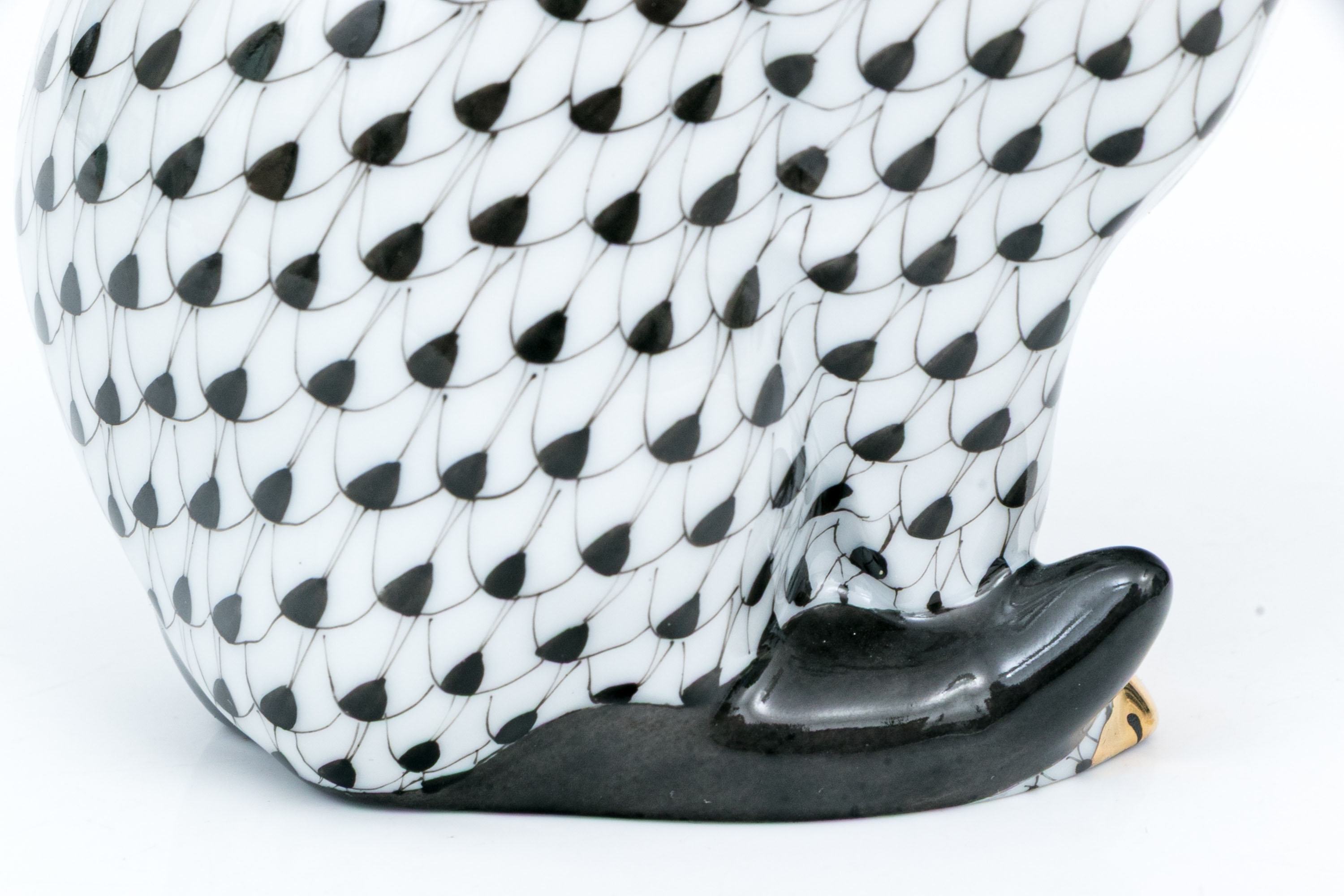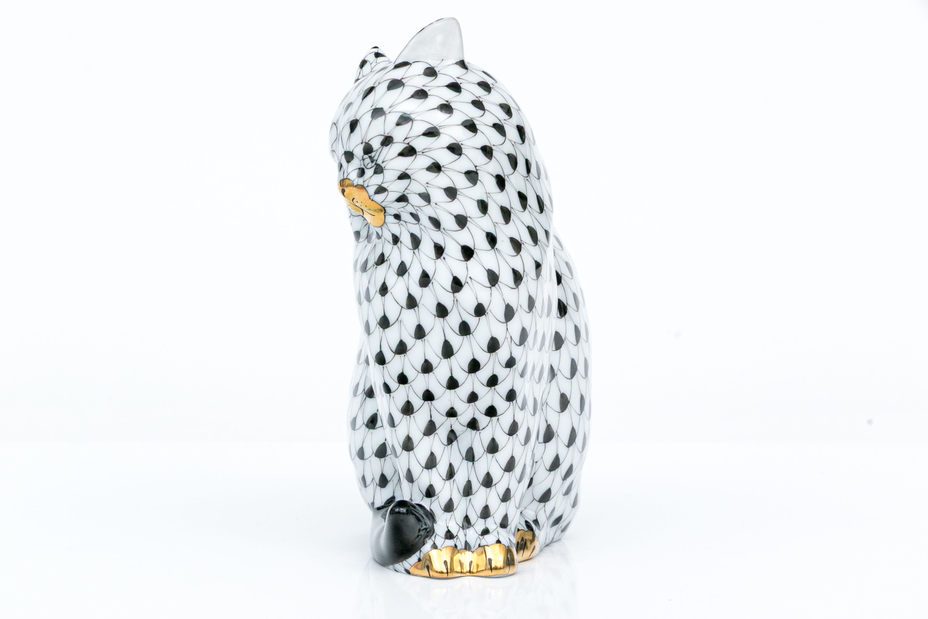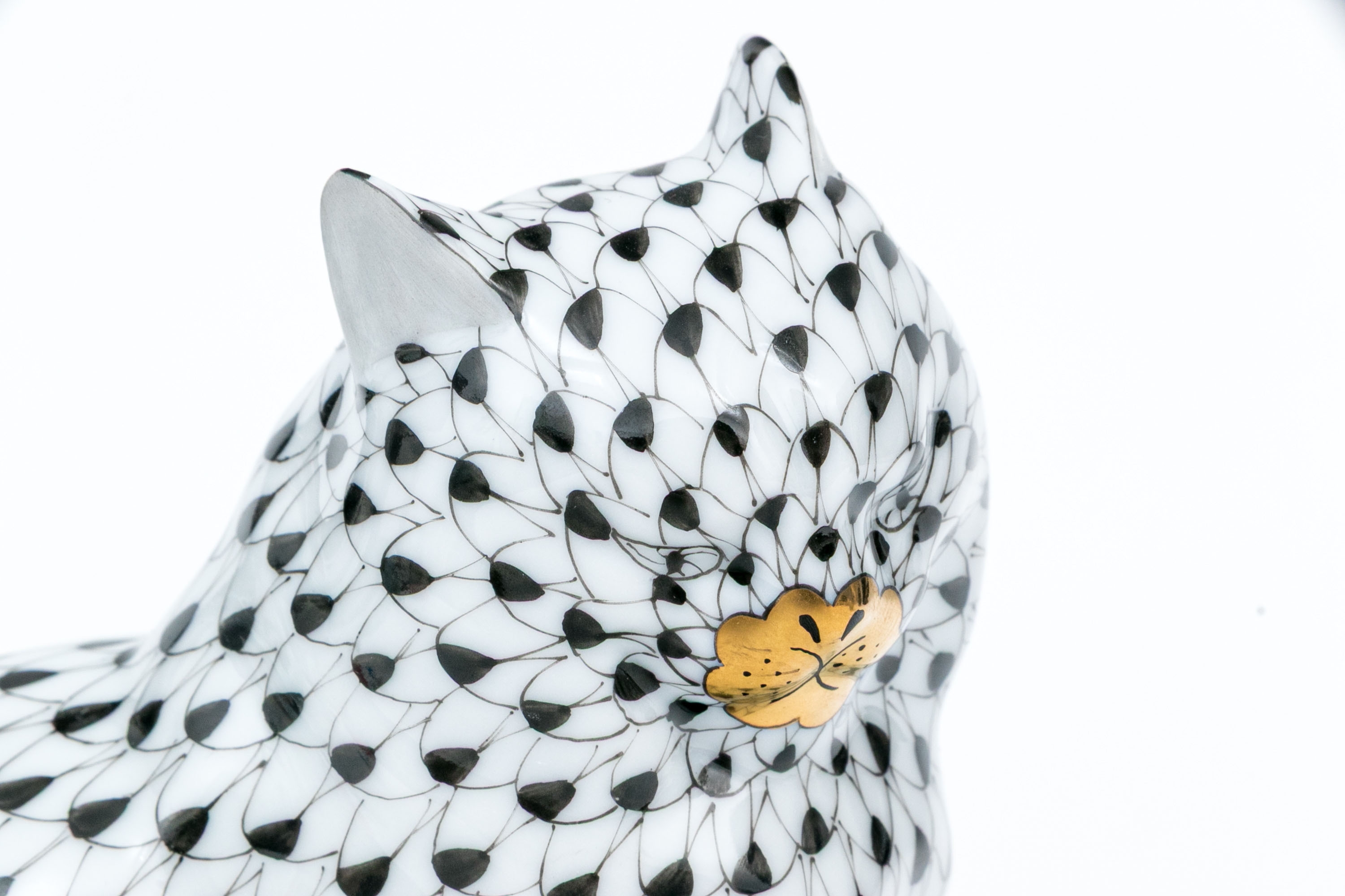 This porcelain cat figure by Herend is model 5383, a seated feline rendered with serene poise and soft curves. The piece is hand-painted in the iconic black fishnet (VHNM) pattern. The cat’s face is accentuated by a 24K gold nose and whisker detailing, while the paws are gilded in rich gold, adding a touch of warmth and contrast to the glossy monochrome surface. The underside bears the blue Herend Hungary shield mark, inscribed HANDPAINTED, with model number 5383-0-00/VHNM.