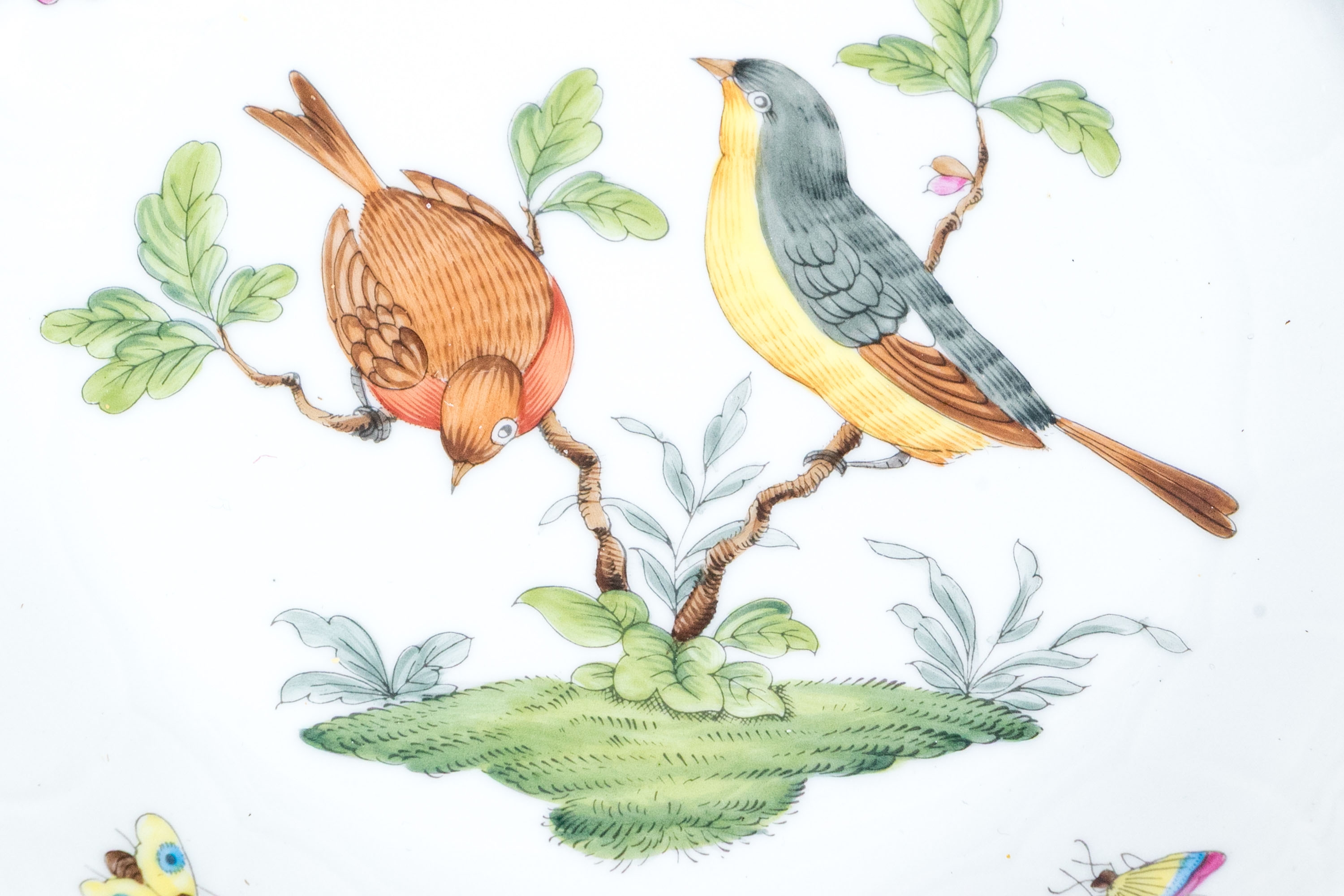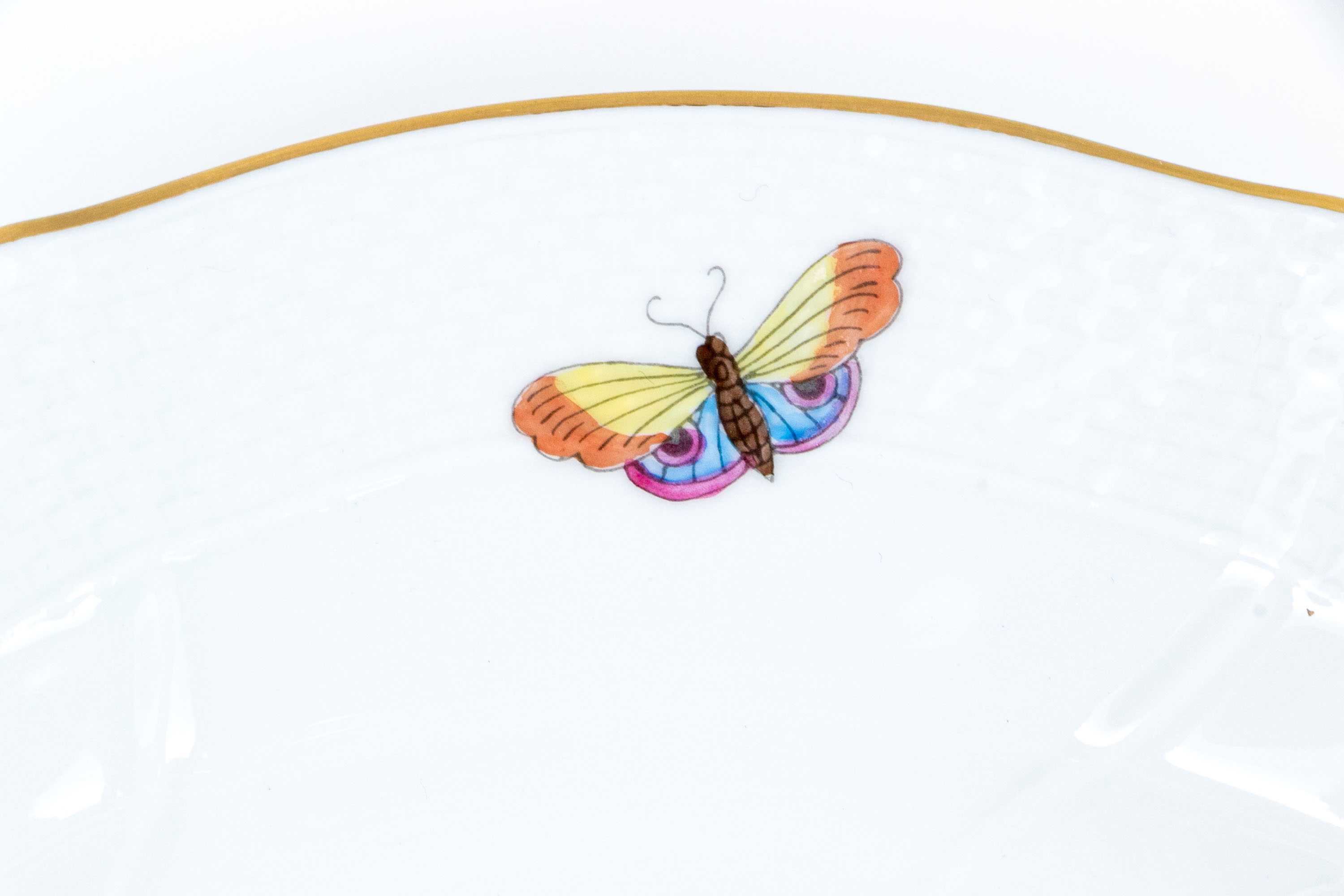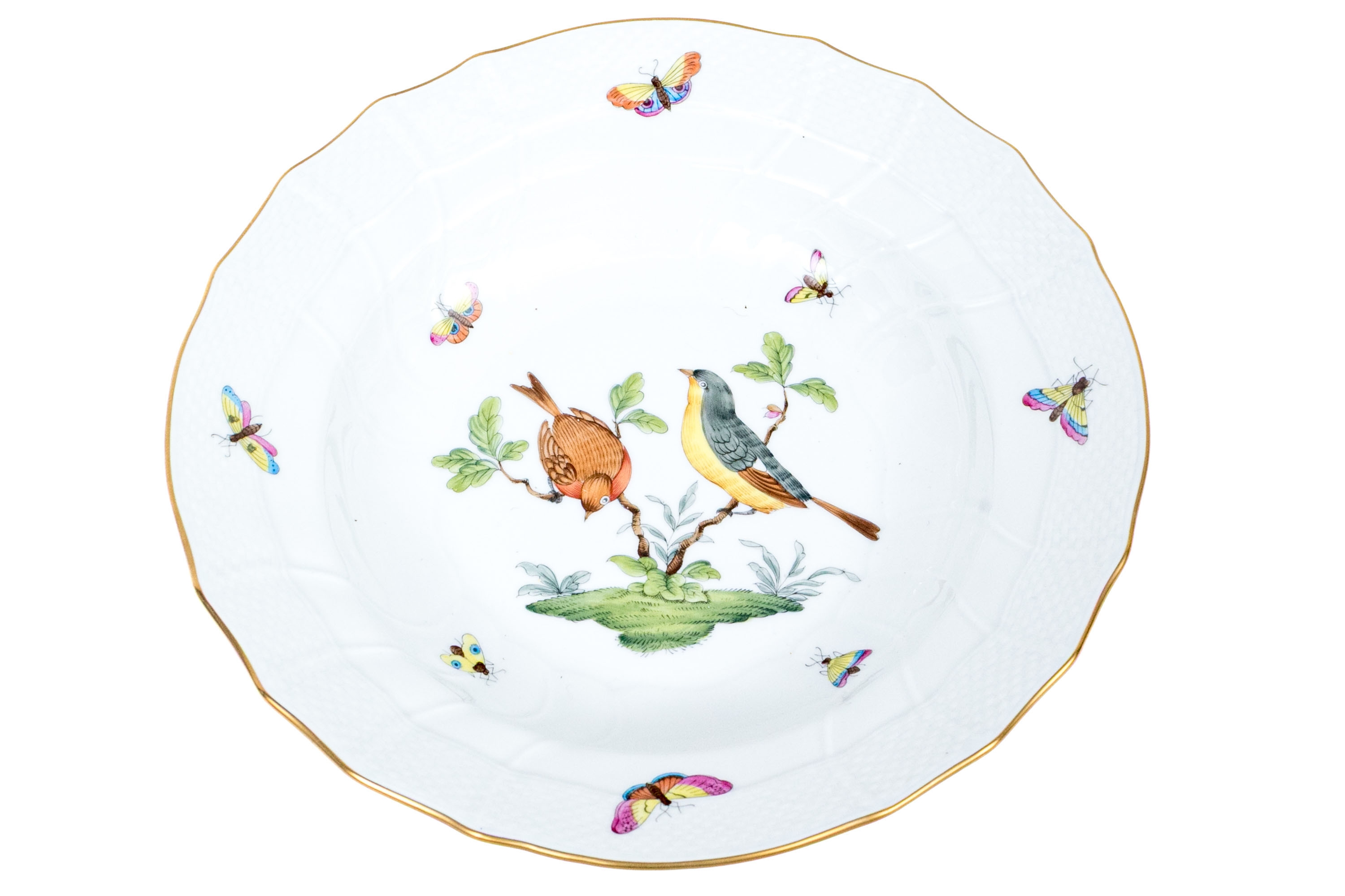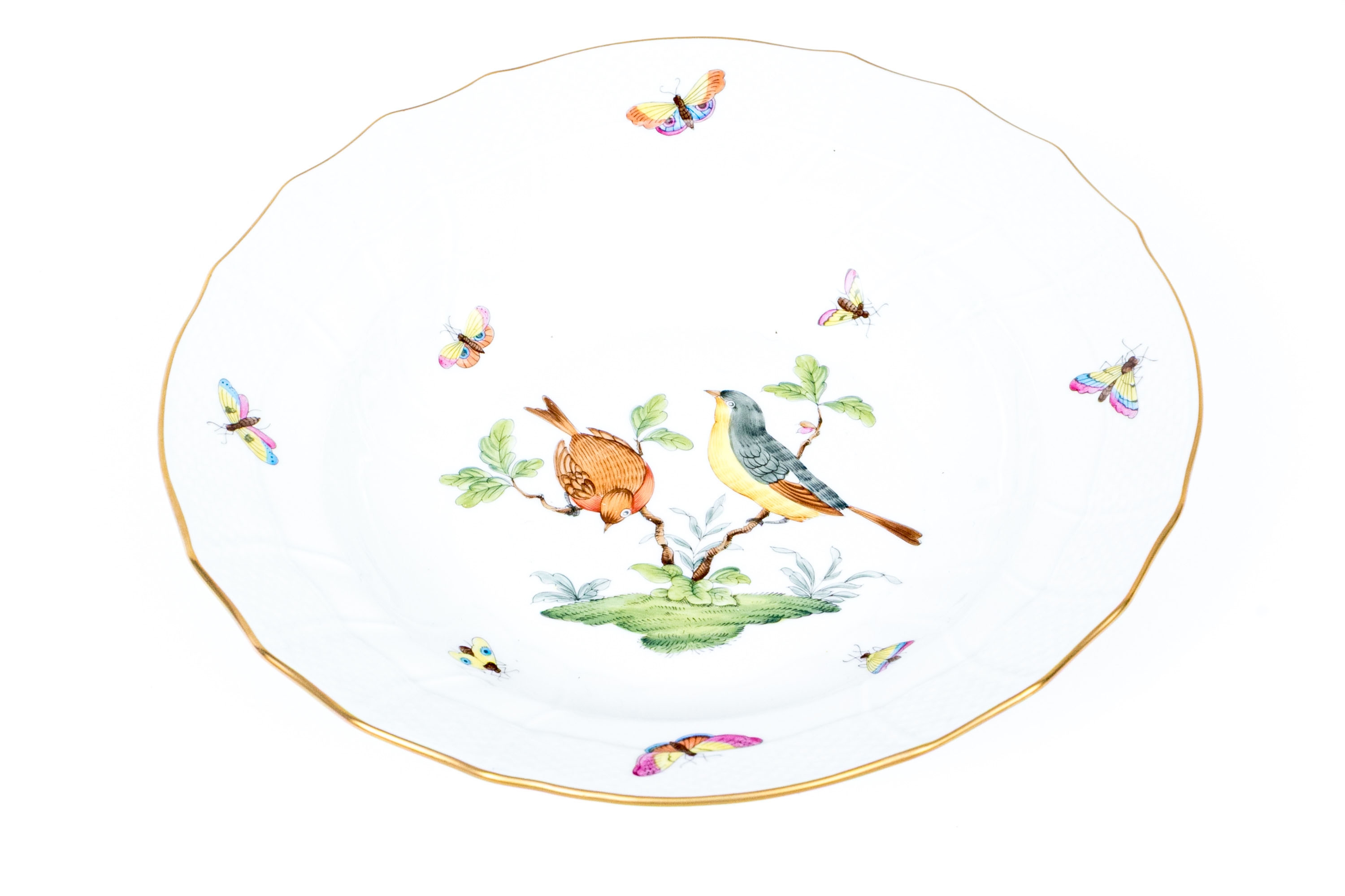 A lovely Herend Hungary hand-painted porcelain plate in the classic Rothschild Bird (RO) pattern, finely detailed with colorful songbirds, butterflies, and 24K gold trim. The plate’s center depicts two delicately rendered birds perched on leafy branches above a grassy mound, surrounded by vividly painted butterflies in bright hues of yellow, pink, orange, and blue. The outer border features Herend’s iconic basketweave relief design and a scalloped edge, all highlighted with a band of hand-applied 24K gold. The underside bears the blue Herend Hungary shield mark, HANDPAINTED, along with the pattern number 1501/RO.