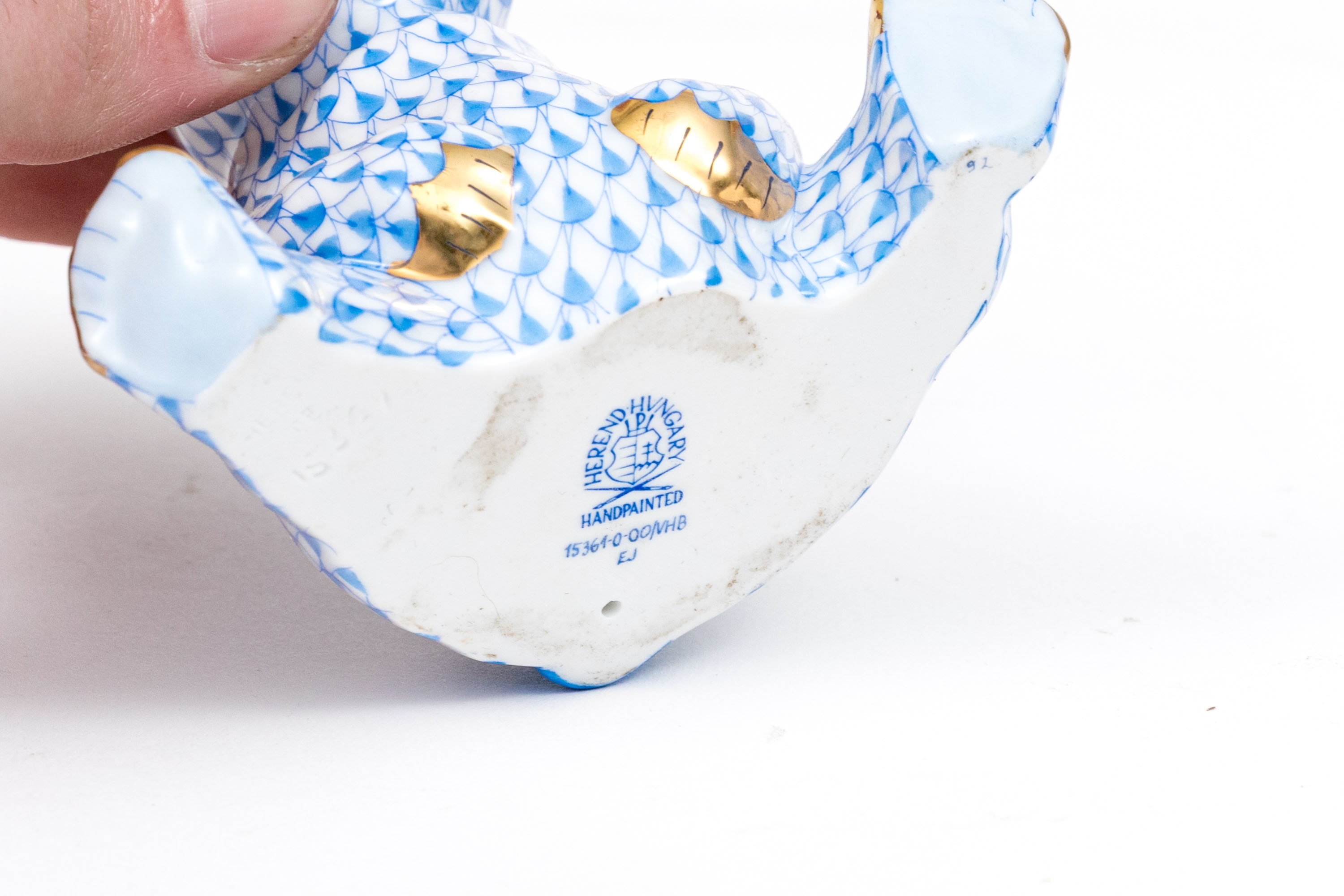 The bear’s surface features Herend’s iconic fishnet motif, hand-painted in soft cobalt blue, complemented by gilded paws, nose, and muzzle. The underside is stamped with the Herend Hungary blue shield hallmark and crossed paintbrushes, marked Handpainted, with the model number 15361-0-00/VHB and painter’s initials.