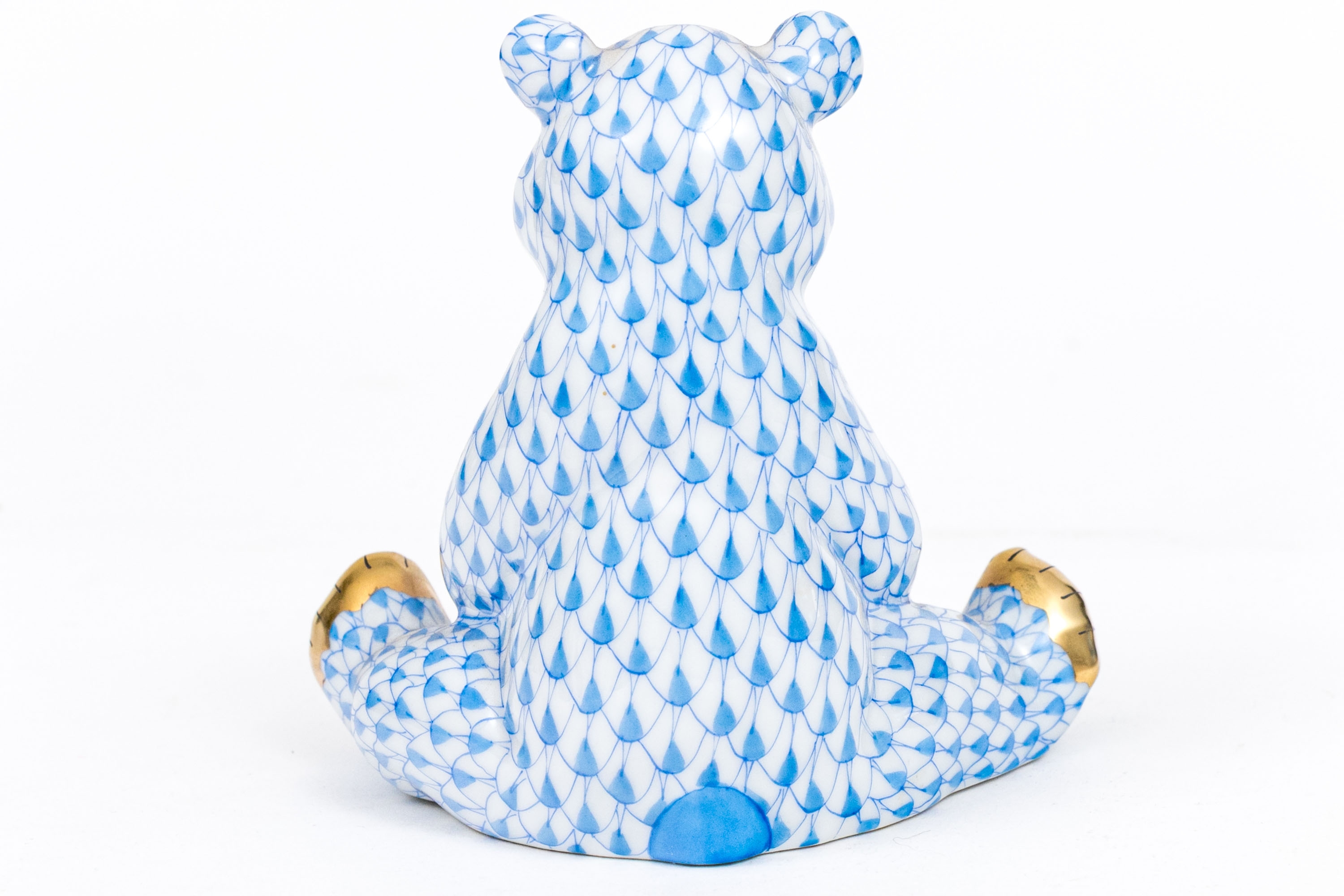 Herend Hungary porcelain sitting bear figure, hand-painted in the Blue Fishnet (VHB) pattern with 24K gold accents. This charming bear, rendered in a seated pose with a gentle expression, is in the "teddy bear" position.