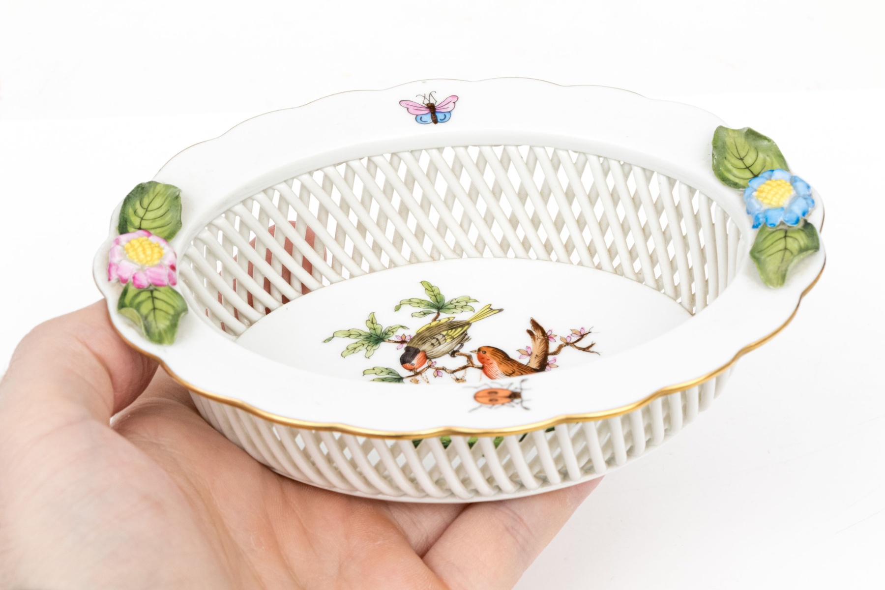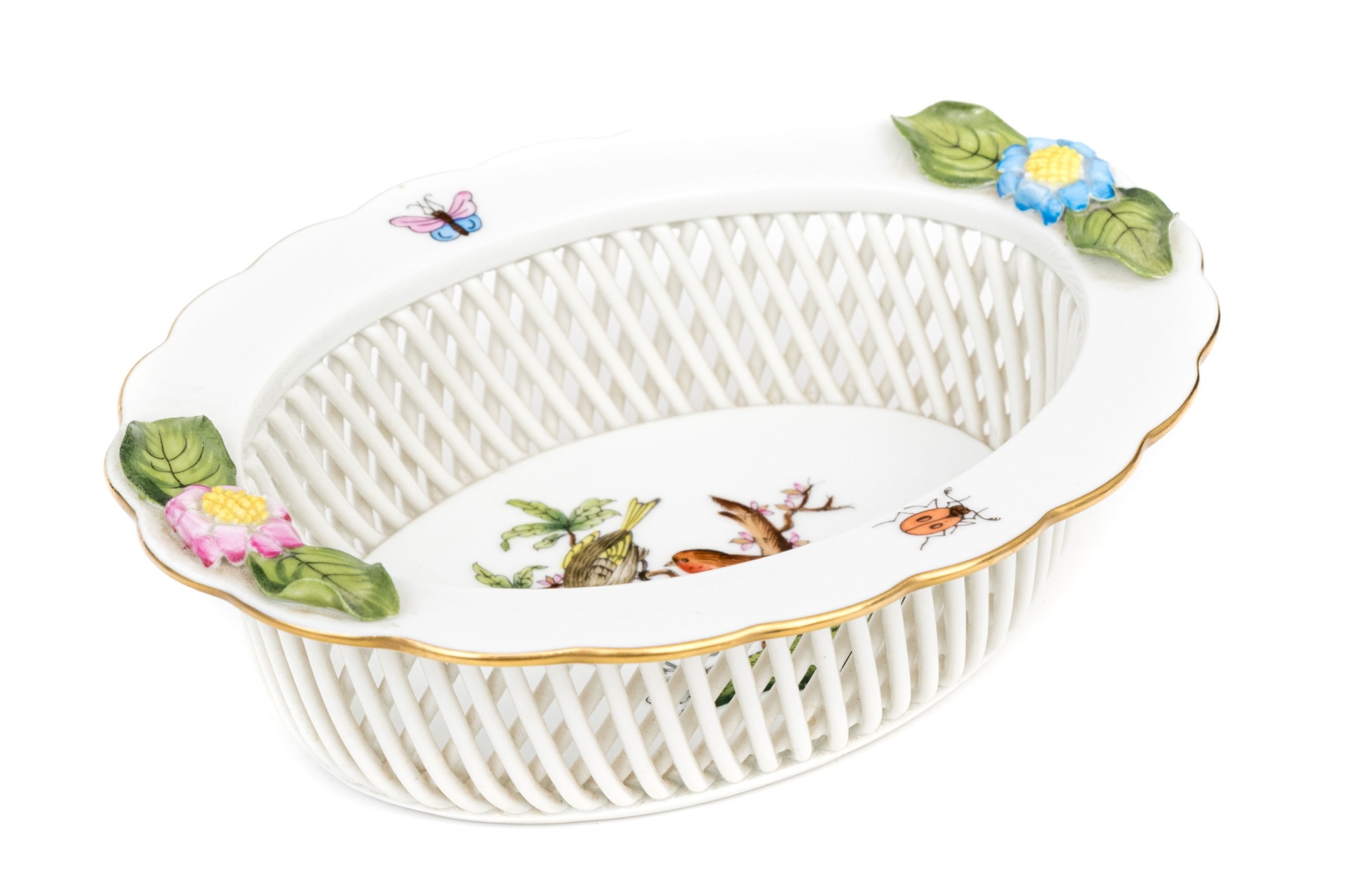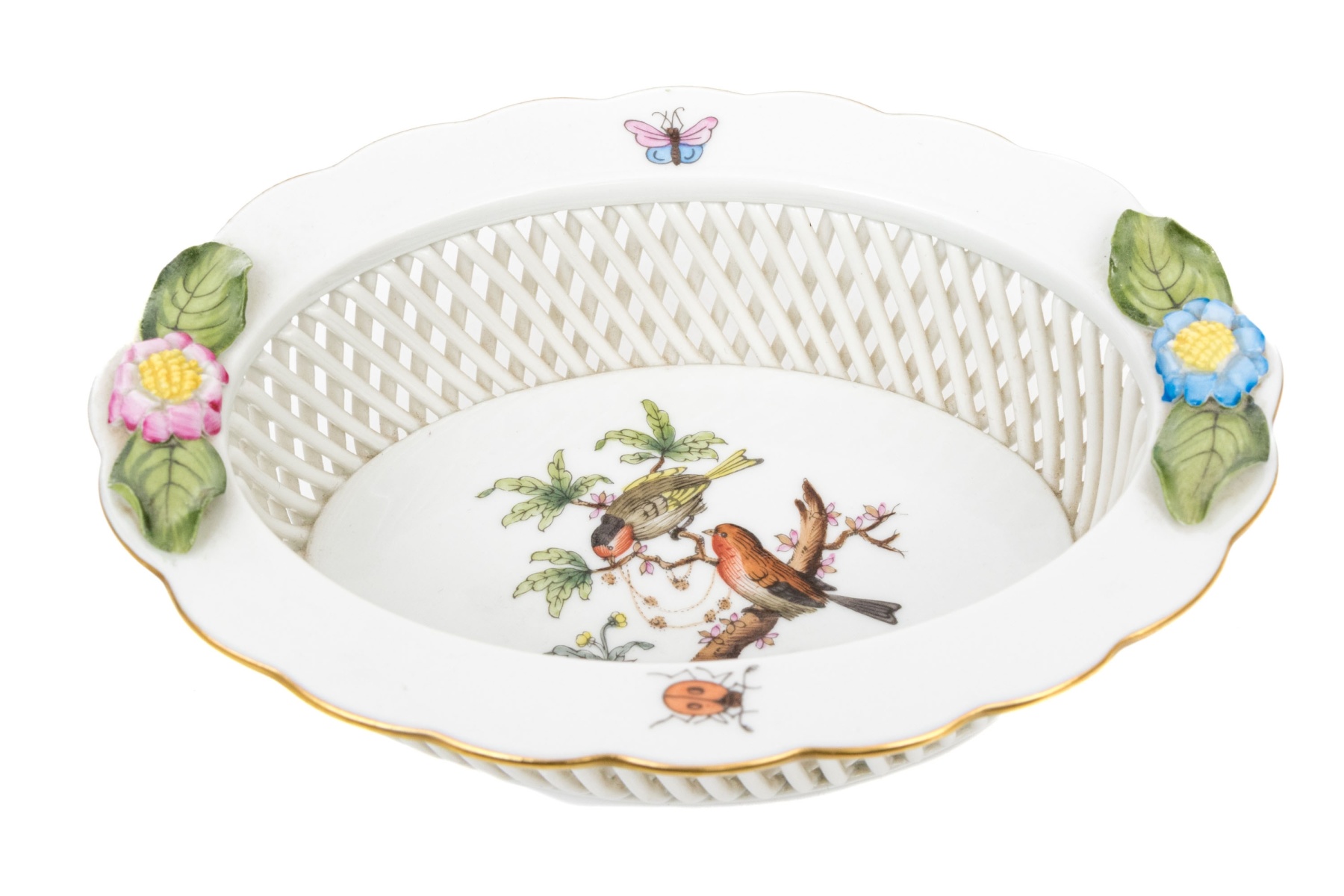 A hand-painted Herend oval reticulated bowl in the Rothschild Bird pattern. The center features a pair of vividly detailed birds perched on a leafy branch with a gold and pearl necklace with a fluttering butterfly above - symbolic of love and prosperity. The pierced latticework sides are bordered by a called rim adorned with hand-applied flower and leaf accents in pastel hues. The underside bears the Herend Hungary blue shield and crossed paintbrush mark, inscribed Handpainted and numbered 7379/RO.