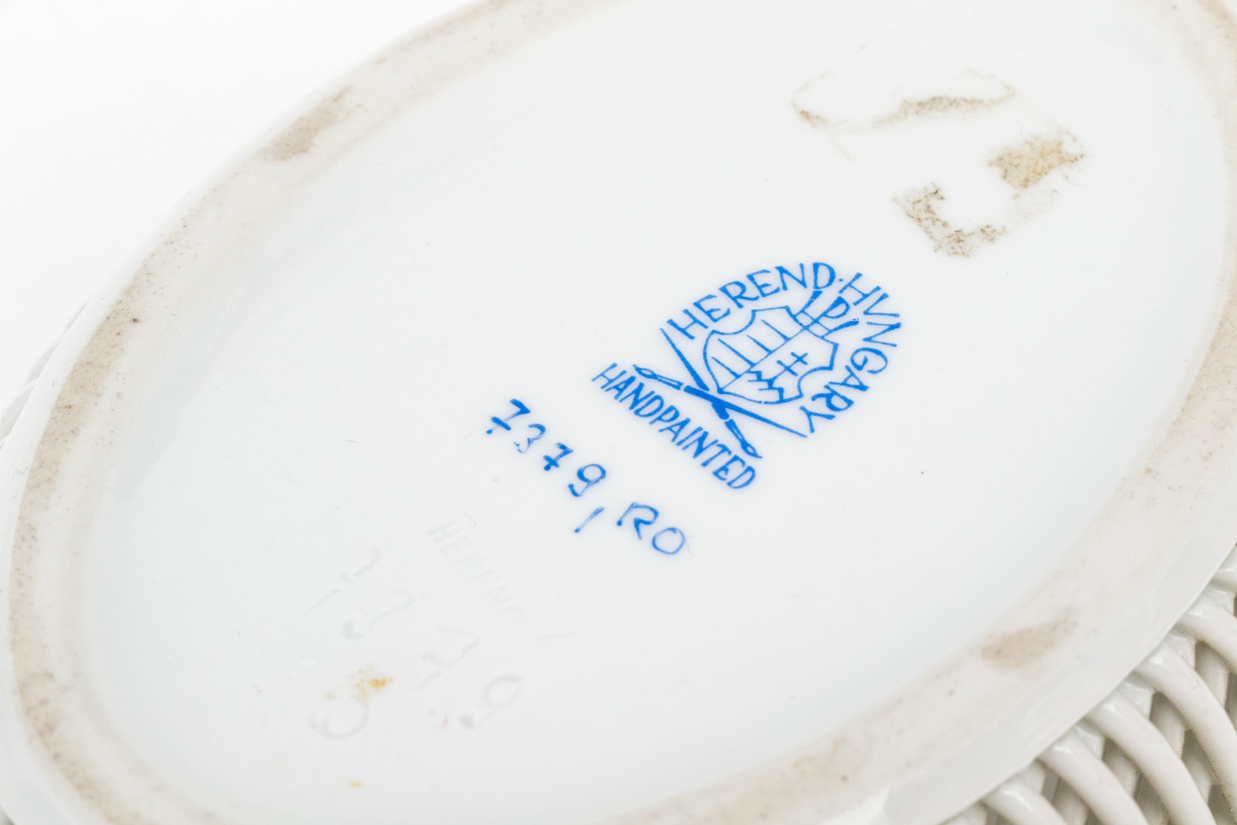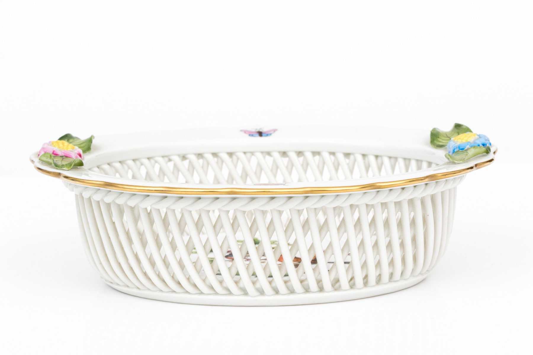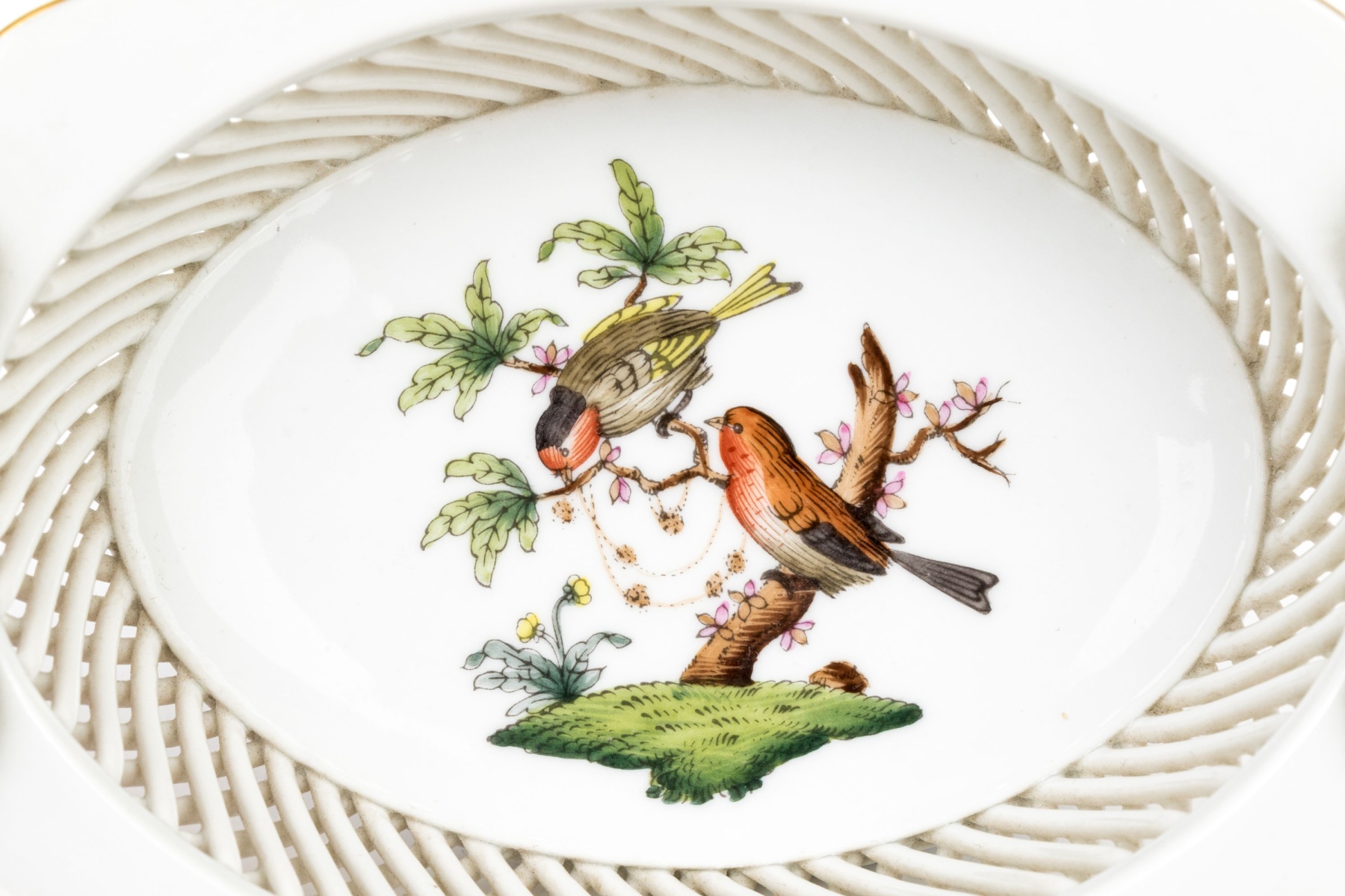 A hand-painted Herend oval reticulated bowl in the Rothschild Bird pattern. The center features a pair of vividly detailed birds perched on a leafy branch with a gold and pearl necklace with a fluttering butterfly above - symbolic of love and prosperity. The pierced latticework sides are bordered by a called rim adorned with hand-applied flower and leaf accents in pastel hues. The underside bears the Herend Hungary blue shield and crossed paintbrush mark, inscribed Handpainted and numbered 7379/RO.