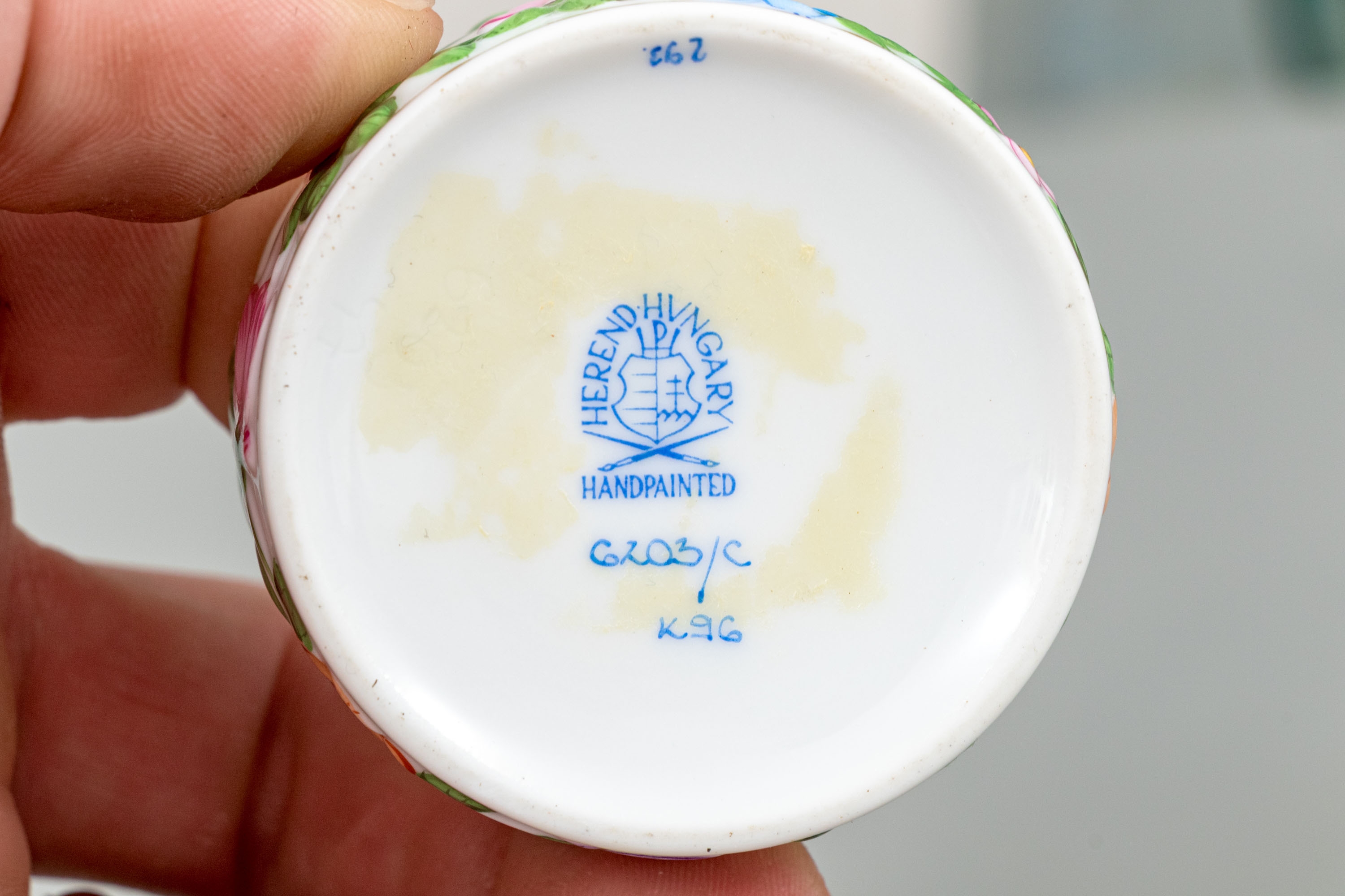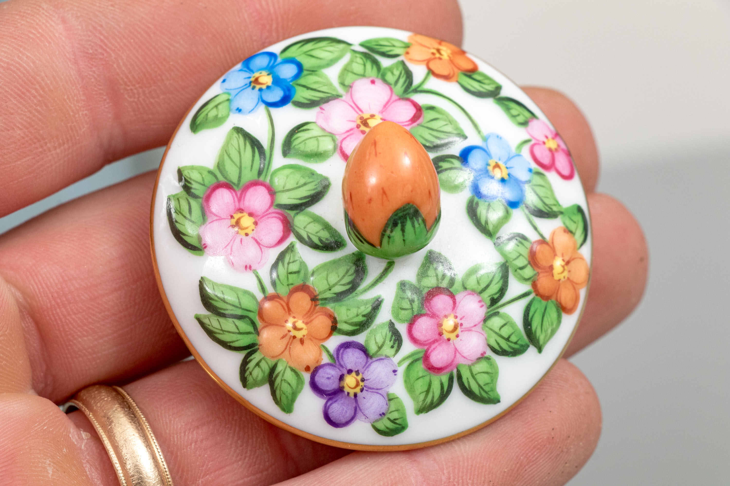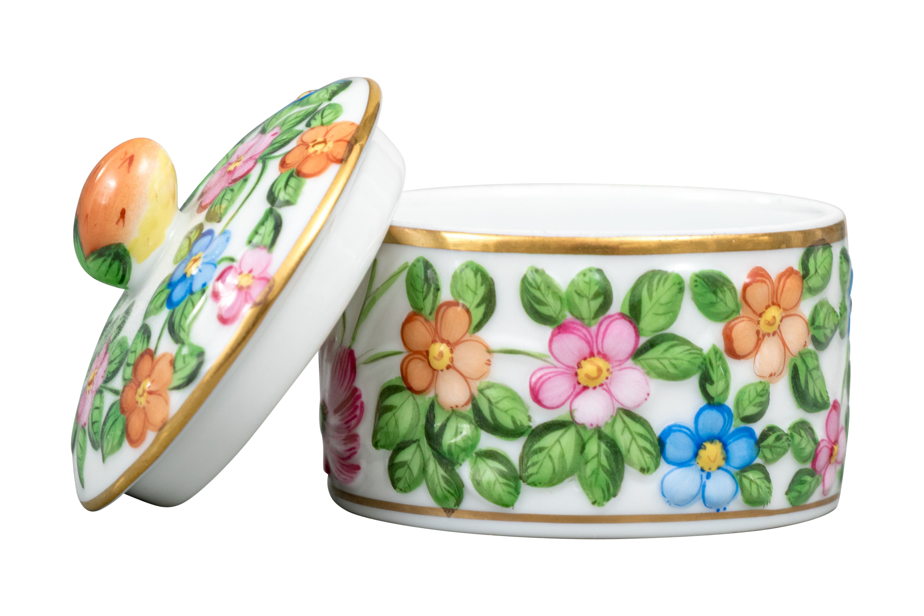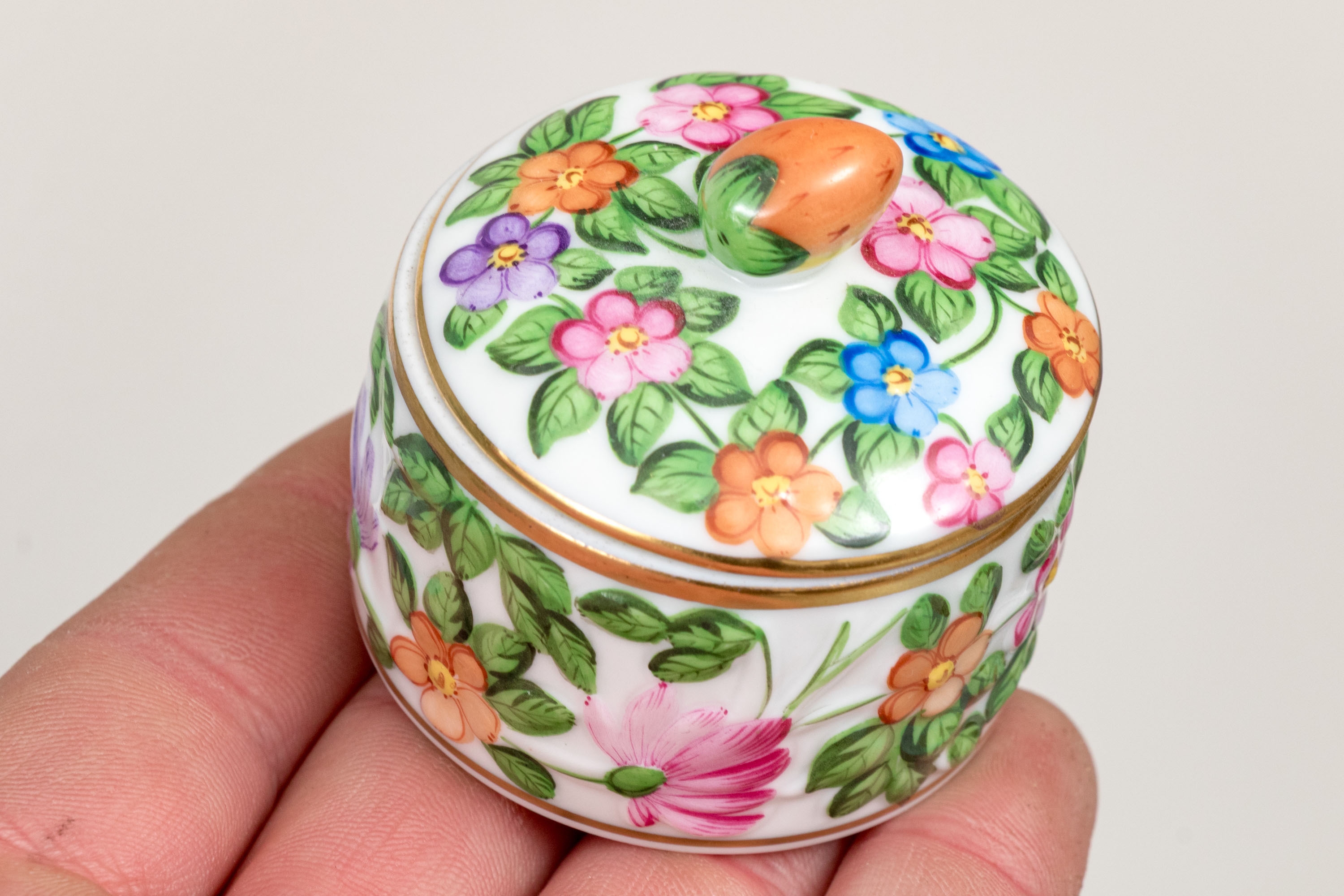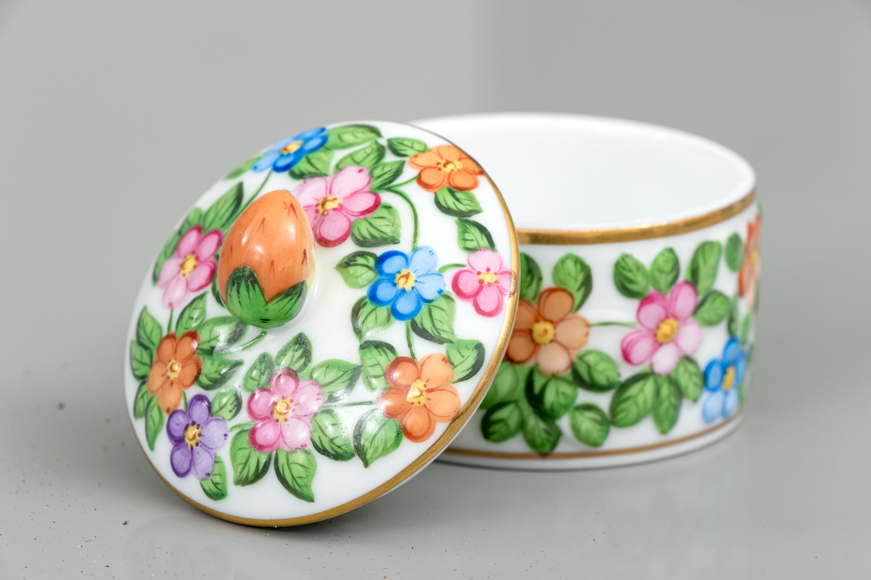 Herend Hungary hand-painted porcelain covered box, finely decorated in a vibrant array of multi-colored flowers and lush green foliage encircling the entire piece. The delicate blossoms in shades of pink, blue, orange, and purple are accented with precise hand-applied details and trimmed with 24K gold edging. The lid is topped with a petite strawberry finial. Marked on the underside with the Herend Hungary blue shield and crossed paintbrush mark, inscribed Handpainted and numbered 603/C, with painter’s initials and date code K96.