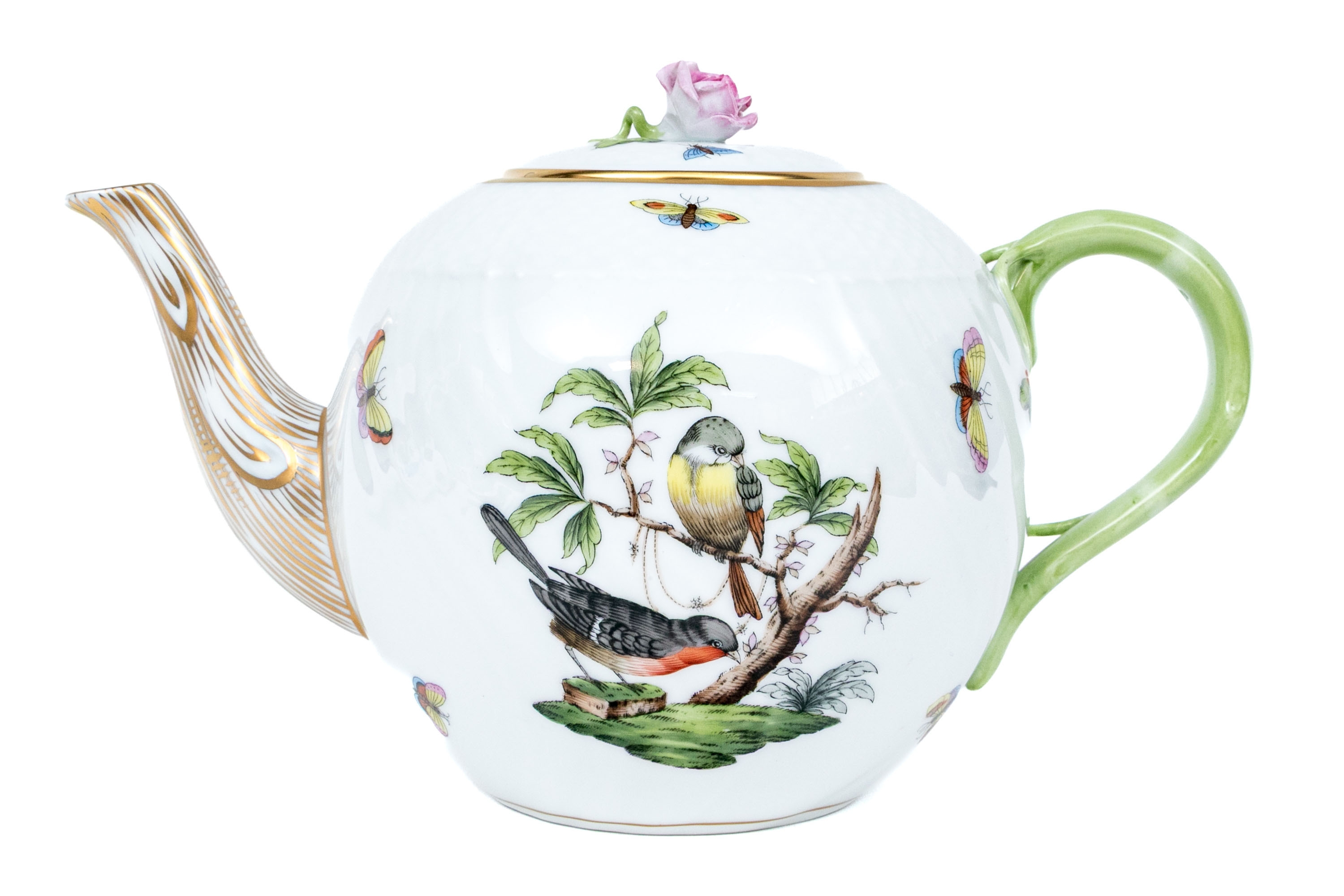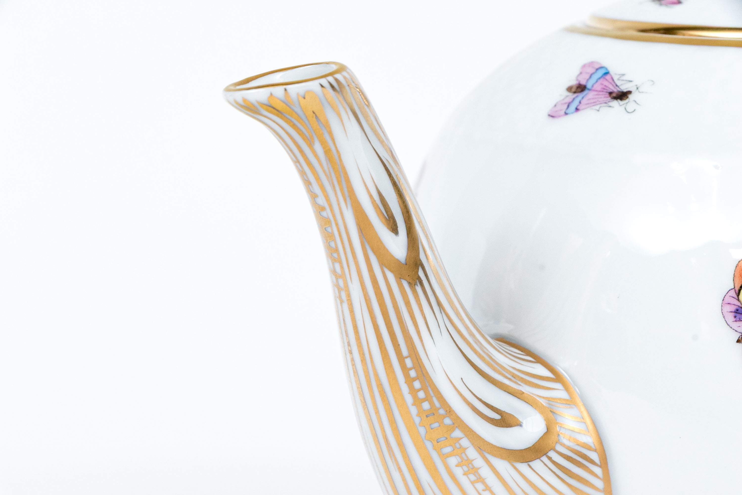 Herend Hungary hand-painted porcelain teapot in the Rothschild Bird (RO) pattern, decorated with vibrant avian and insect motifs and enriched with 24K gold accents. The bulbous white porcelain body is adorned with the famous Rothschild Bird design, depicting pairs of colorful songbirds perched on leafy branches with necklace. Surrounding them are delicate butterflies, beetles, and dragonflies, all rendered in vivid enamel hues and fine detail.
