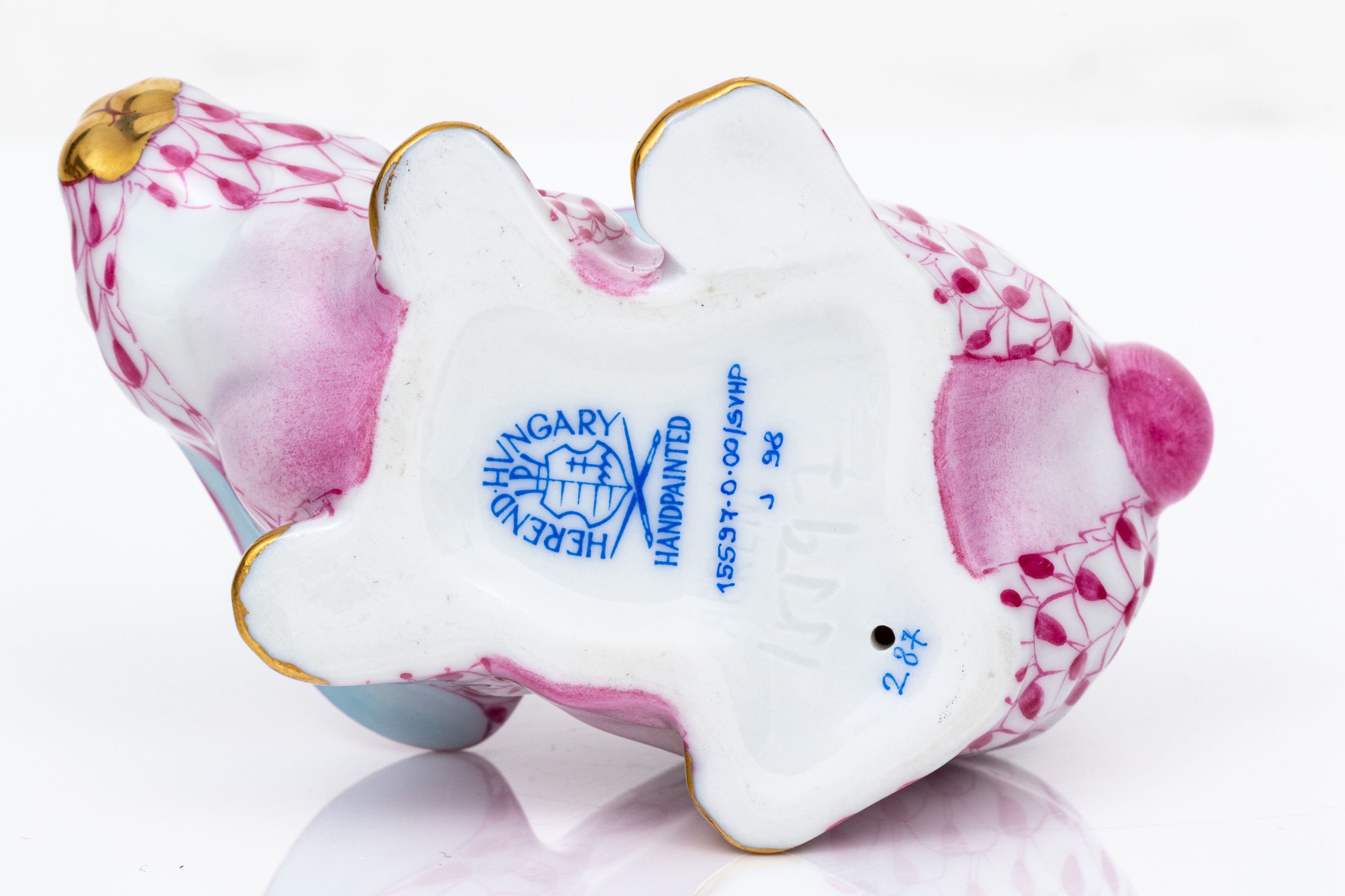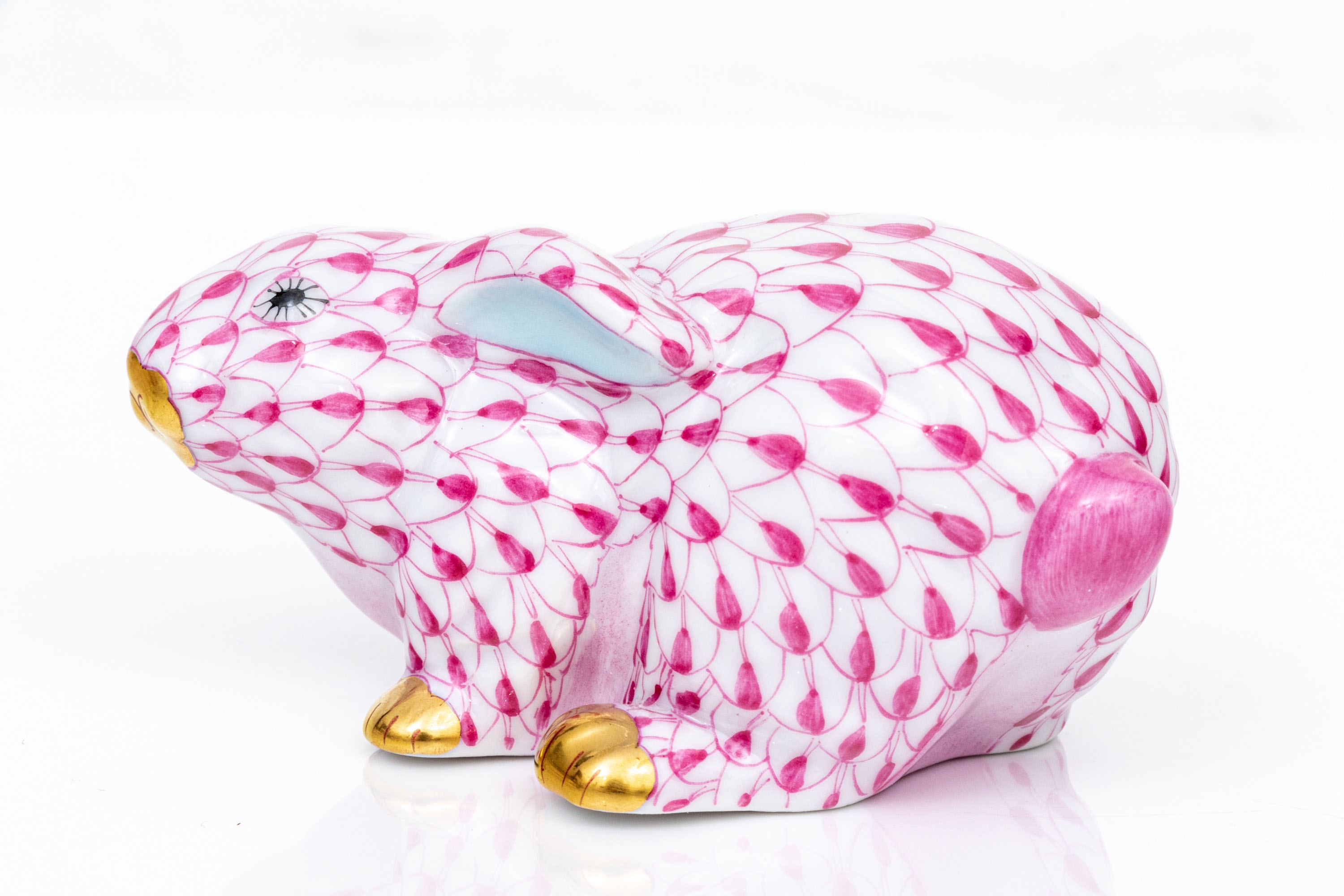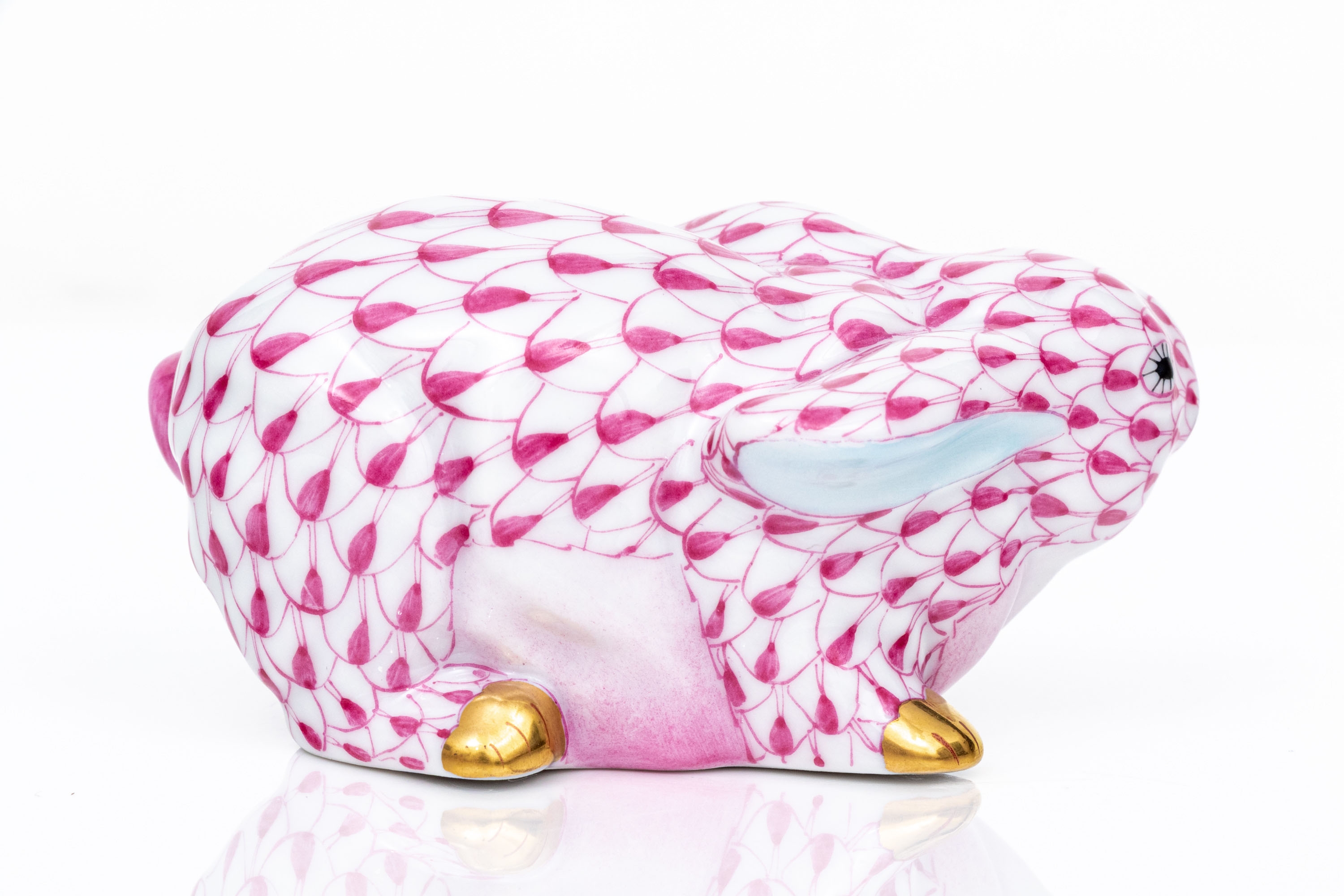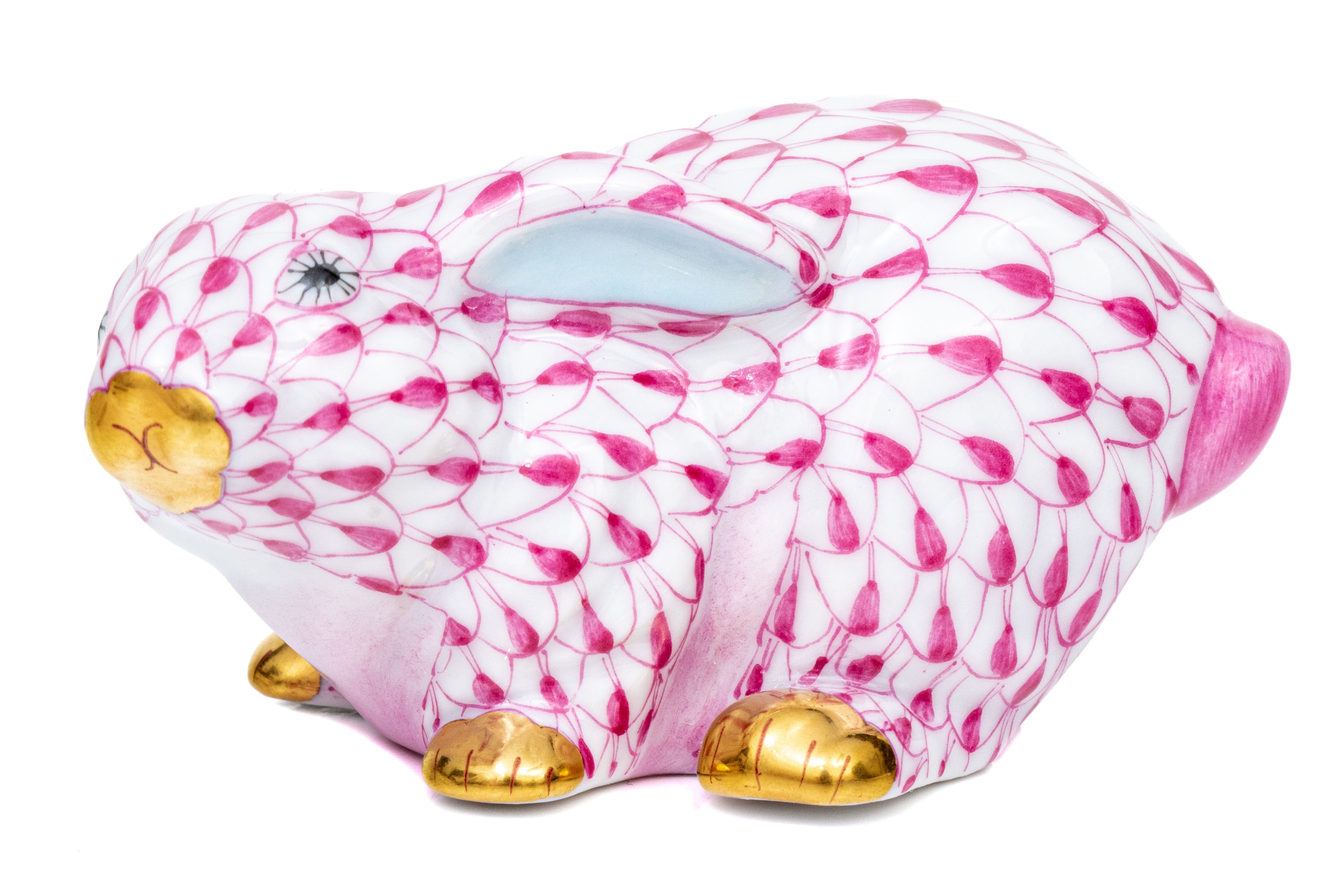 Hand-painted Herend porcelain figure depicting a crouching bunny finished in the raspberry fishnet pattern with 24K gold accents to the paws and nose. The inner ears have a subtle soft blue color detail and his tail is solid pink.