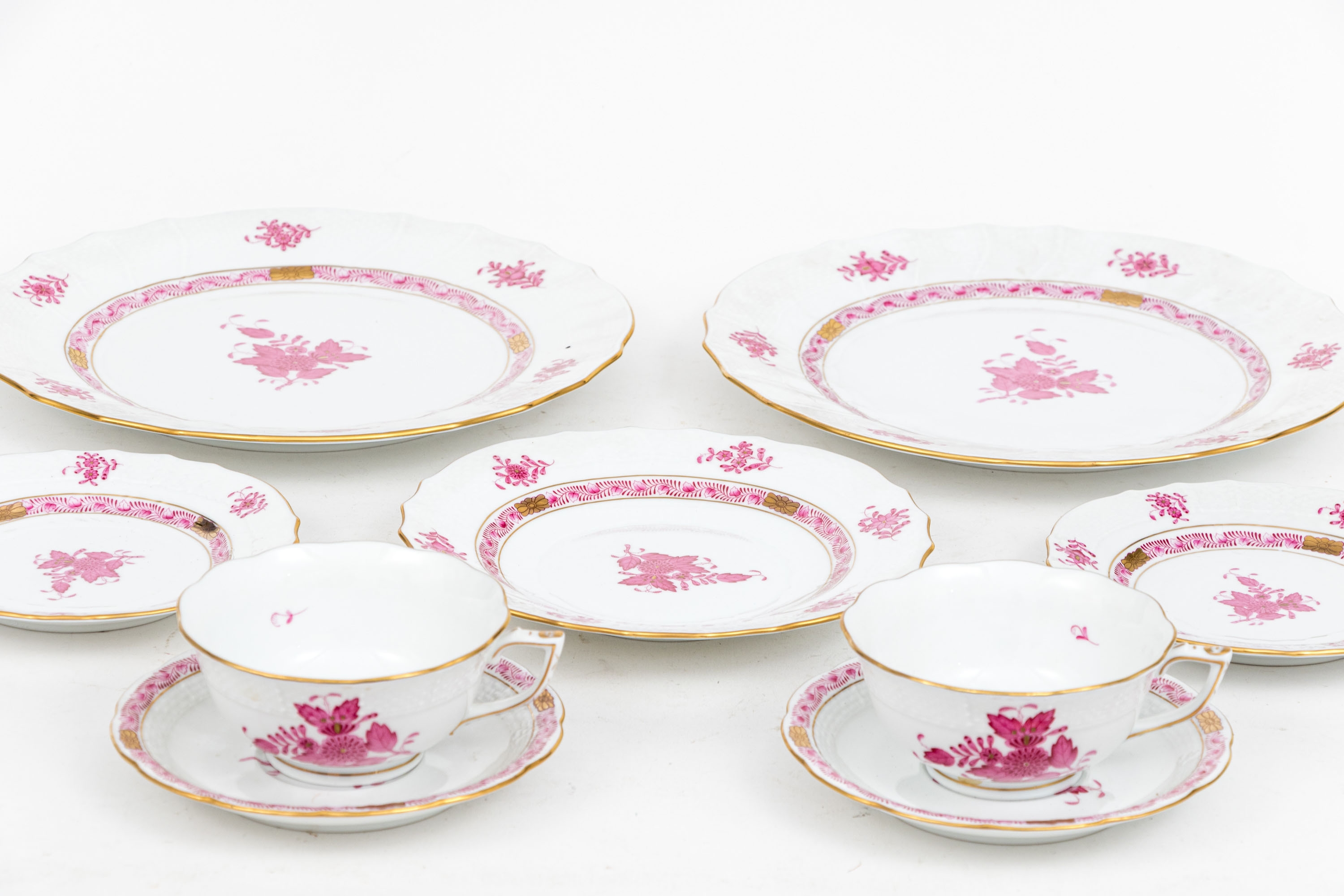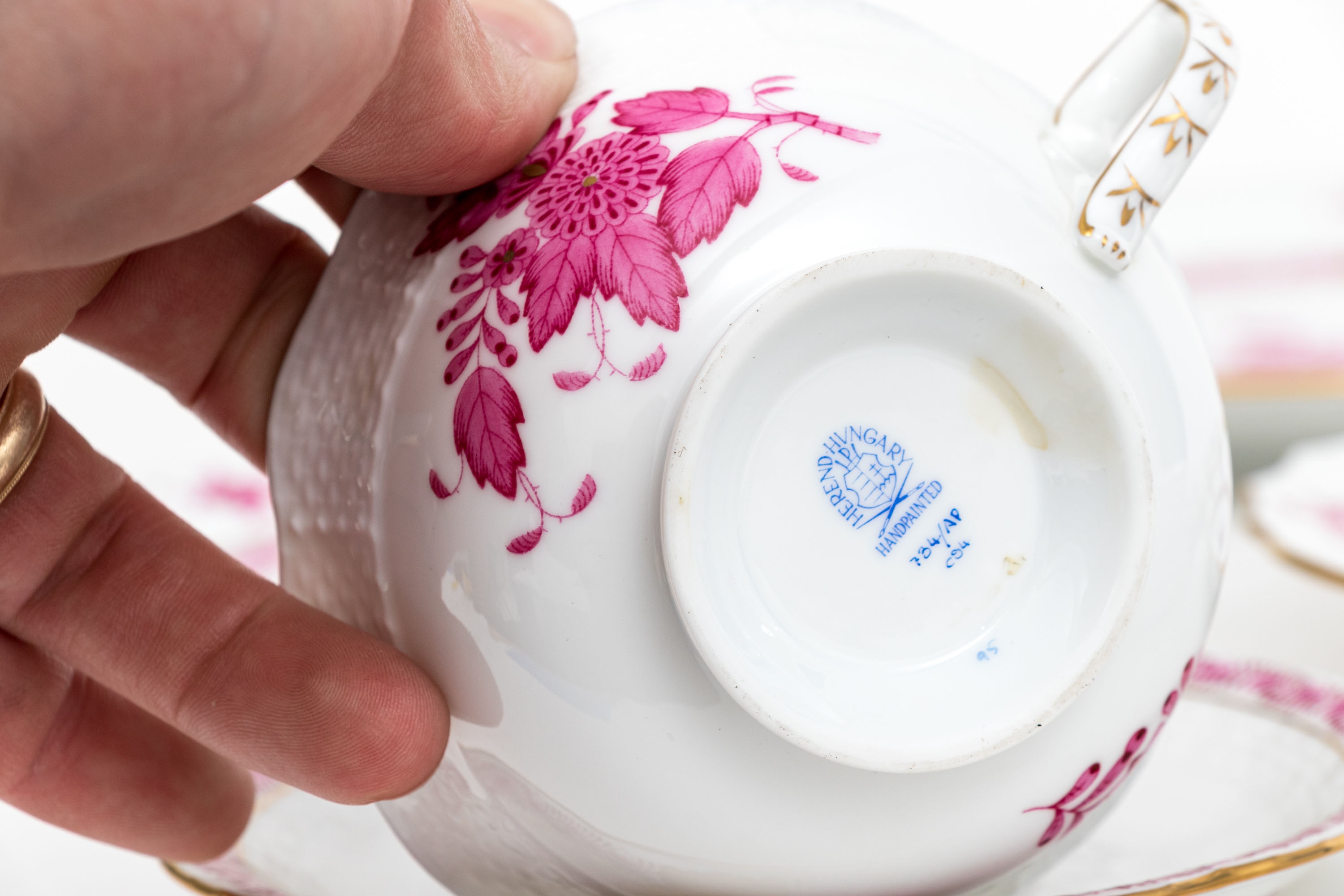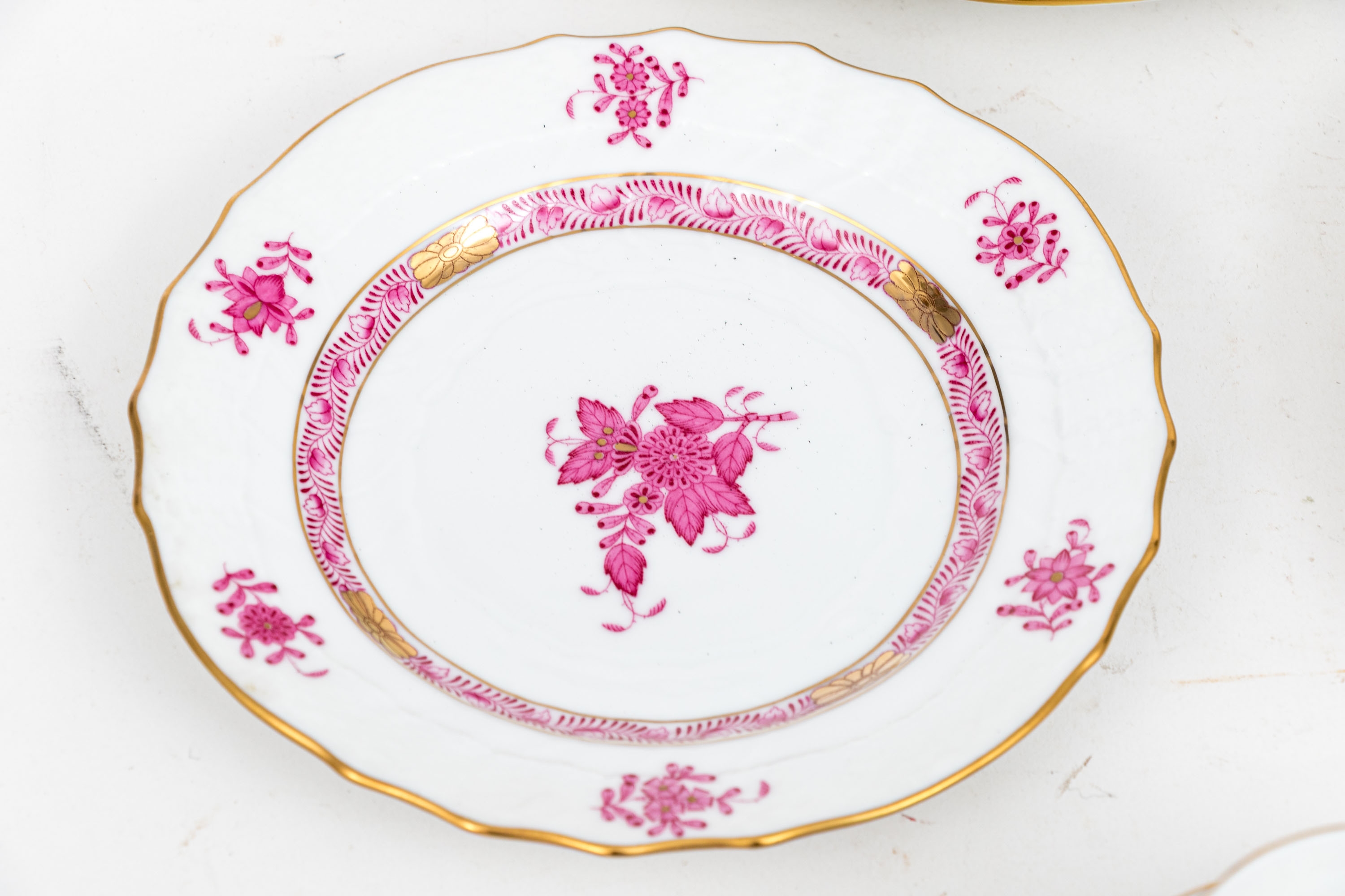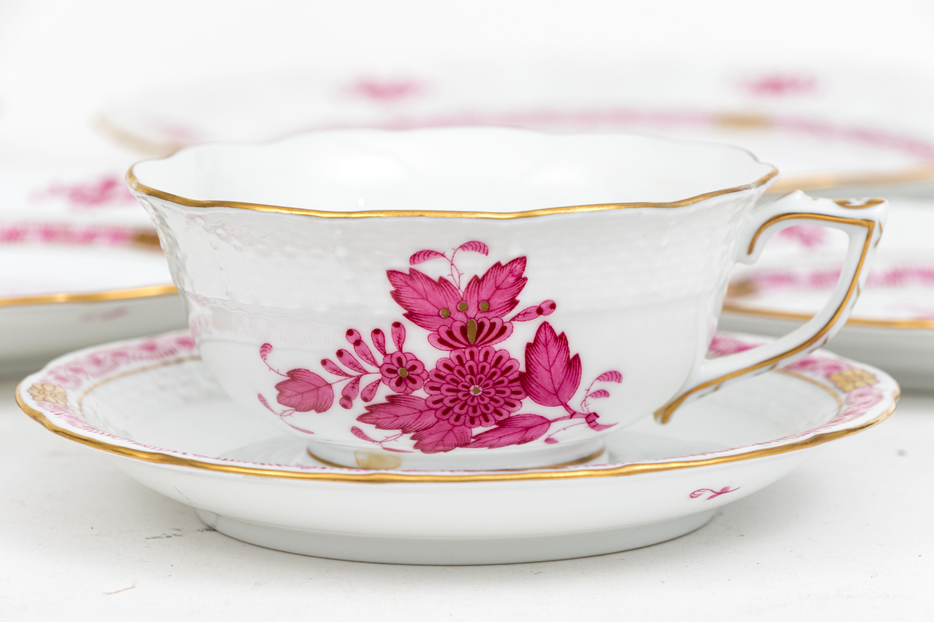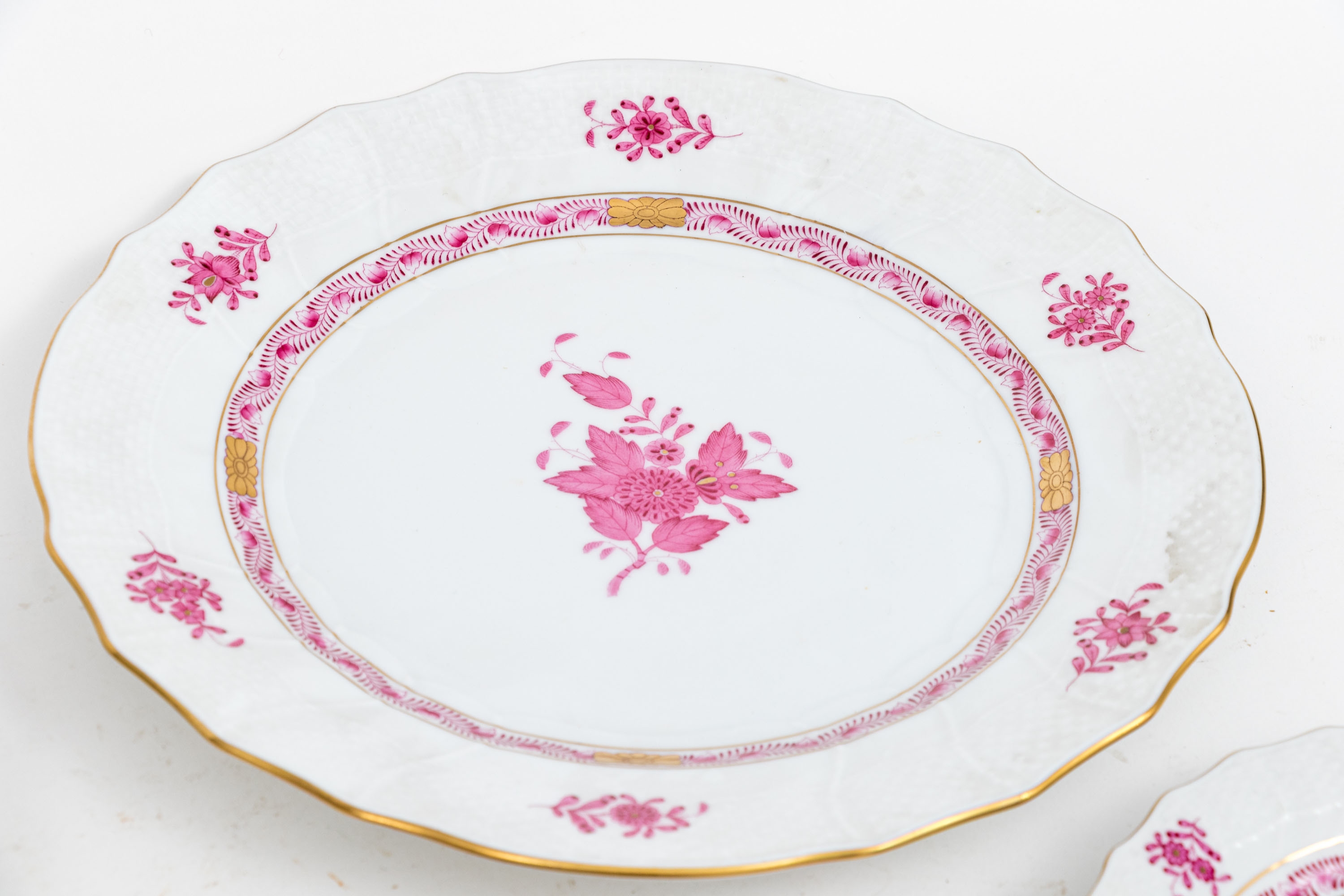 A collection of Herend "Chinese Bouquet Raspberry" porcelain designed with elegantly scalloped and gilt rims with subtle woven textures, decorated throughout with pretty monochromatic pink floral sprays with gilt floral accents. Marked underfoot.