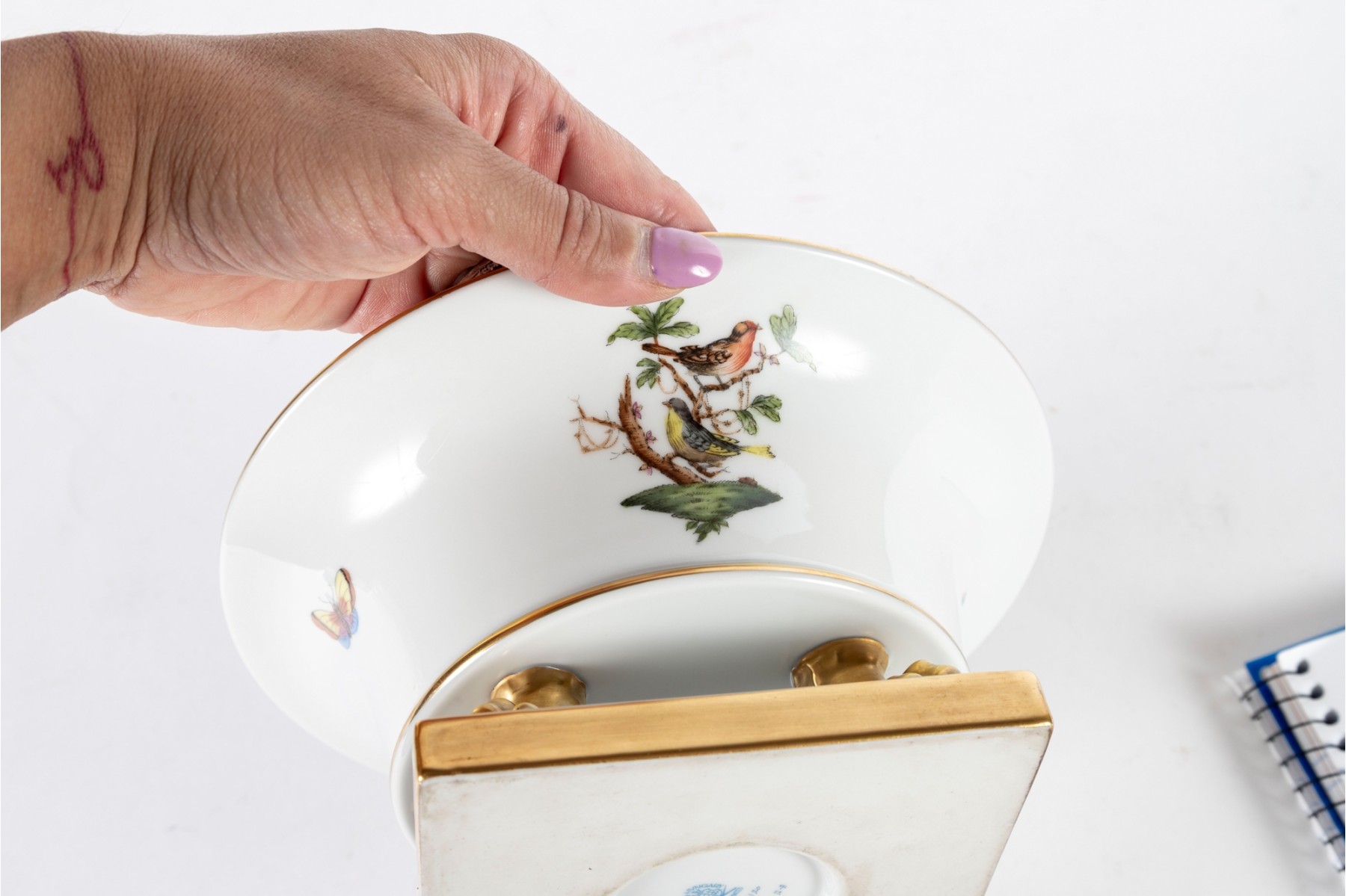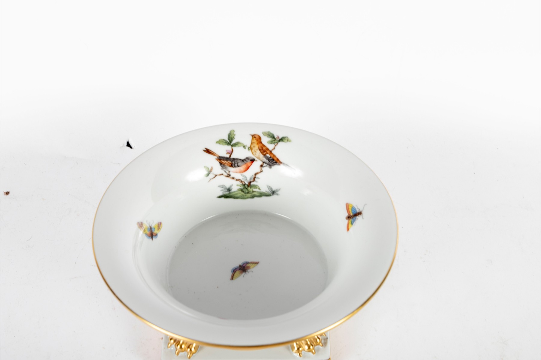 An elegant Herend-Hungary small porcelain footed bowl, featuring the classic Rothschild Bird pattern with hand-painted songbirds perched among branches, surrounded by butterflies and insects.