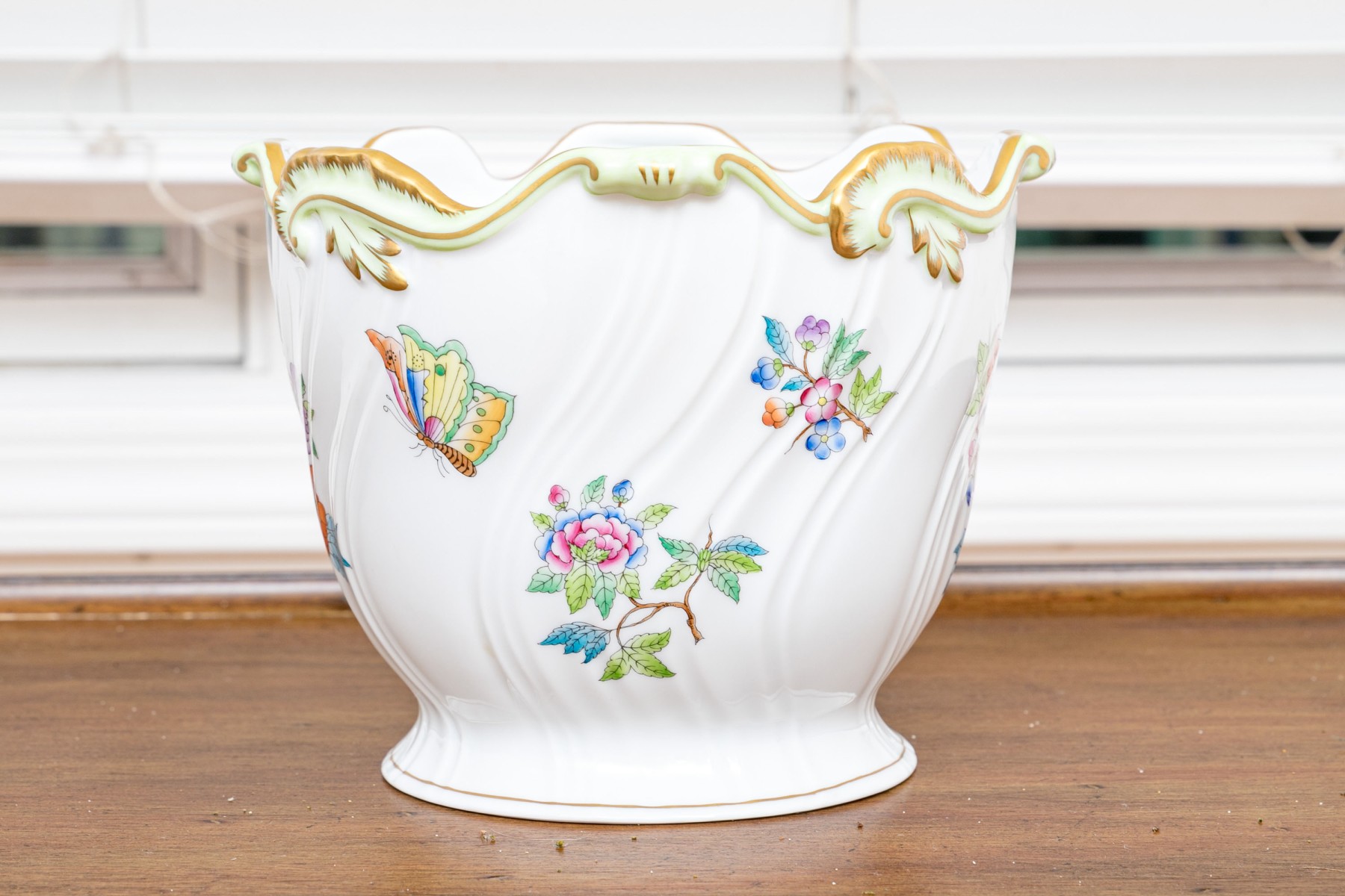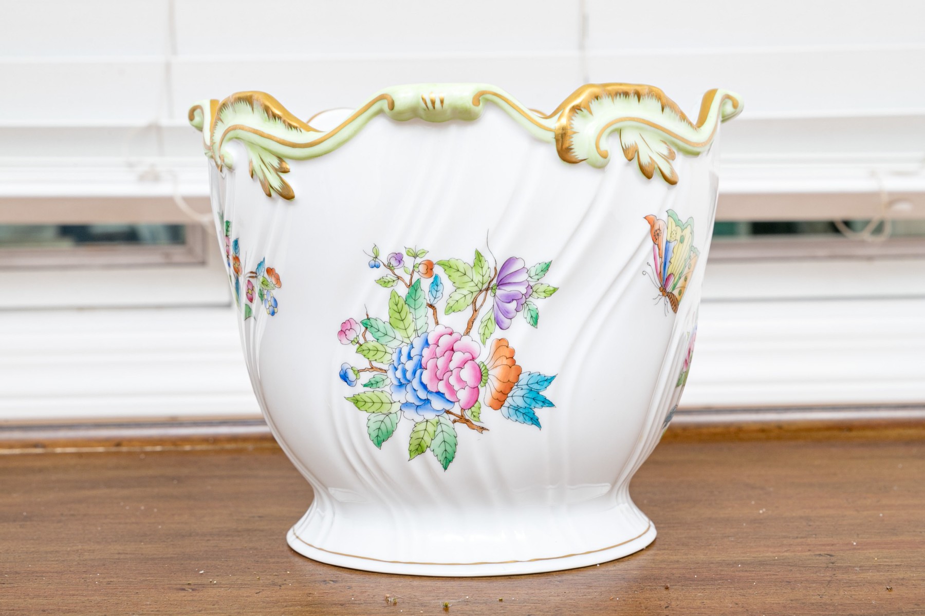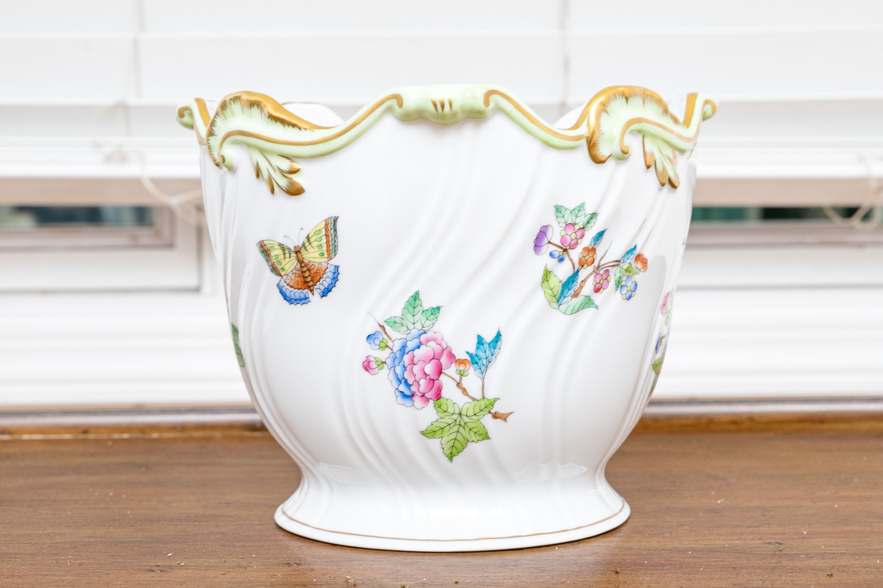 Herend fine porcelain cachepot with florals, butterflies, green foliate border with lavish gold trim. Footed with swirled form. Queen Victoria pattern #7227.