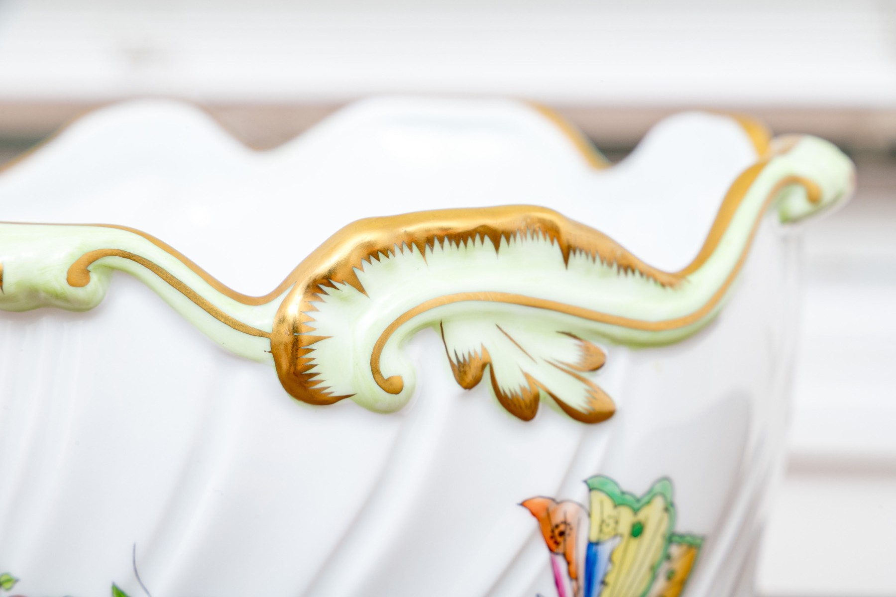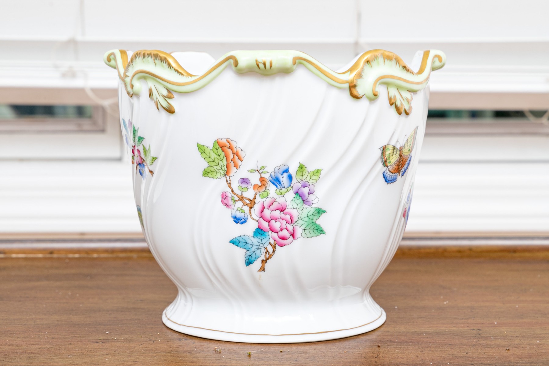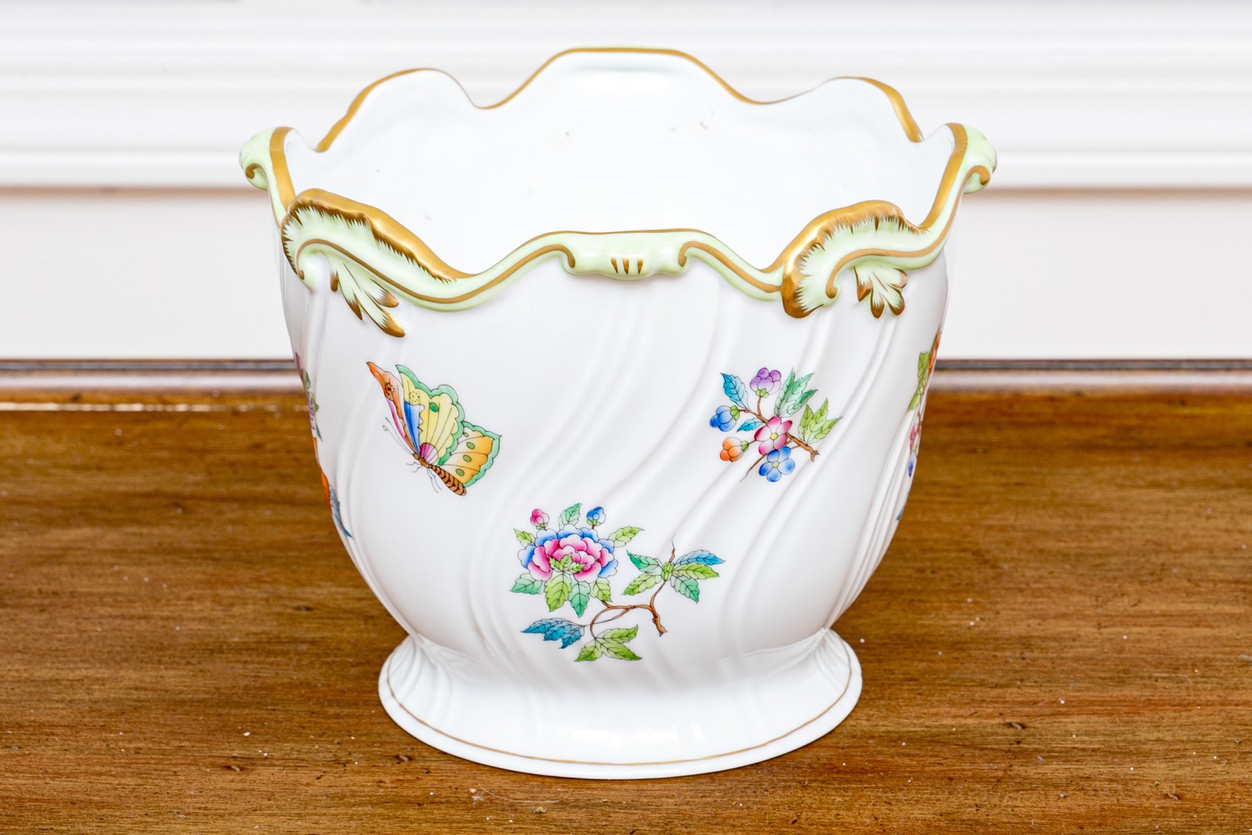 Herend fine porcelain cachepot with florals, butterflies, green foliate border with lavish gold trim. Footed with swirled form. Queen Victoria pattern #7227.