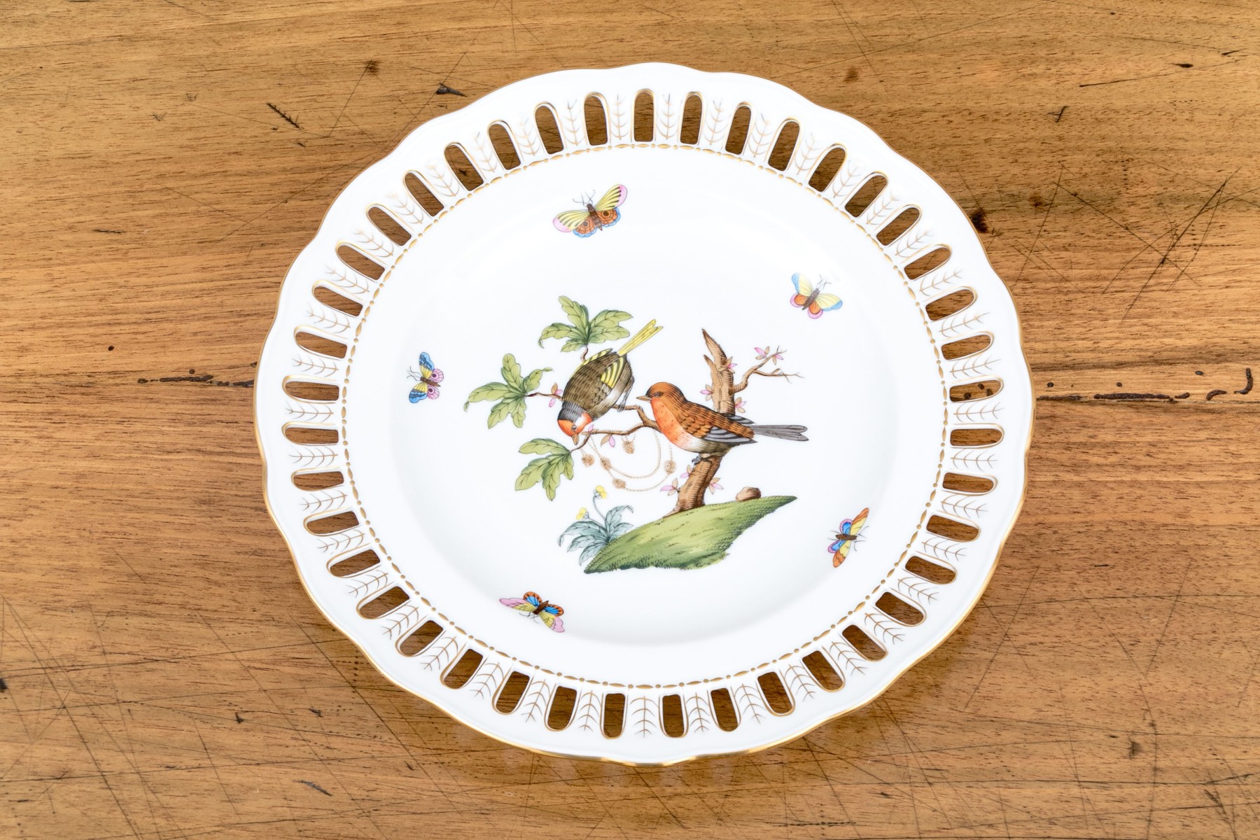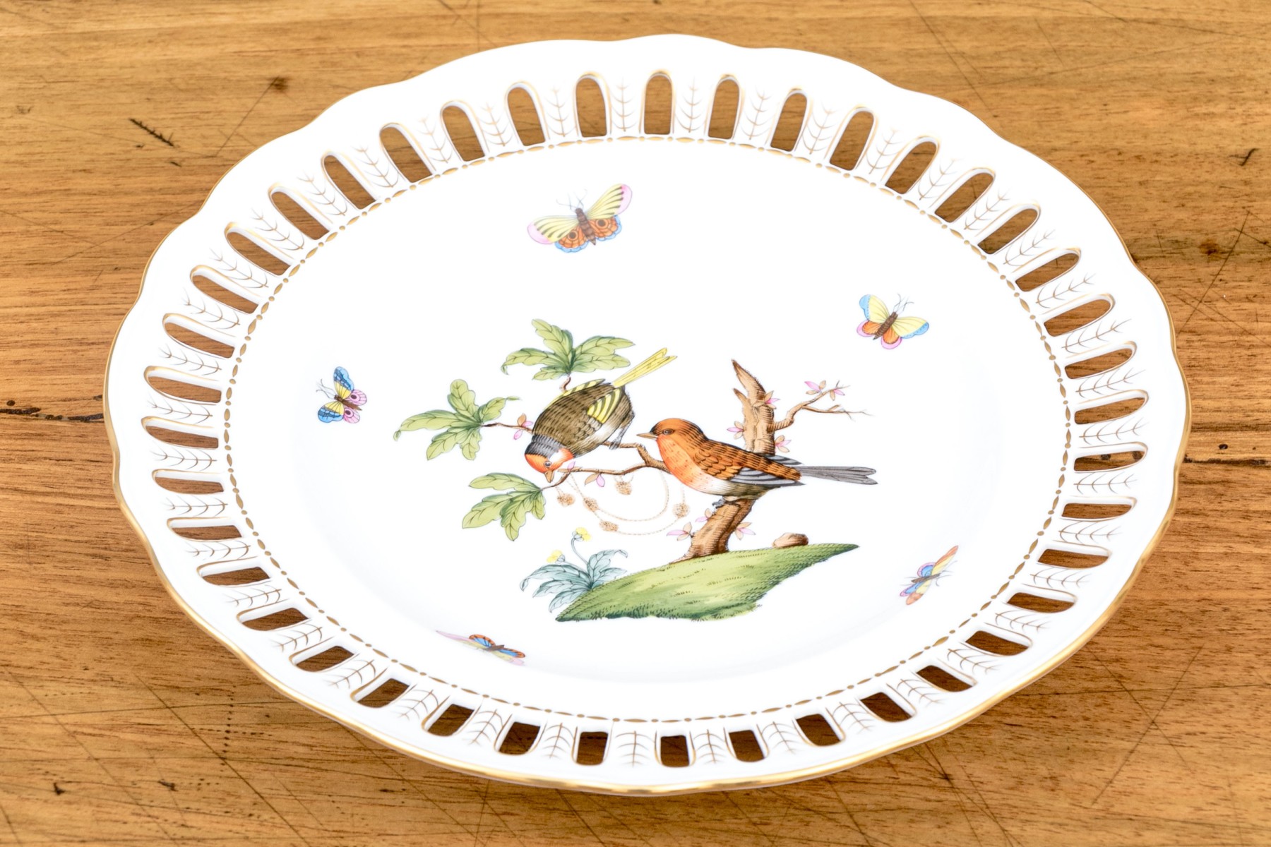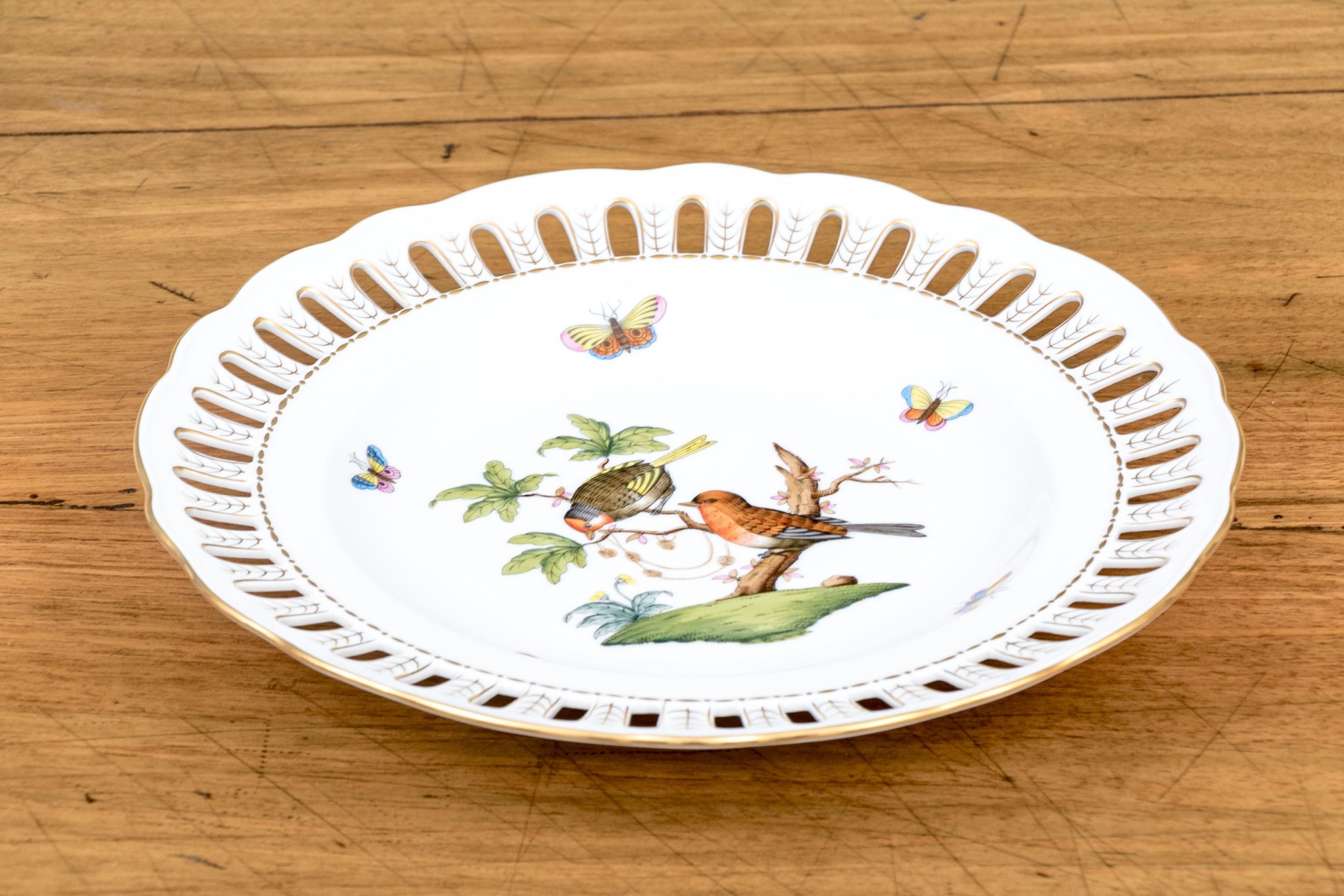 Herend porcelain plate with pierced border, scalloped rim, gold trim. The plate decorated with birds and butterflies. Marked on verso. Holes on back for hanger.