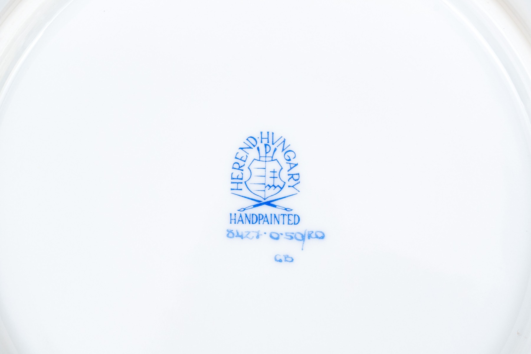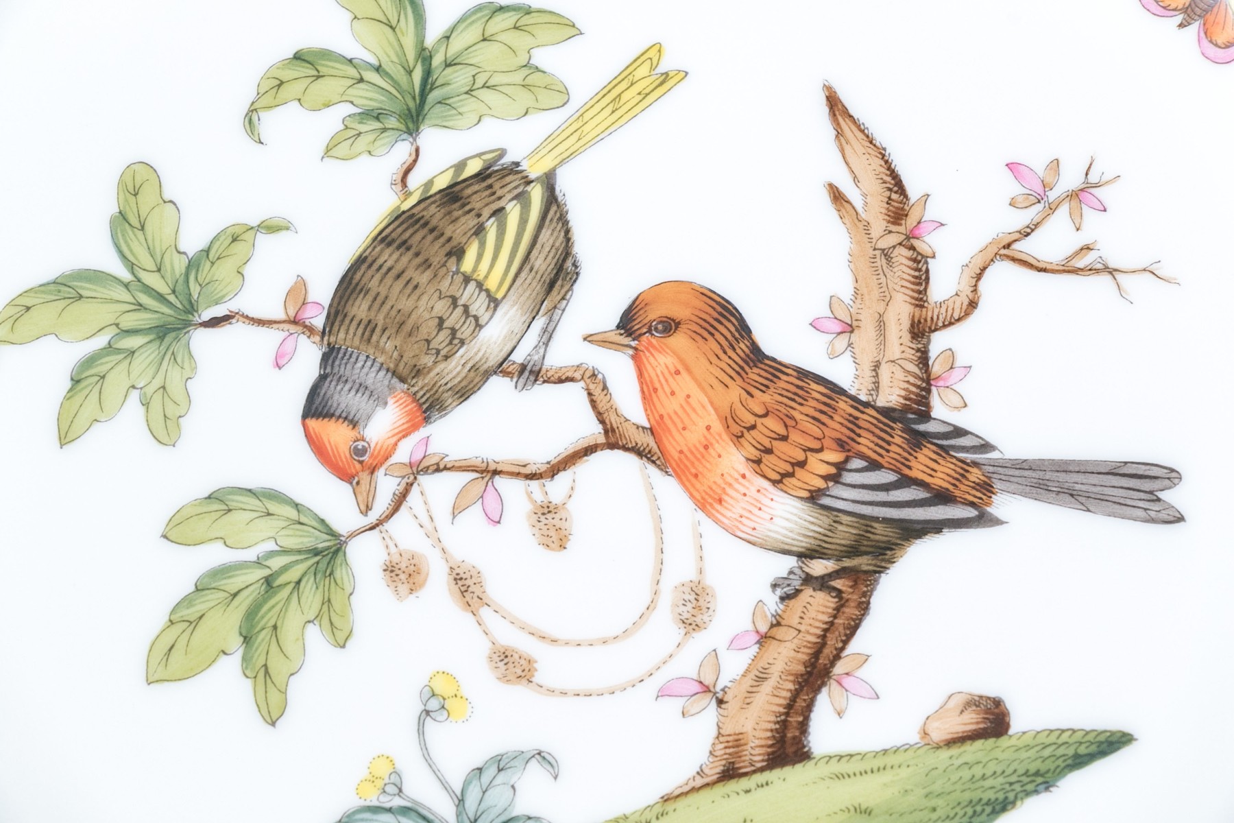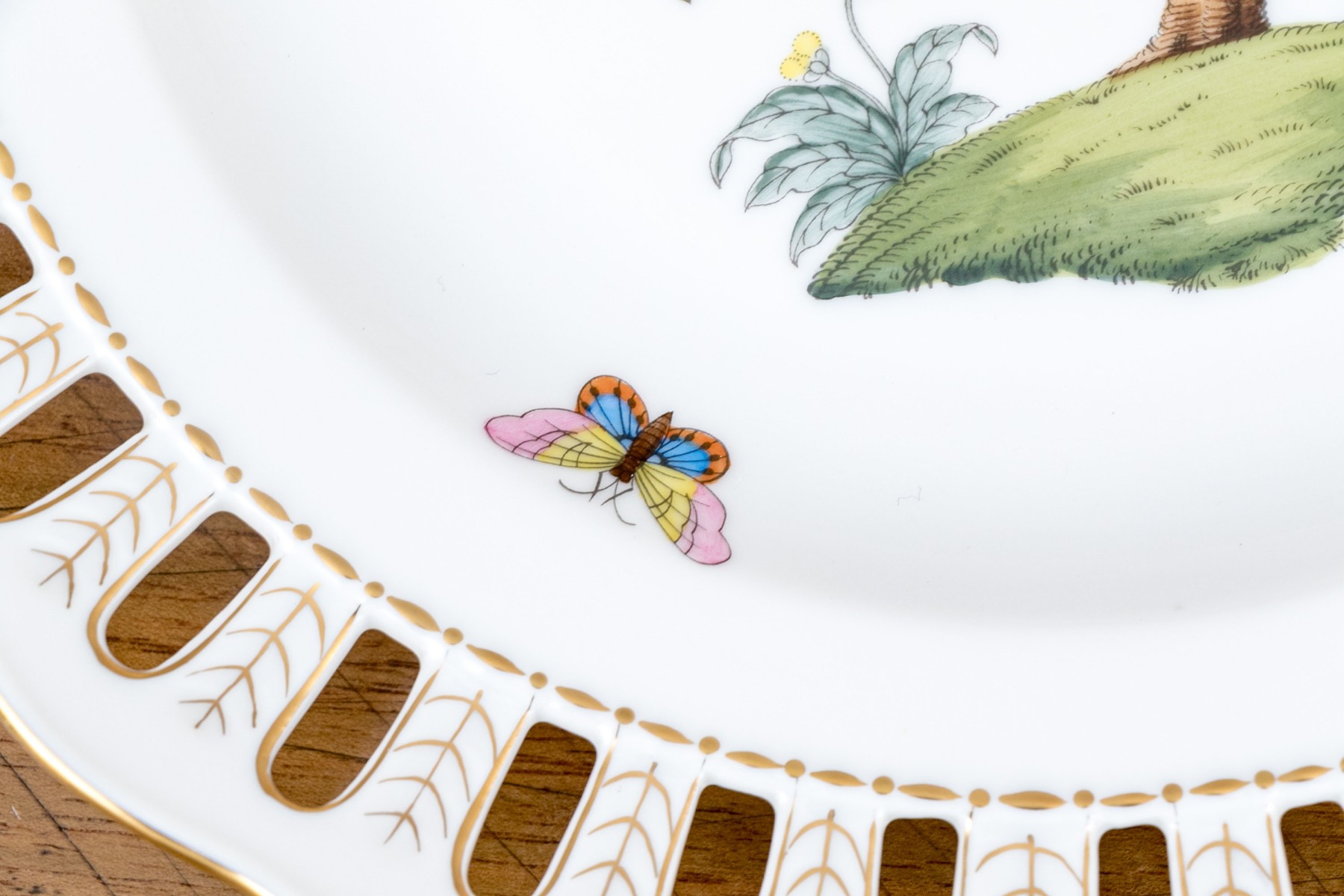 Herend porcelain plate with pierced border, scalloped rim, gold trim. The plate decorated with birds and butterflies. Marked on verso. Holes on back for hanger.