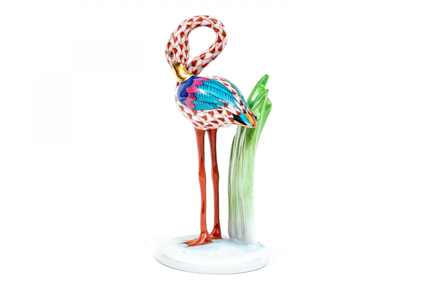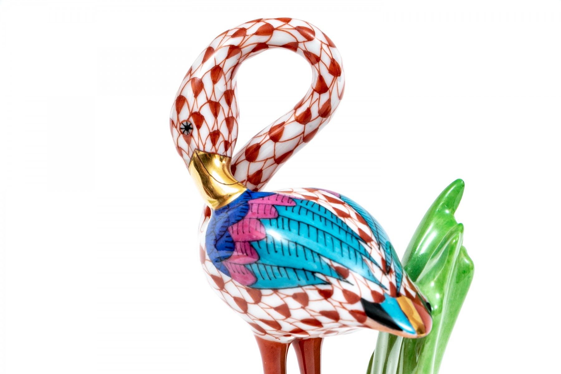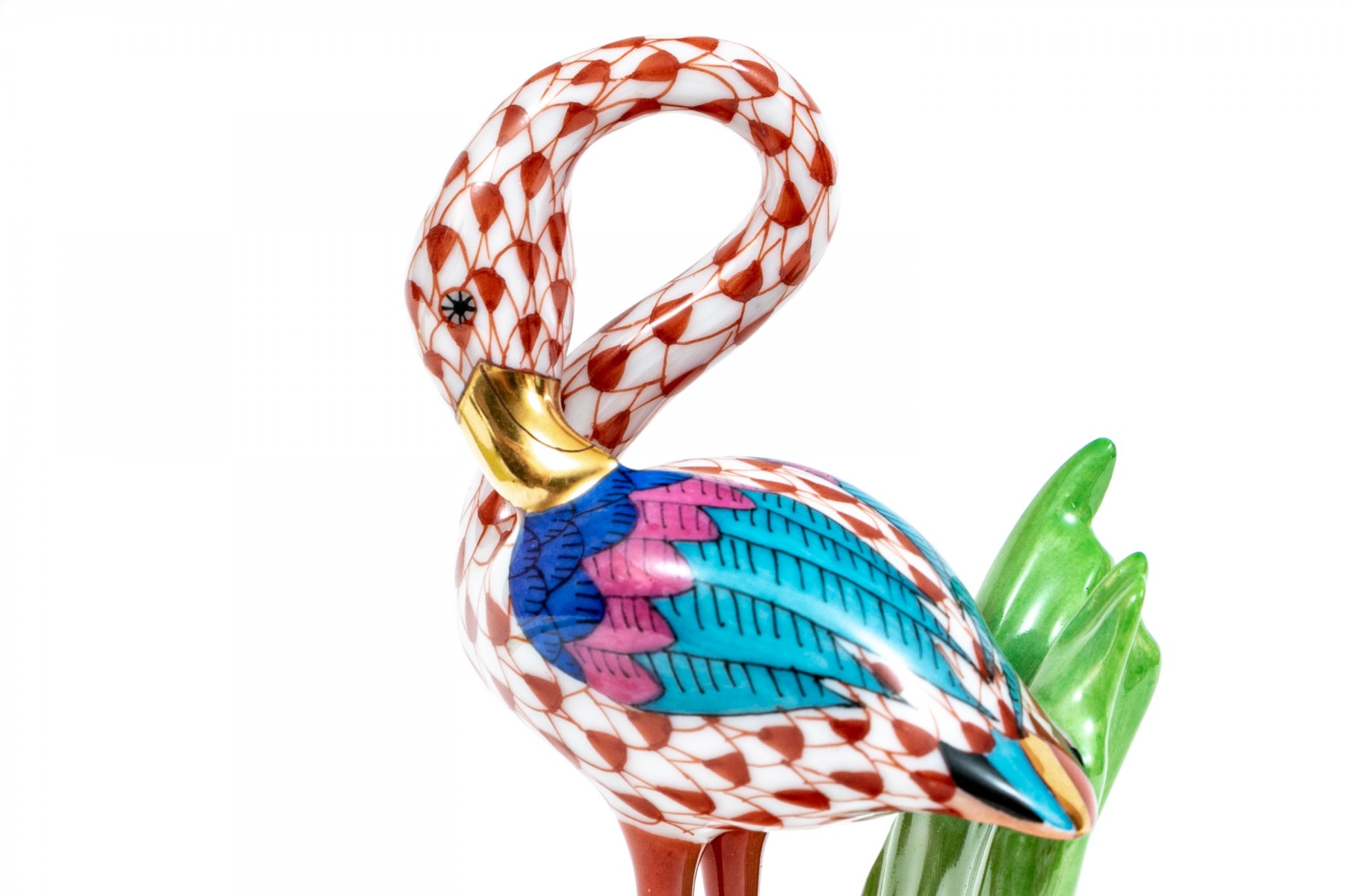 Herend rust fishnet Little Flamingo figurine with multi-color accents and gold trim., #15523. Signed by Herend artist Balta Silira and dated 1998.