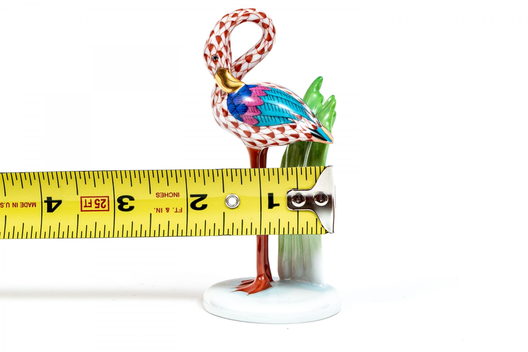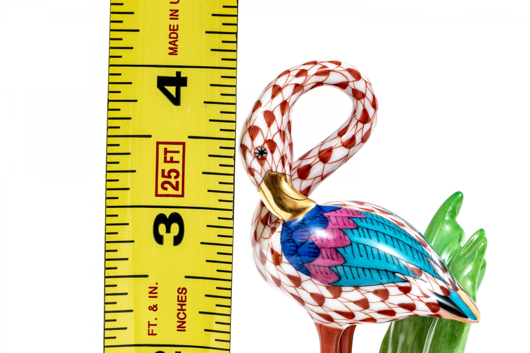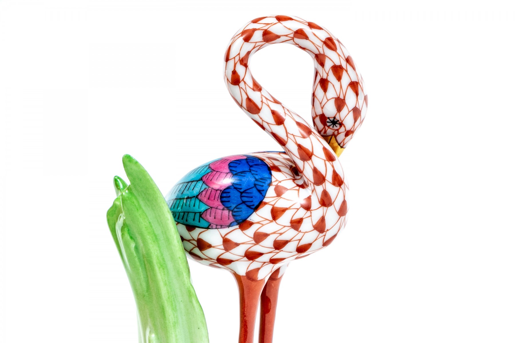Herend rust fishnet Little Flamingo figurine with multi-color accents and gold trim., #15523. Signed by Herend artist Balta Silira and dated 1998.