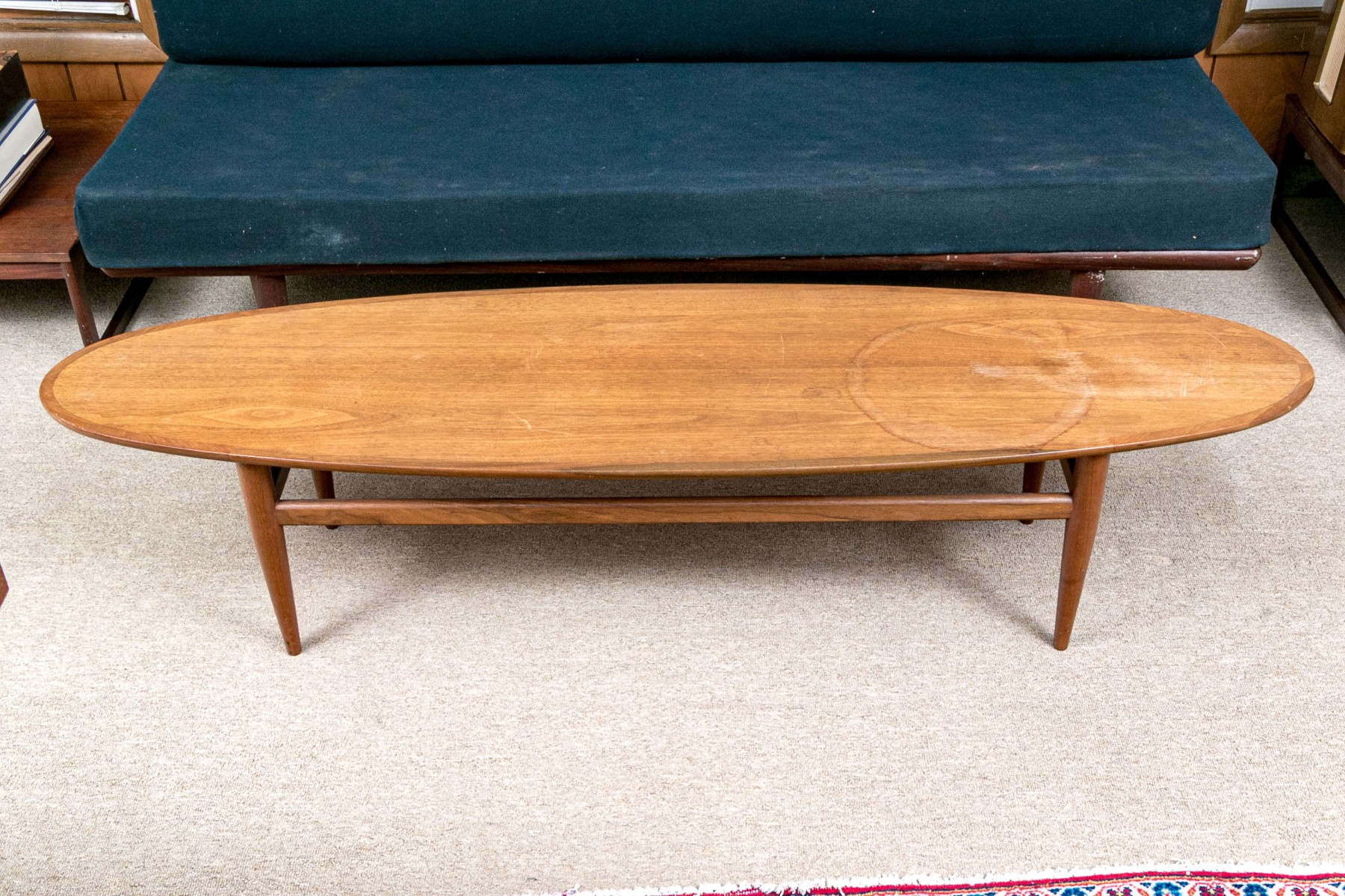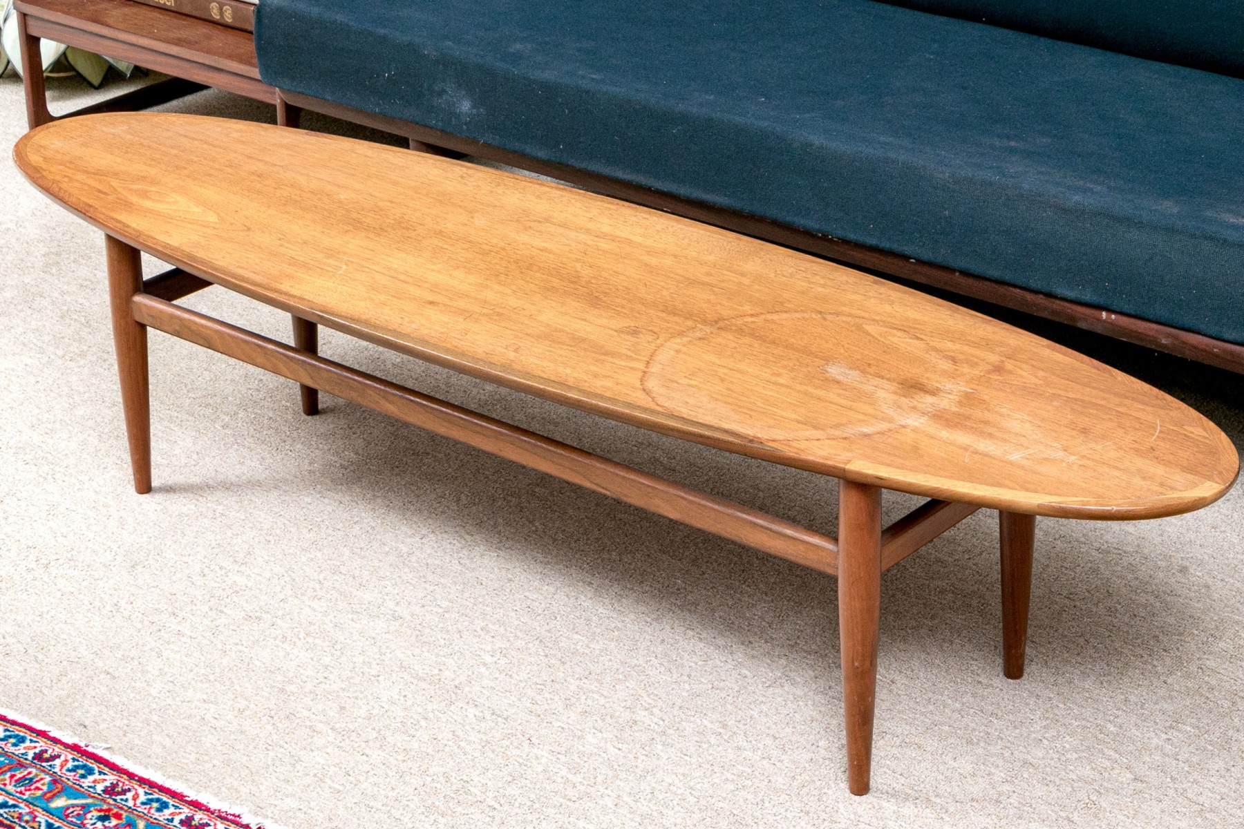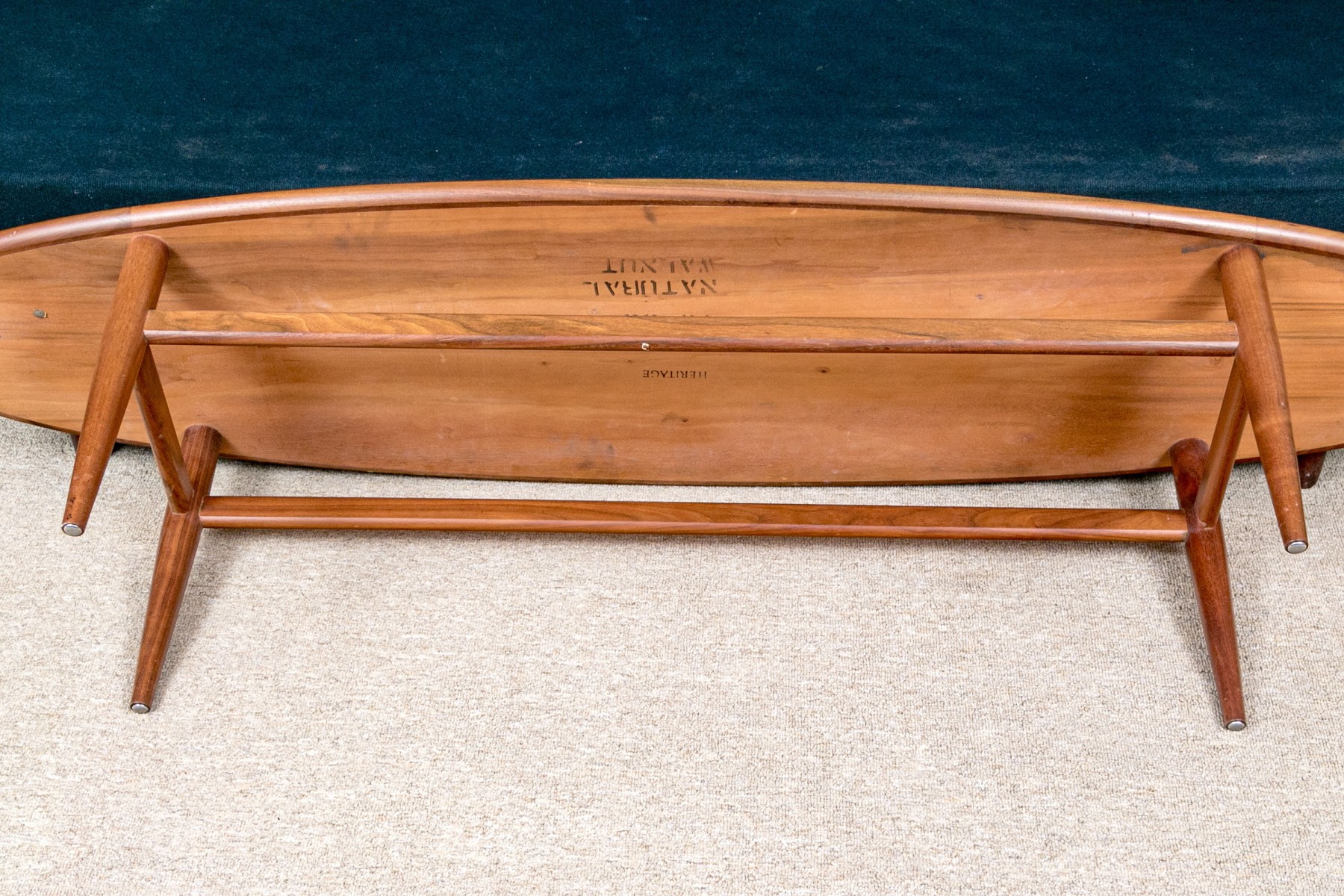 A wonderful Heritage Henredon mid-century coffee table in honeyed blonde walnut. Features a long surfboard top over tapered legs around a box stretcher.