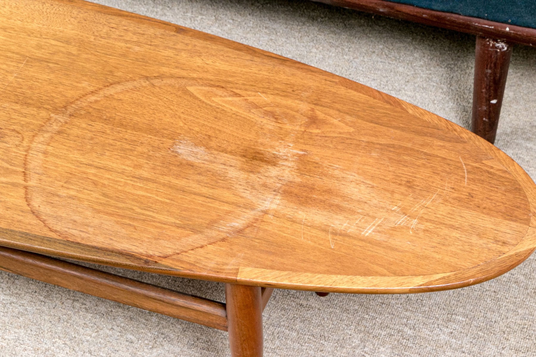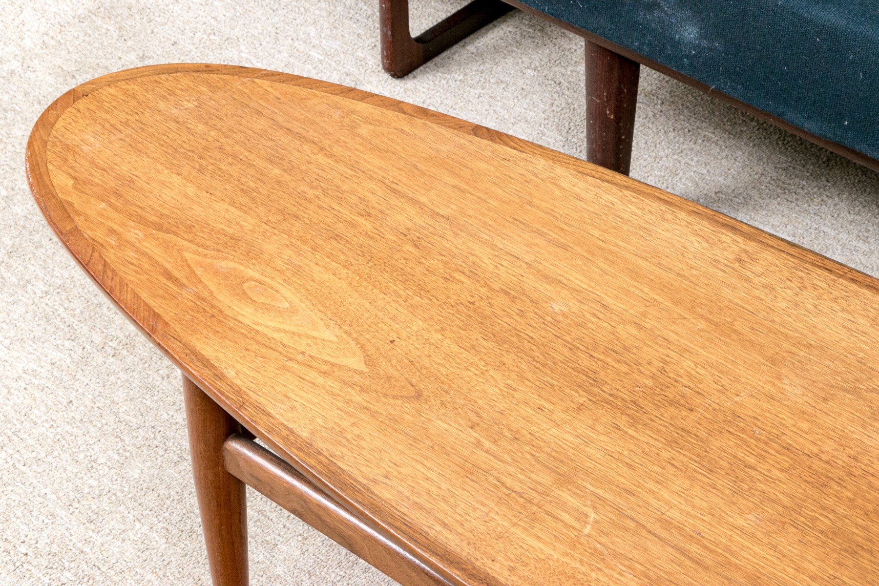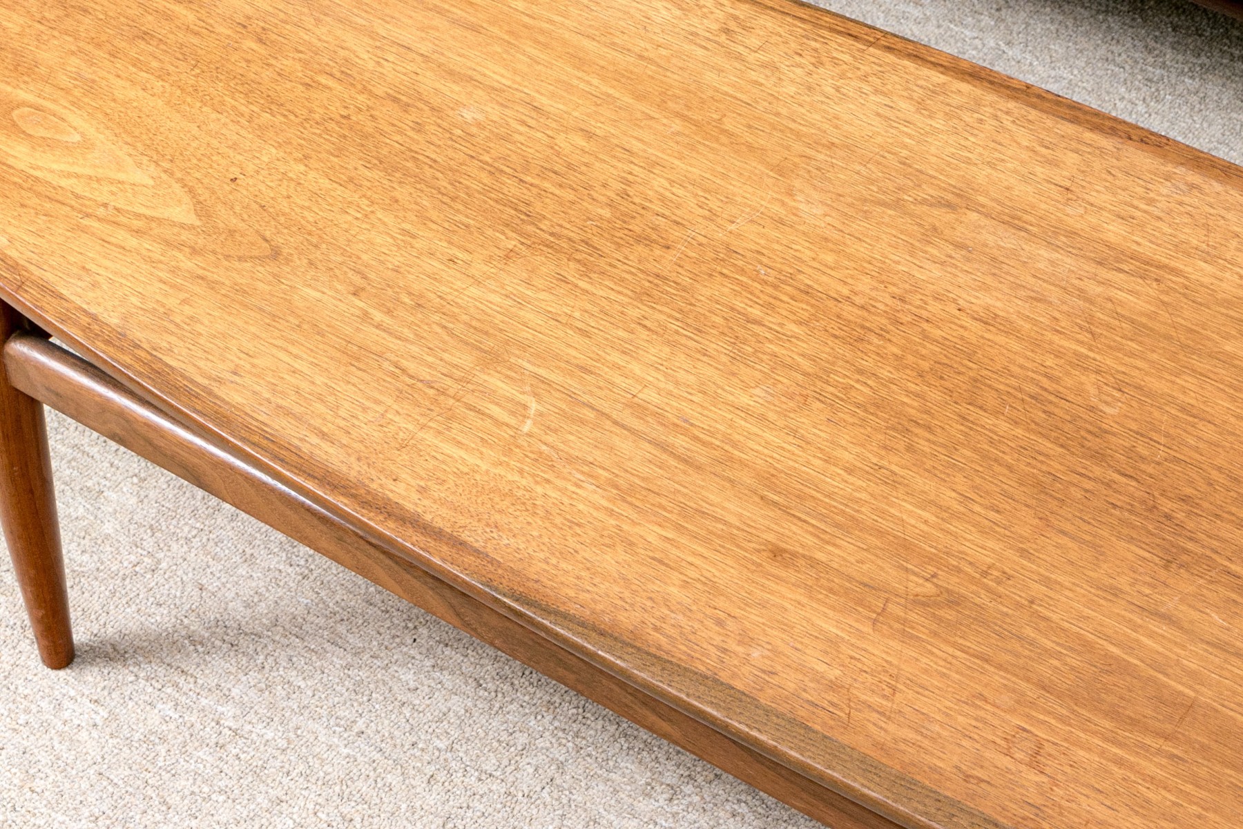 A wonderful Heritage Henredon mid-century coffee table in honeyed blonde walnut. Features a long surfboard top over tapered legs around a box stretcher.