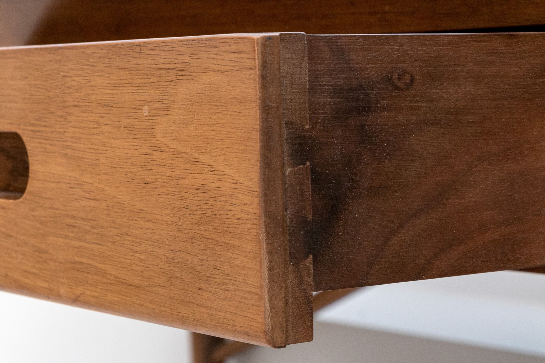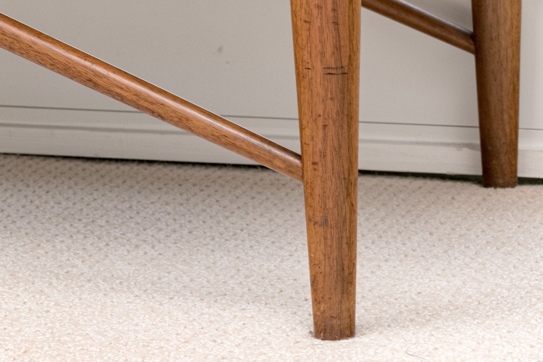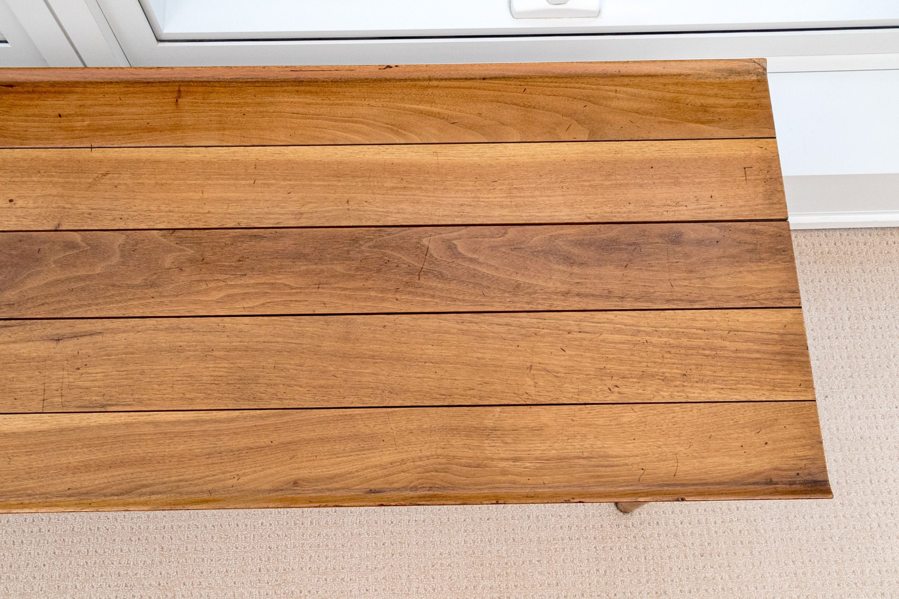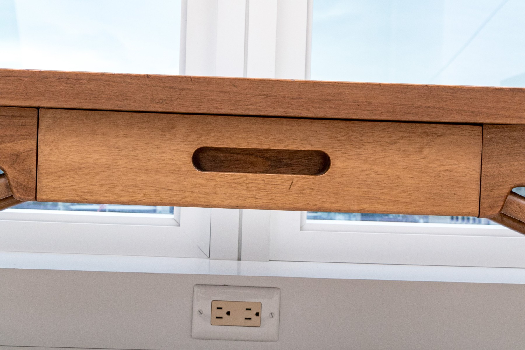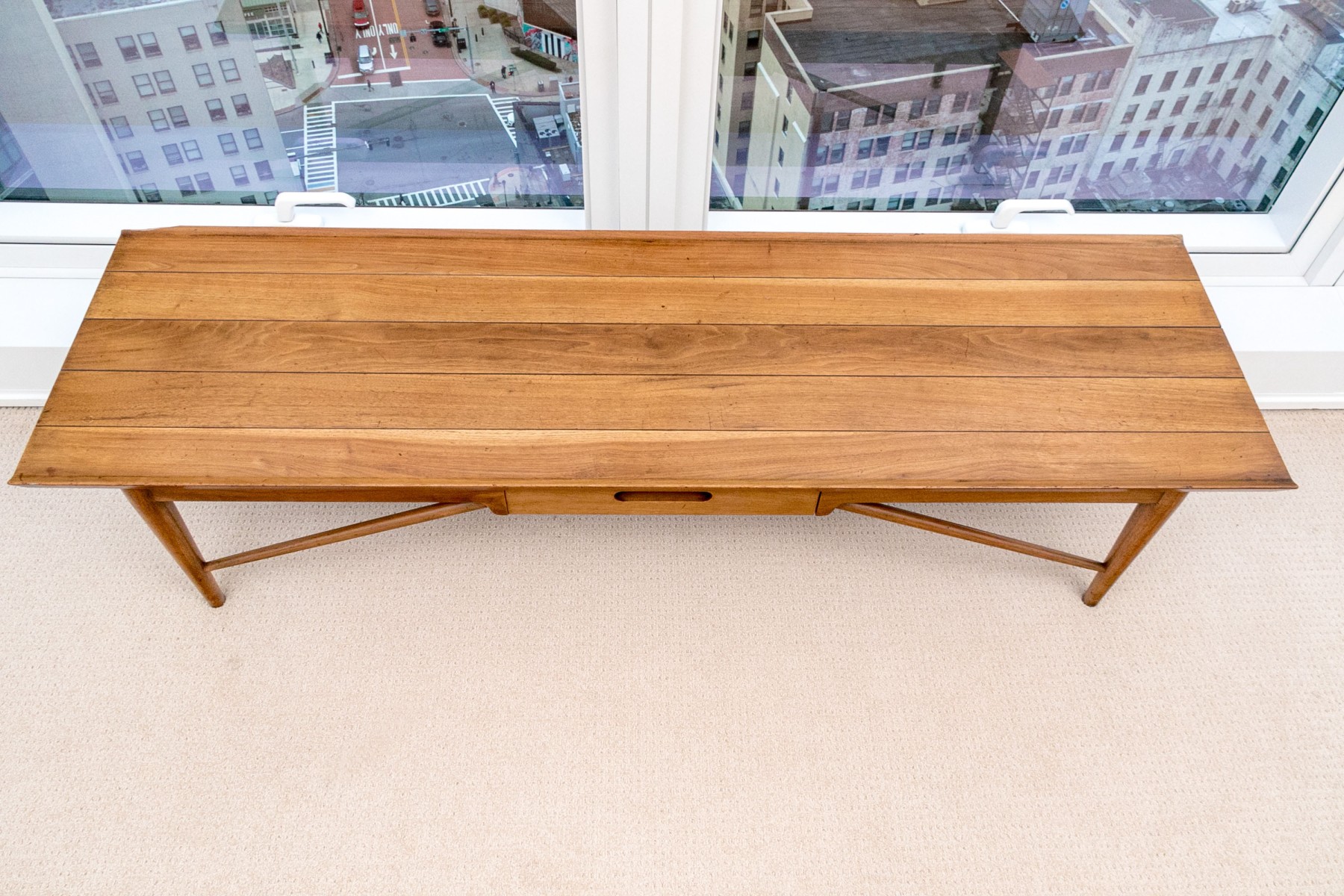 The plank constructed top with slightly upcurved long edges. The shaped frieze with a single drawer on one side. Raised on tapering cylindrical legs with four tapering cylindrical stretchers attached to the center frieze frame.