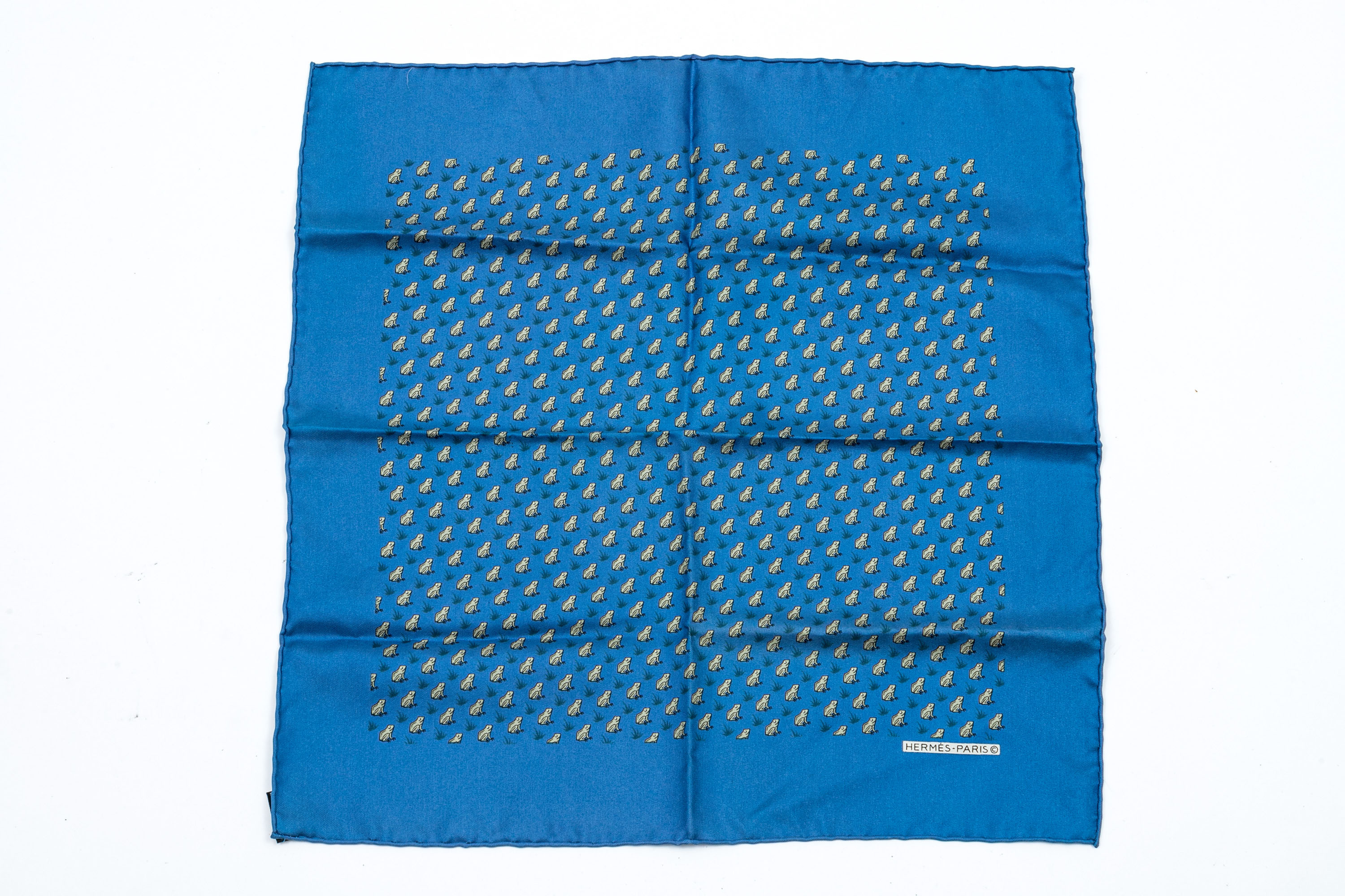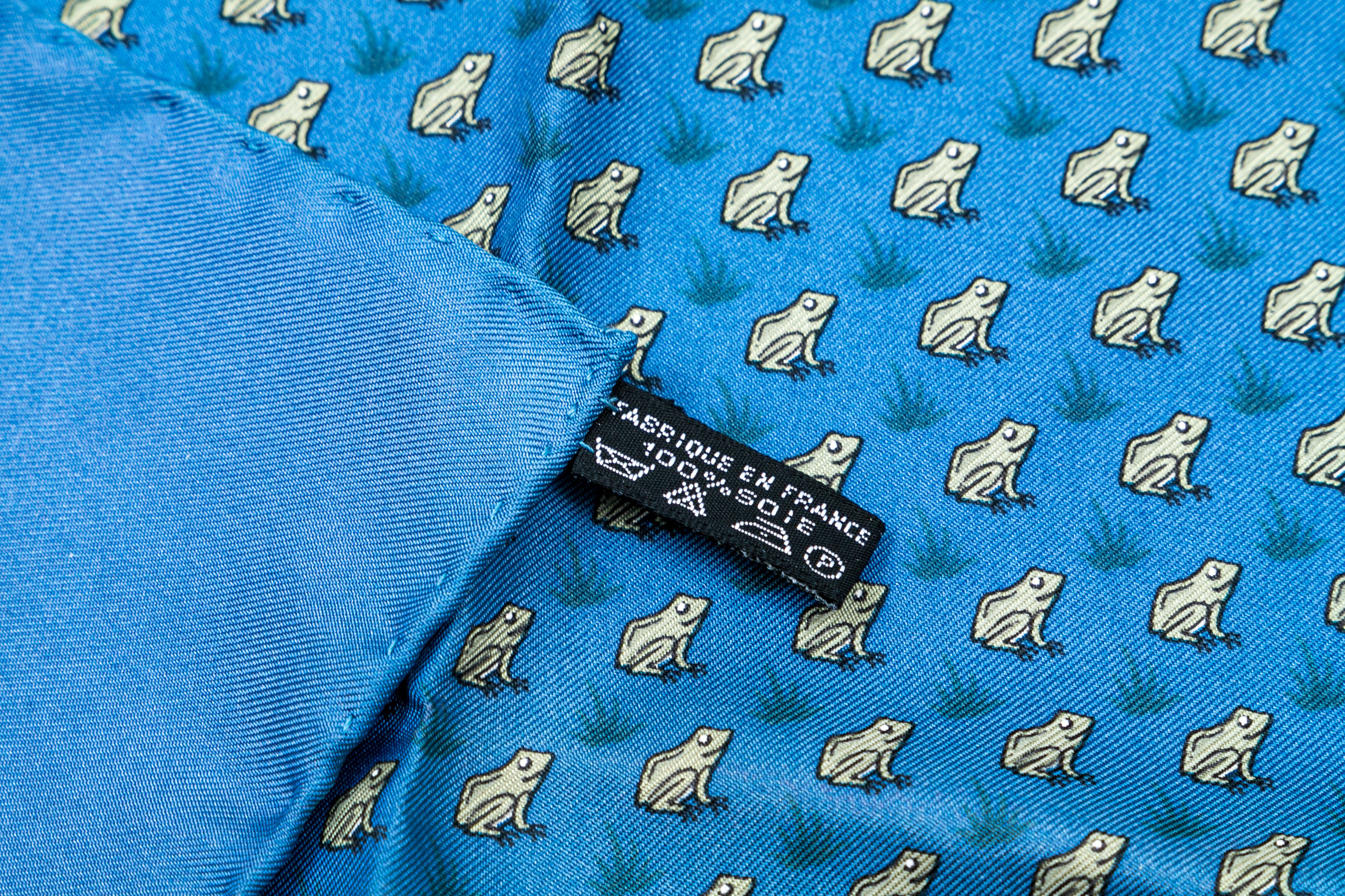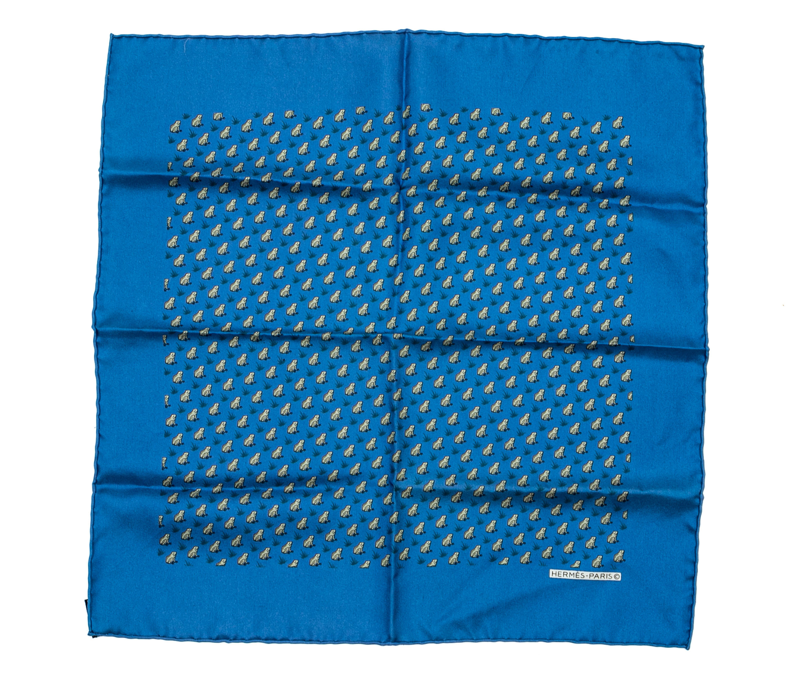 Hermès fun blue and grey frog motif silk pocket square/ neck scarf