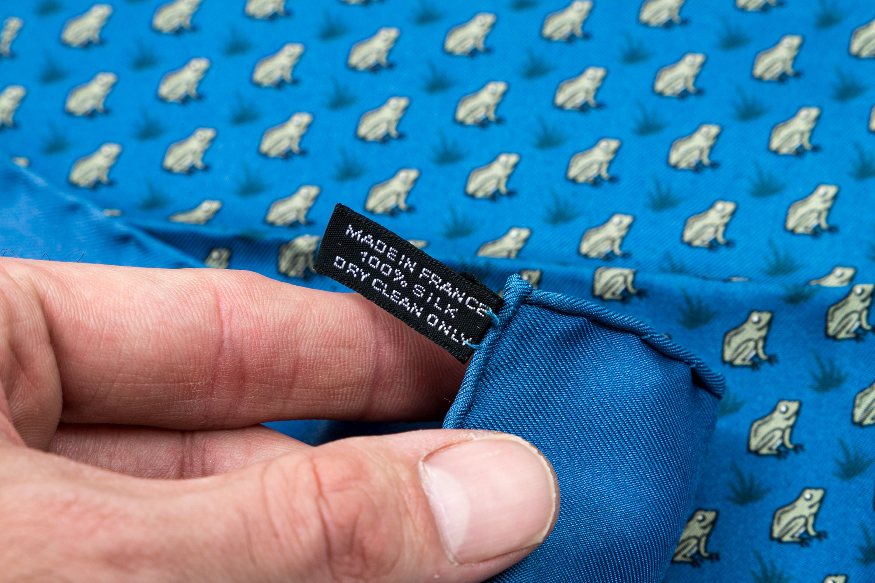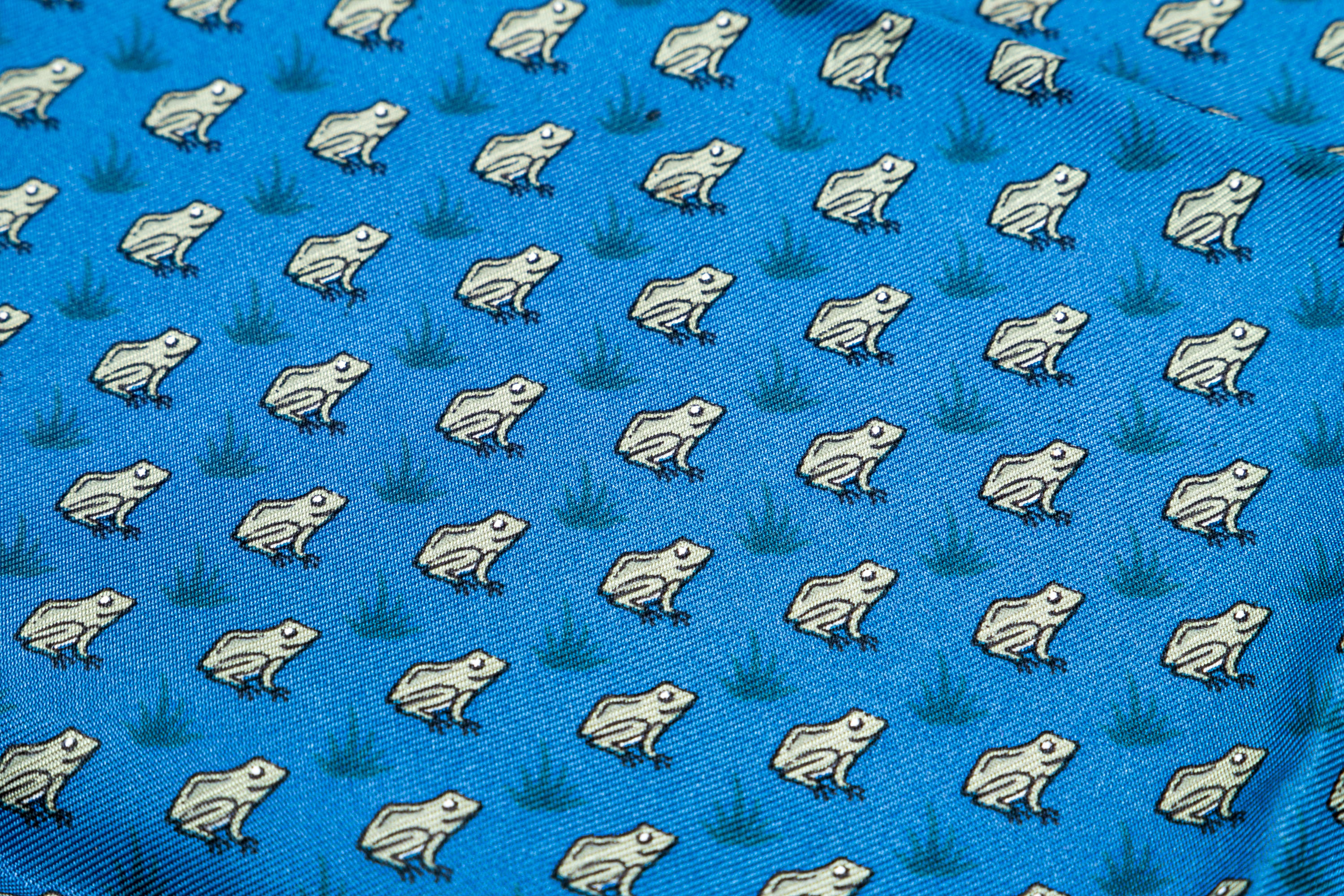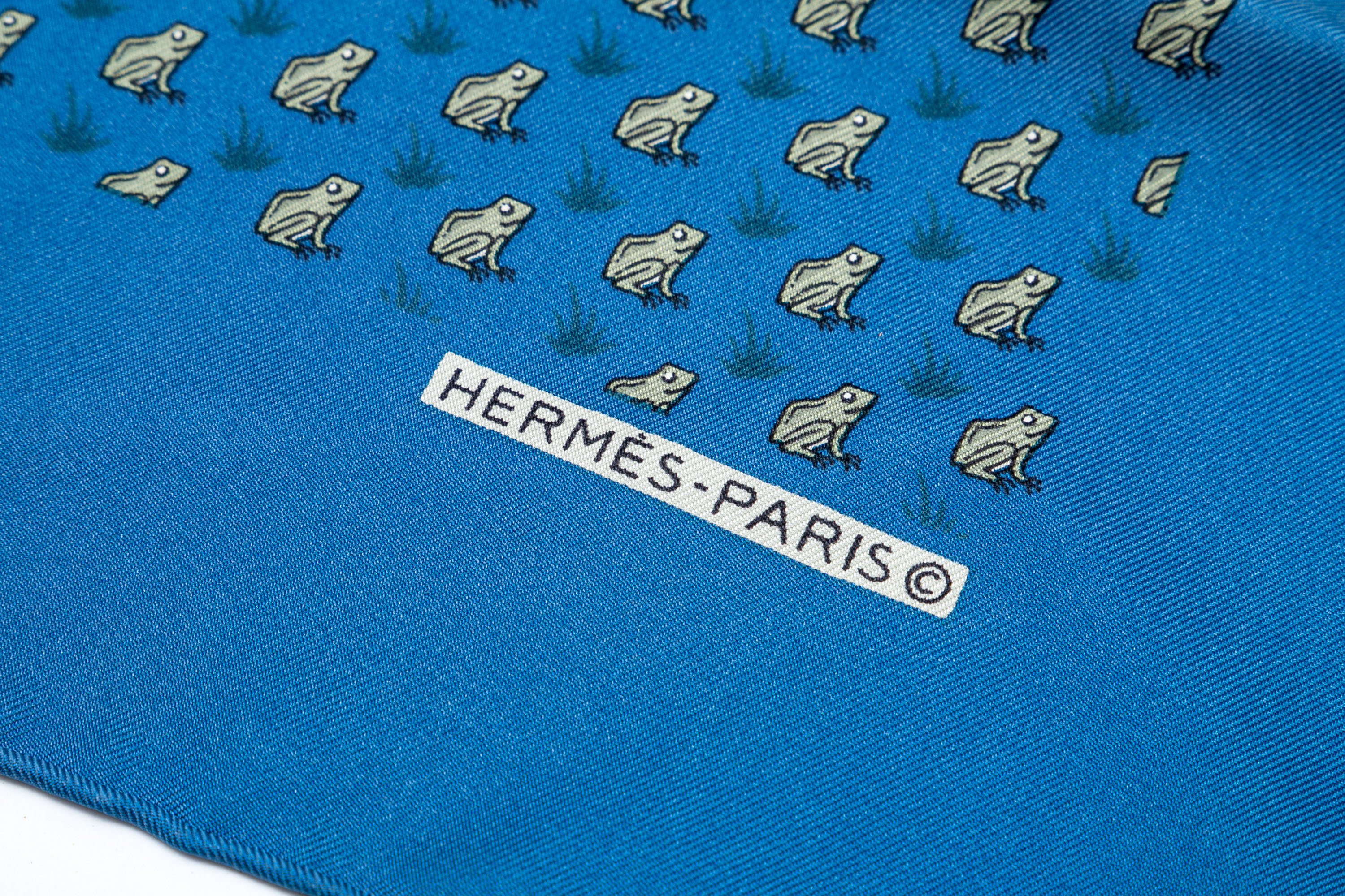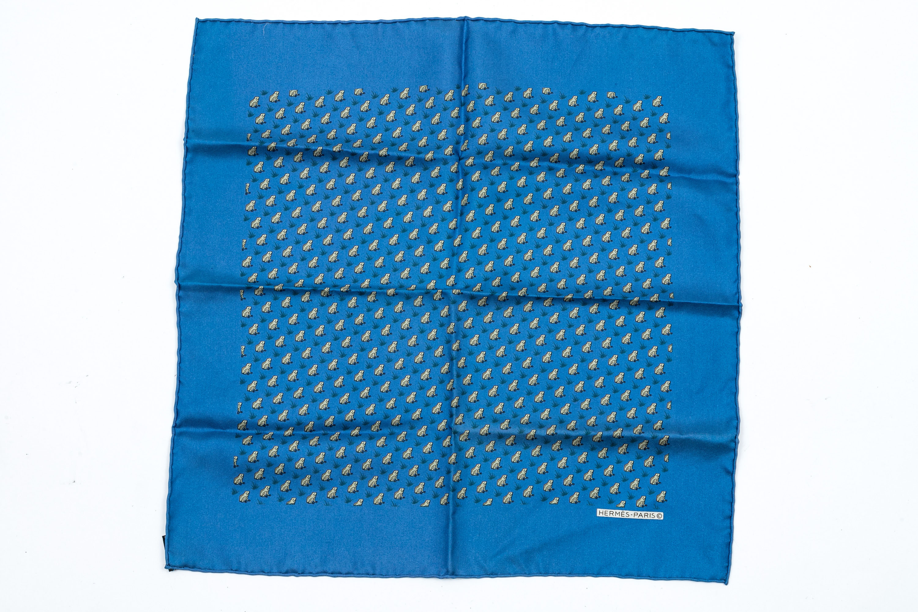 Hermès fun blue and grey frog motif silk pocket square/ neck scarf