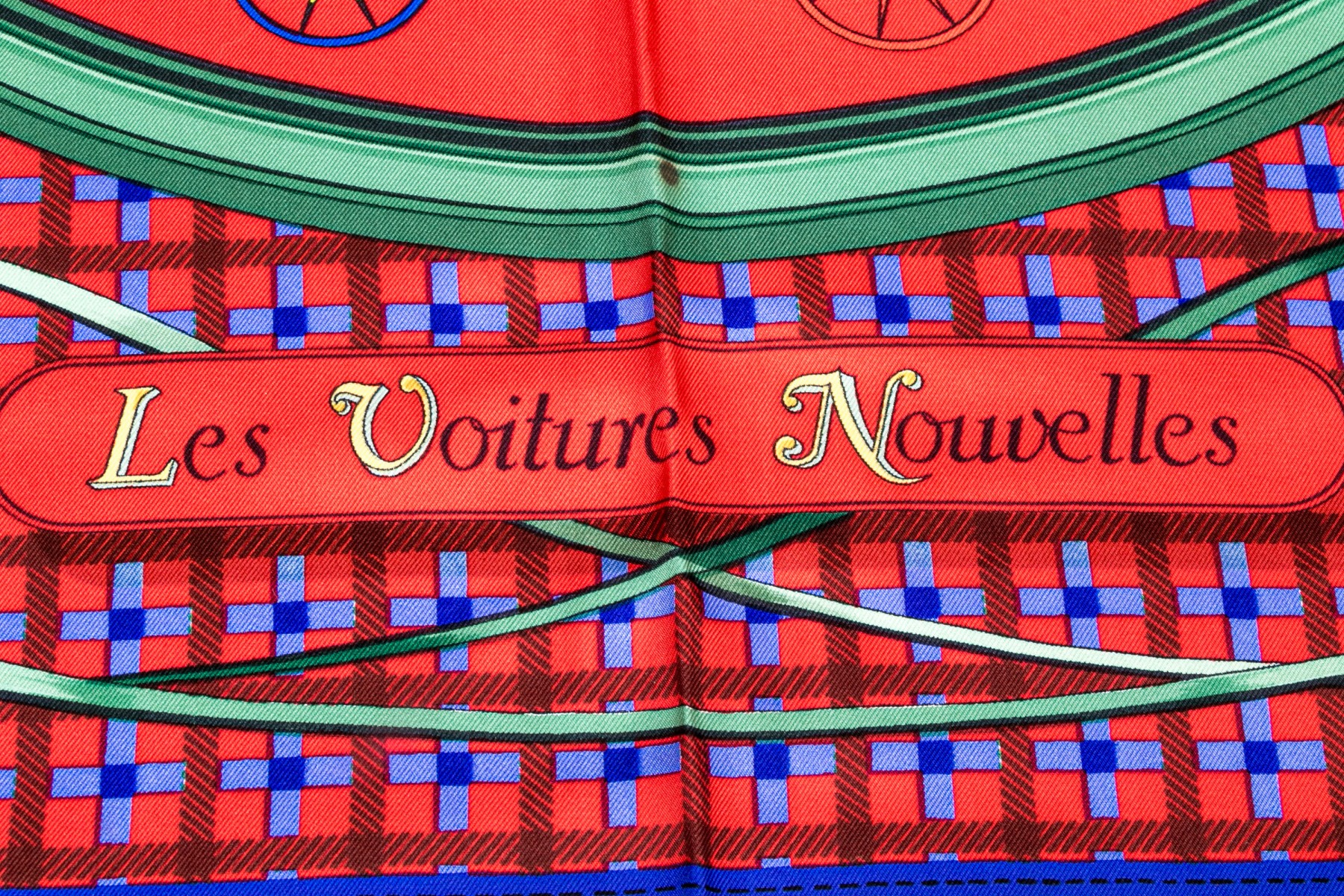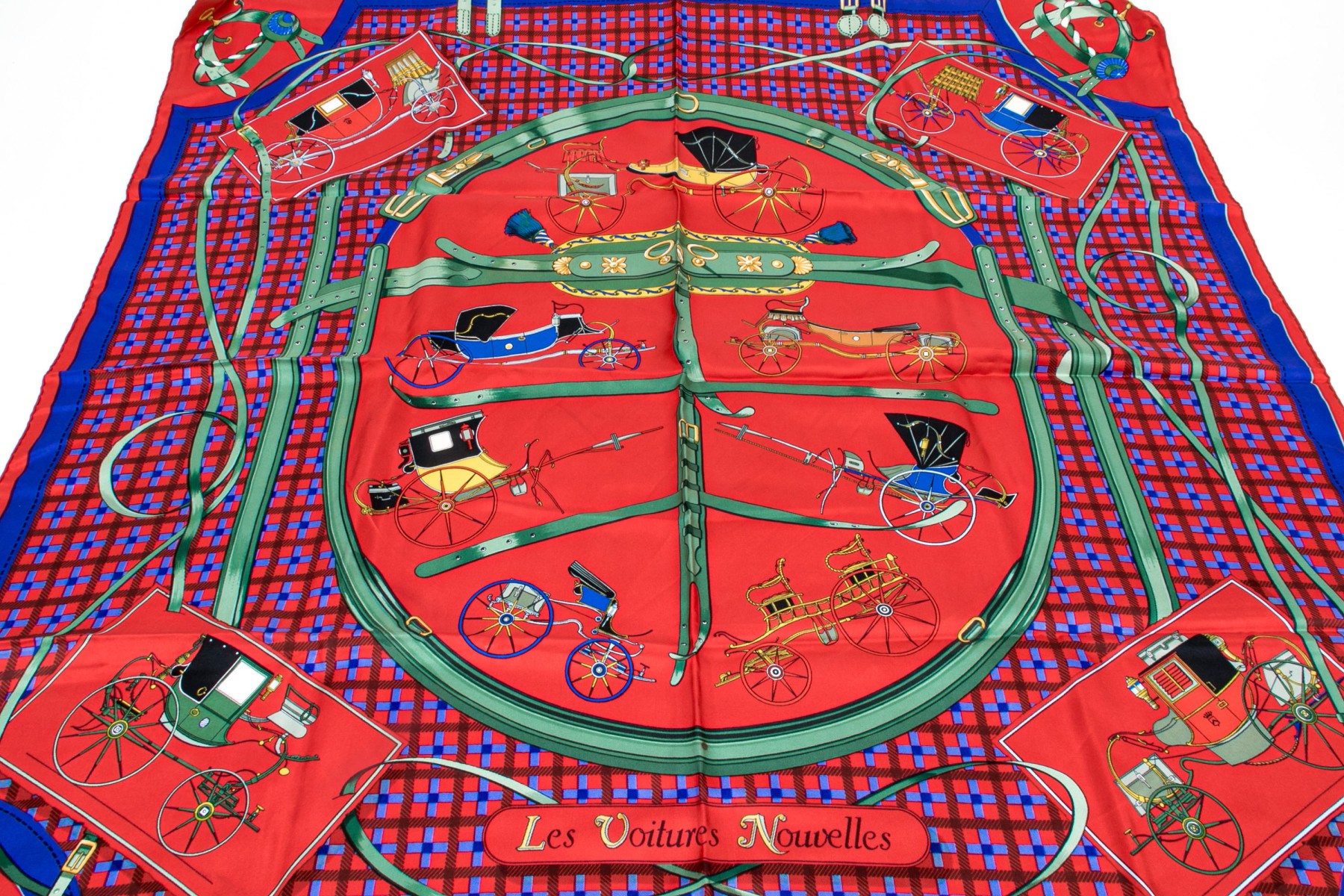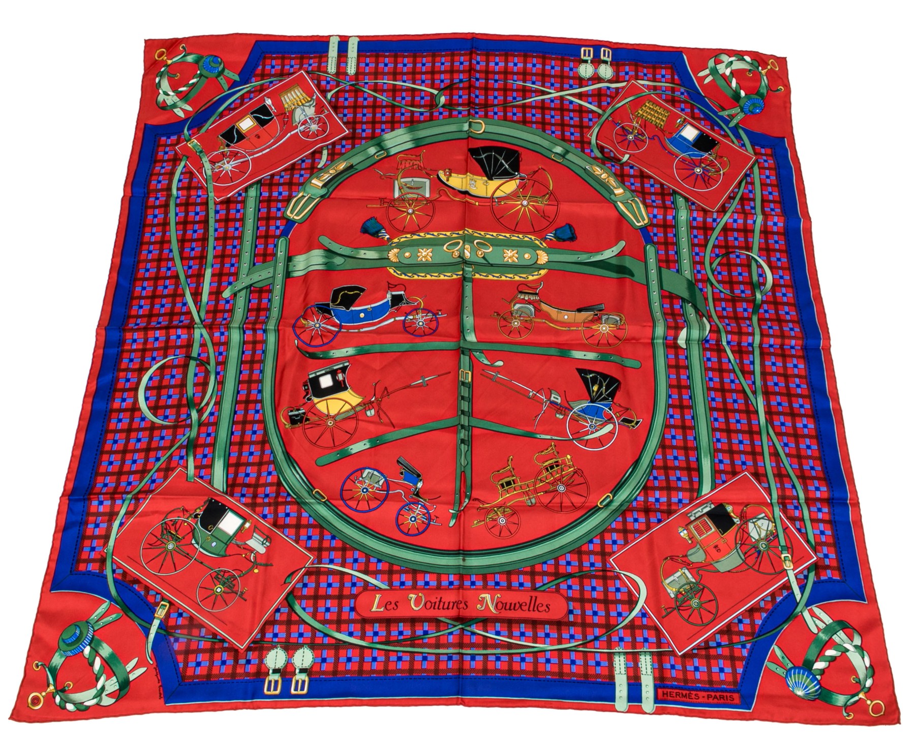 Hermès Paris striking vintage Les Voiturs Nouvelles buggy motif silk scarf, by Jacques Eudel