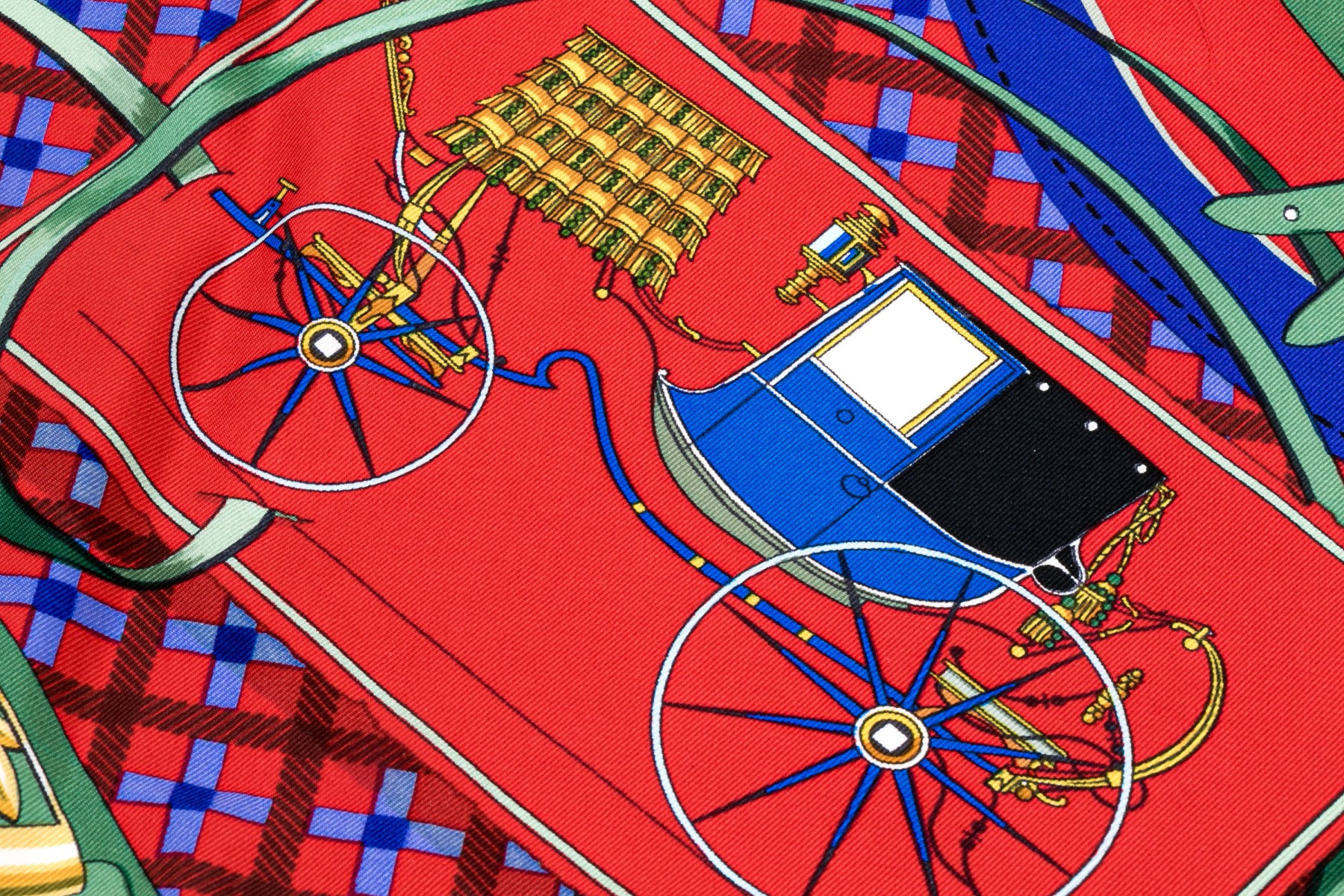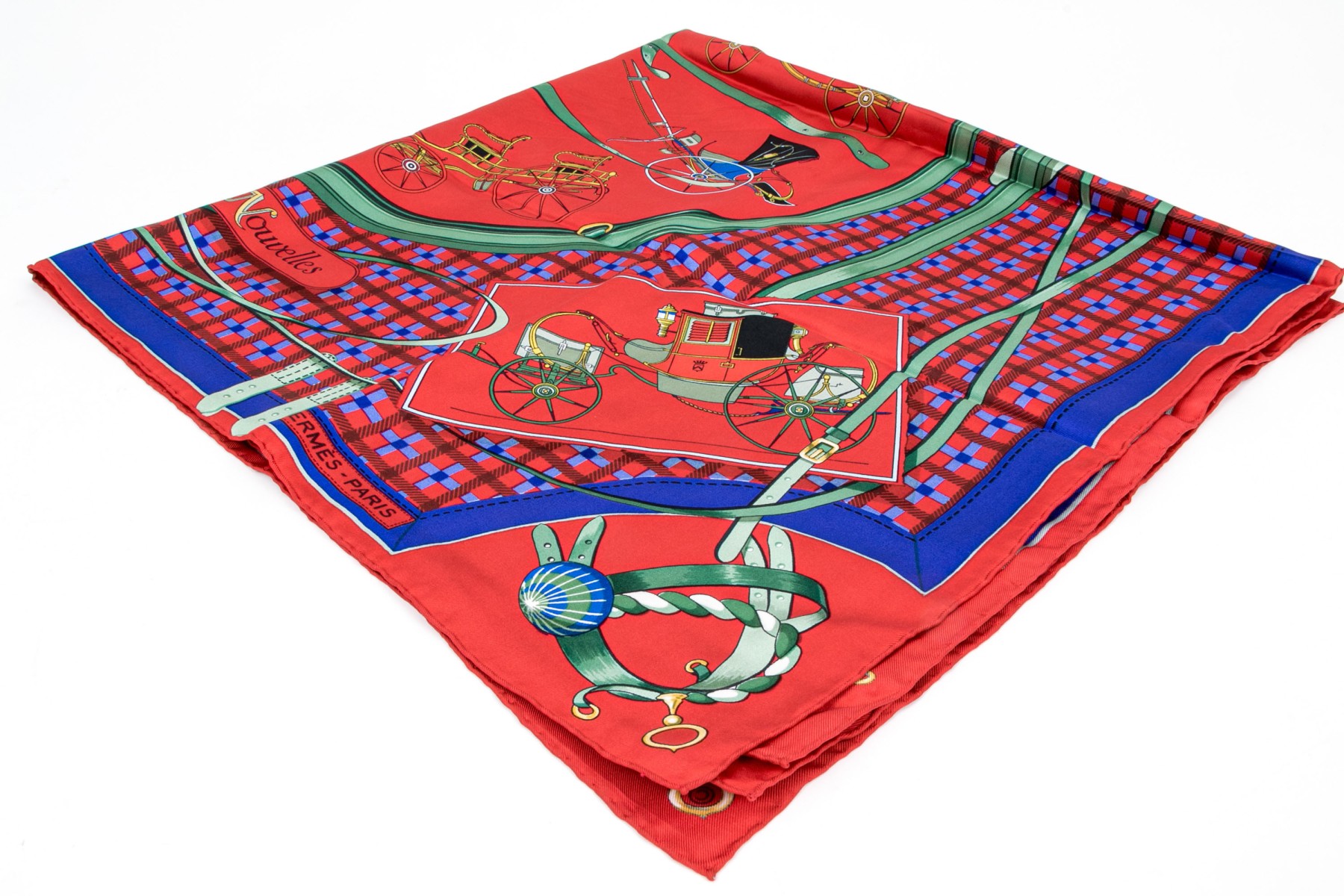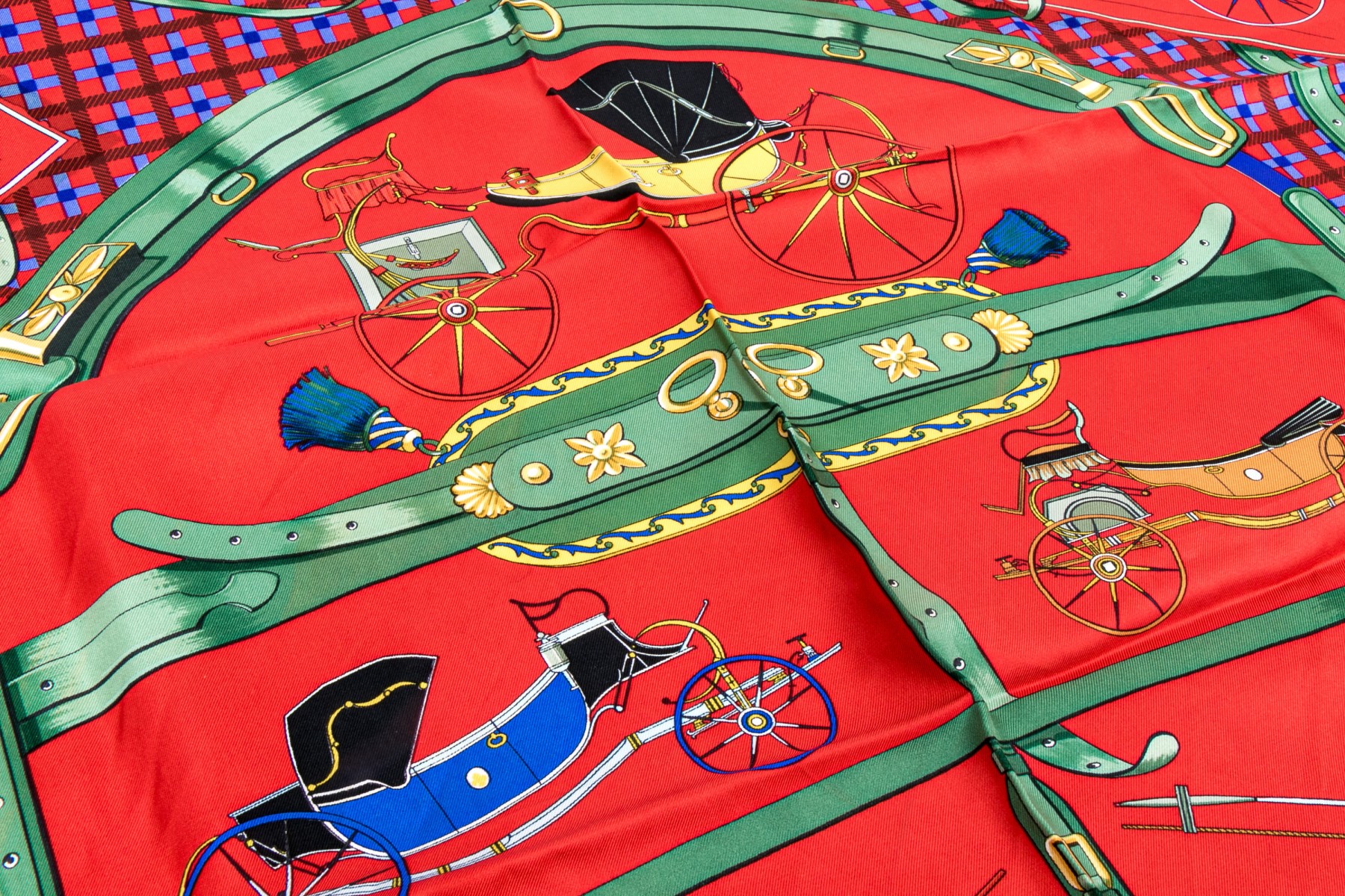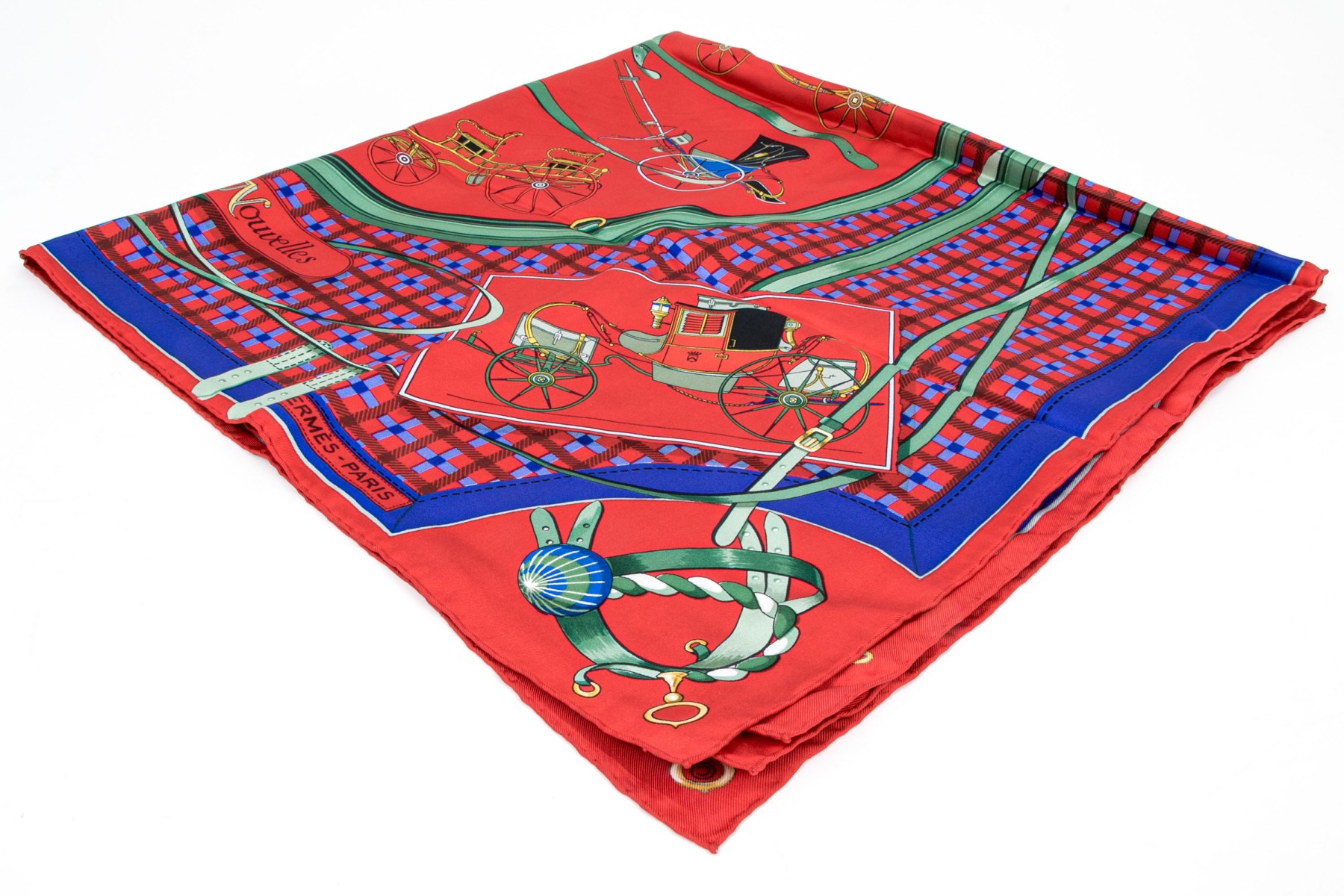 Hermès Paris striking vintage Les Voiturs Nouvelles buggy motif silk scarf, by Jacques Eudel
