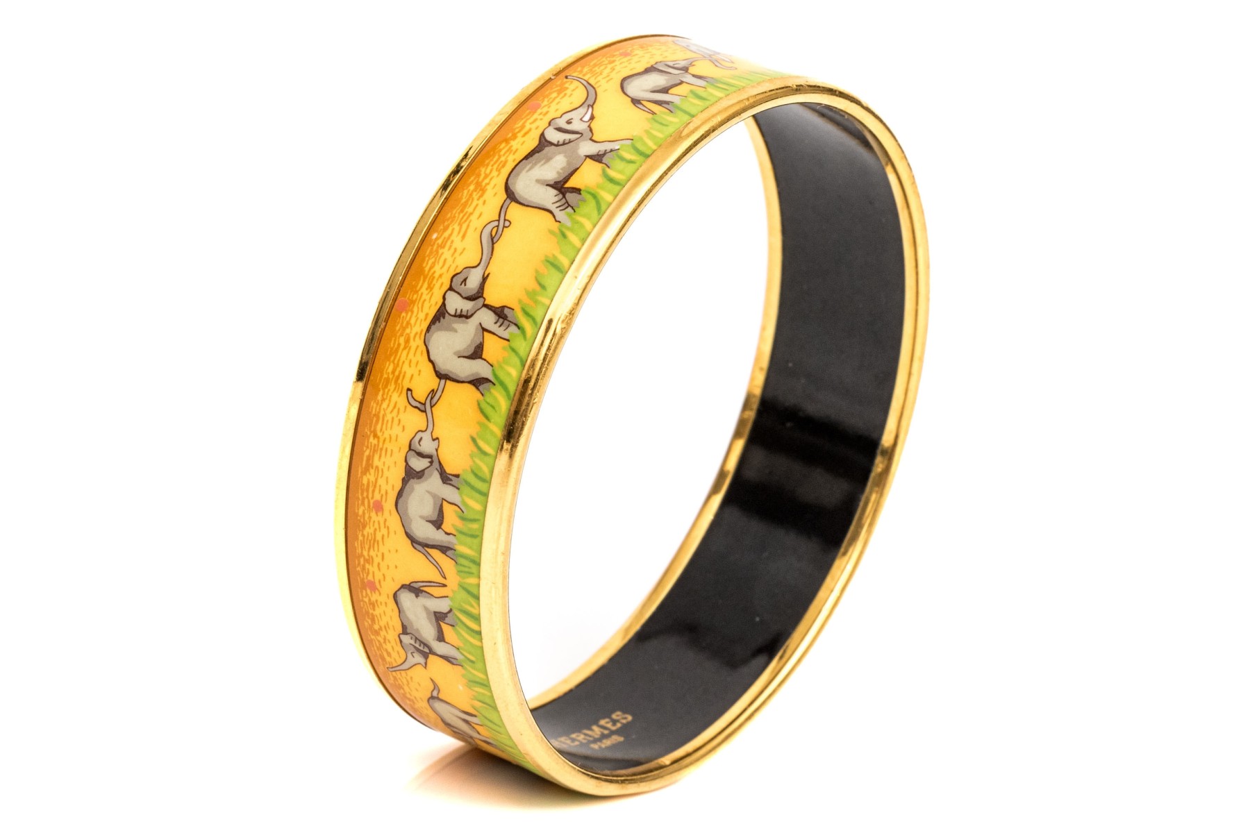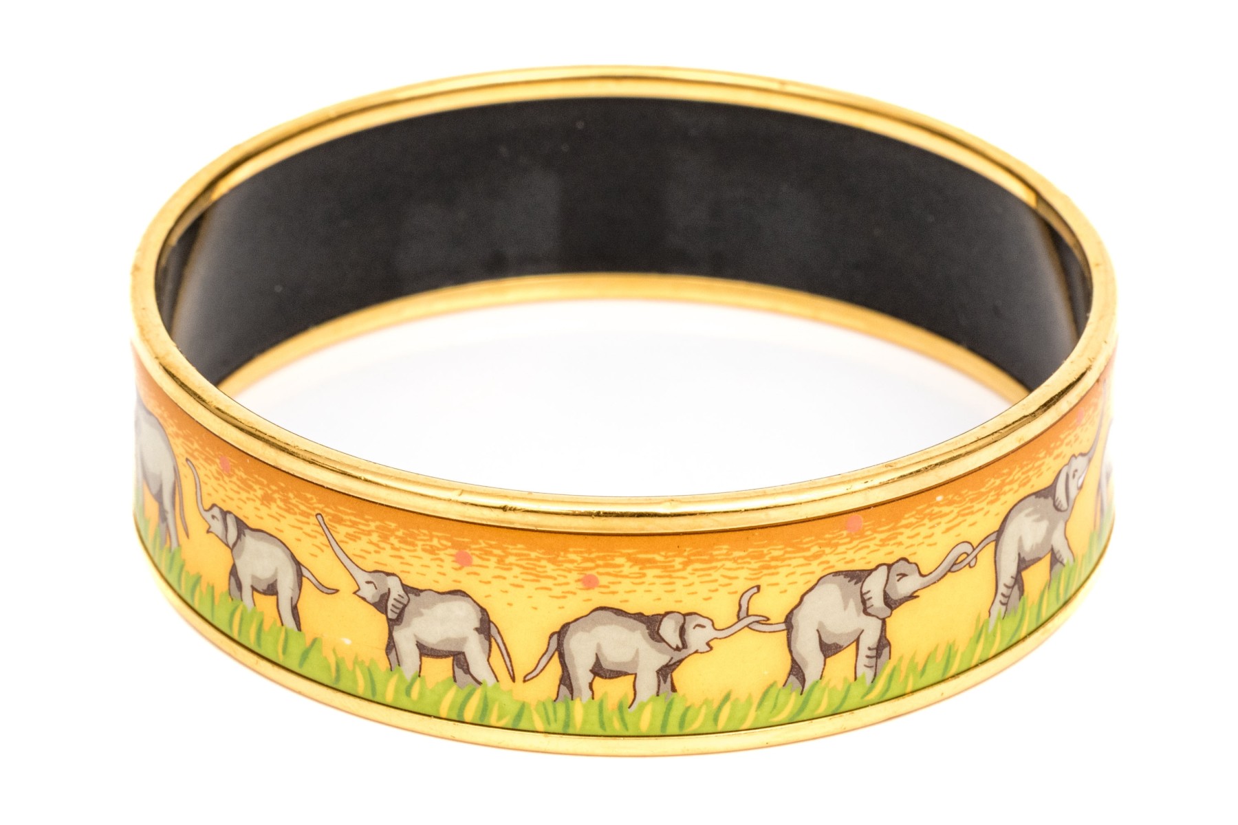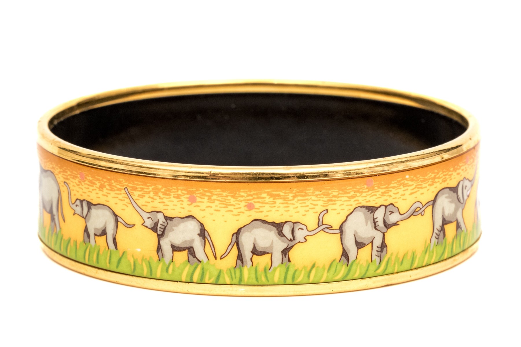 This Hermès enamel bangle features a parade of elephants against a golden yellow background with green grass detail. Trimmed in gold-tone edging with a black enamel interior, this bracelet is great for stacking or a pop of color.
