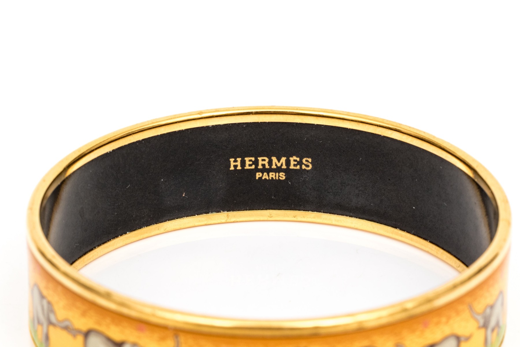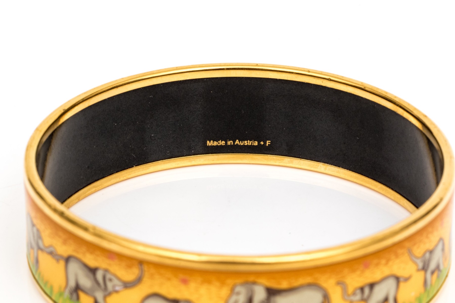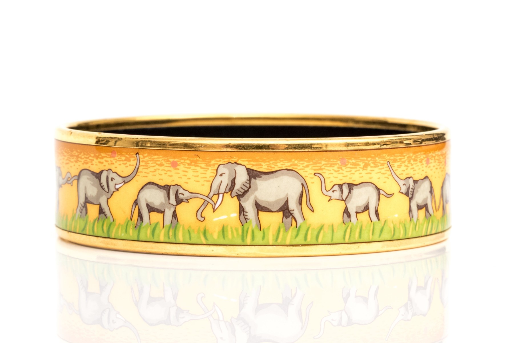 This Hermès enamel bangle features a parade of elephants against a golden yellow background with green grass detail. Trimmed in gold-tone edging with a black enamel interior, this bracelet is great for stacking or a pop of color.
