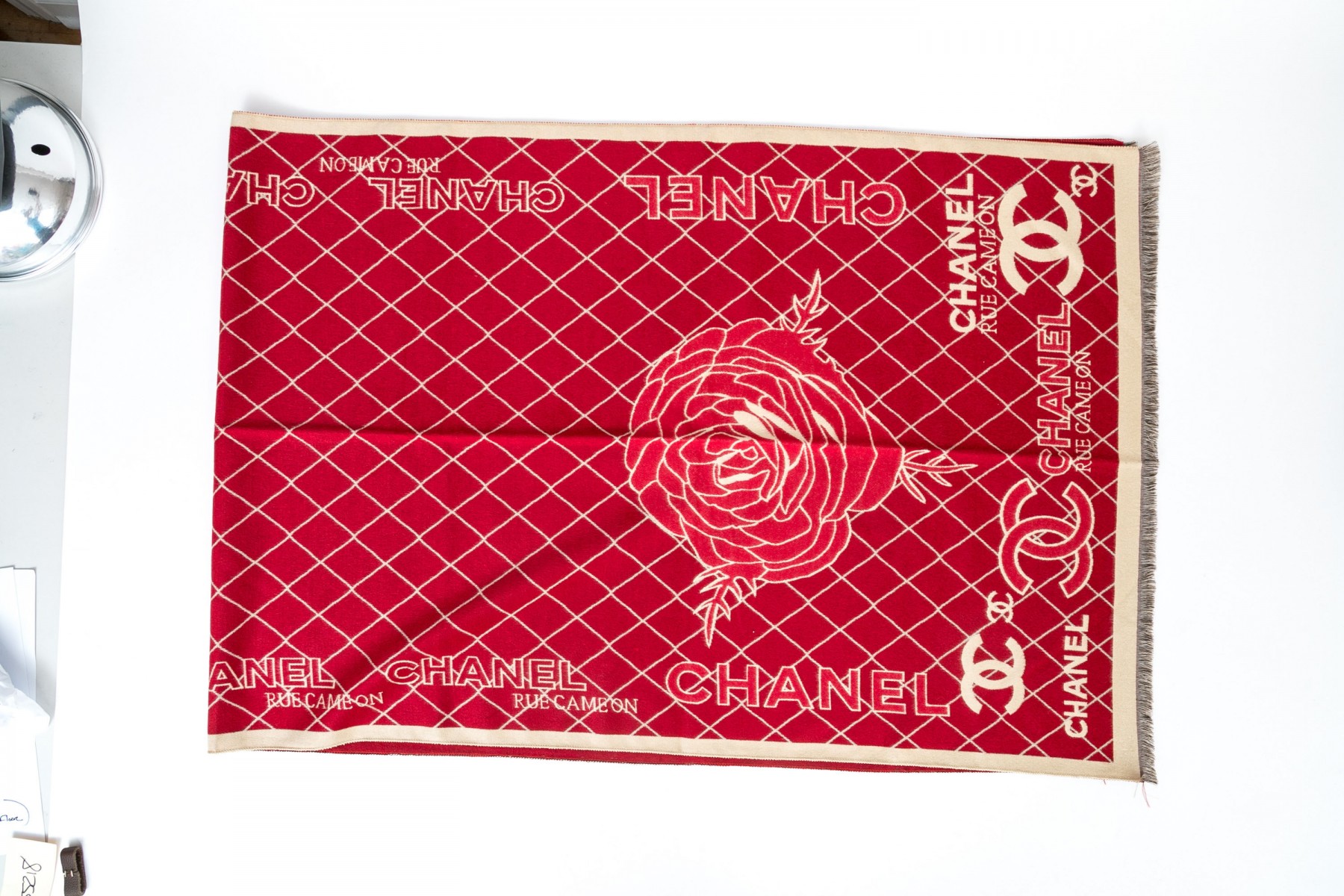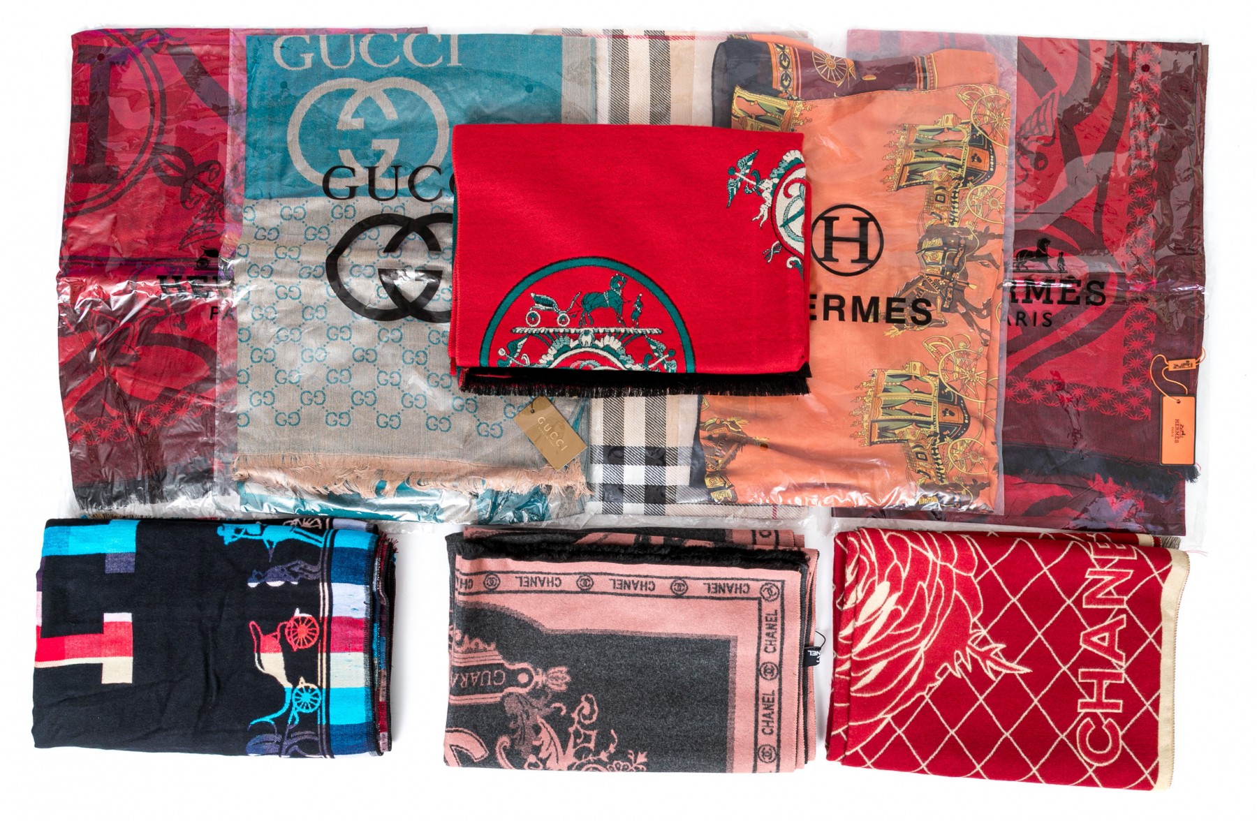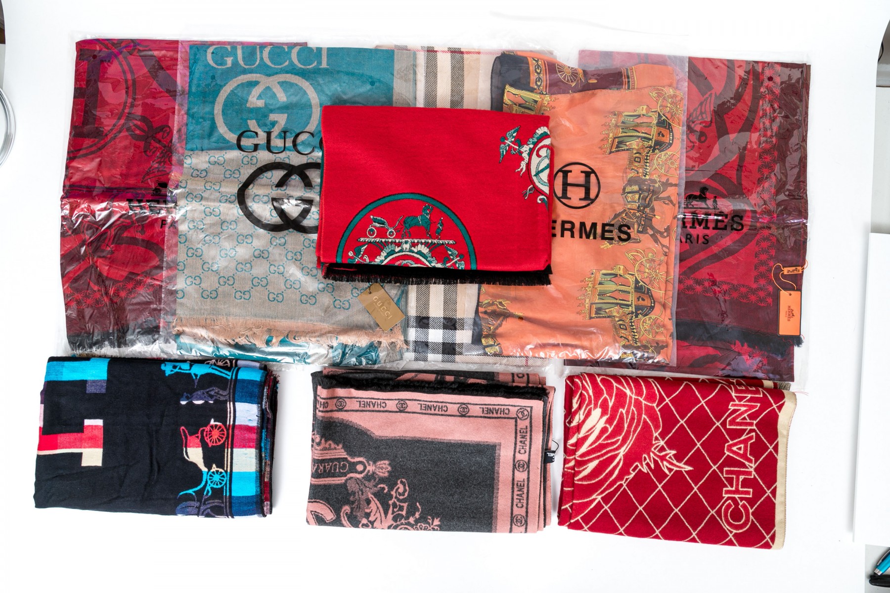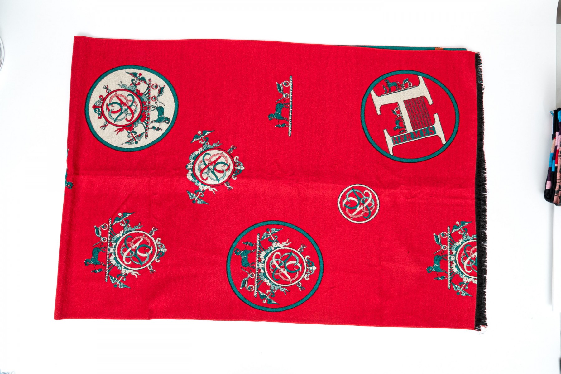 Dimensions: Various sizes ranging from 70" L x 34" W-Hermes orange silk scarf, 64" L x 26" W-Red and Green Hermes, 70" L x 27" W-Black and Multi Colored Hermes, 72" L x 26" W-Pink and Grey Chanel, 72" L x 24" W-Red and Tan Chanel.