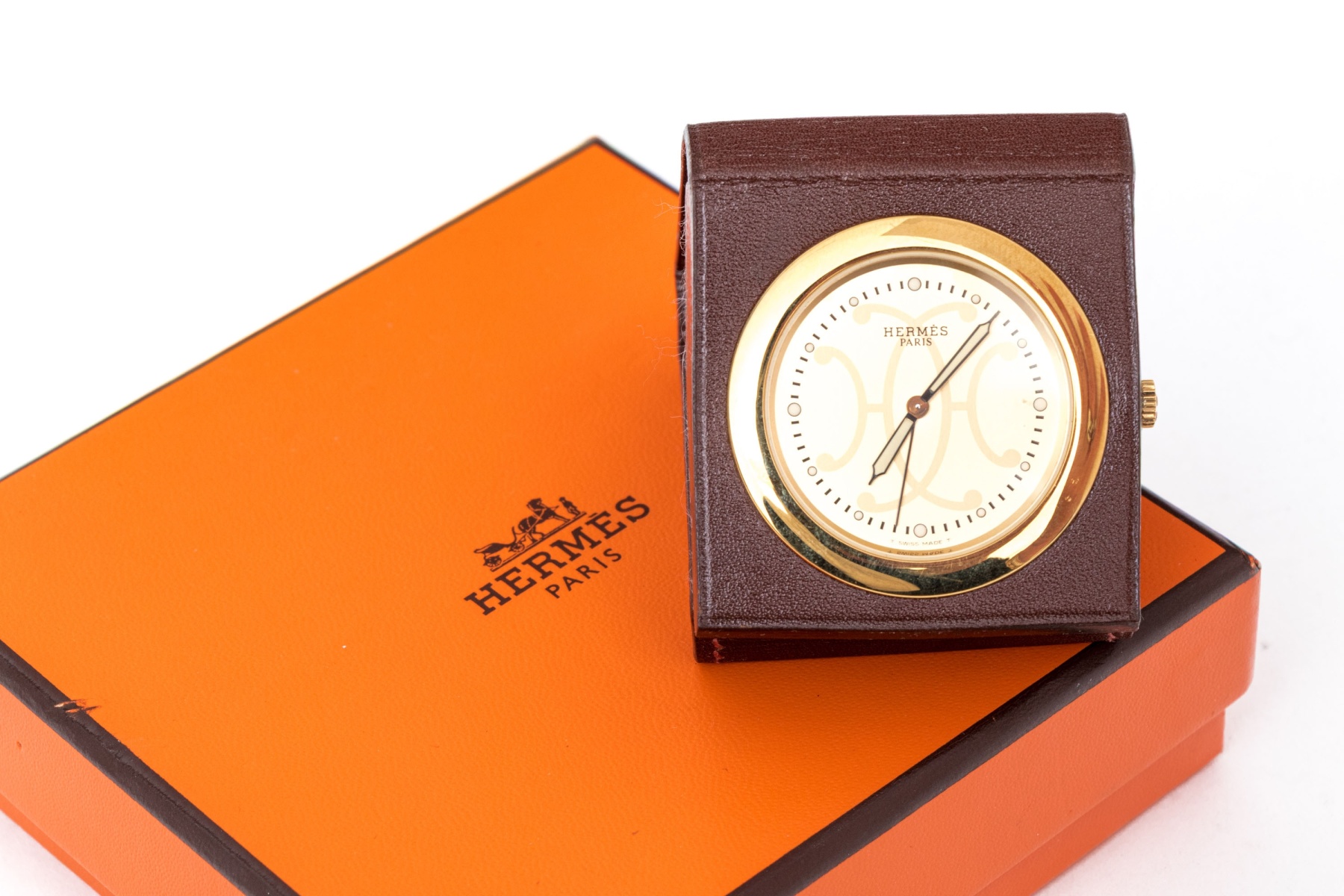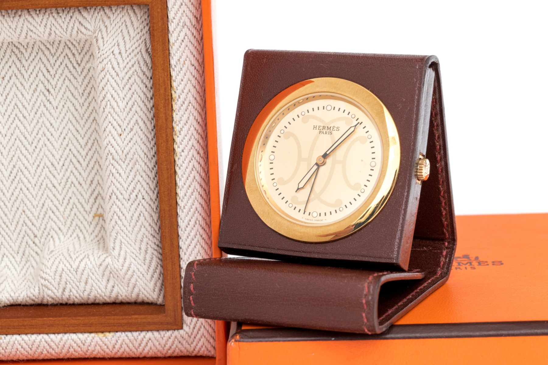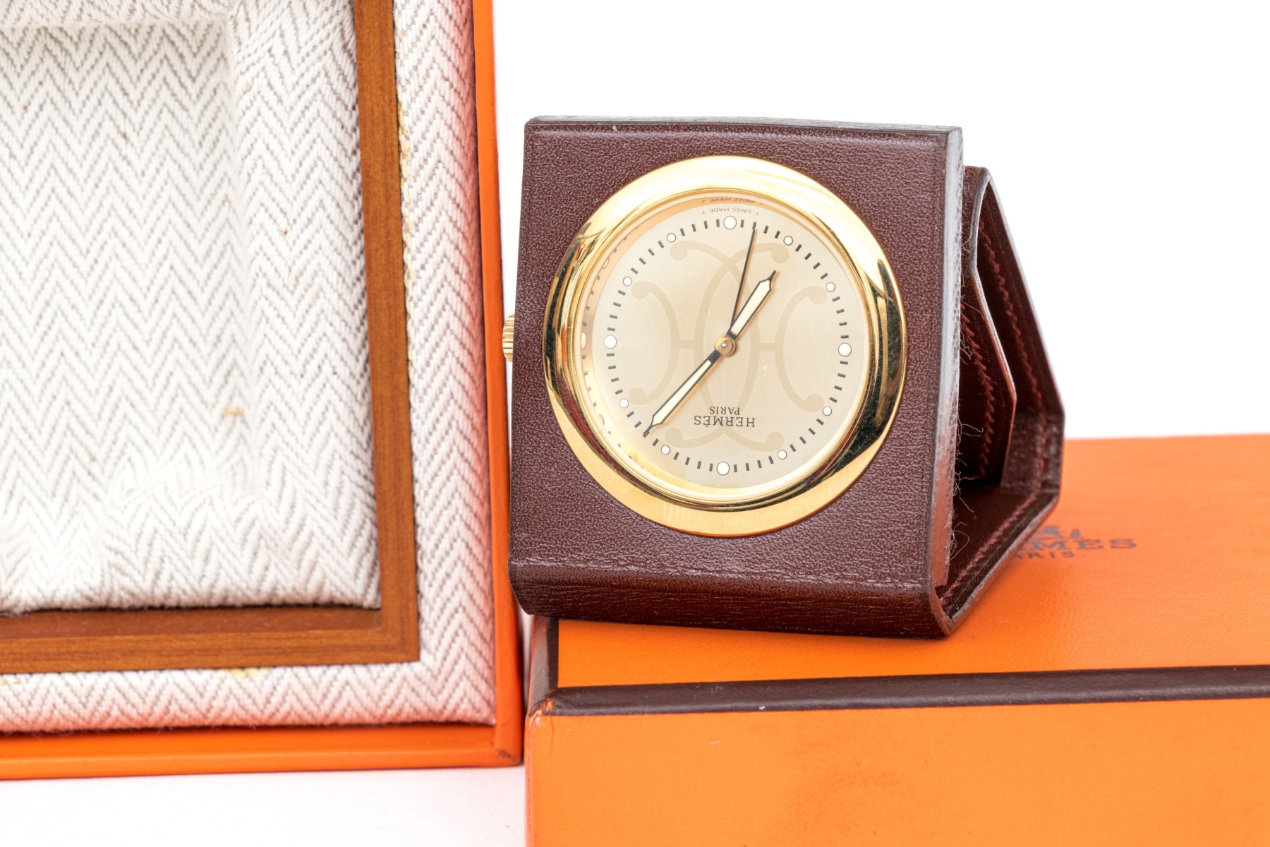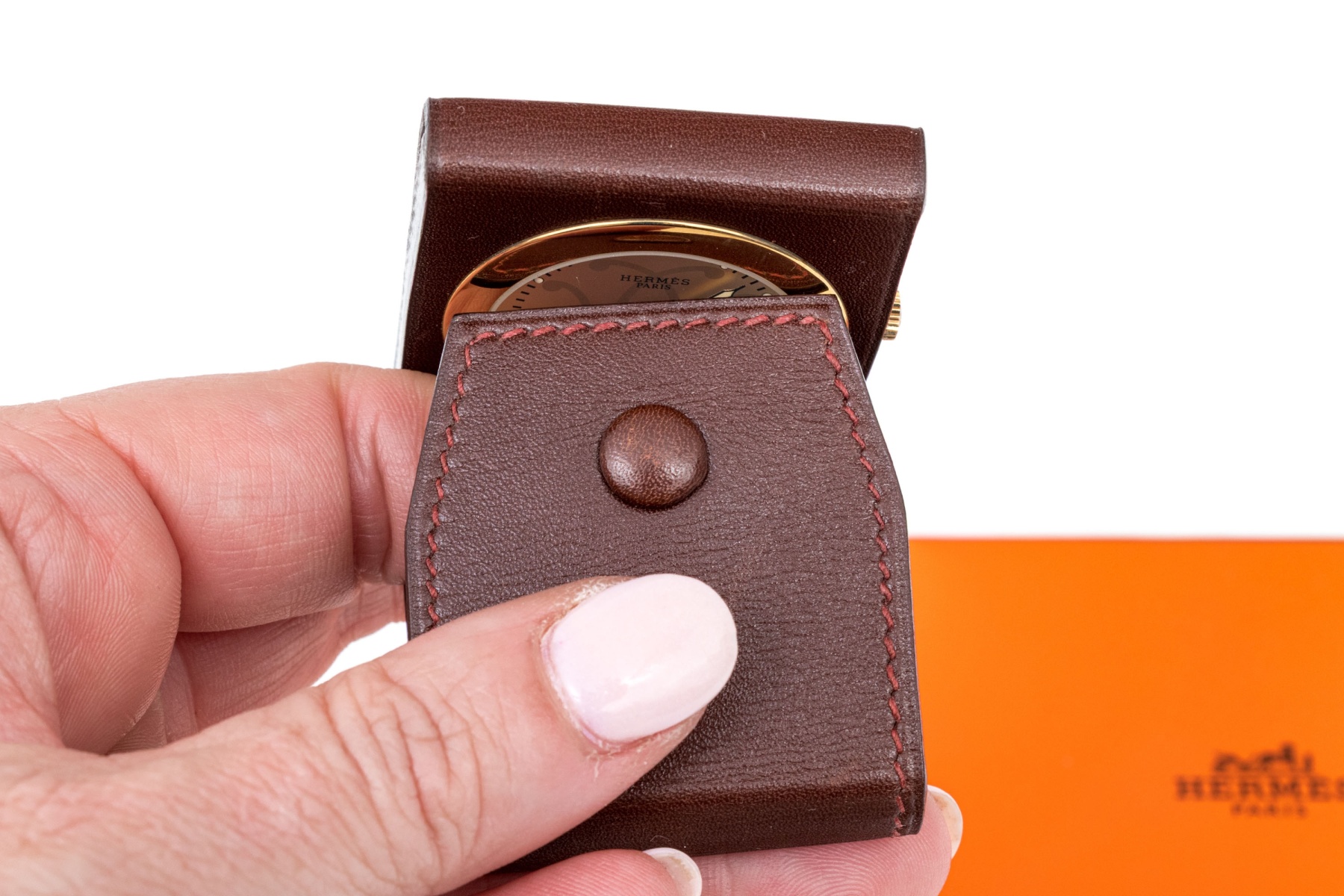 This charming travel clock from Hermes features a patterned champagne face, gold toned bezel and is displayed in a leather case with a snap closure. Accompanied by the original box.