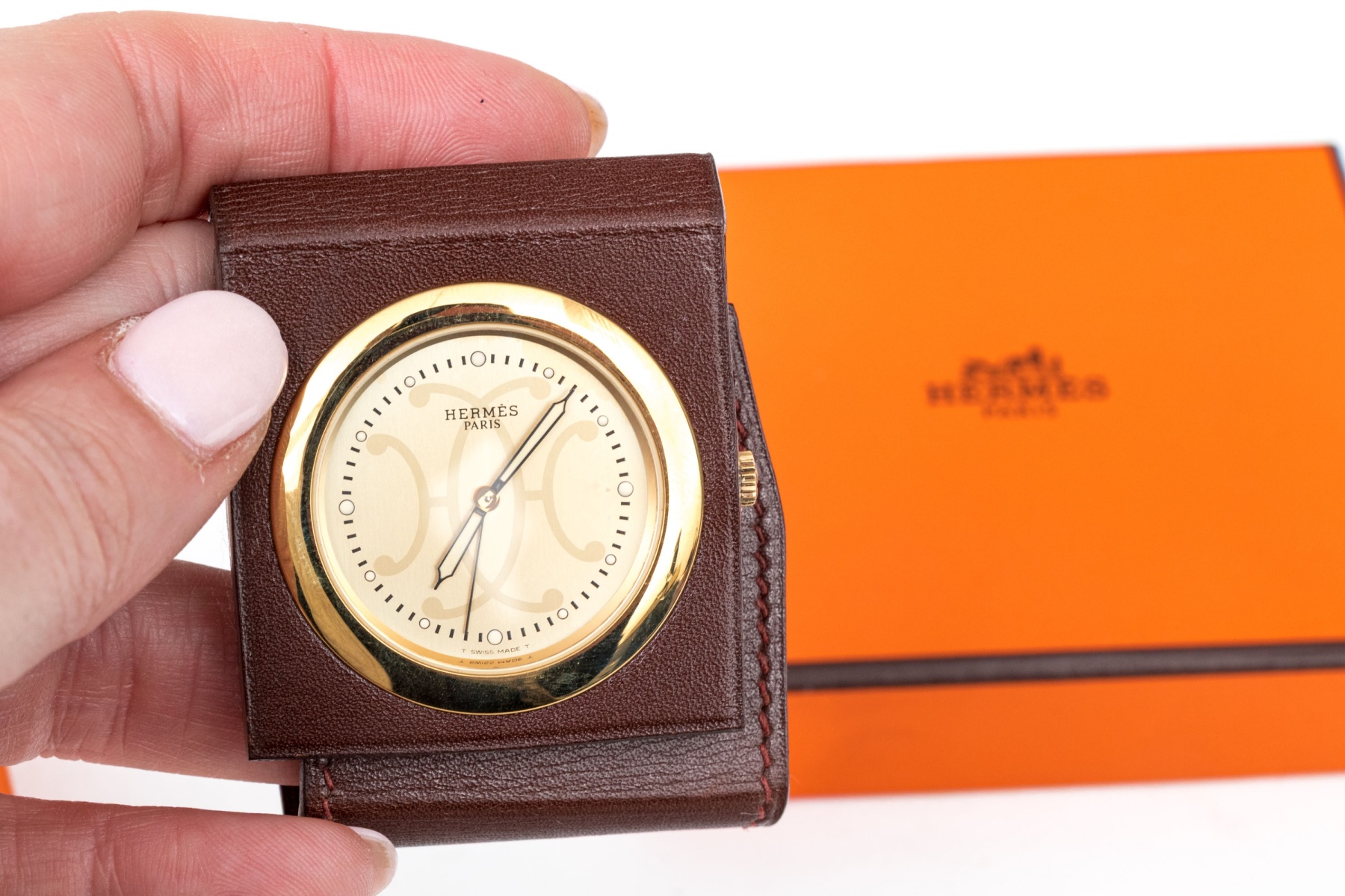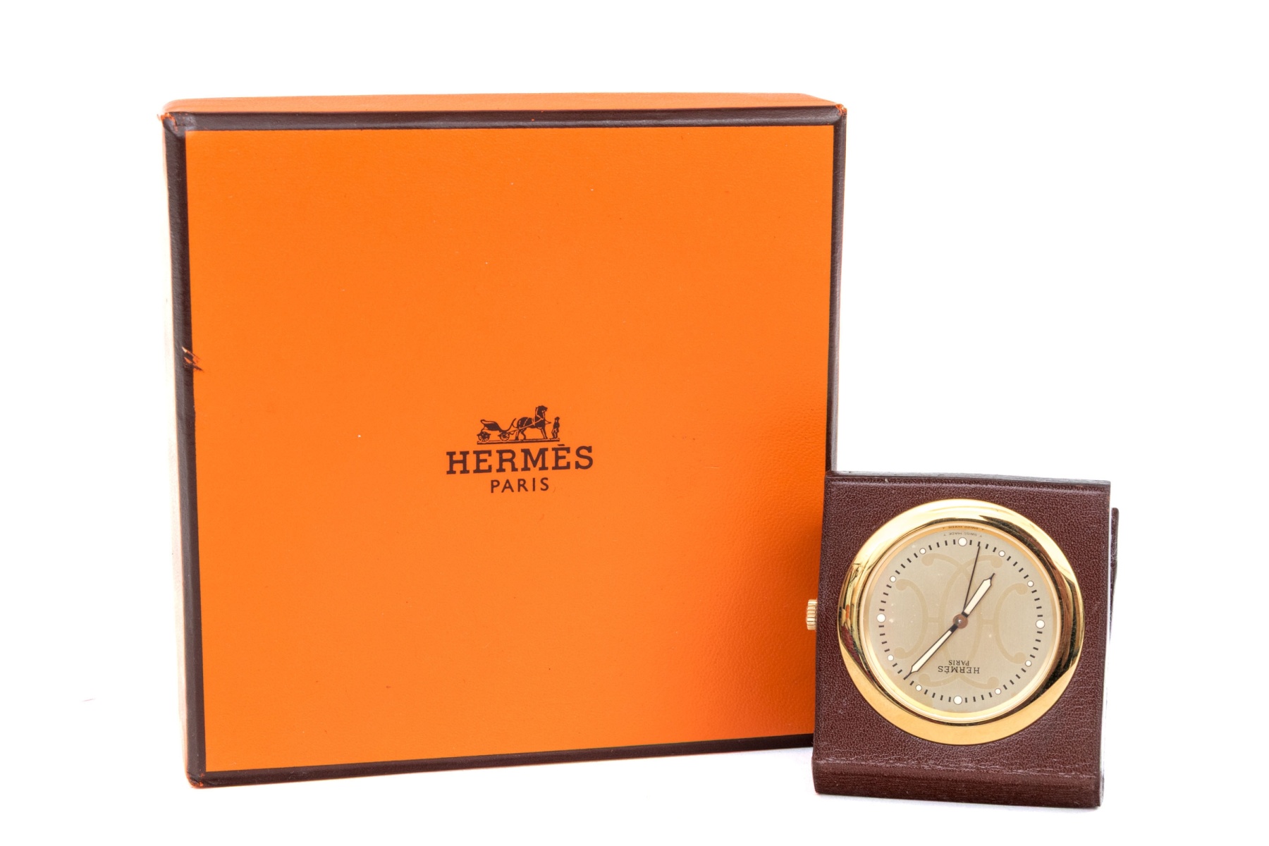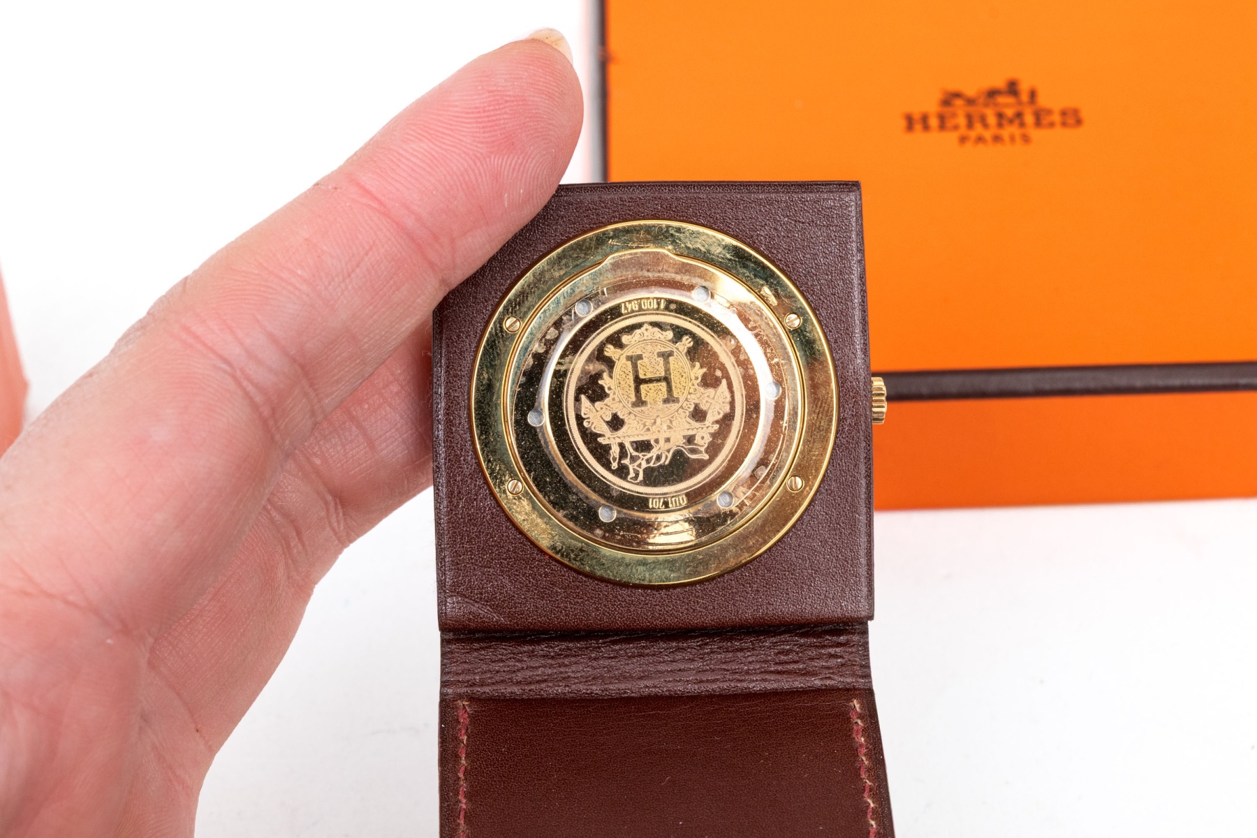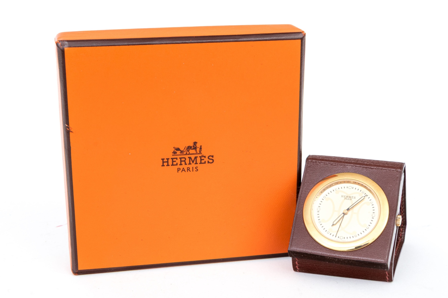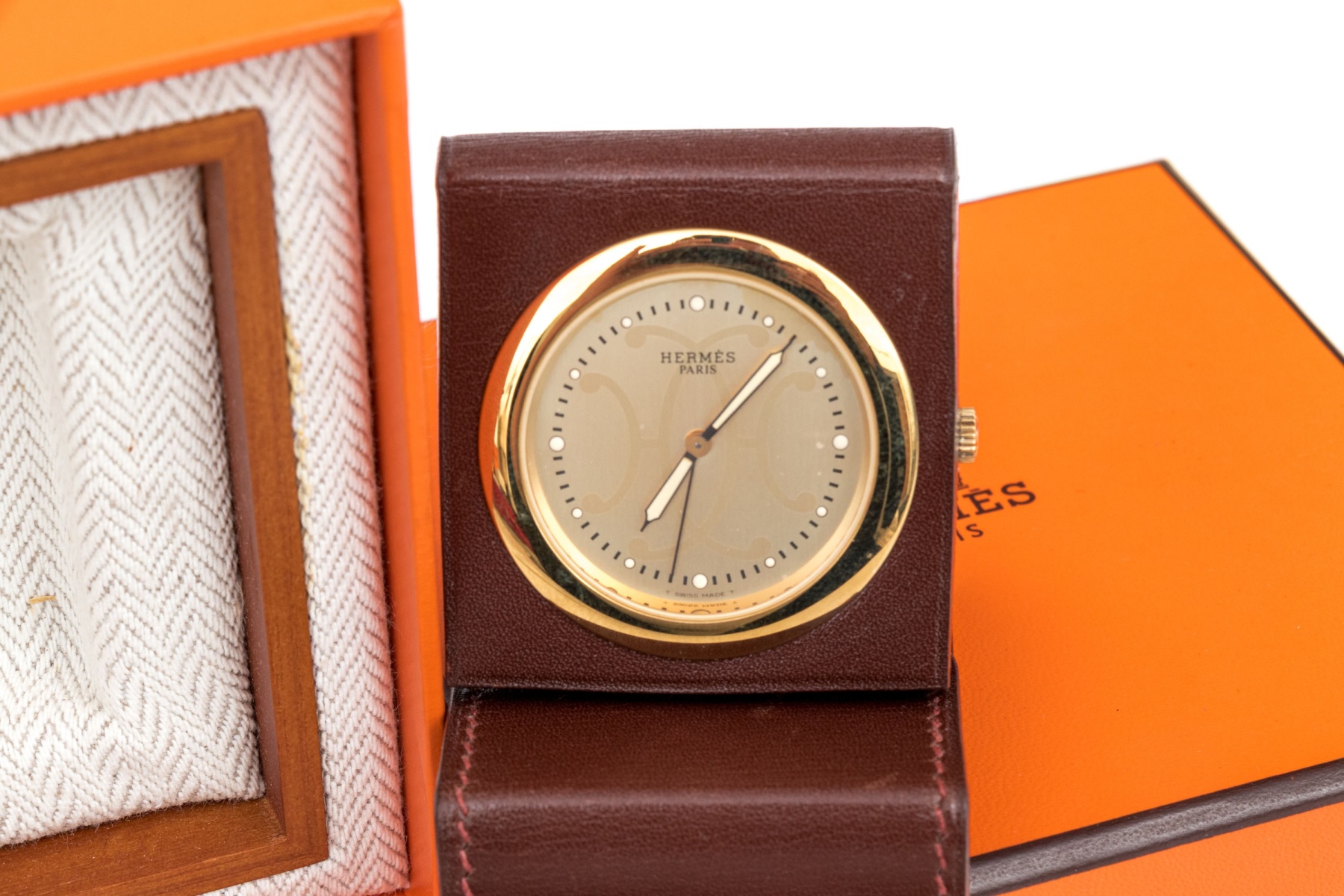 This charming travel clock from Hermes features a patterned champagne face, gold toned bezel and is displayed in a leather case with a snap closure. Accompanied by the original box.