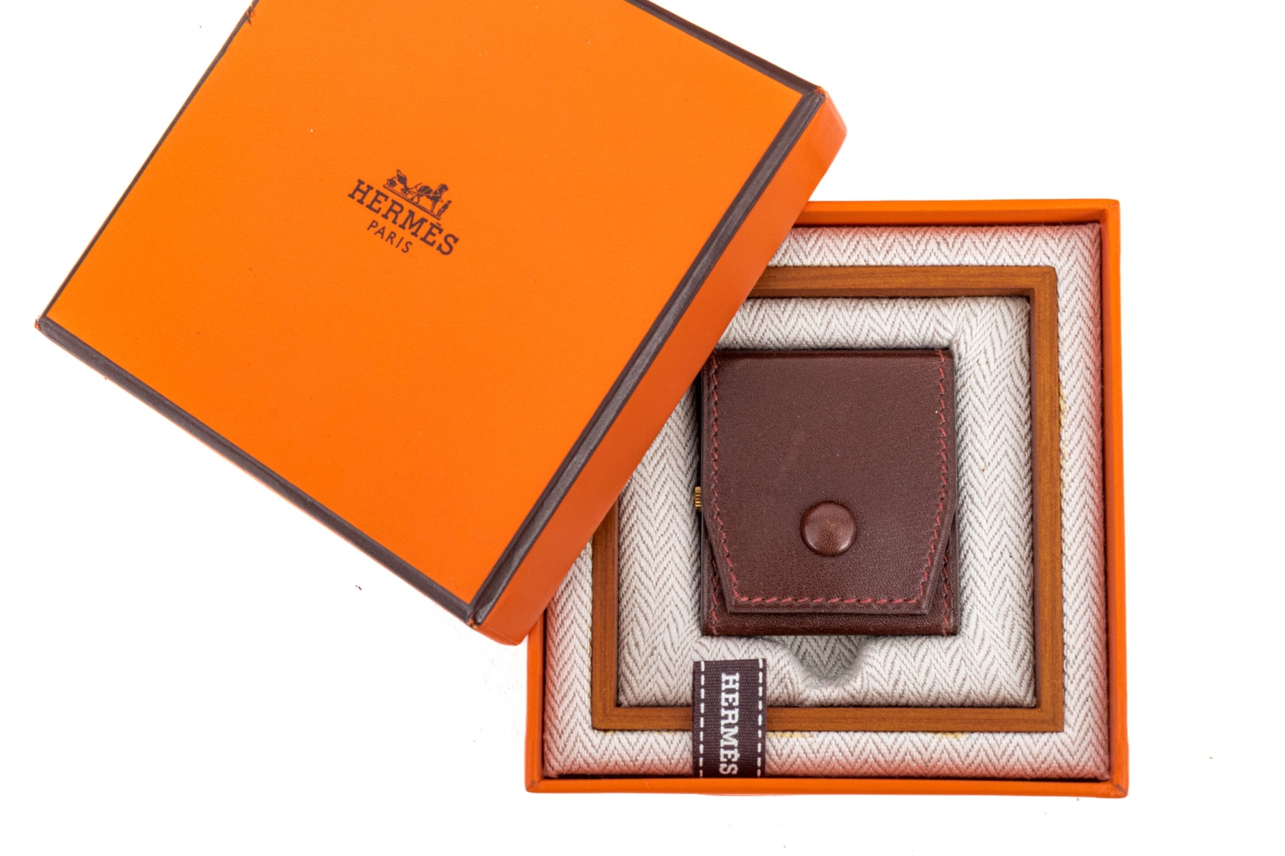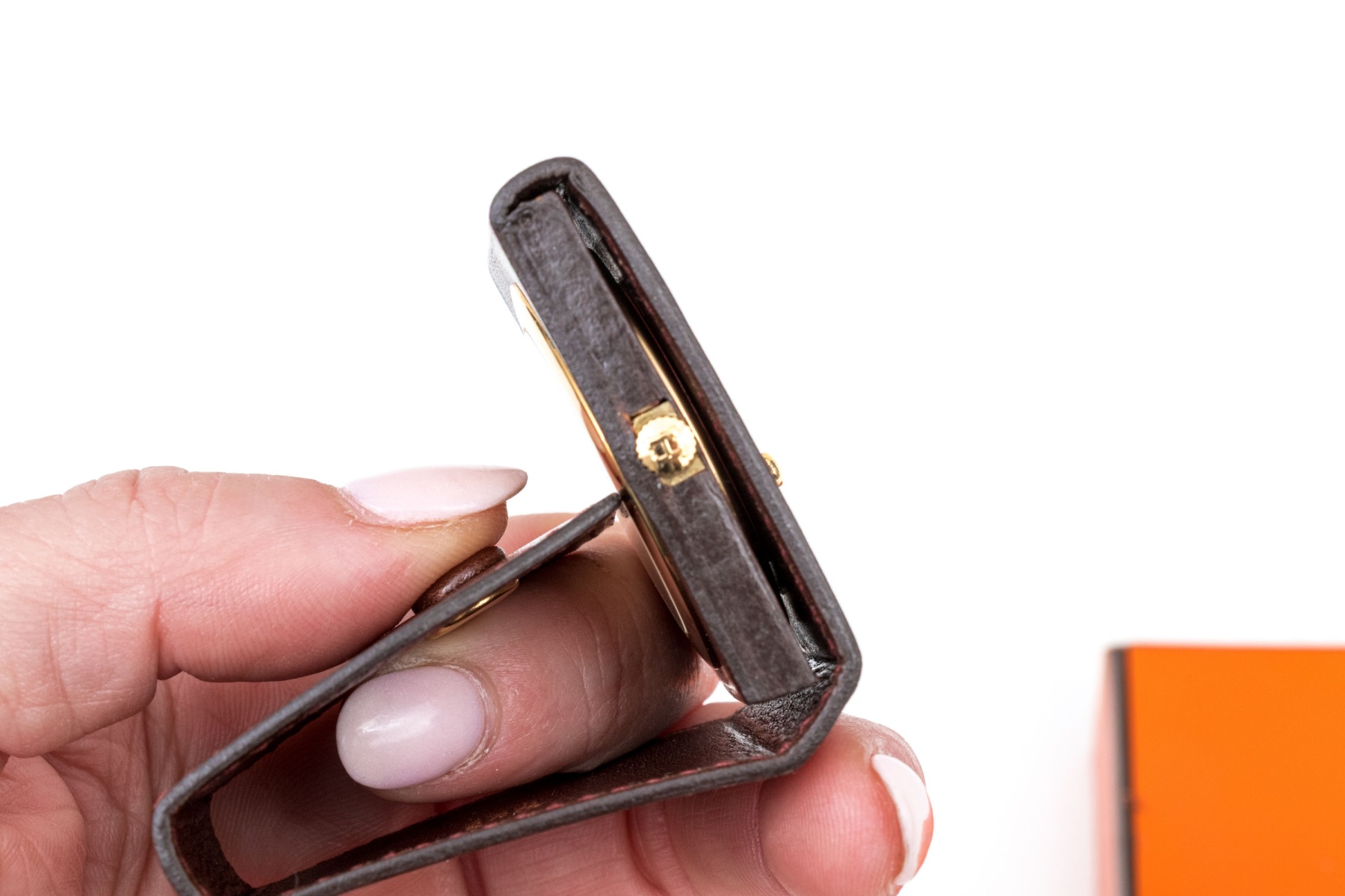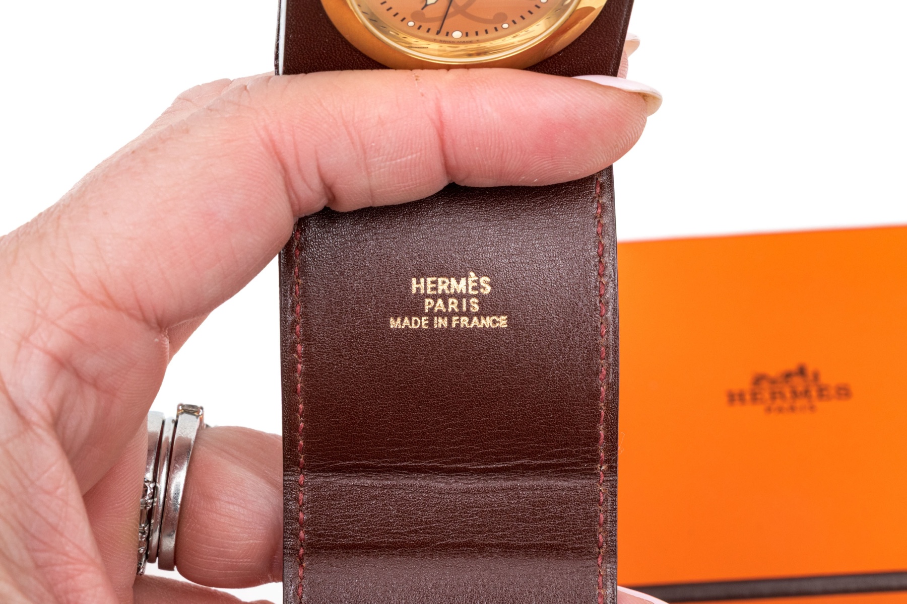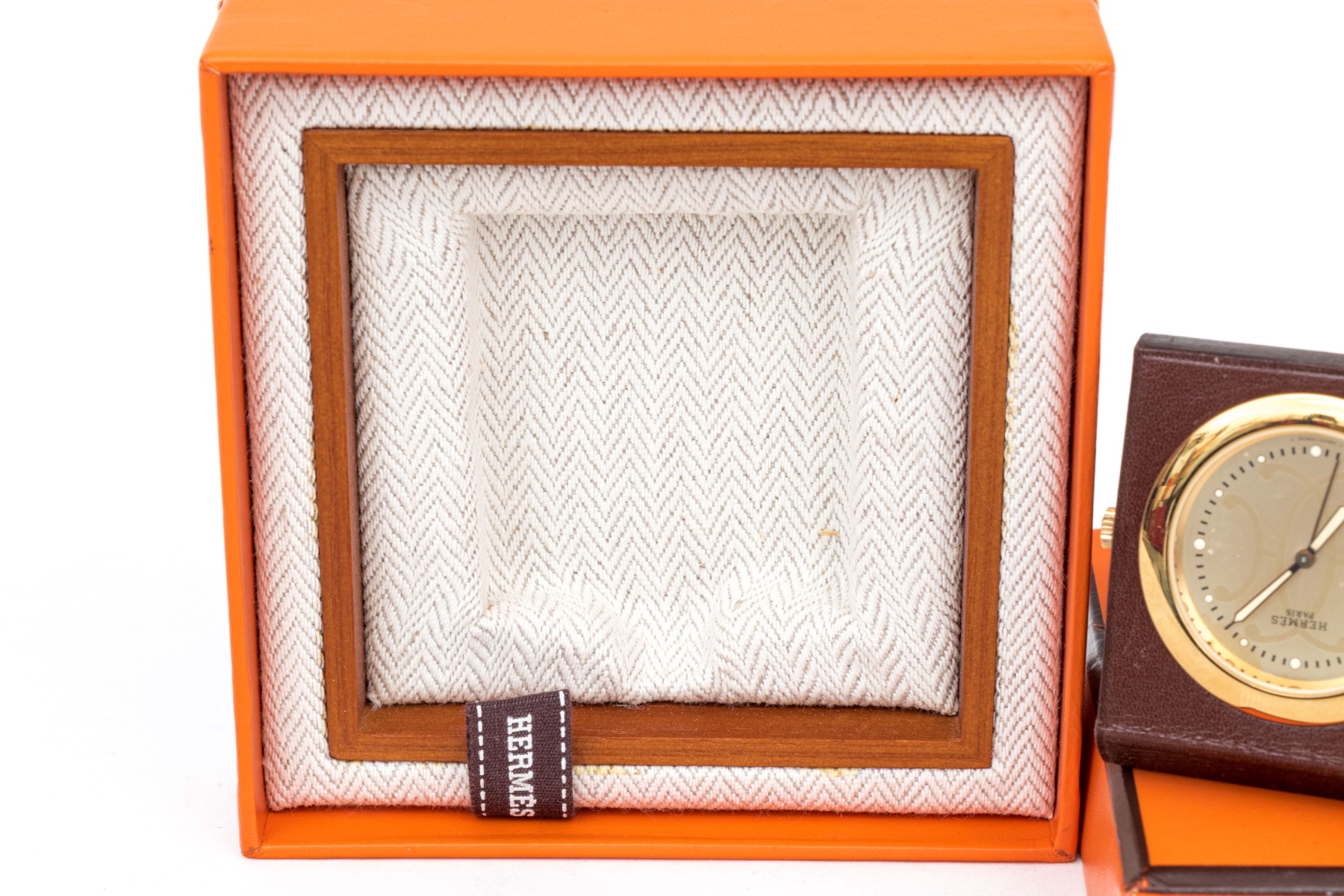 This charming travel clock from Hermes features a patterned champagne face, gold toned bezel and is displayed in a leather case with a snap closure. Accompanied by the original box.