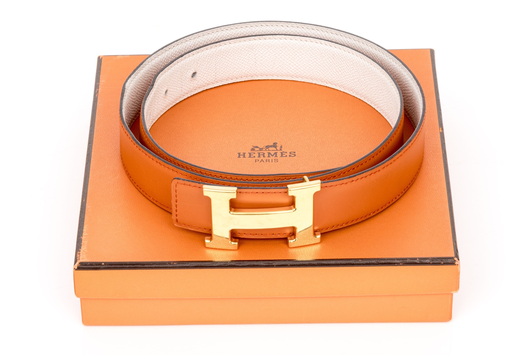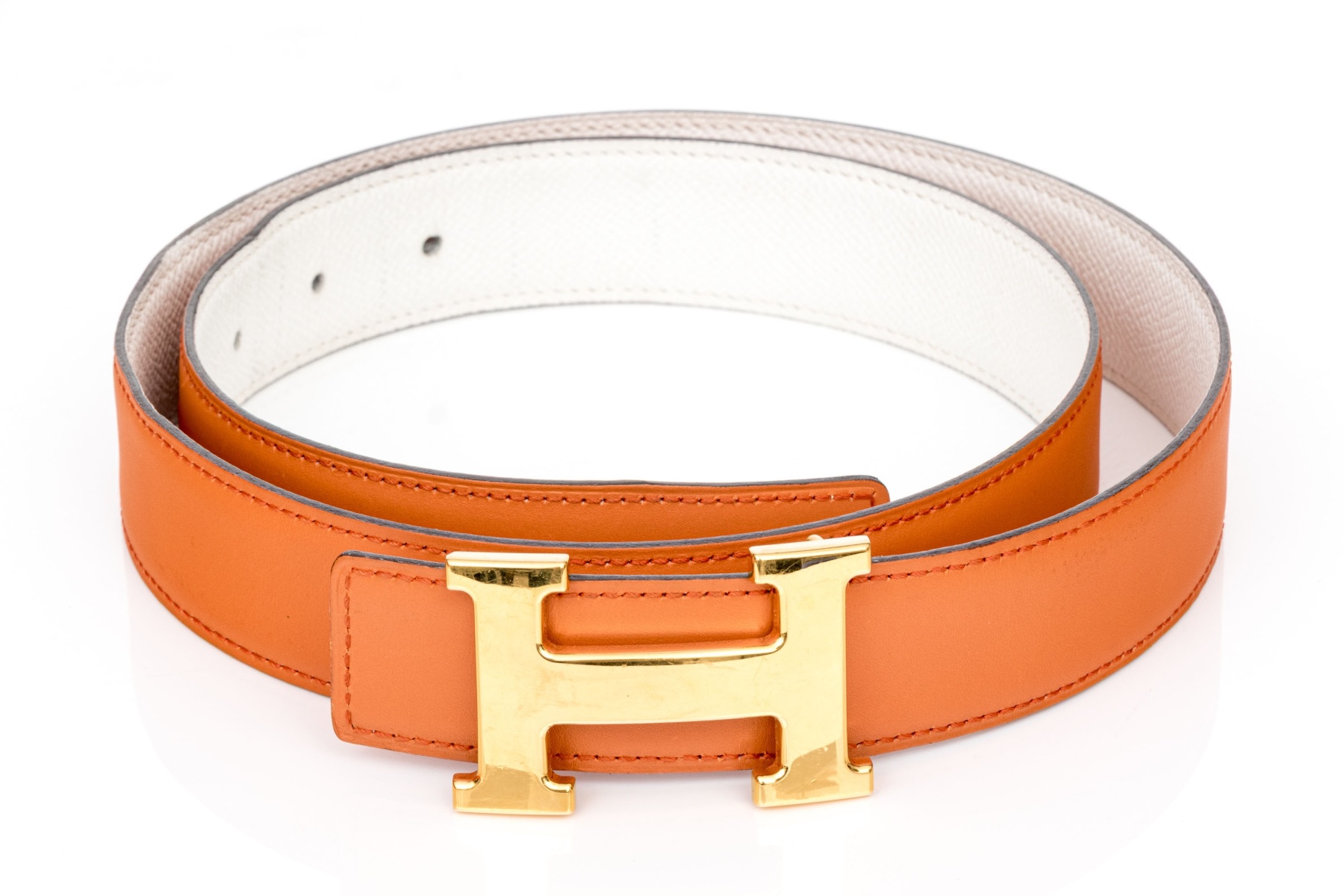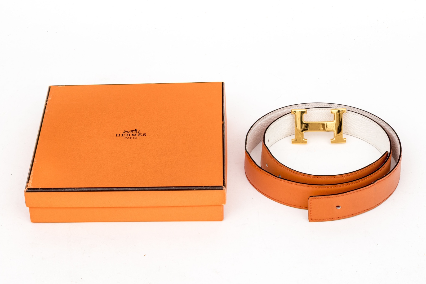 This striking reversible belt from Hermes is a smooth, orange leather, which reverses to a soft white pebbled leather, and features a gold tone Hermes "H" buckle. Accompanied by a box, pouch and bag