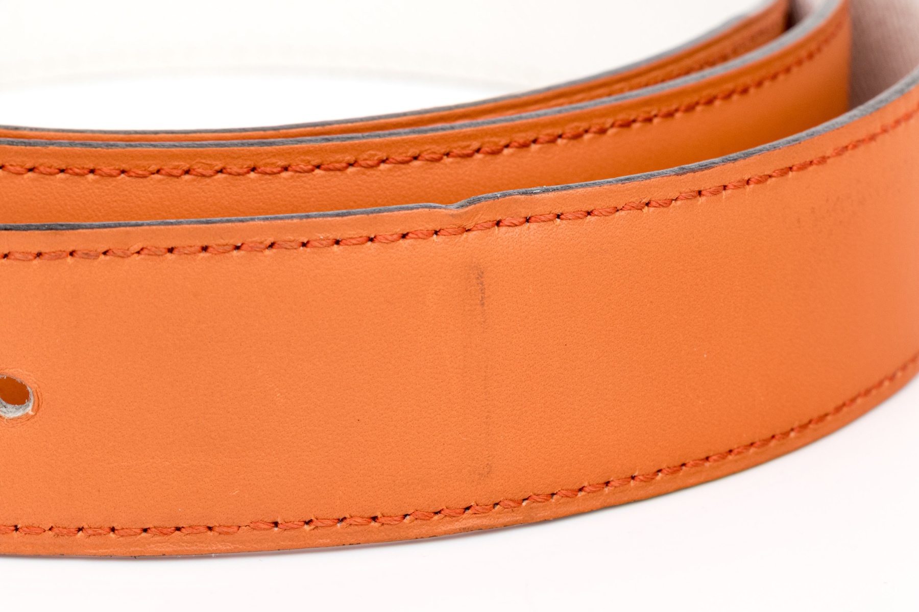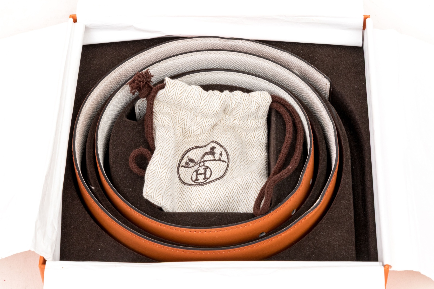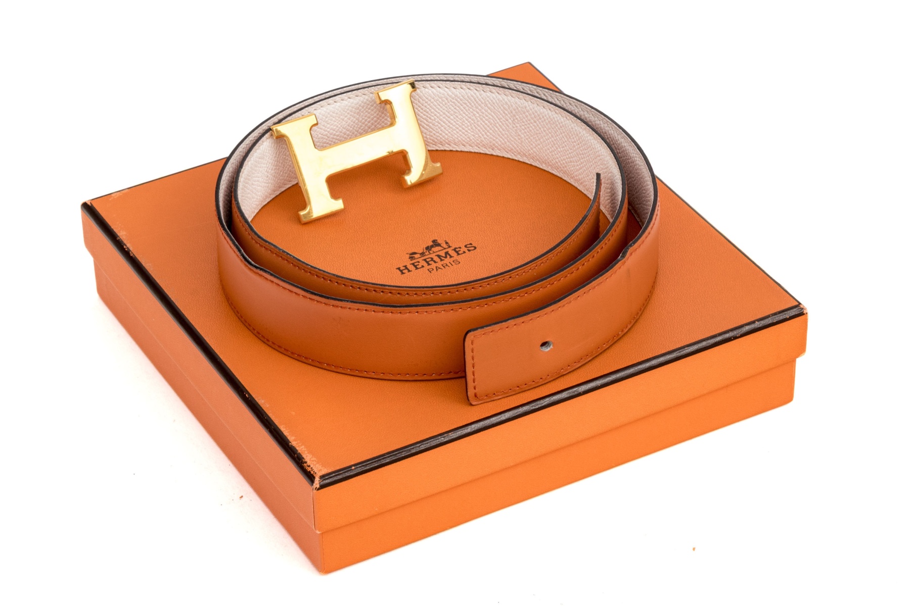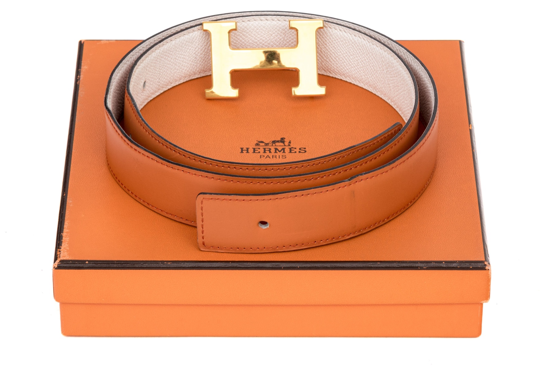 This striking reversible belt from Hermes is a smooth, orange leather, which reverses to a soft white pebbled leather, and features a gold tone Hermes "H" buckle. Accompanied by a box, pouch and bag