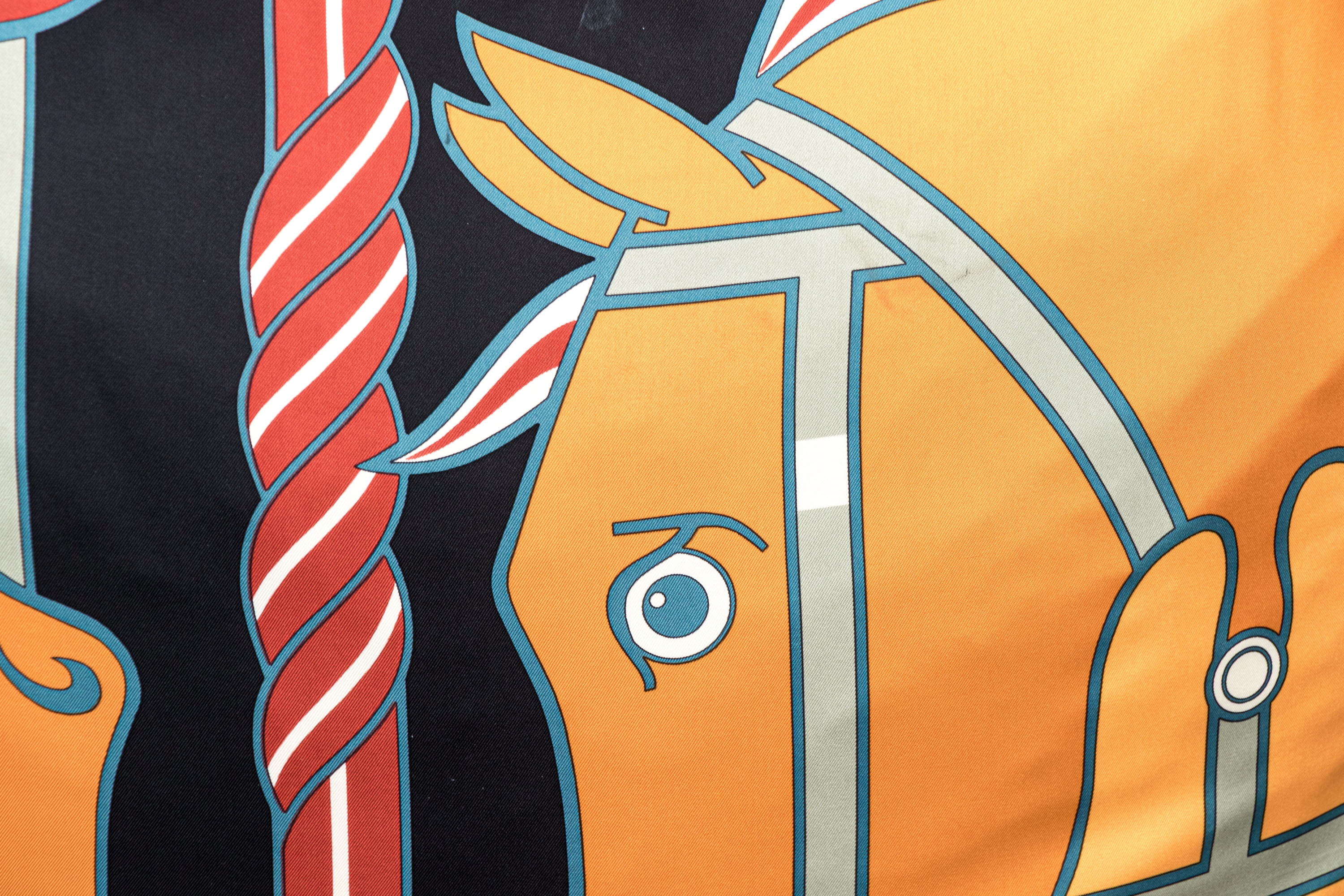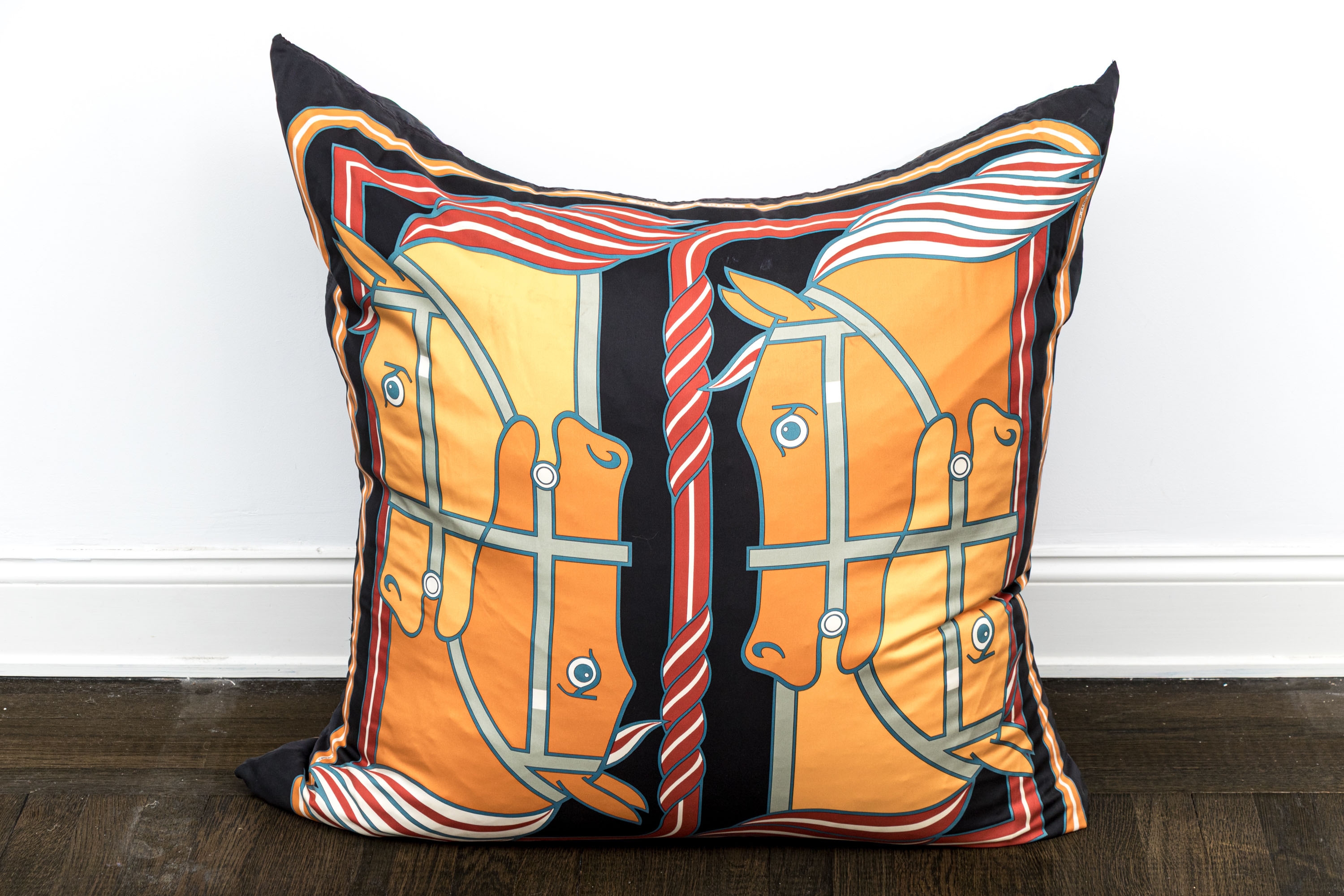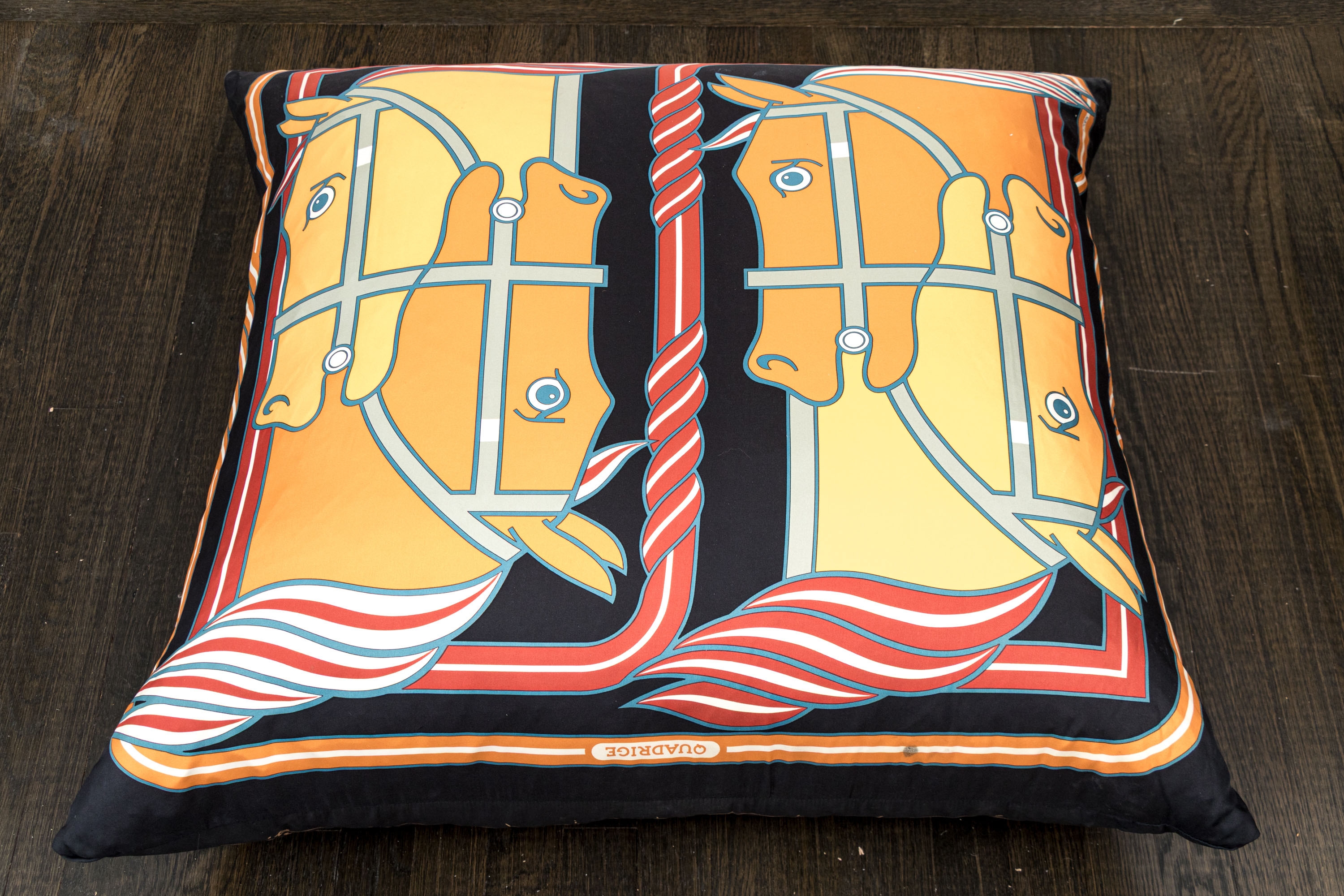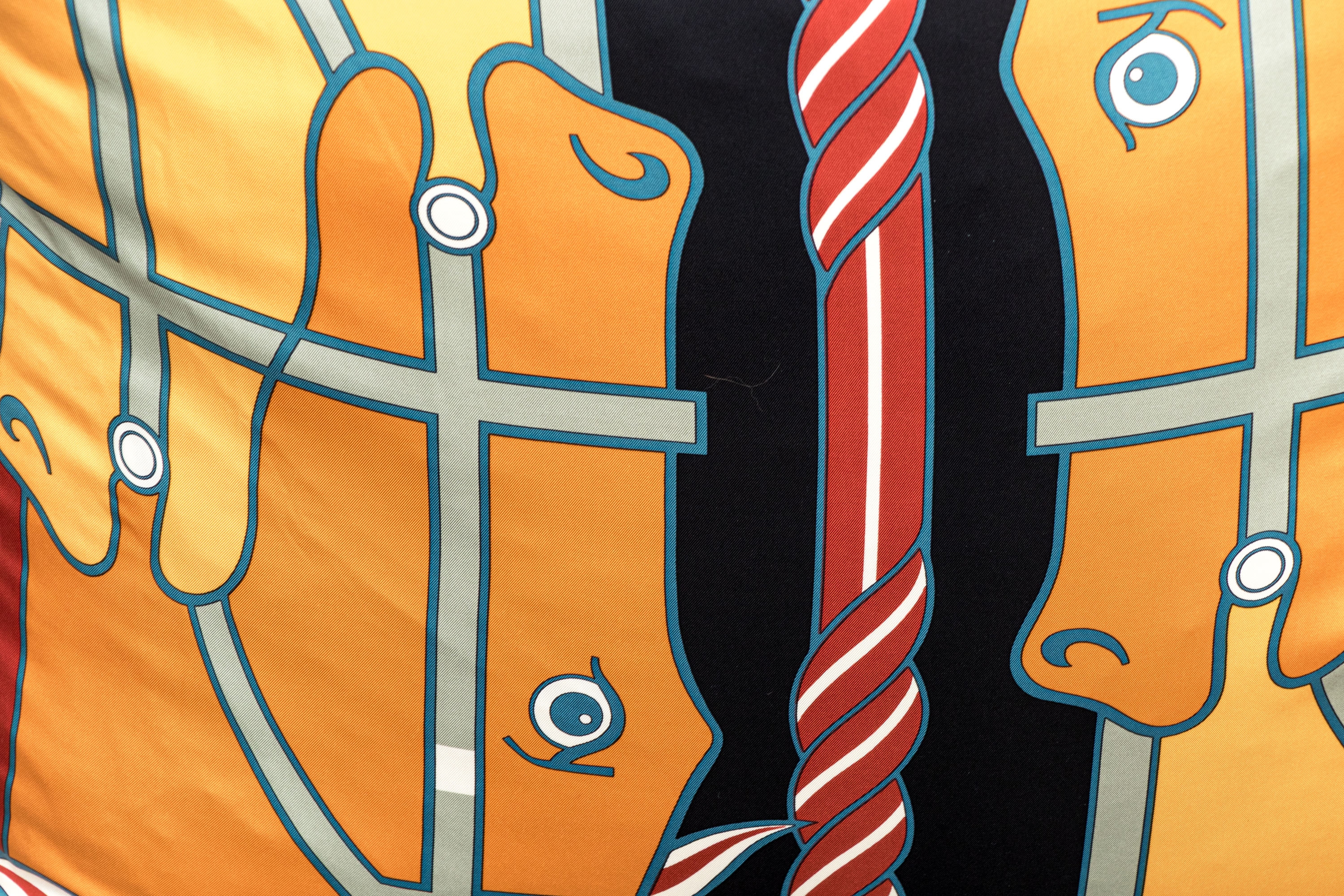 A gorgeous and high quality Hermes oversized statement accent pillow with a captivating design showcasing opposing yellow and orange horses with gray bridles separated by red and white rope twist motifs within orange striped borders against a black ground. The reverse depicts a captivating Naissance d'Une Idee pattern with a horseback figure at the center of a radiating graph of cursive script.