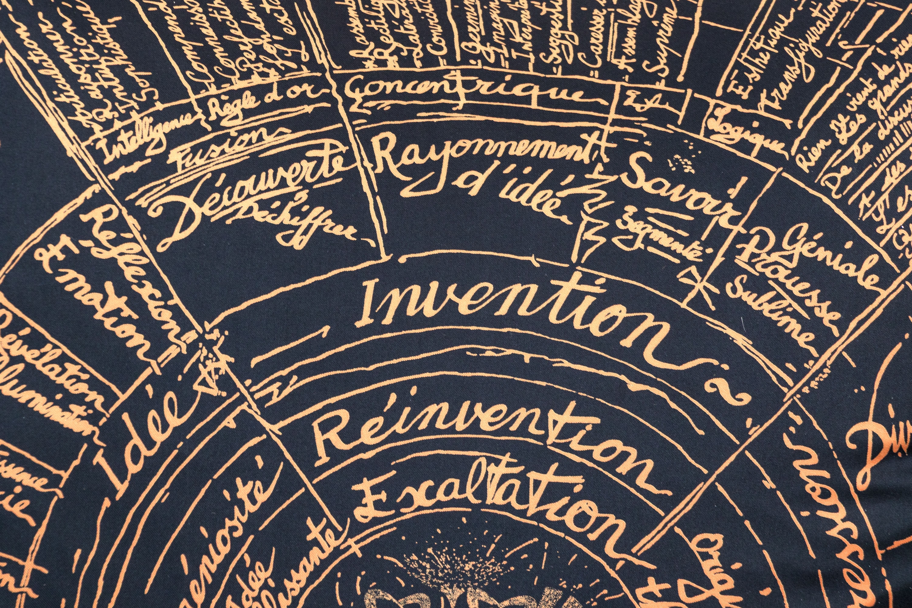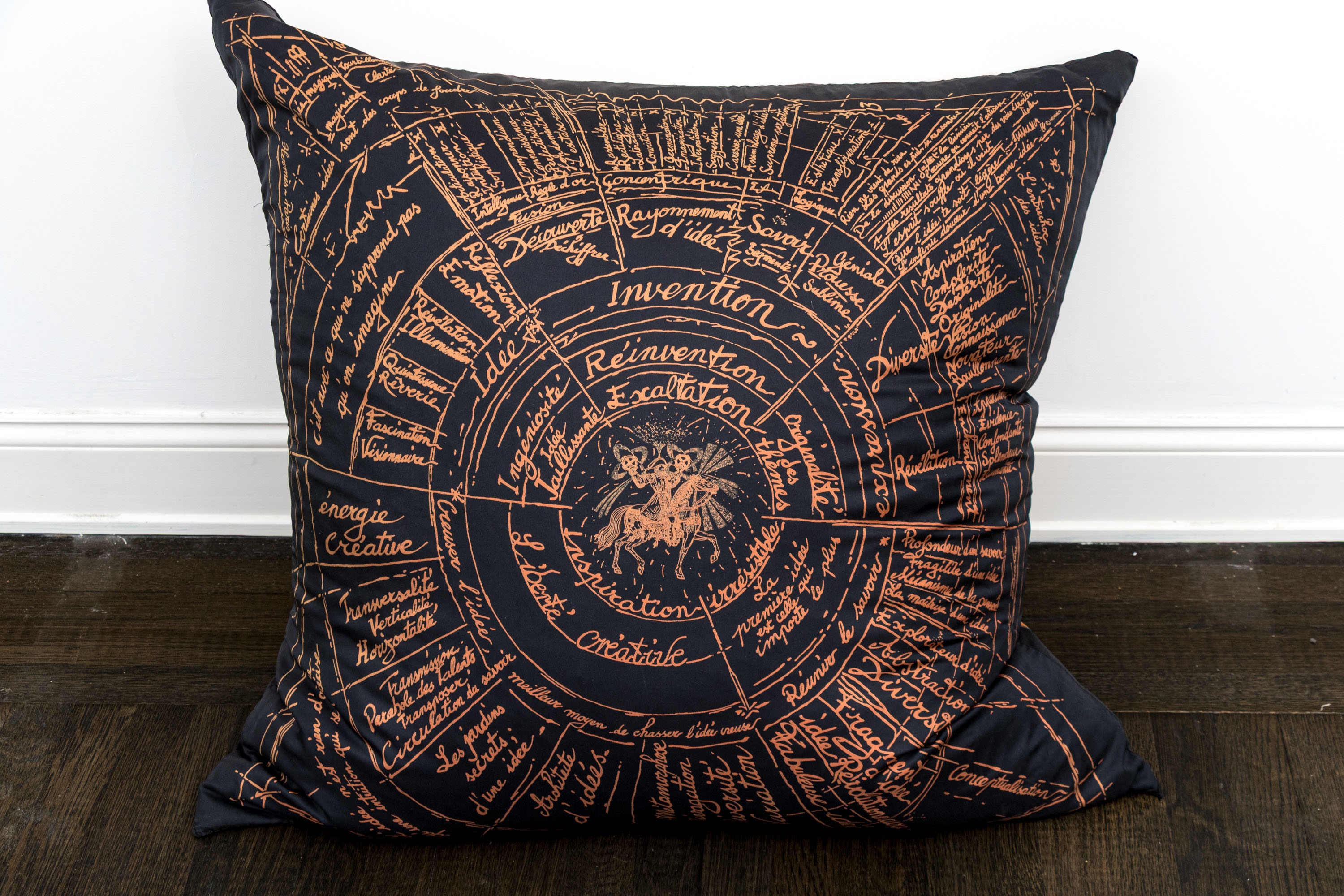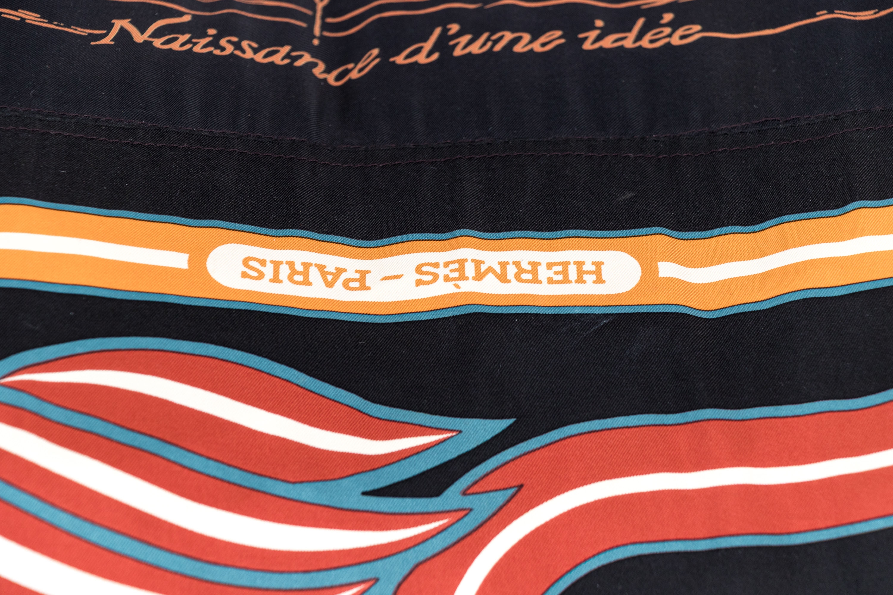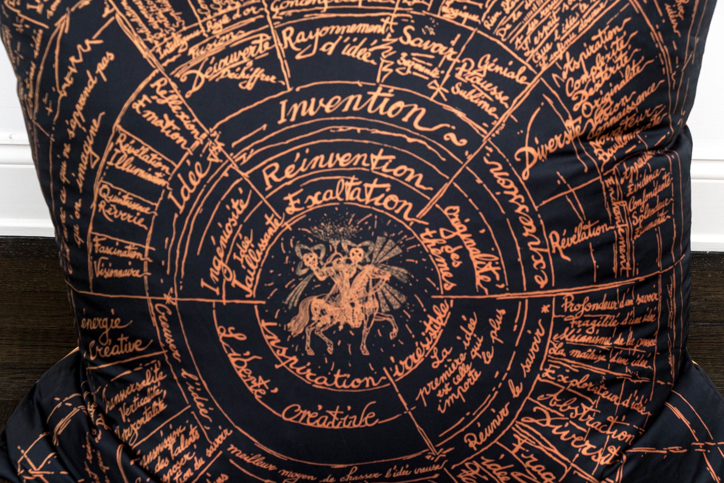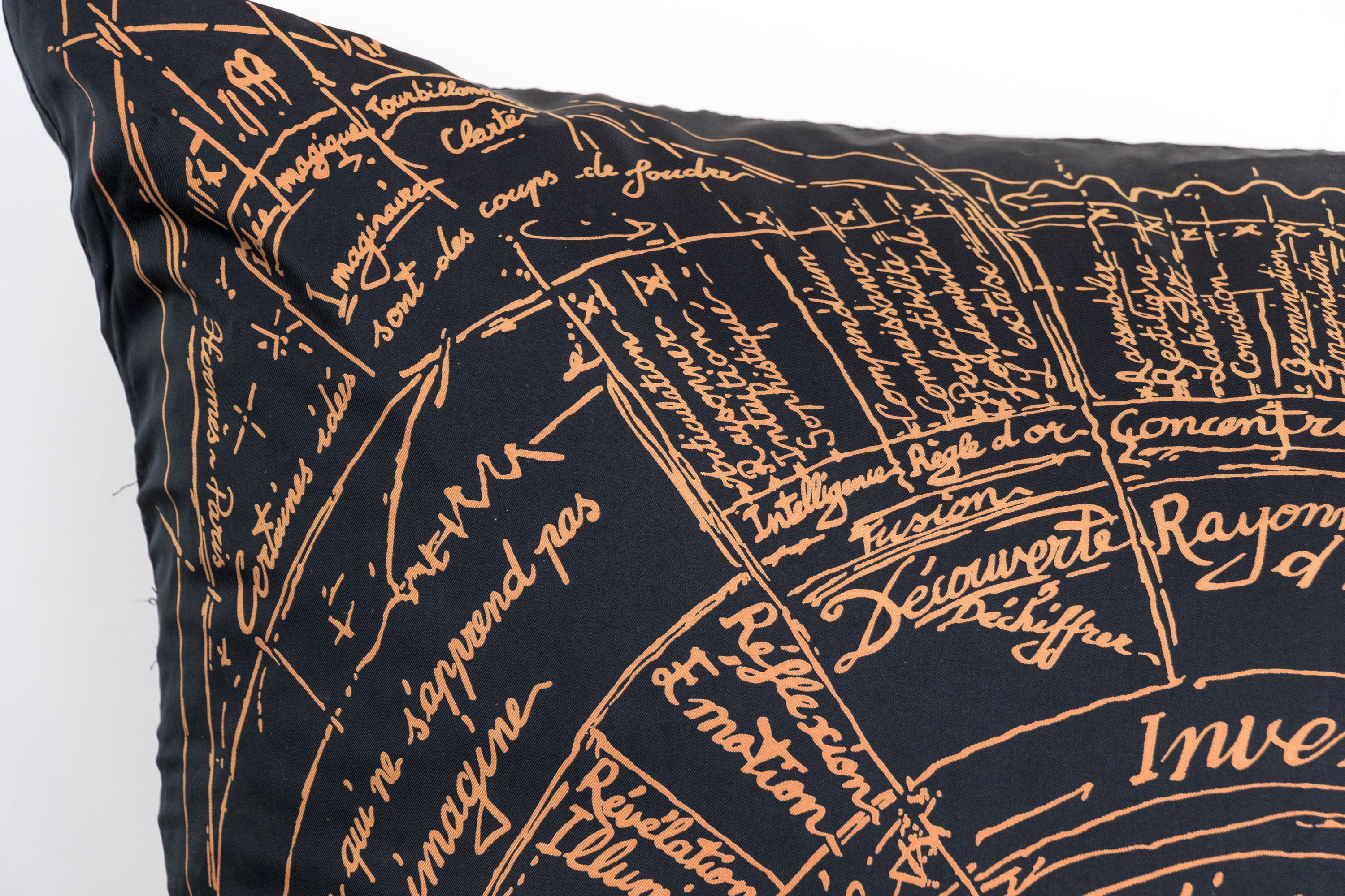 A gorgeous and high quality Hermes oversized statement accent pillow with a captivating design showcasing opposing yellow and orange horses with gray bridles separated by red and white rope twist motifs within orange striped borders against a black ground. The reverse depicts a captivating Naissance d'Une Idee pattern with a horseback figure at the center of a radiating graph of cursive script.
