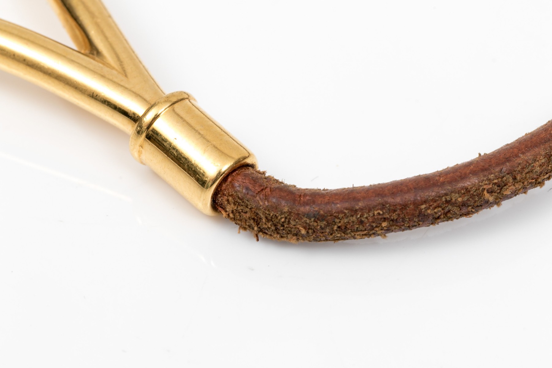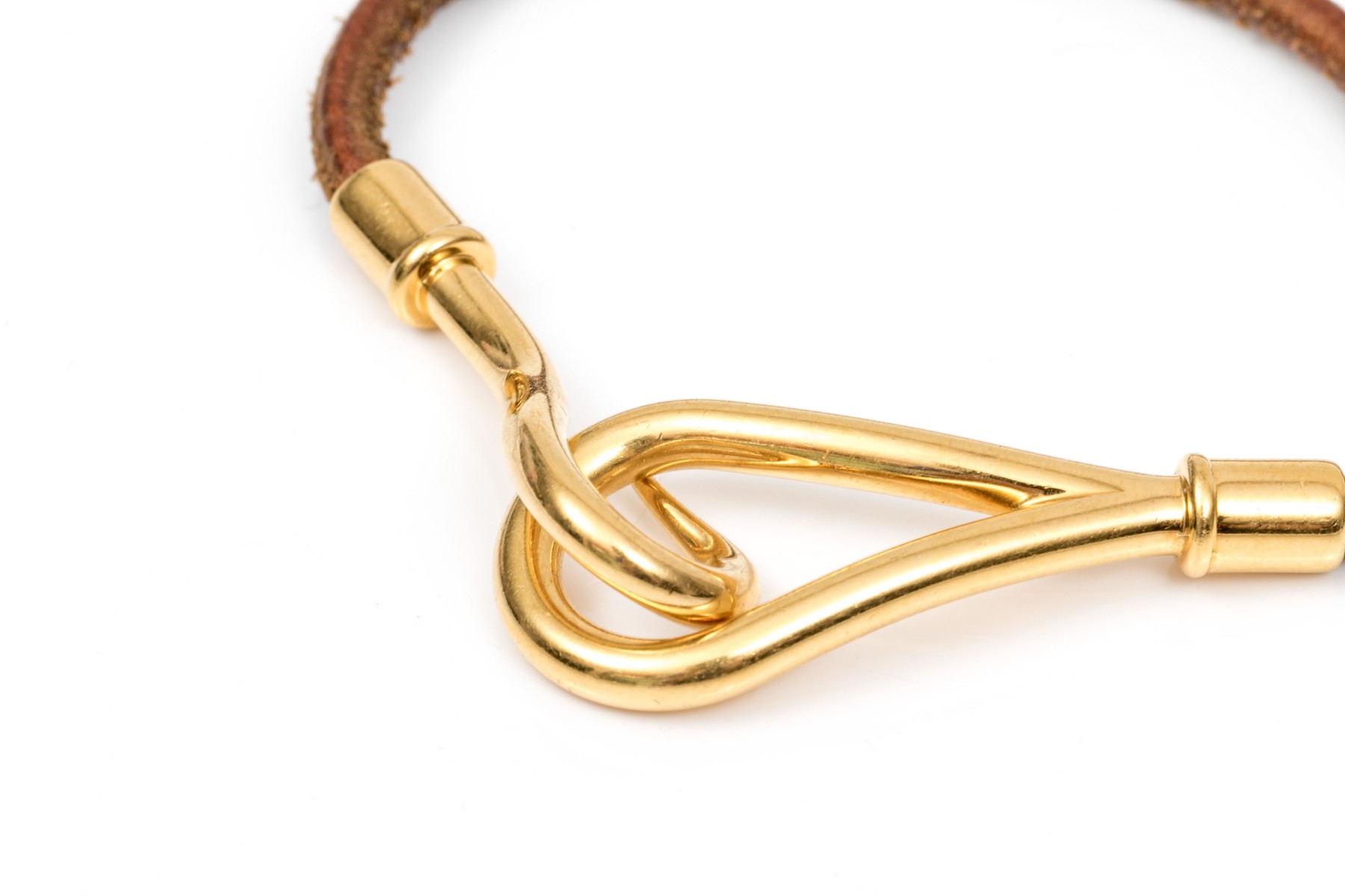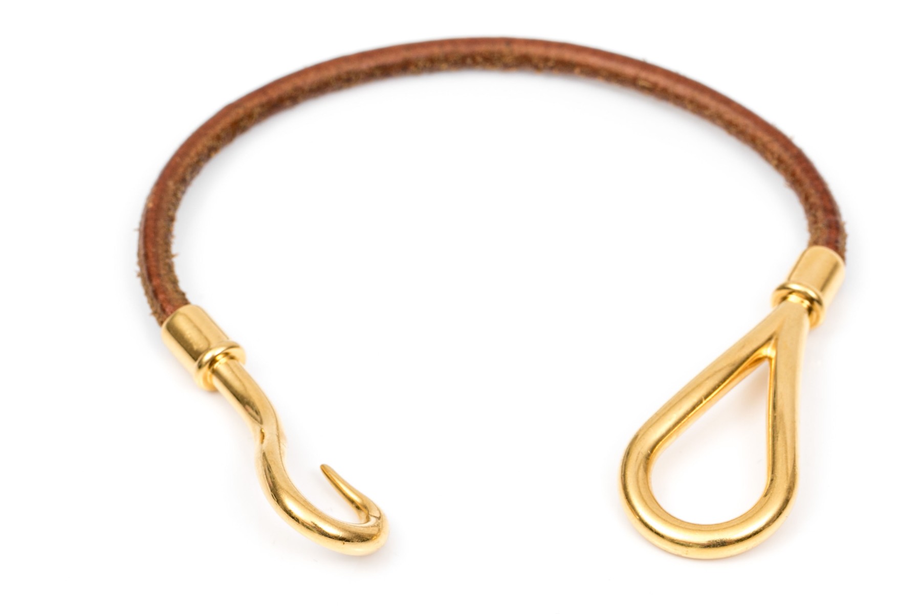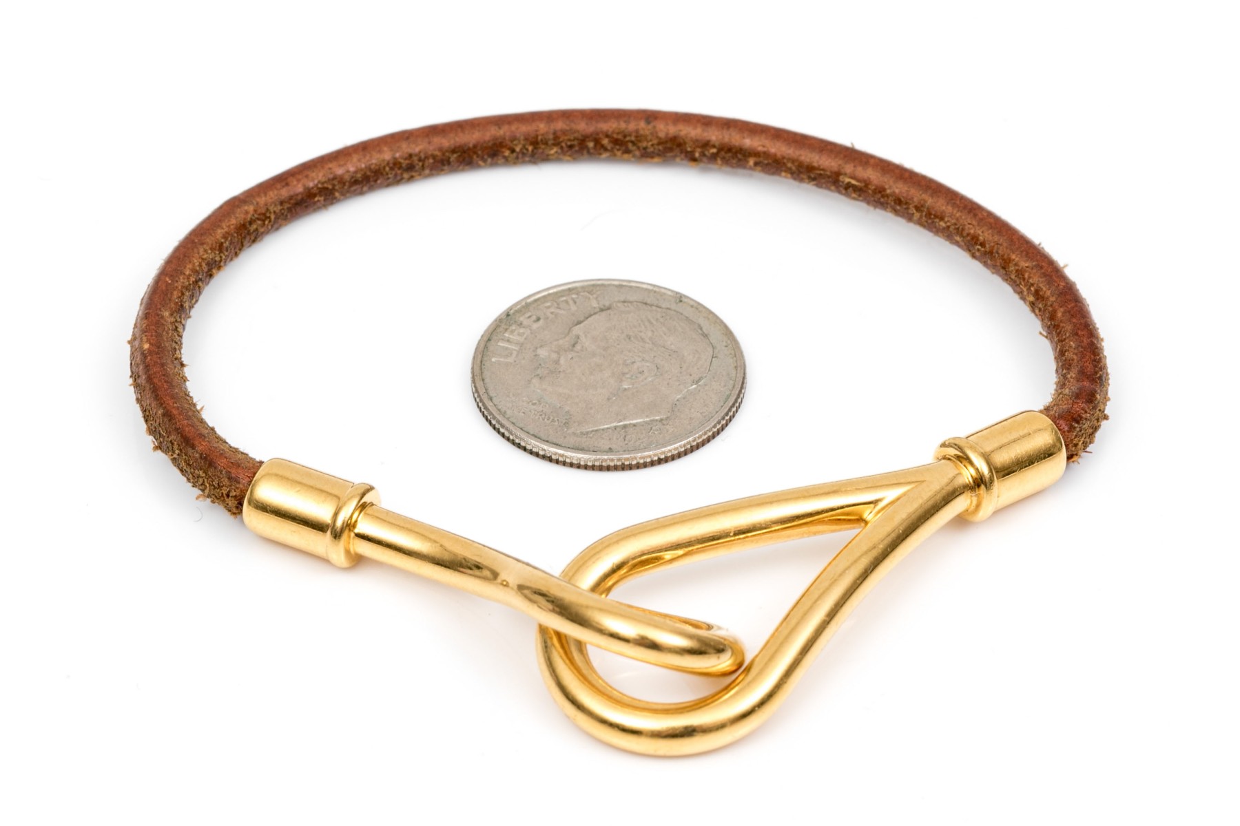 Stylish bracelet by Hermes. Leather band secures with polished, gold-toned hook and loop style clasp.