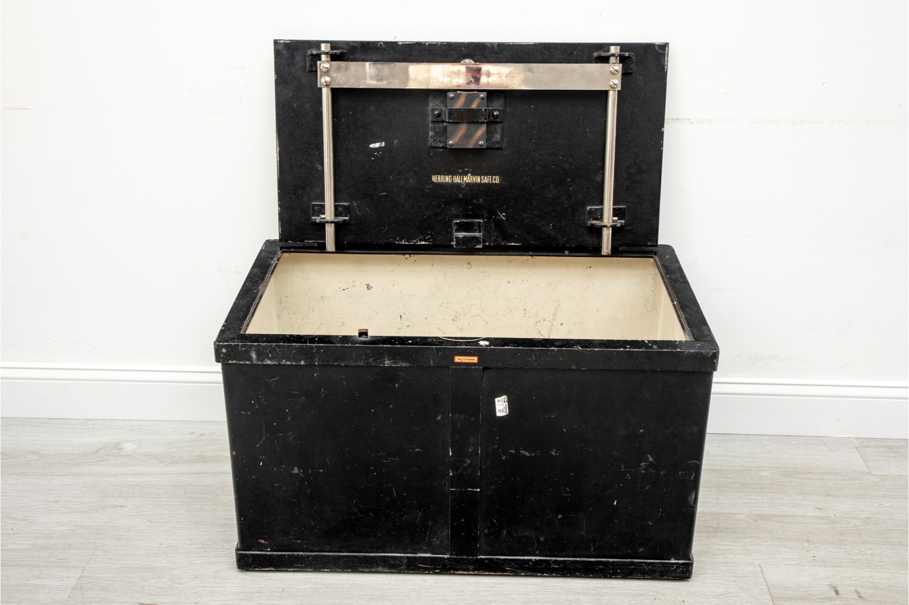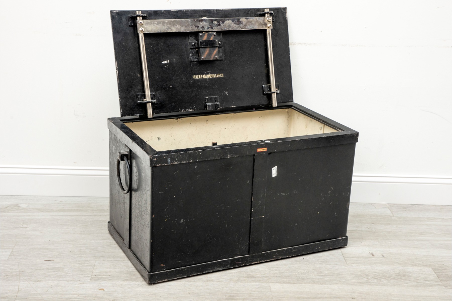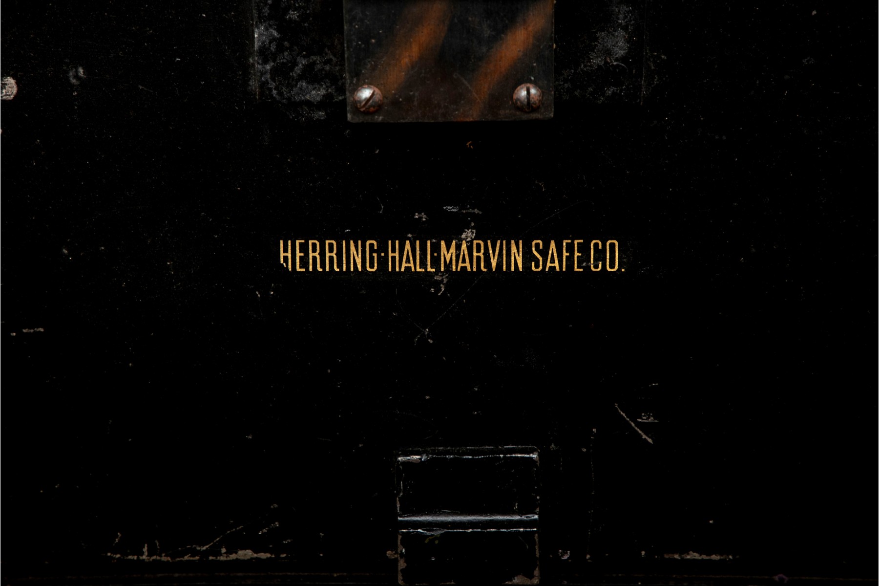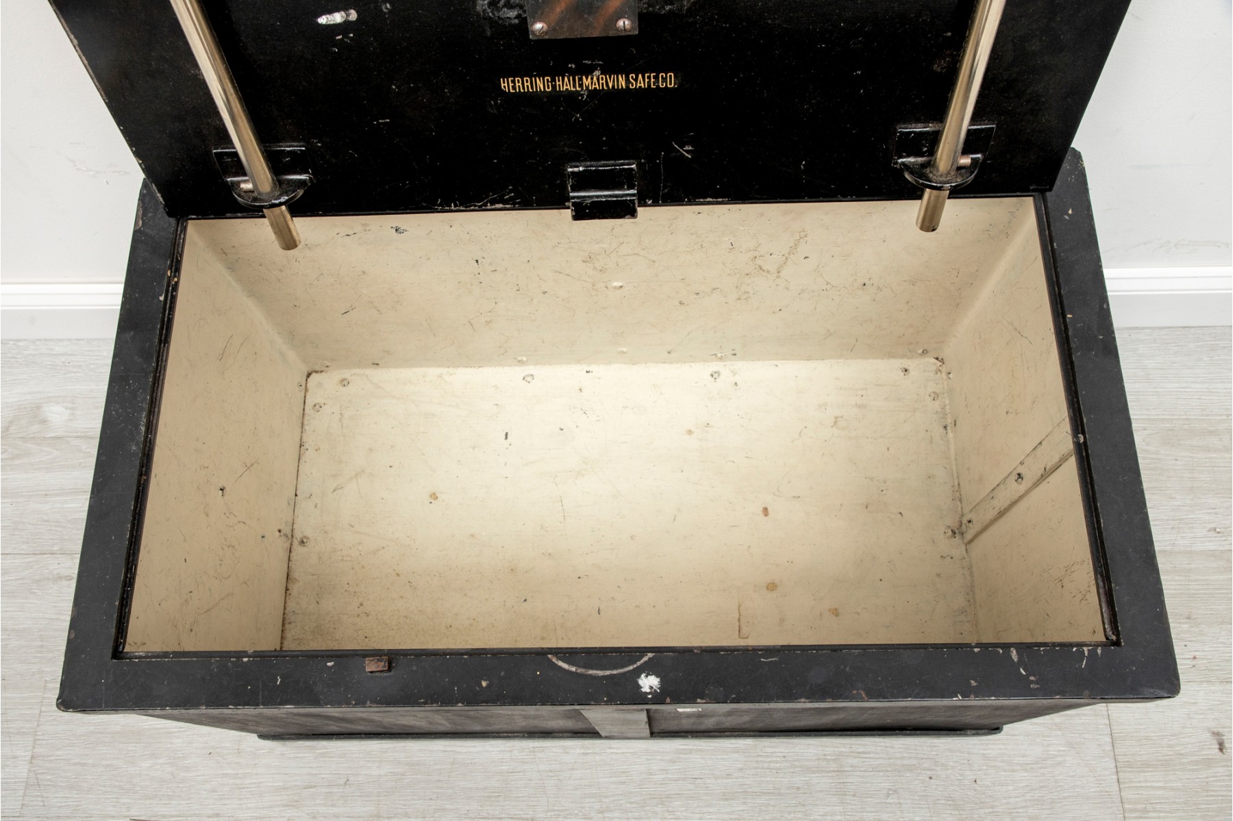 A heavy vintage safe by Herring-Hall-Marvin Safe Co. Features a thick steel plate door with iron door latch and a black finish.