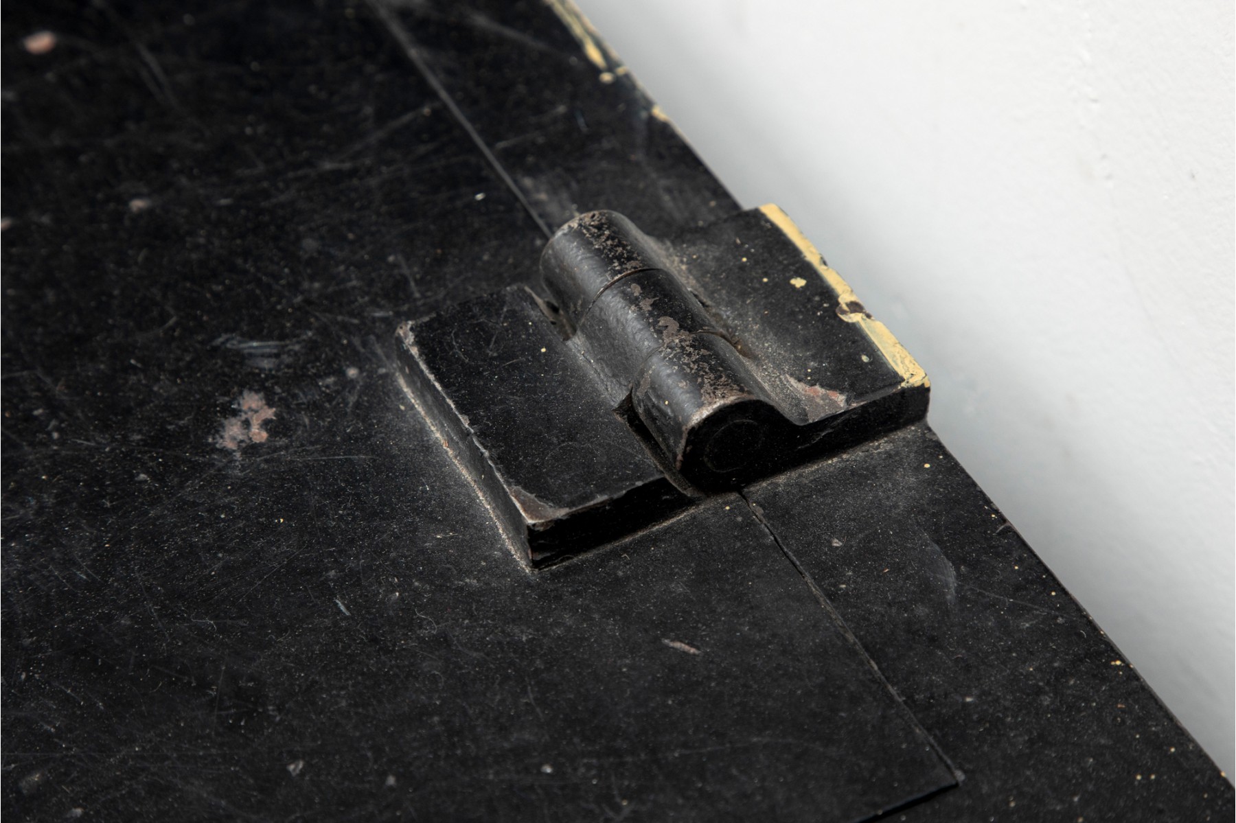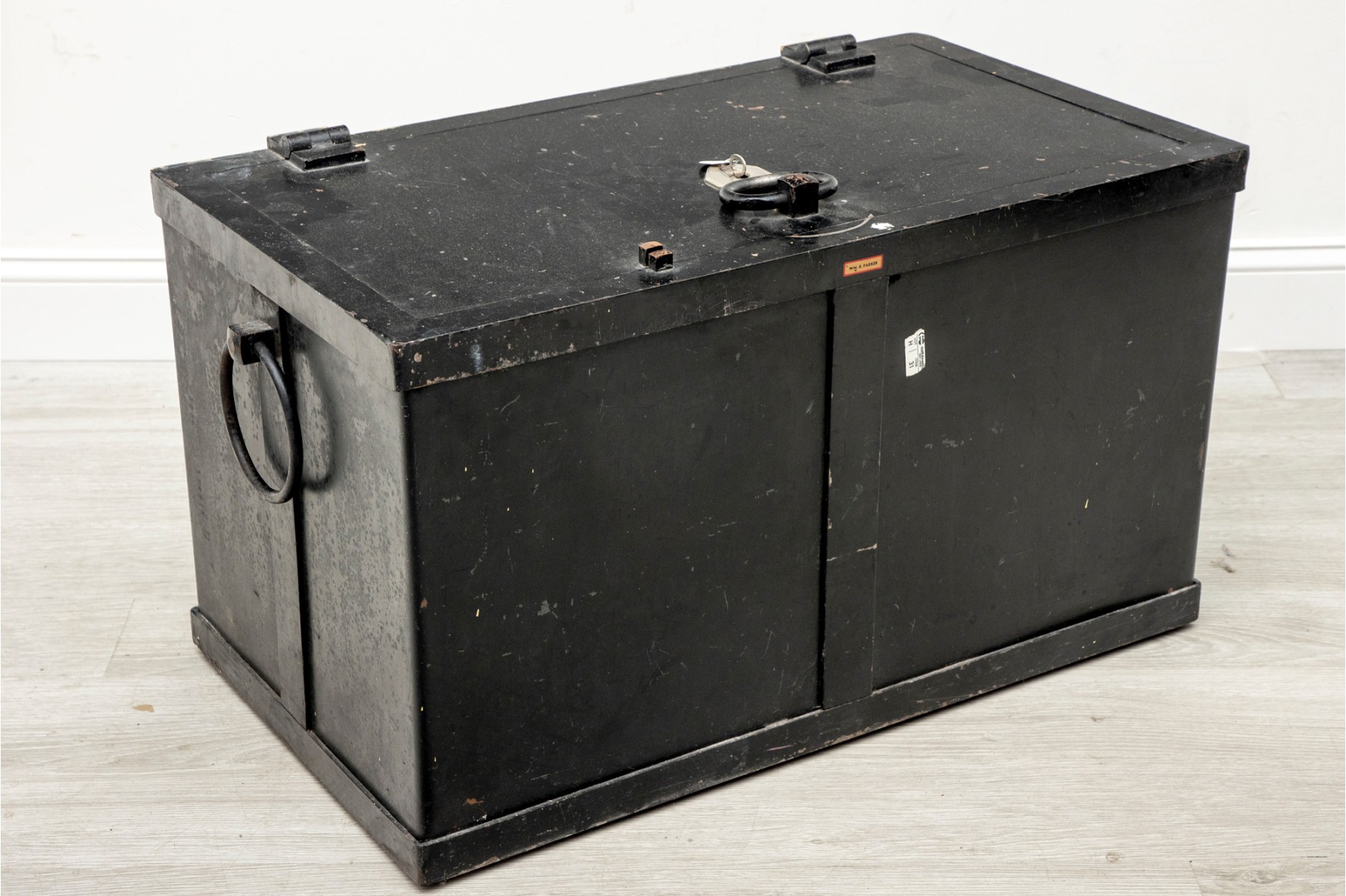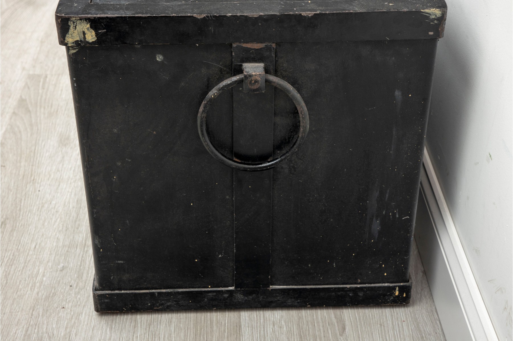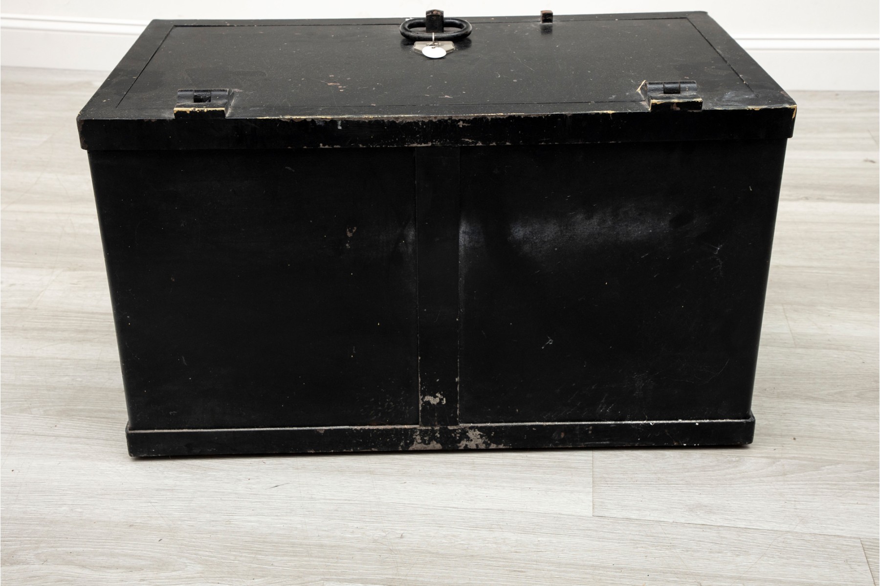 A heavy vintage safe by Herring-Hall-Marvin Safe Co. Features a thick steel plate door with iron door latch and a black finish.