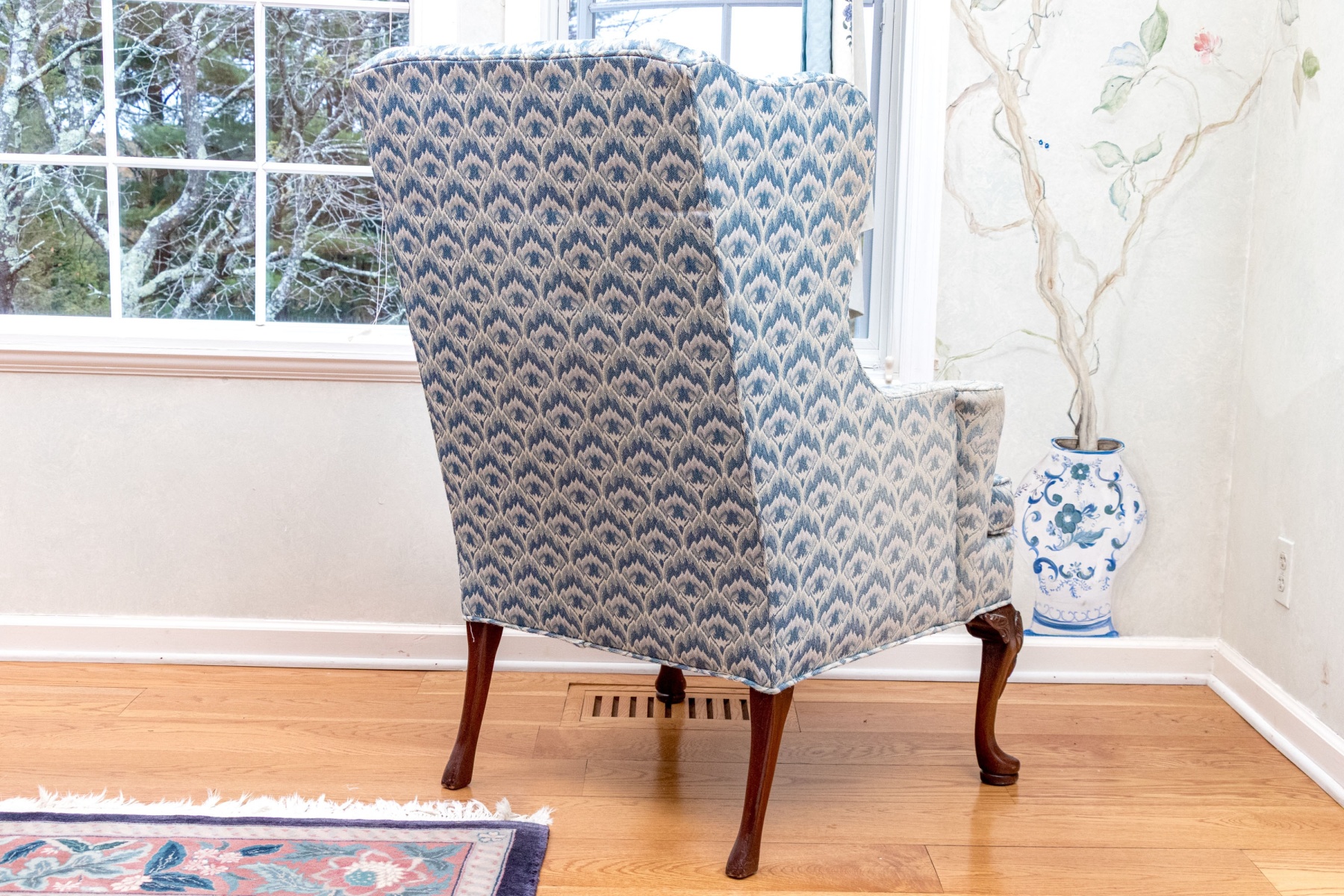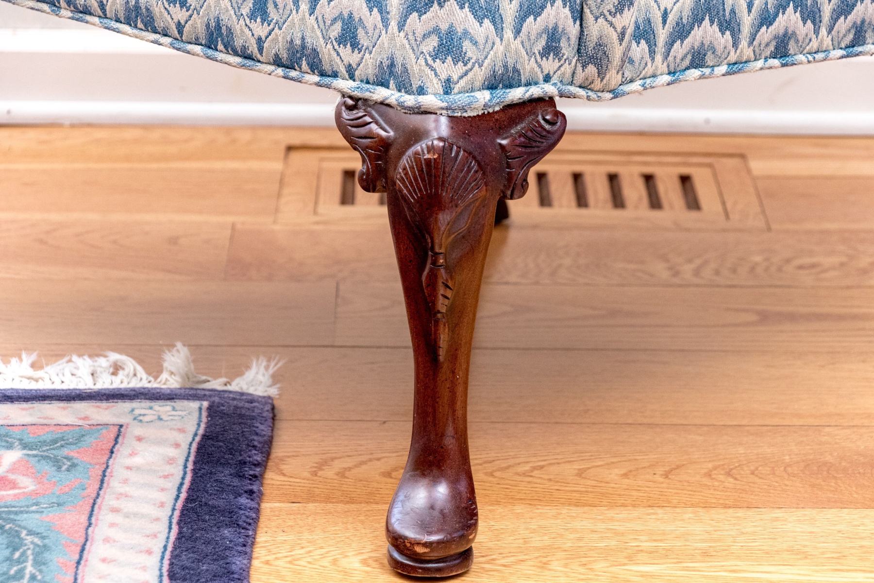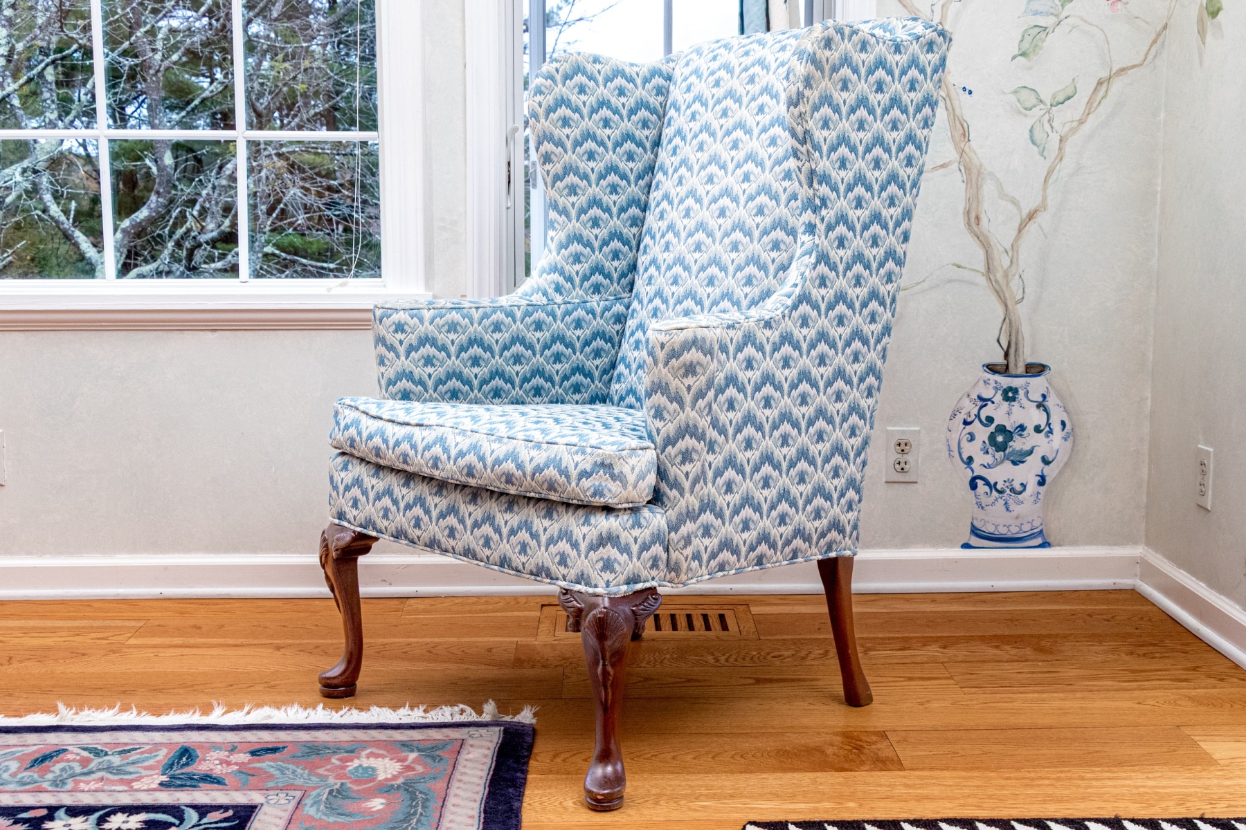 A delightful Hickory Chair wing chair raised on front carved cabriole legs with pad form feet and back splayed legs. The upholstery a lavish foliate repeating form with blues and cool hues. Rolled arms shaped wings and a loose upholstered seat cushion with piped trim.